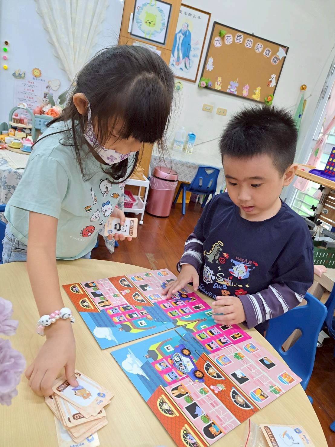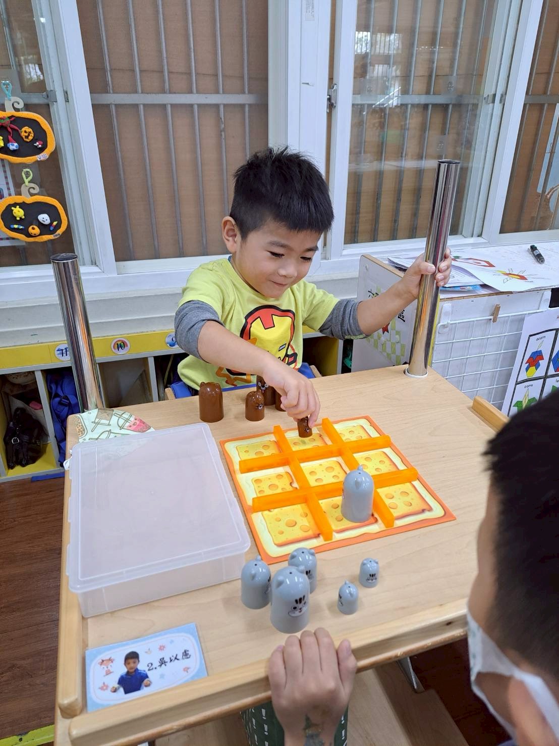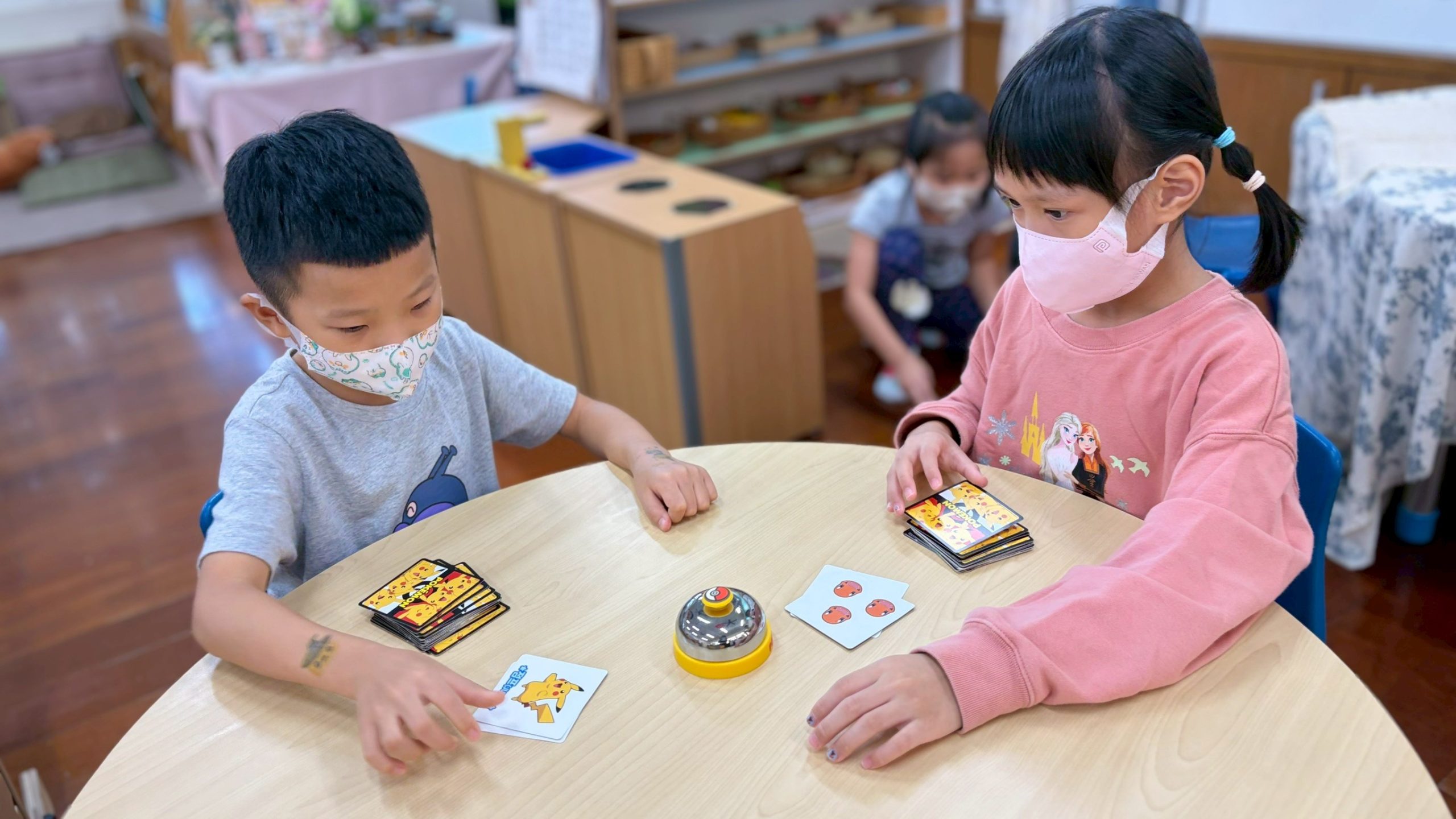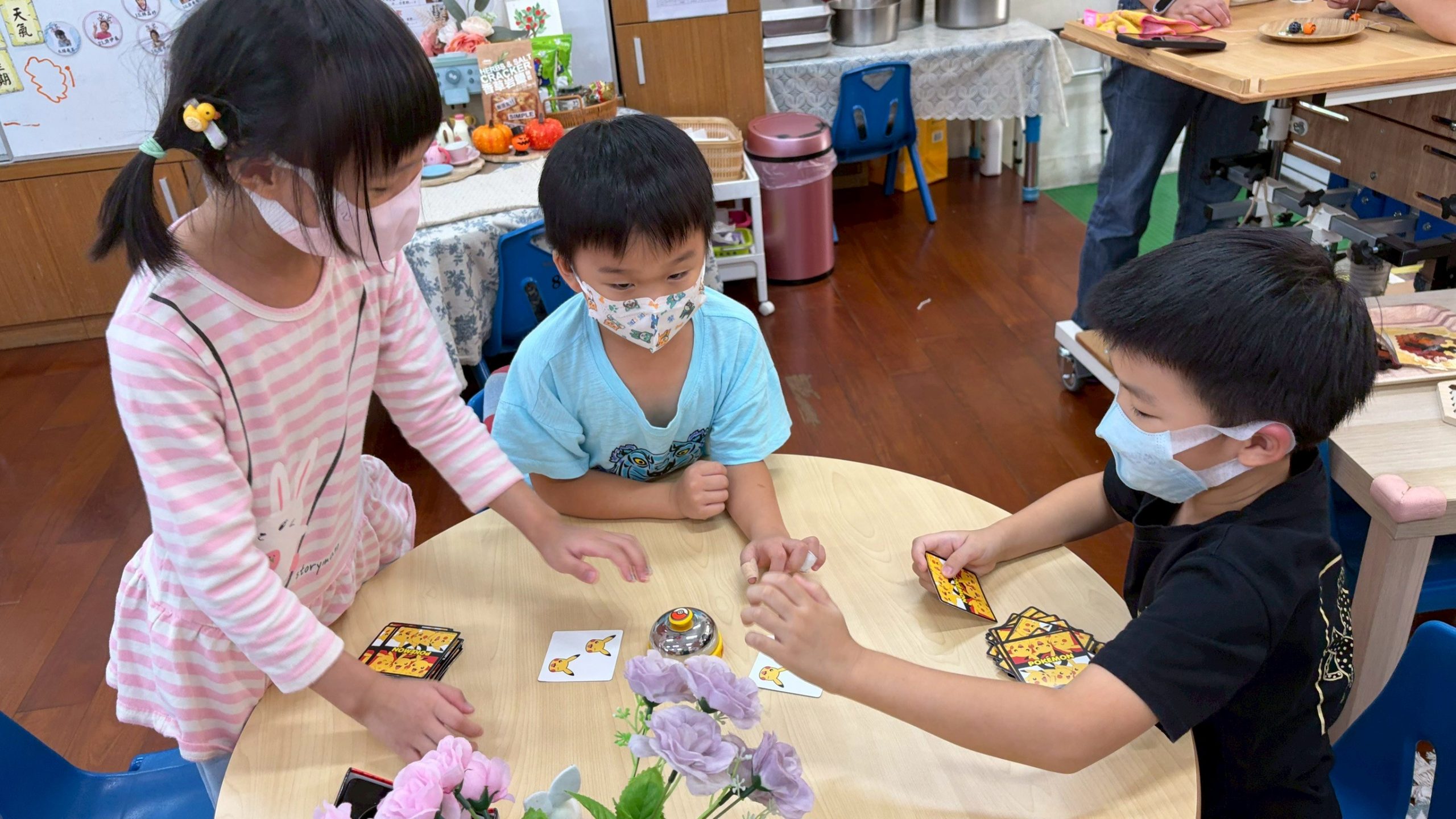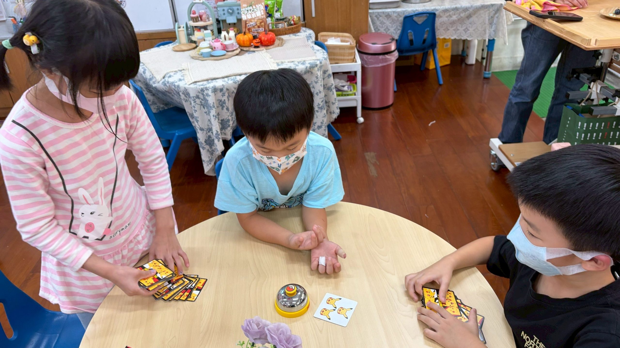11/5 今天學習區任務~桌遊區,介紹眼明手快心臟病(中班)、寶可夢心臟病(大班)和蜈蚣曬鞋三款遊戲,在共玩中學習規則,並增進數學概念與反應力,也要和棋藝區一樣培養「勝不驕、敗不餒」的精神喔!