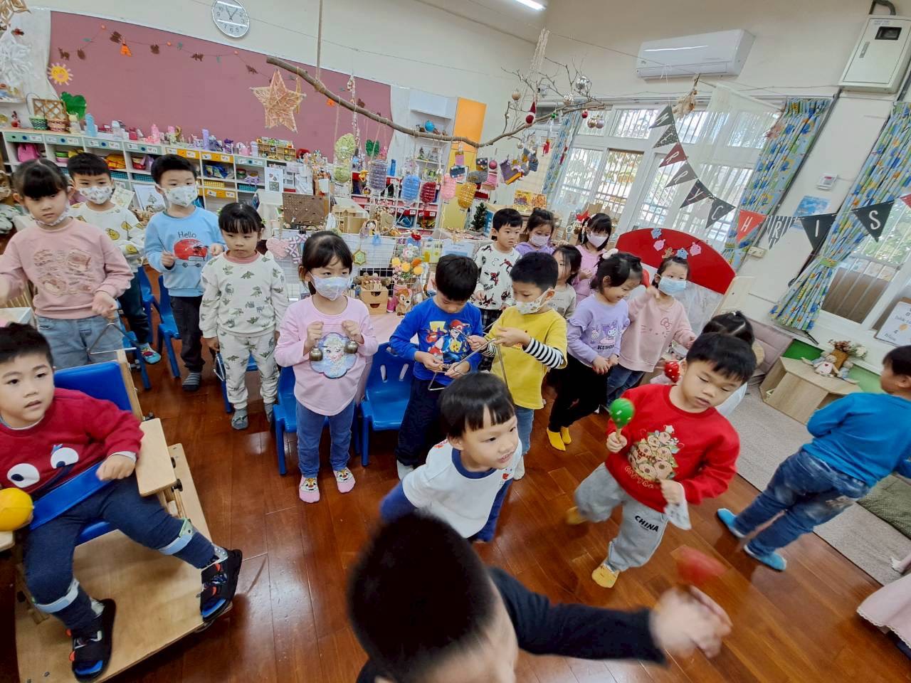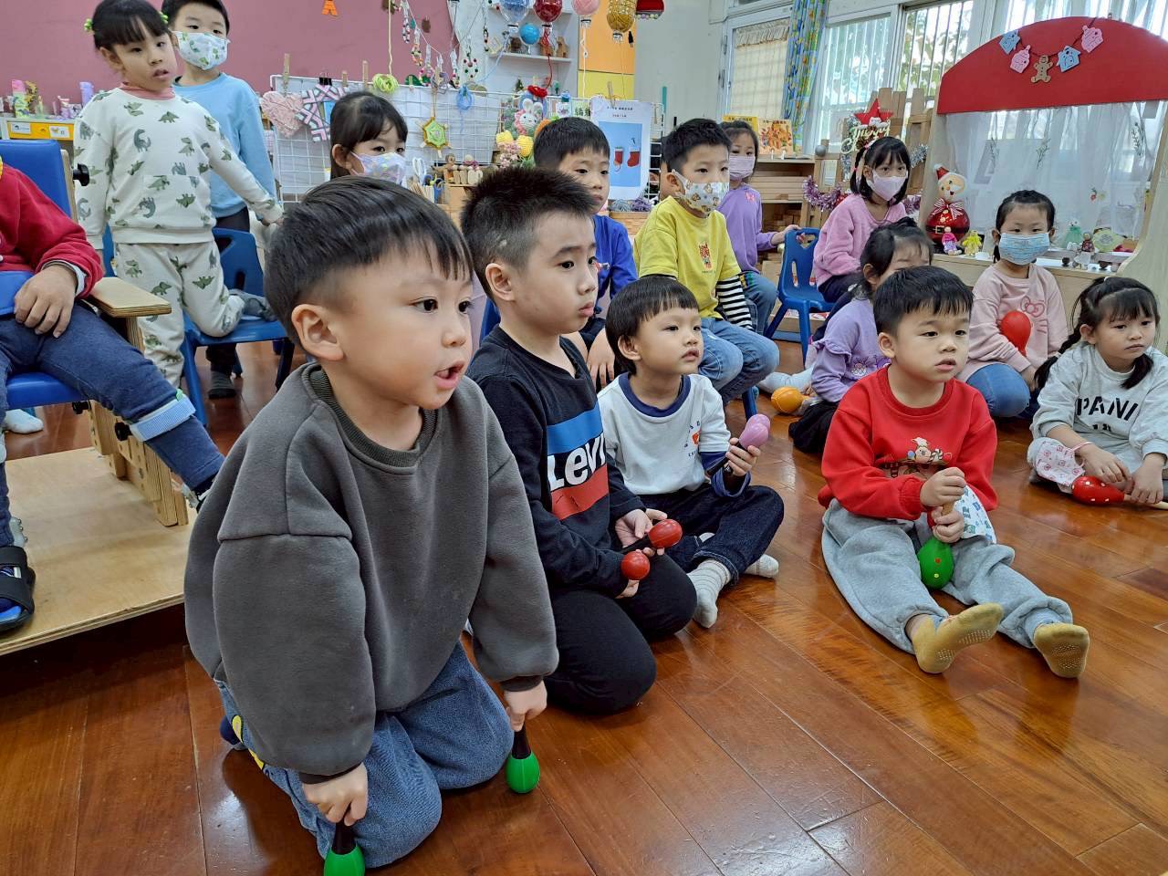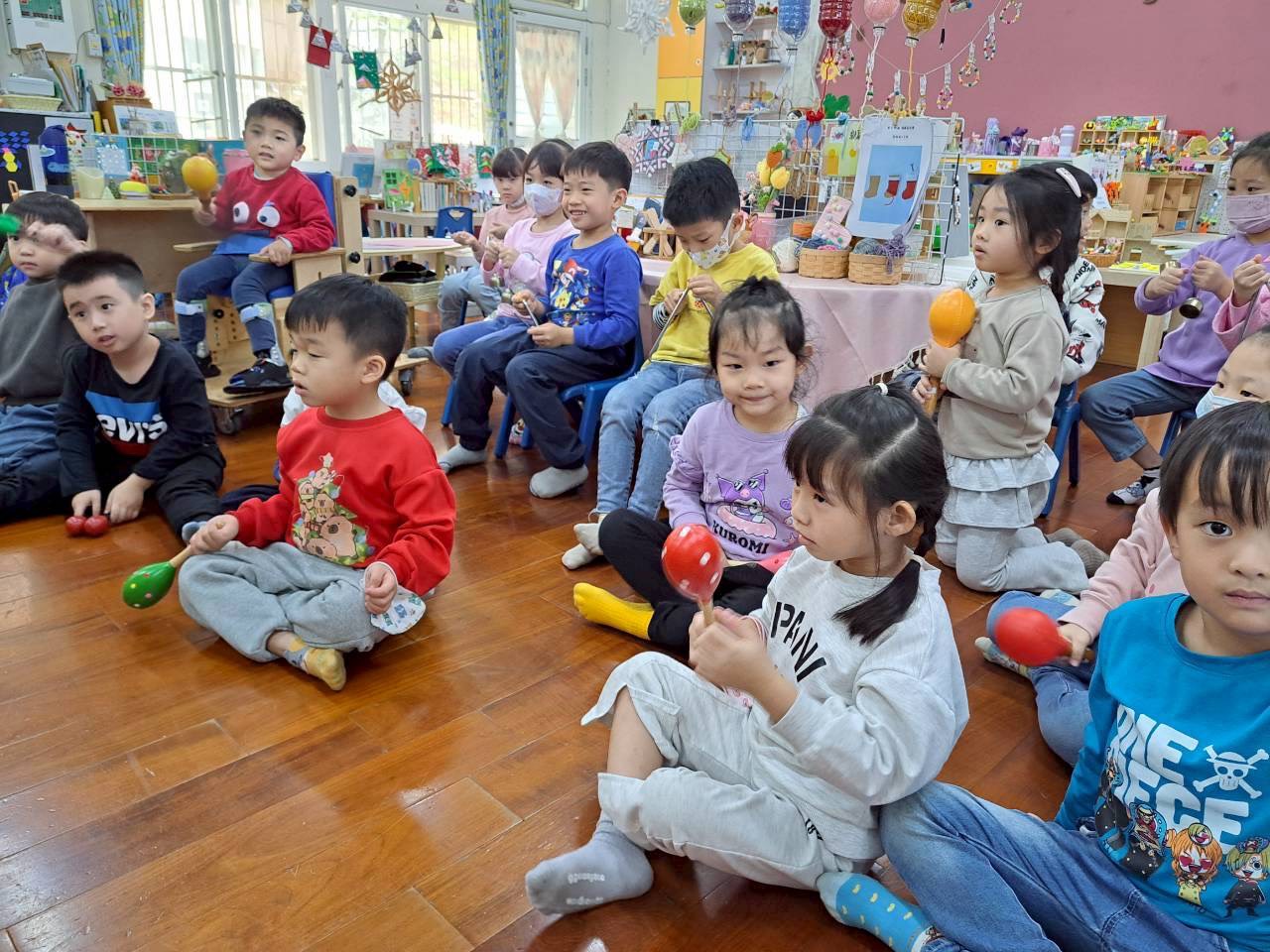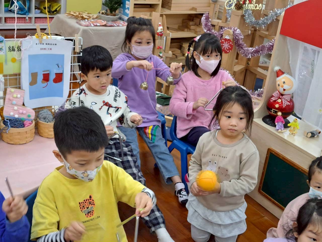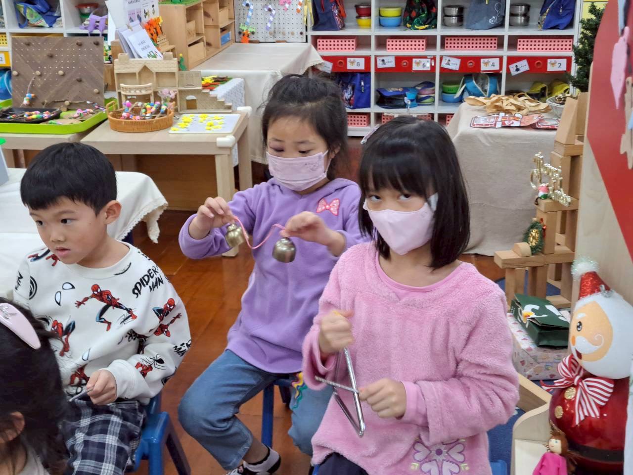 12/23 今天繼續練習兩首報佳音的歌曲~<聖誕老公公的鈴鐺不見了>和<粉紅色的聖誕節>,大班的三角鐵、鈴鼓與中班的沙鈴,邊唱邊跳邊打節奏,大家的專注力都進步囉!