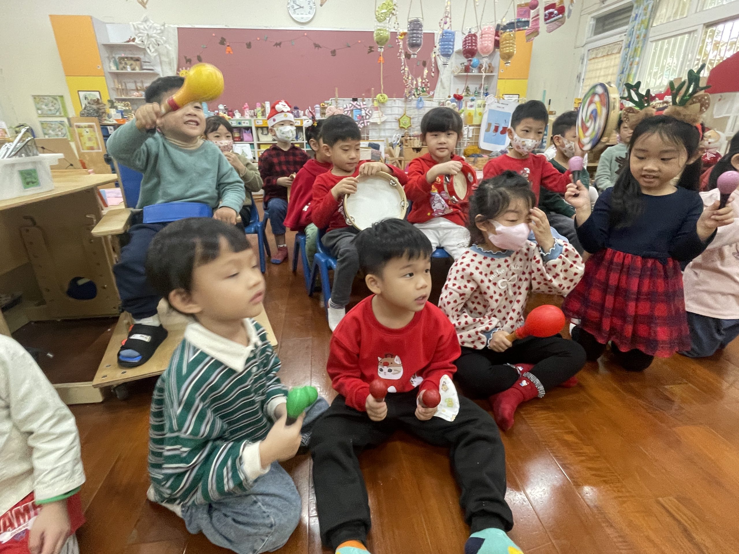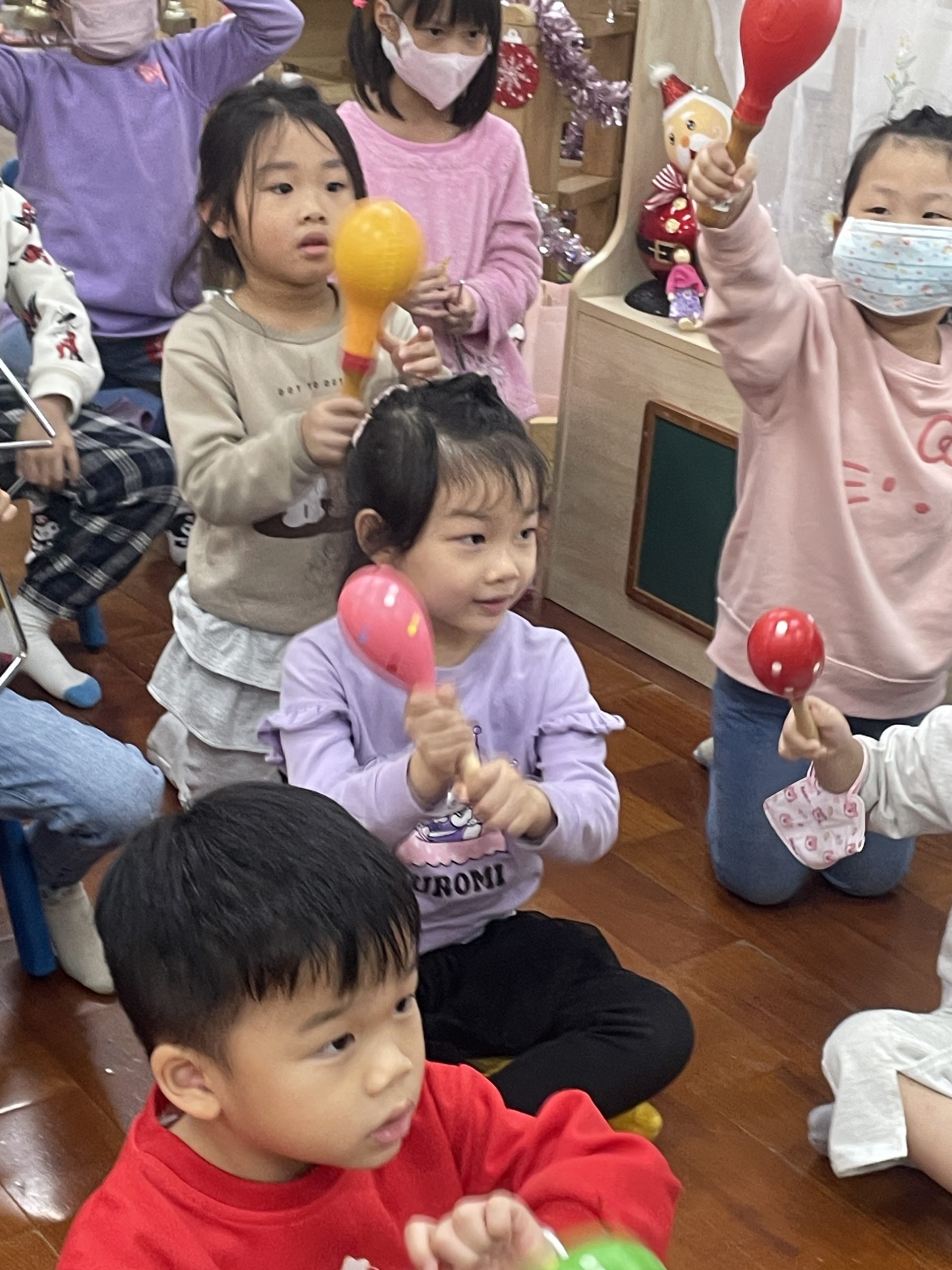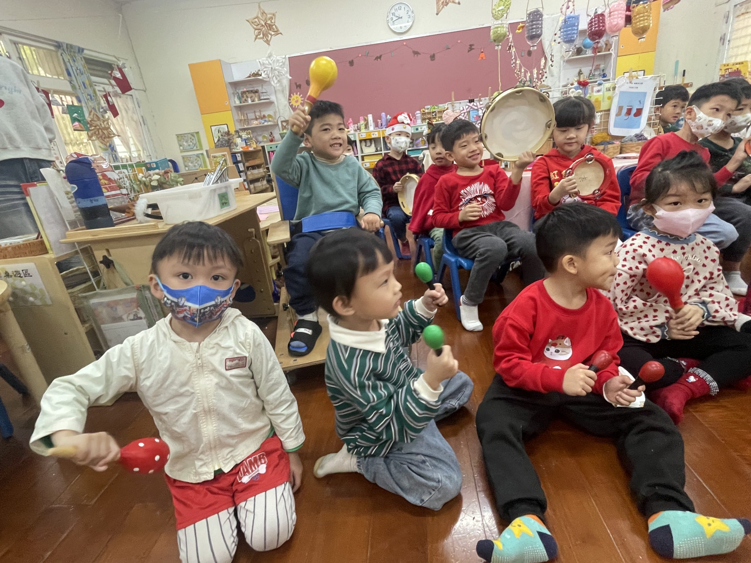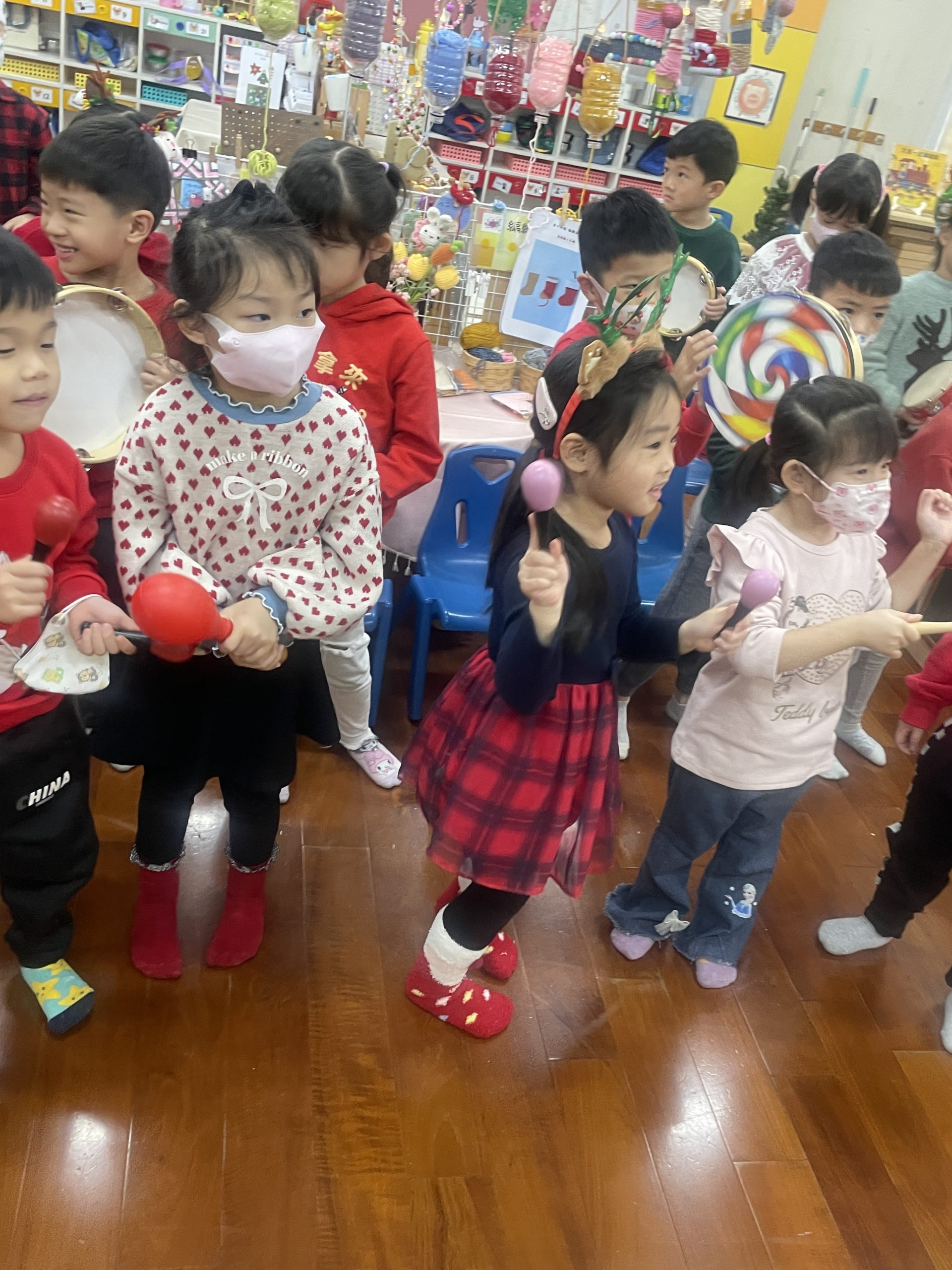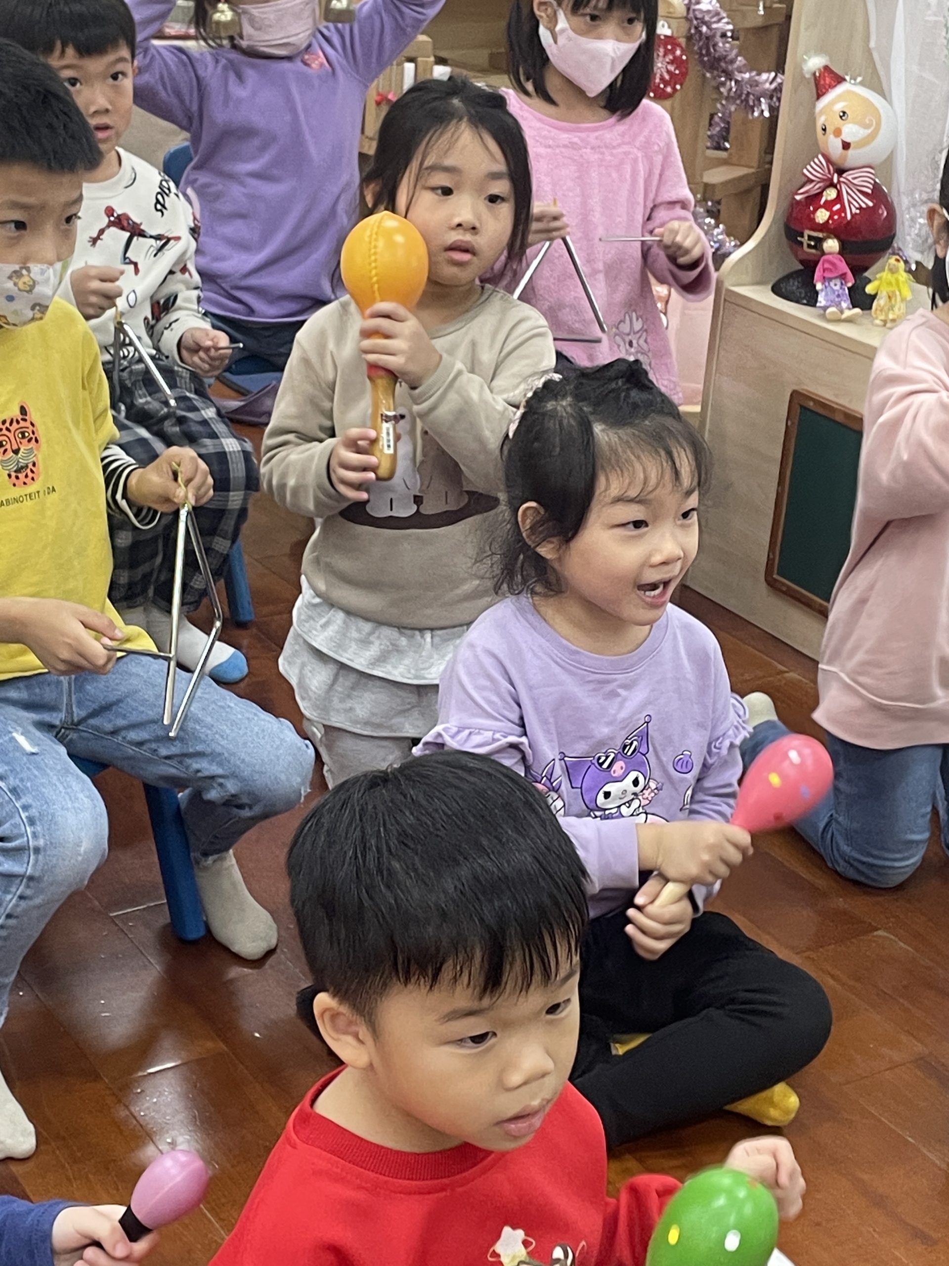 12/23 今天繼續練習兩首報佳音的歌曲~<聖誕老公公的鈴鐺不見了>和<粉紅色的聖誕節>,大班的三角鐵、鈴鼓與中班的沙鈴,邊唱邊跳邊打節奏,大家的專注力都進步囉!