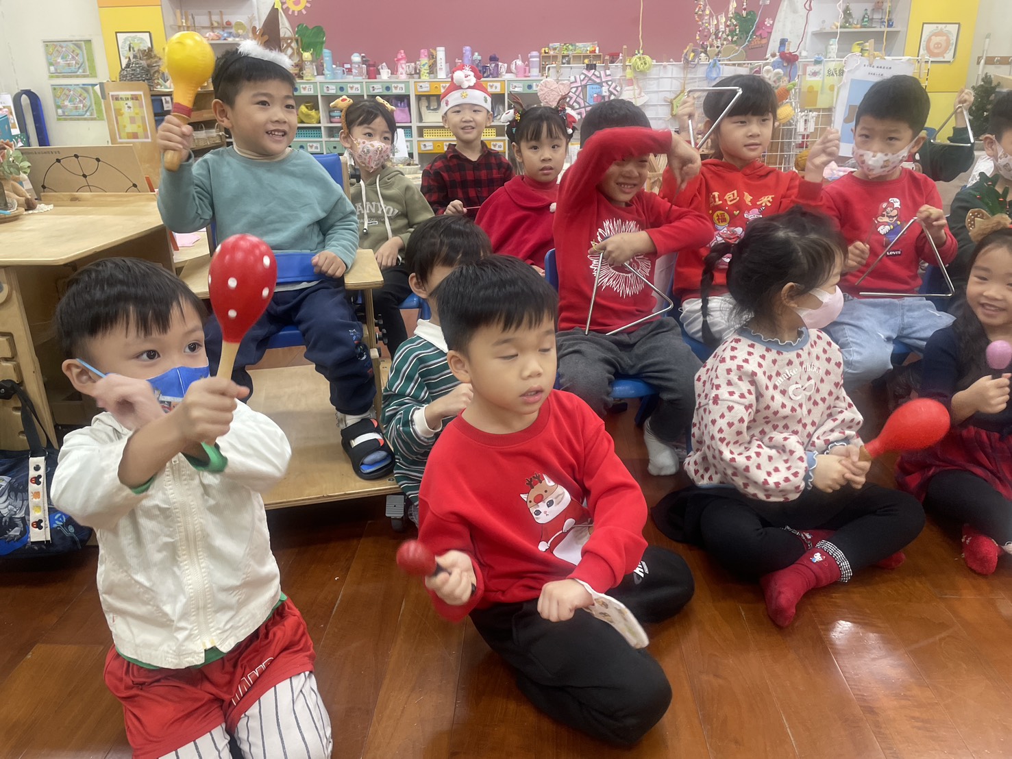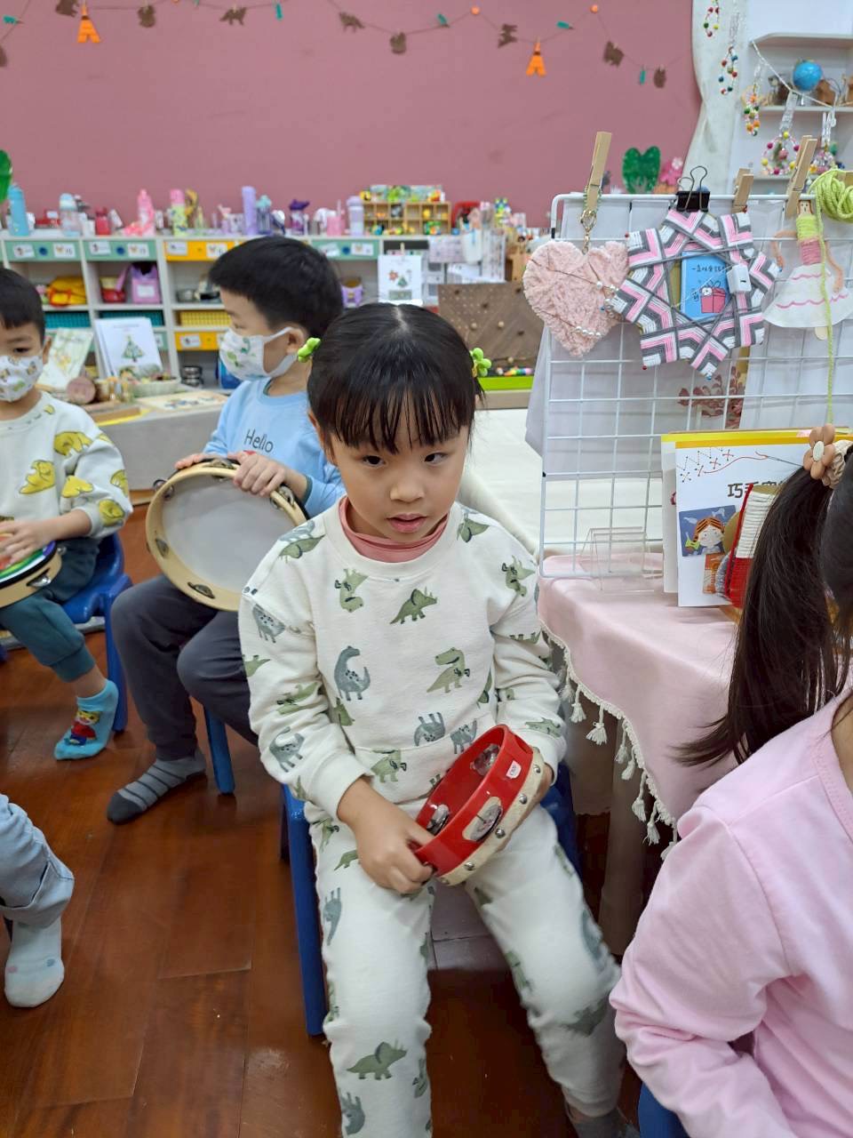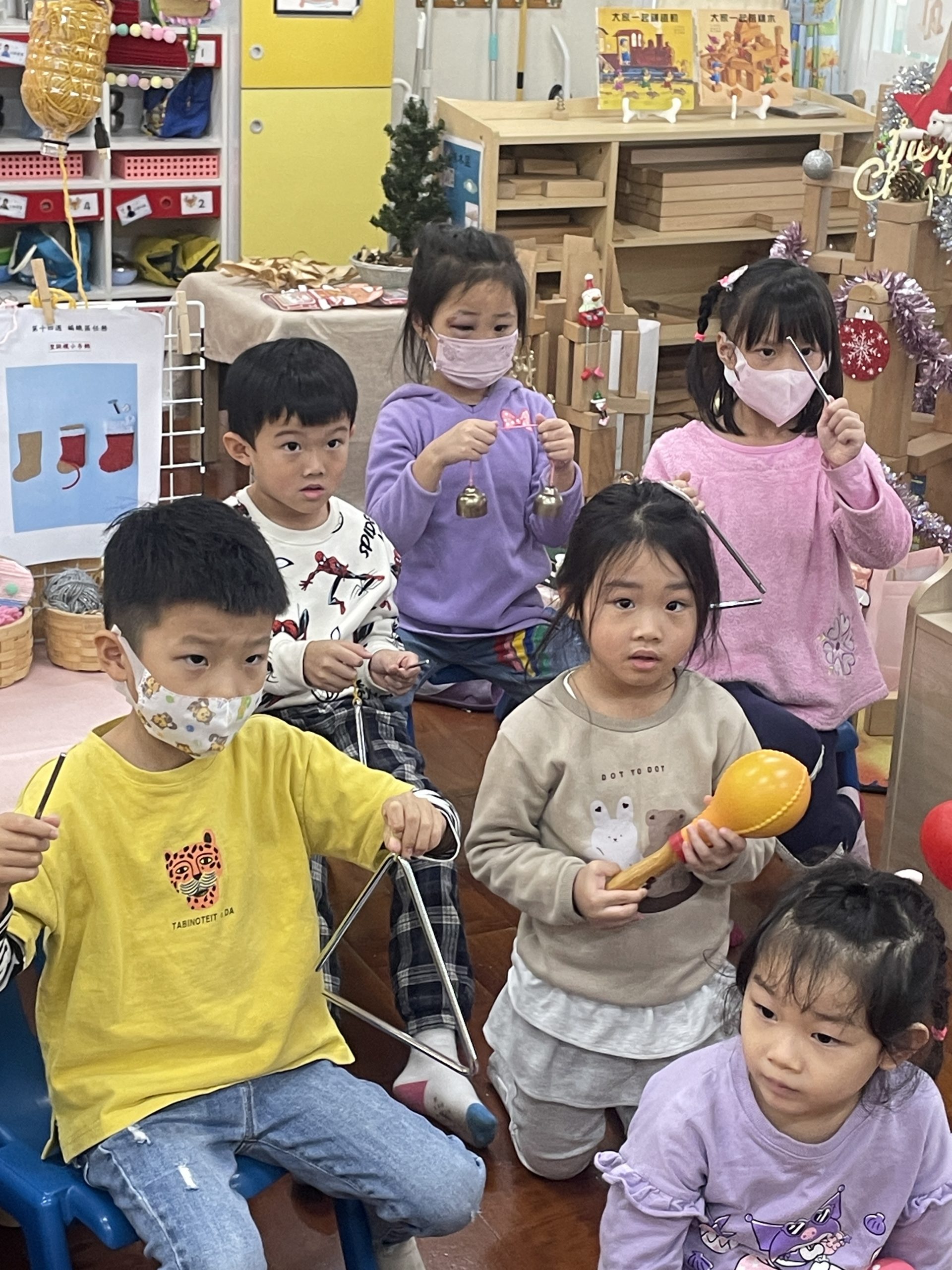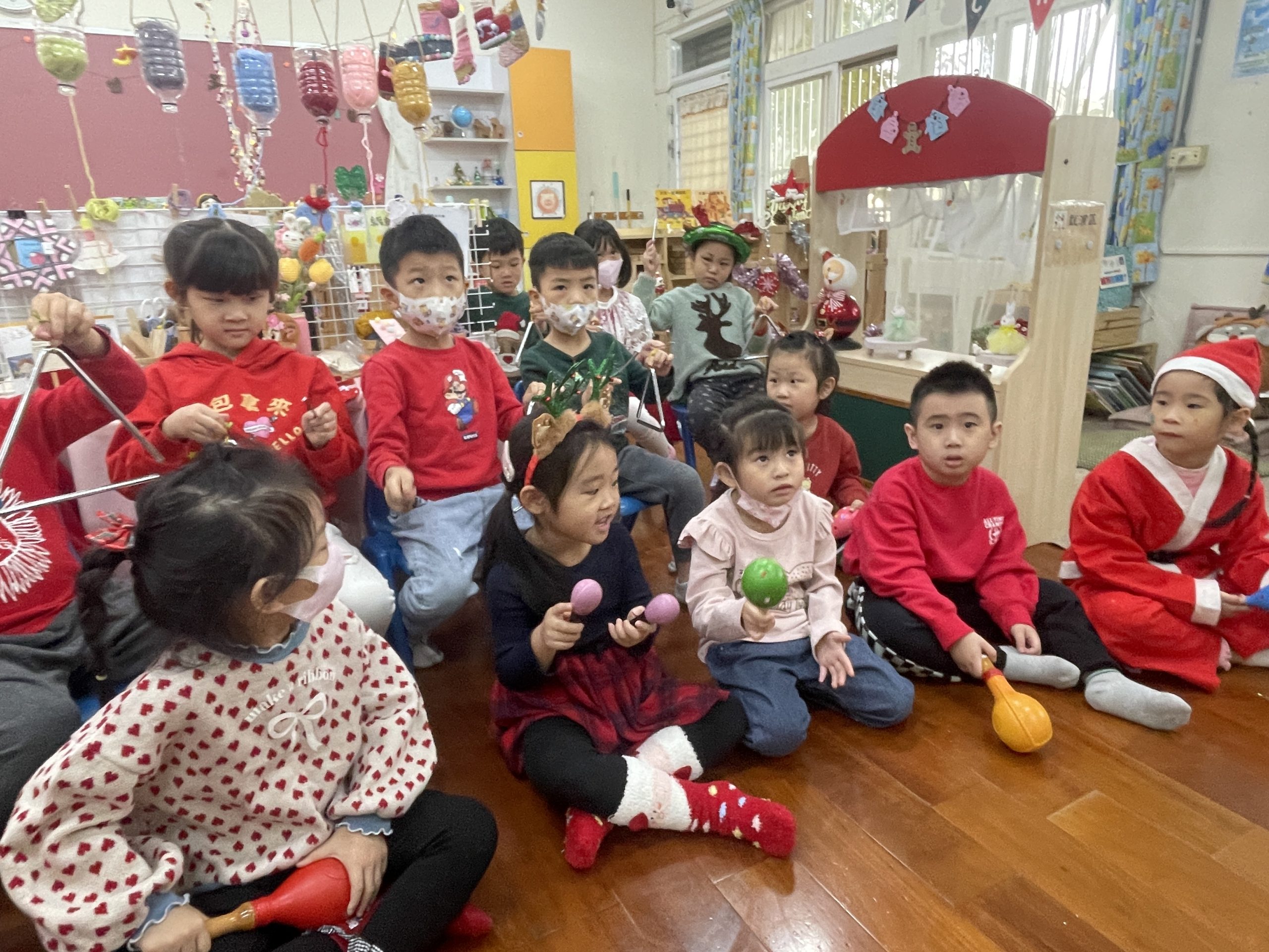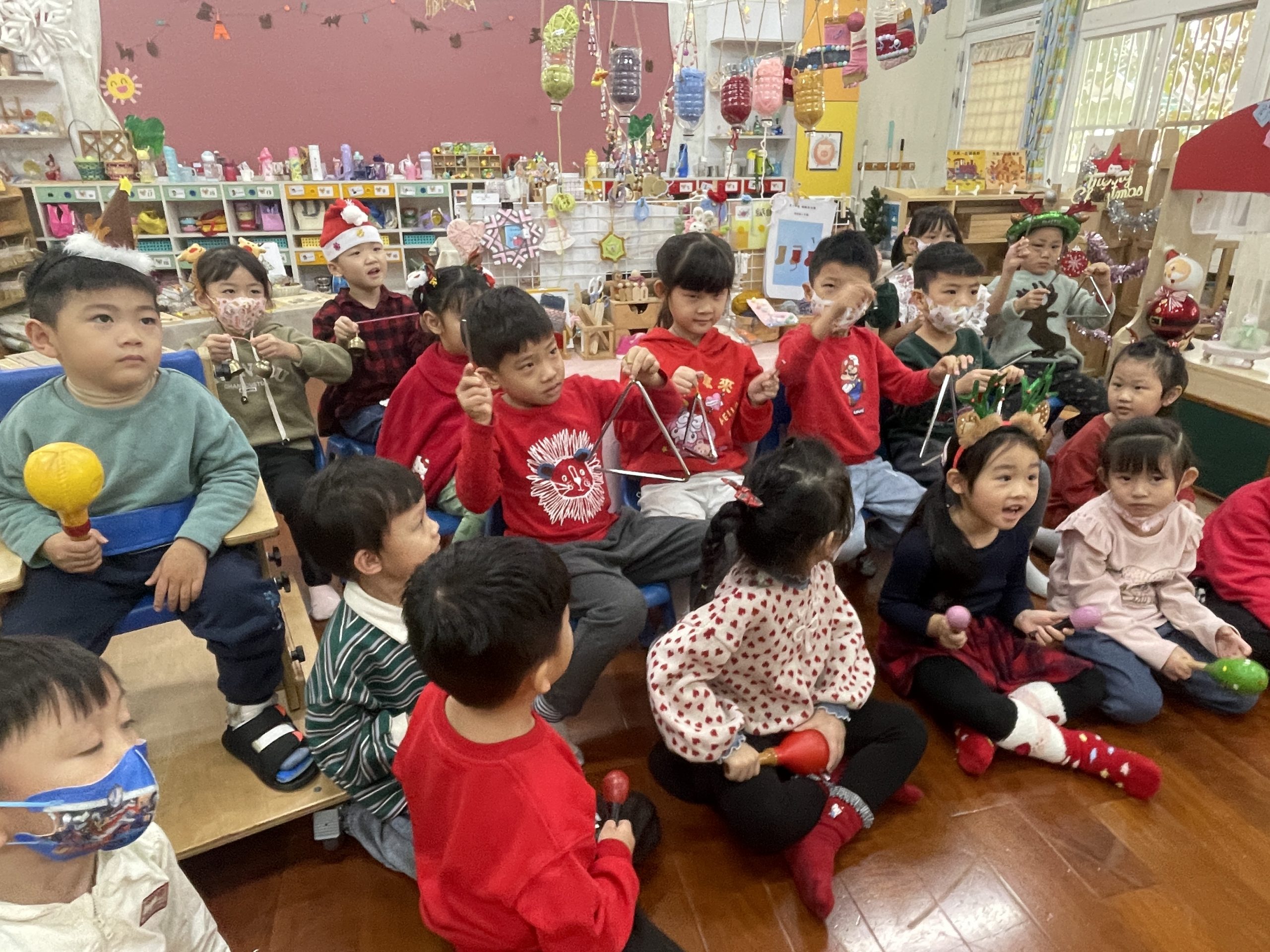 12/23 今天繼續練習兩首報佳音的歌曲~<聖誕老公公的鈴鐺不見了>和<粉紅色的聖誕節>,大班的三角鐵、鈴鼓與中班的沙鈴,邊唱邊跳邊打節奏,大家的專注力都進步囉!
