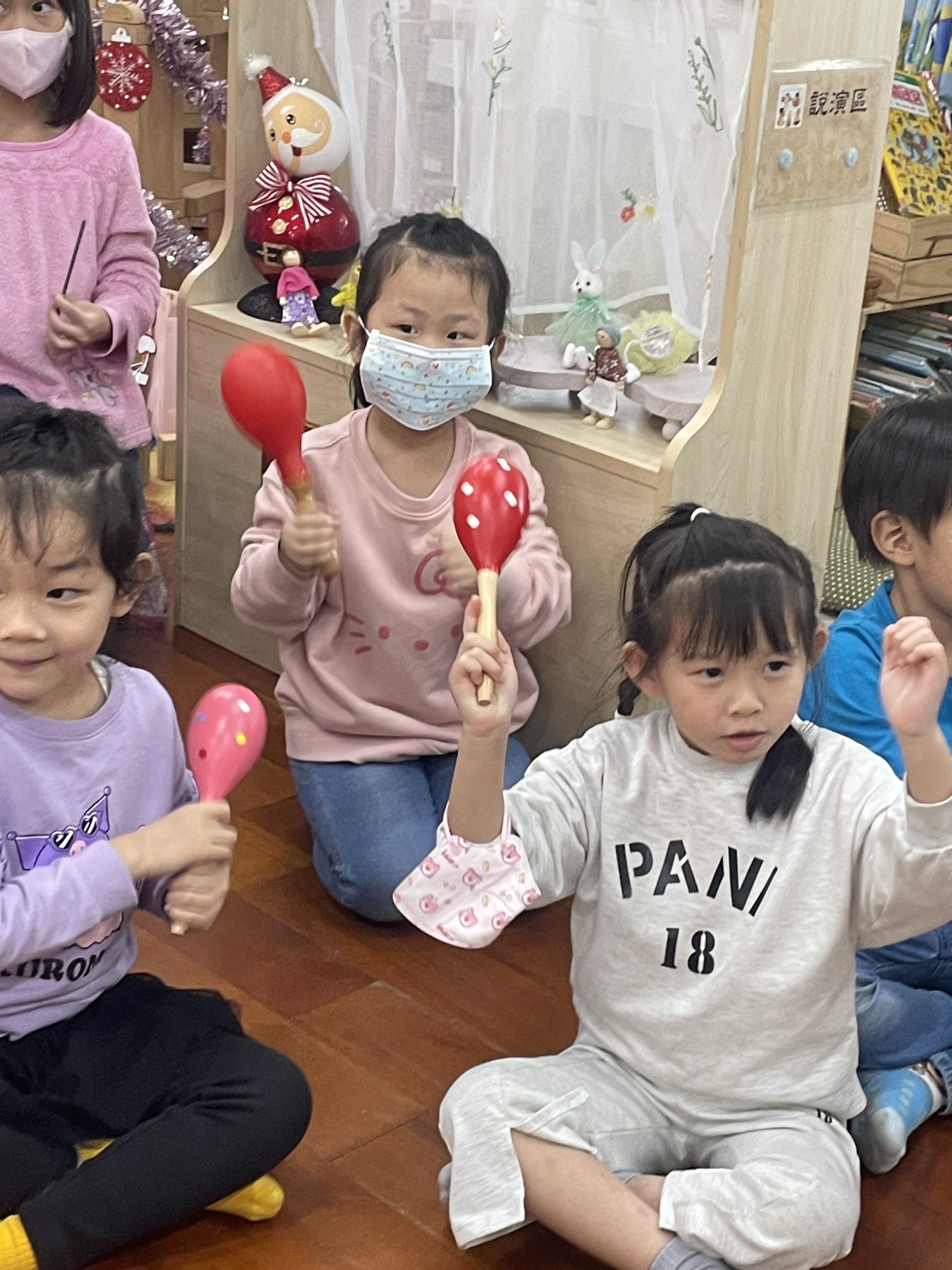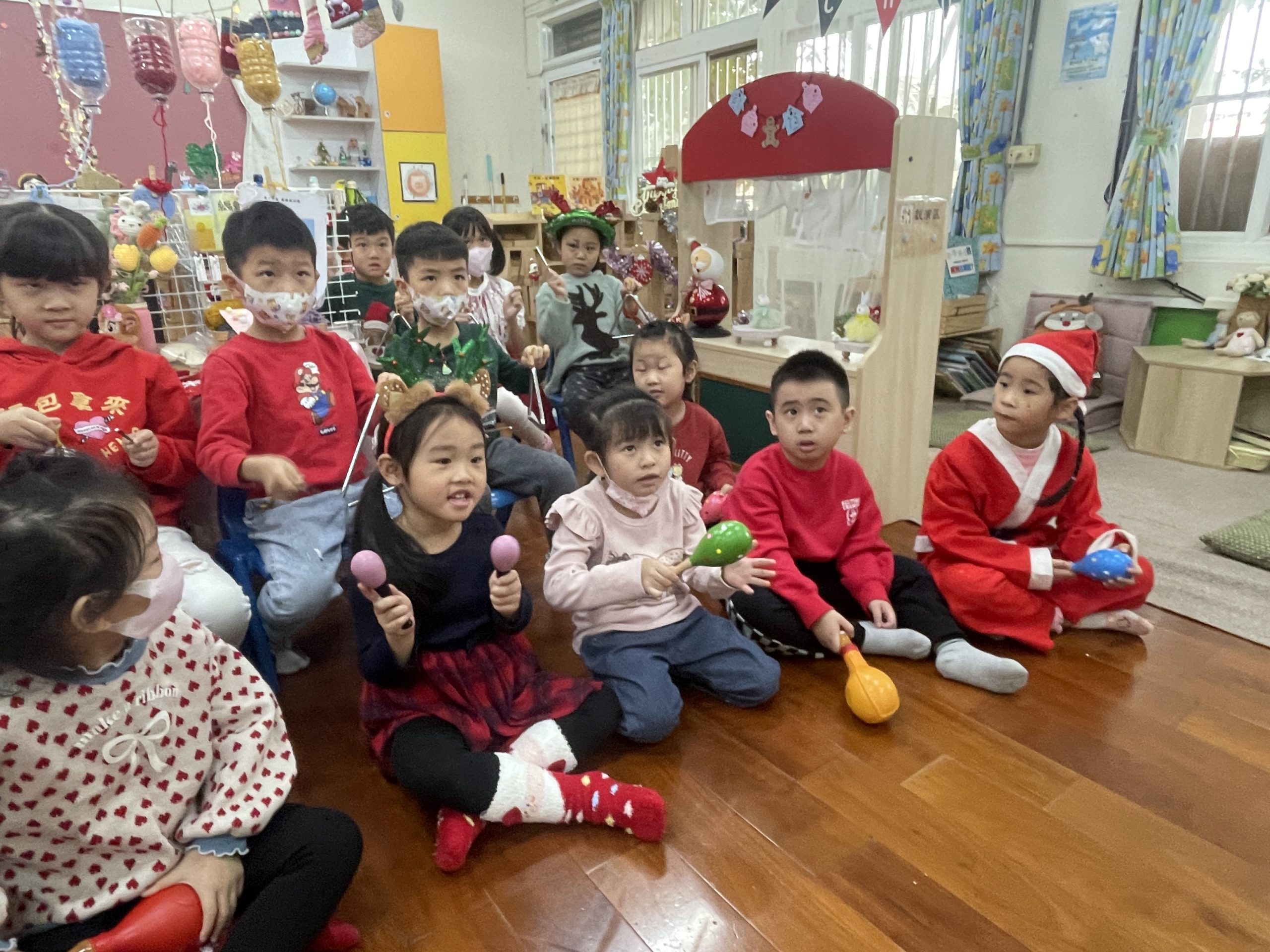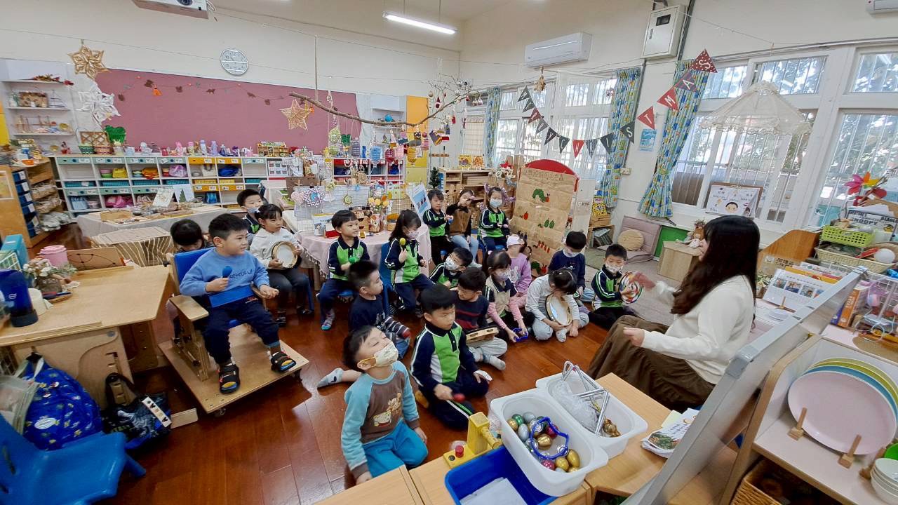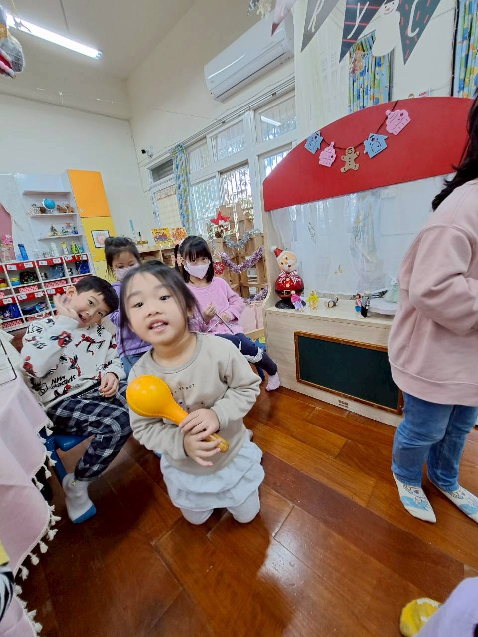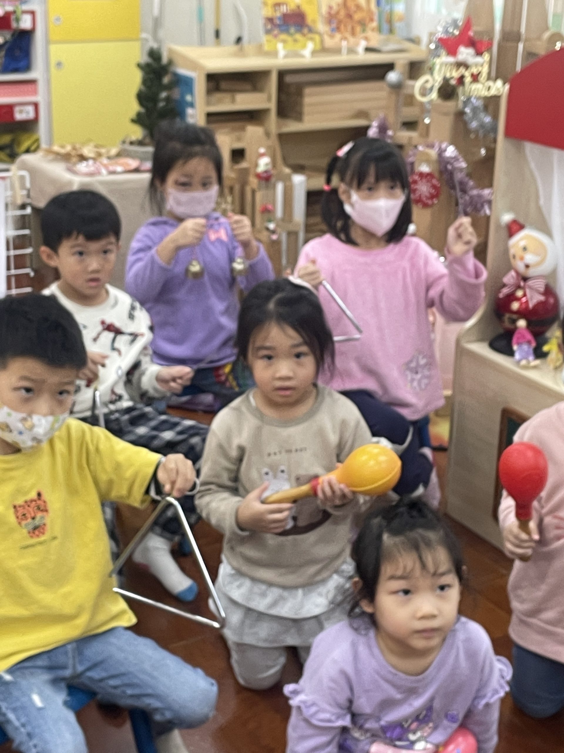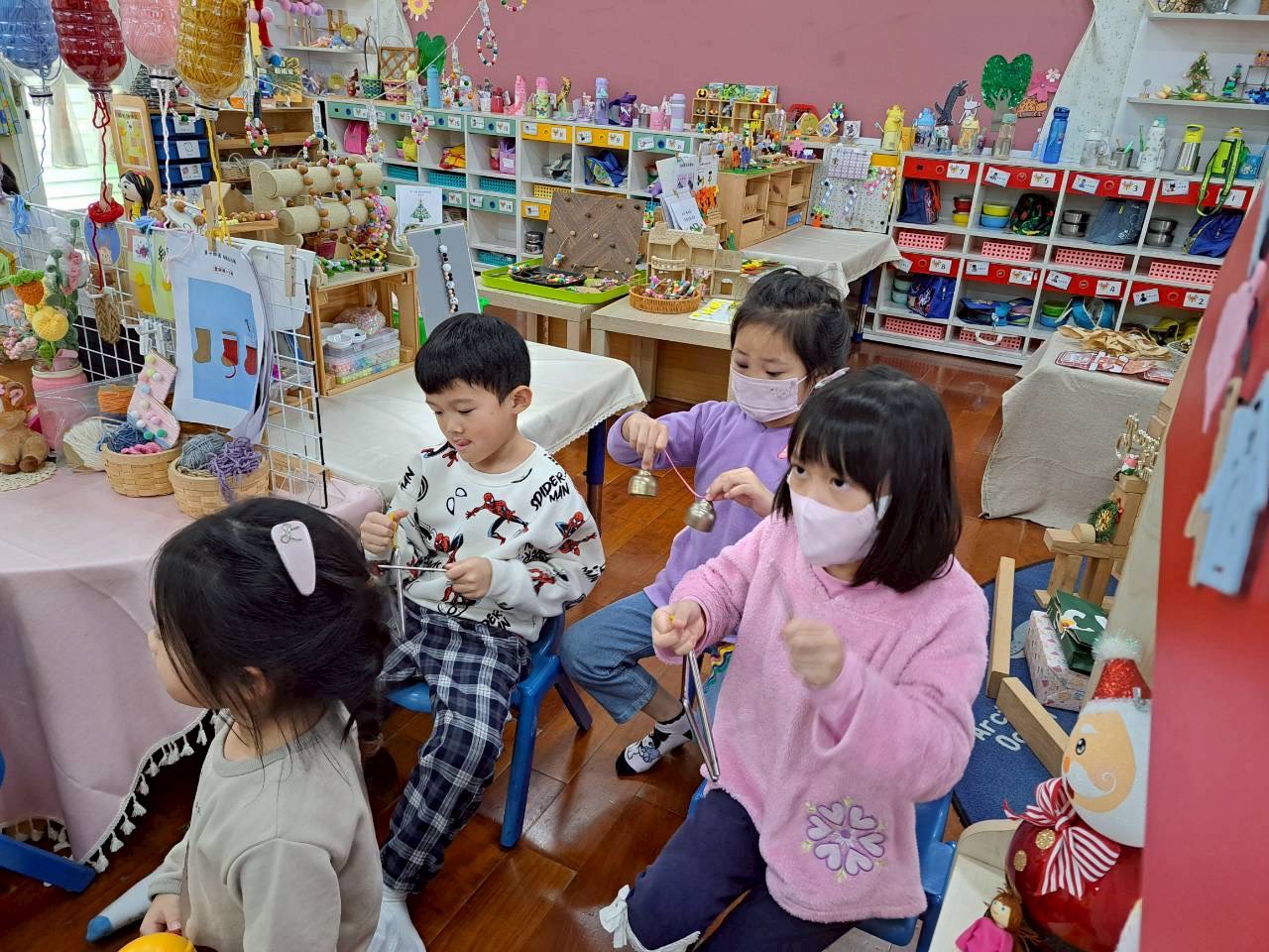 12/23 今天繼續練習兩首報佳音的歌曲~<聖誕老公公的鈴鐺不見了>和<粉紅色的聖誕節>,大班的三角鐵、鈴鼓與中班的沙鈴,邊唱邊跳邊打節奏,大家的專注力都進步囉!