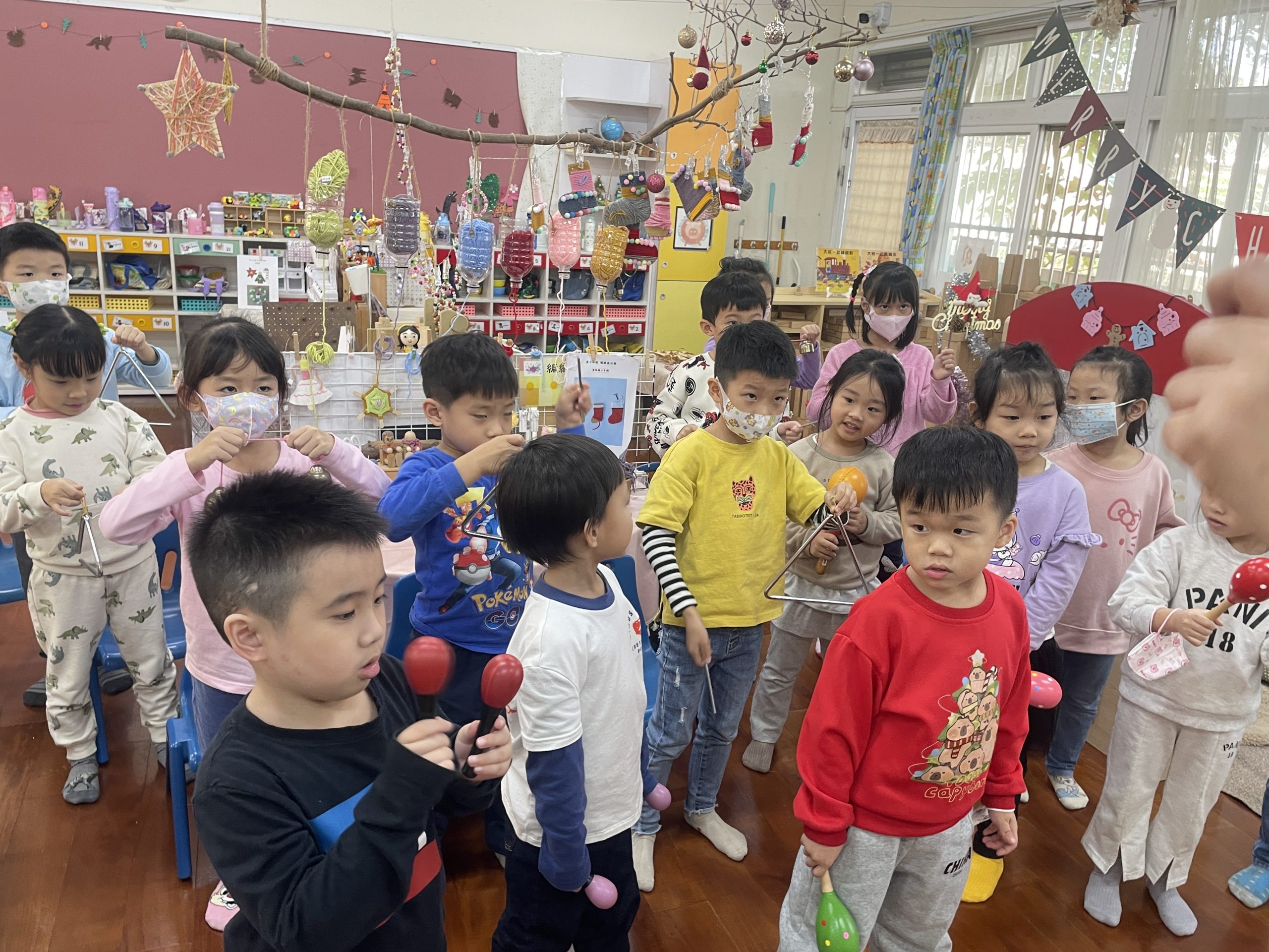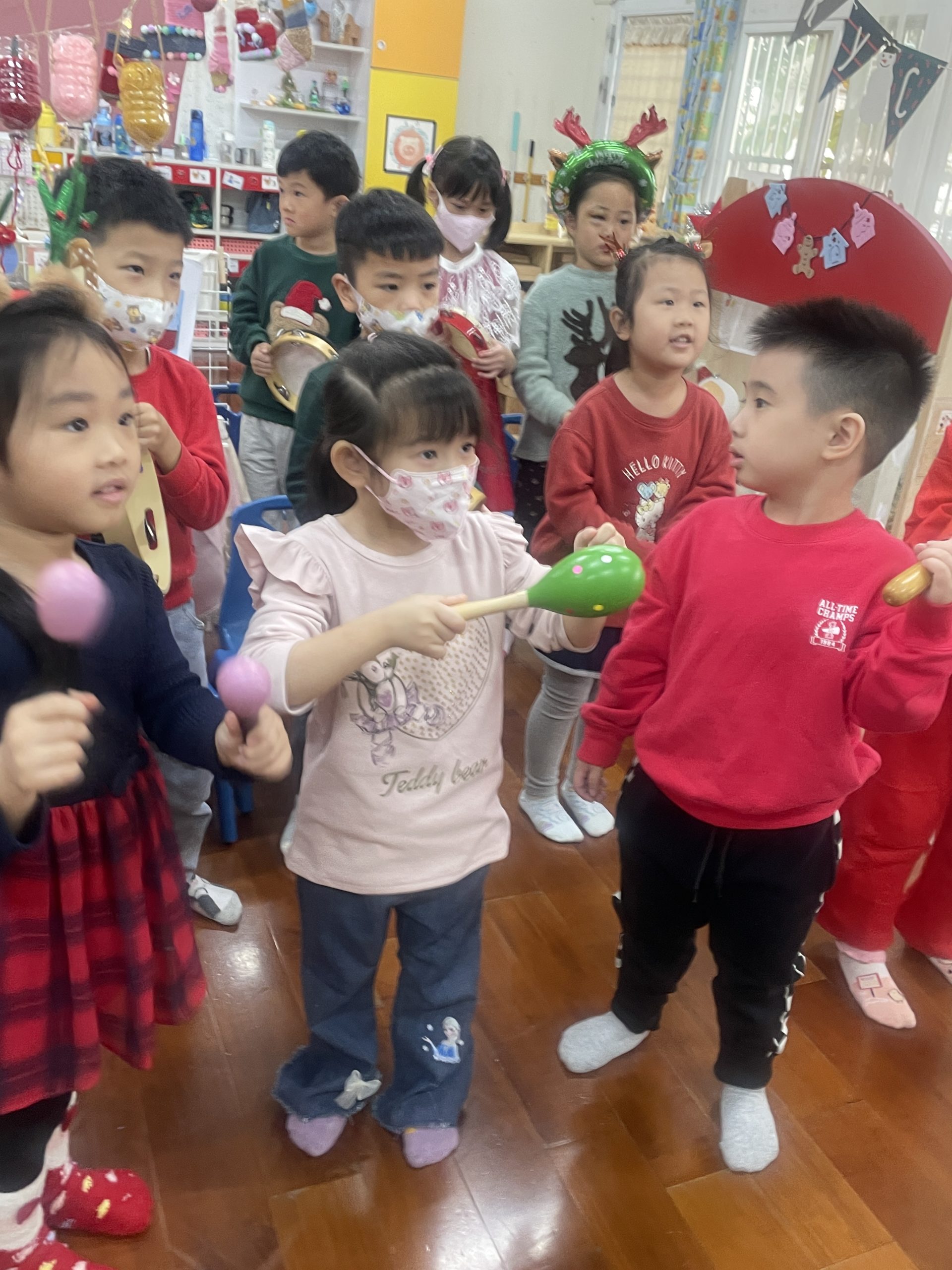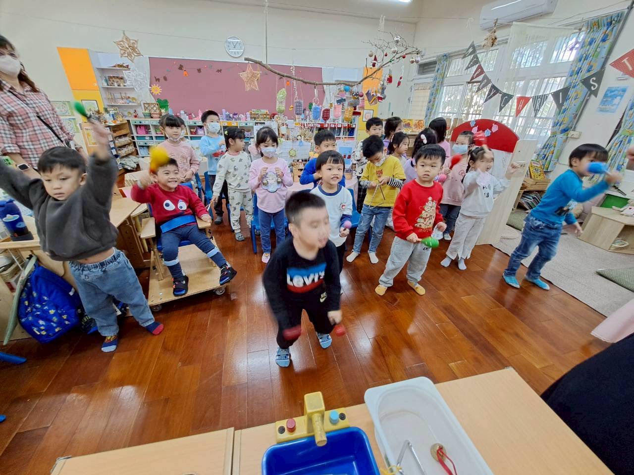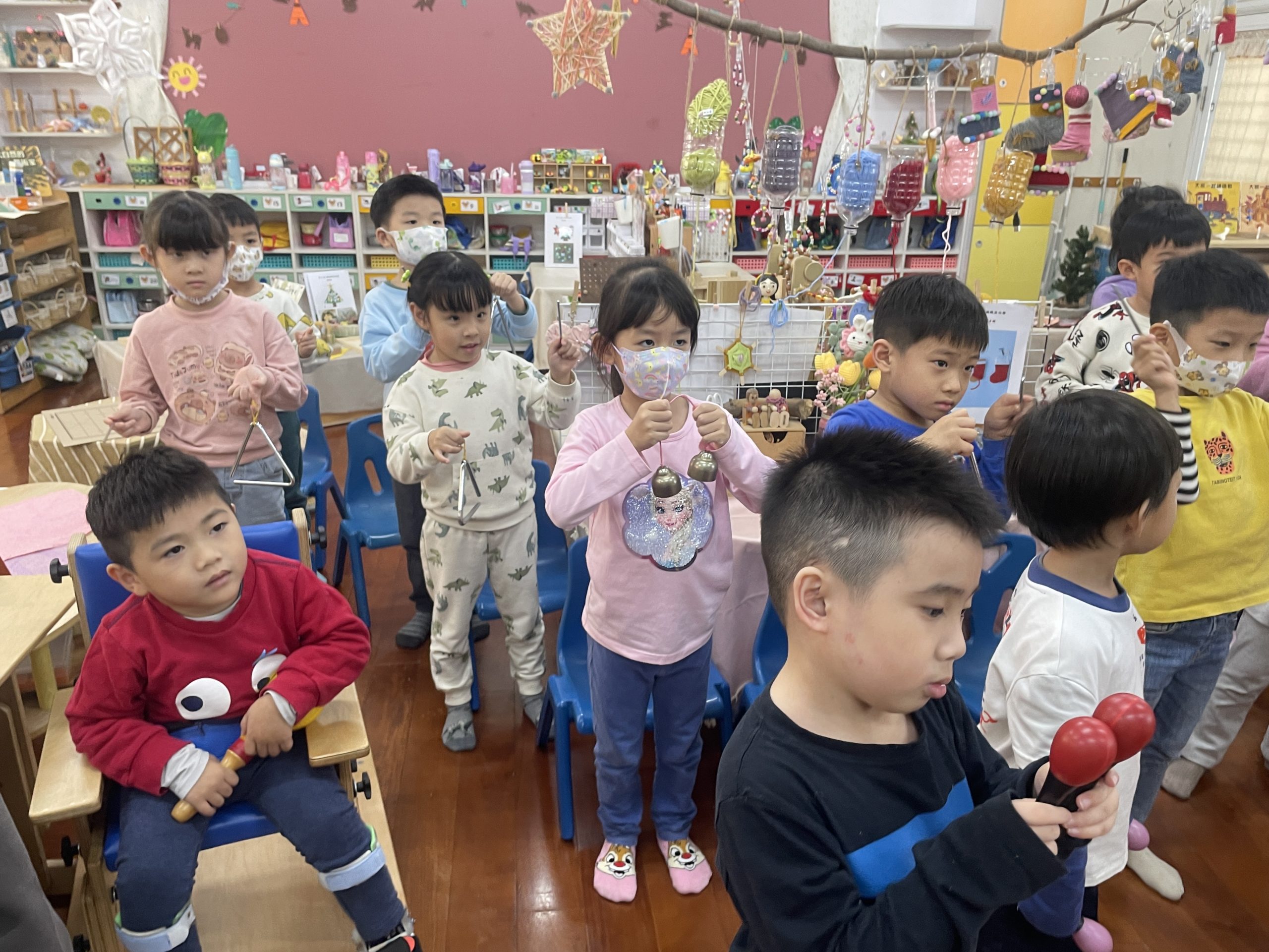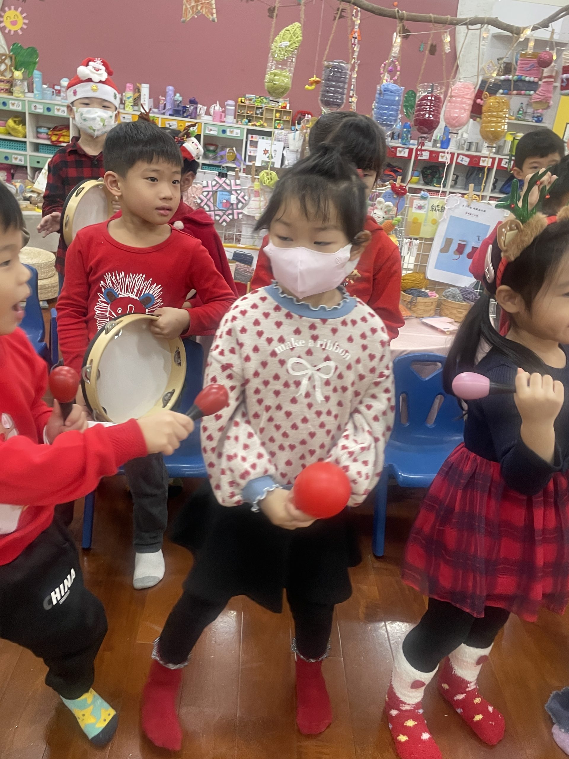 12/23 今天繼續練習兩首報佳音的歌曲~<聖誕老公公的鈴鐺不見了>和<粉紅色的聖誕節>,大班的三角鐵、鈴鼓與中班的沙鈴,邊唱邊跳邊打節奏,大家的專注力都進步囉!