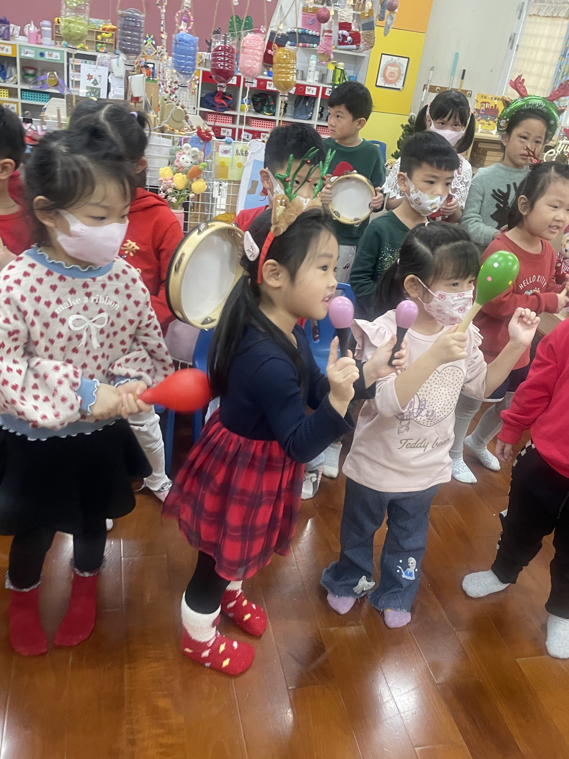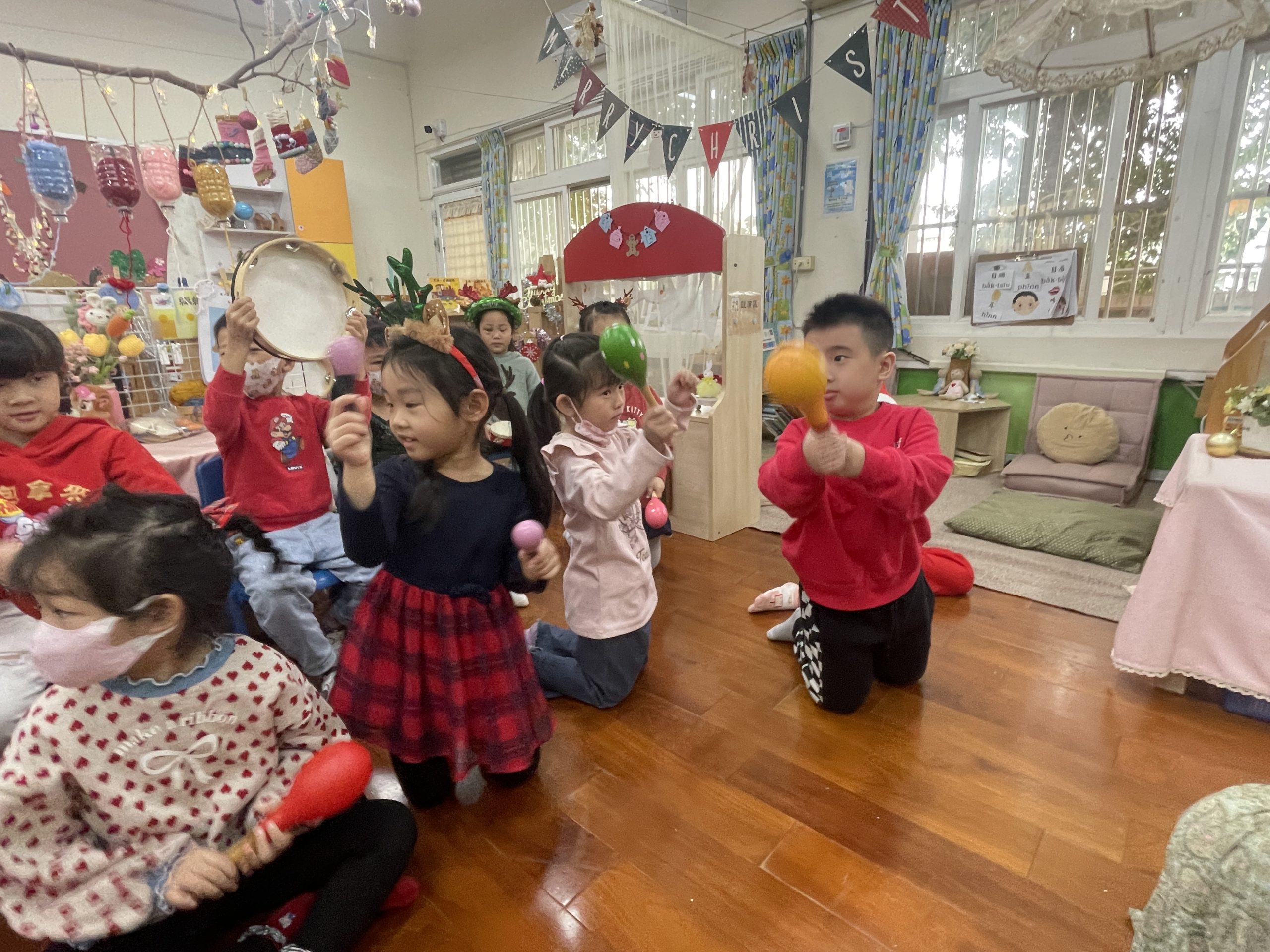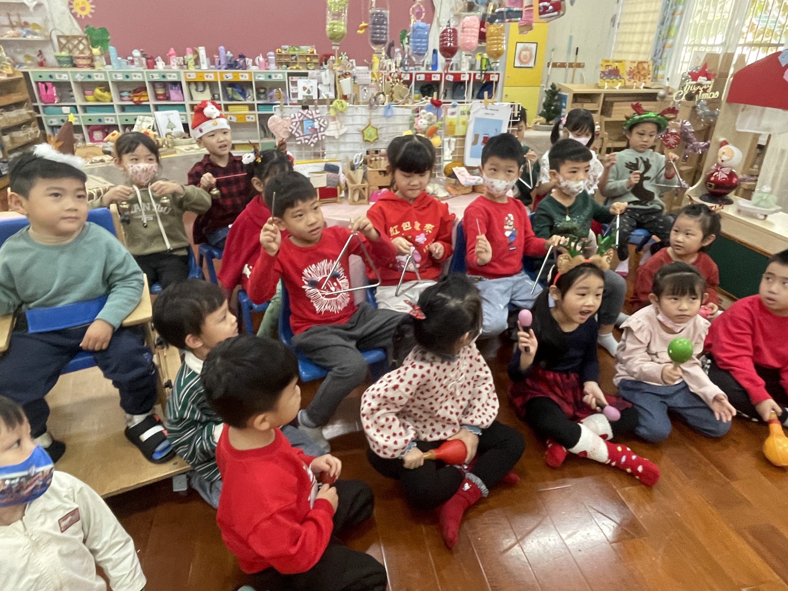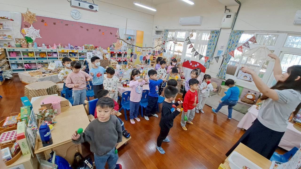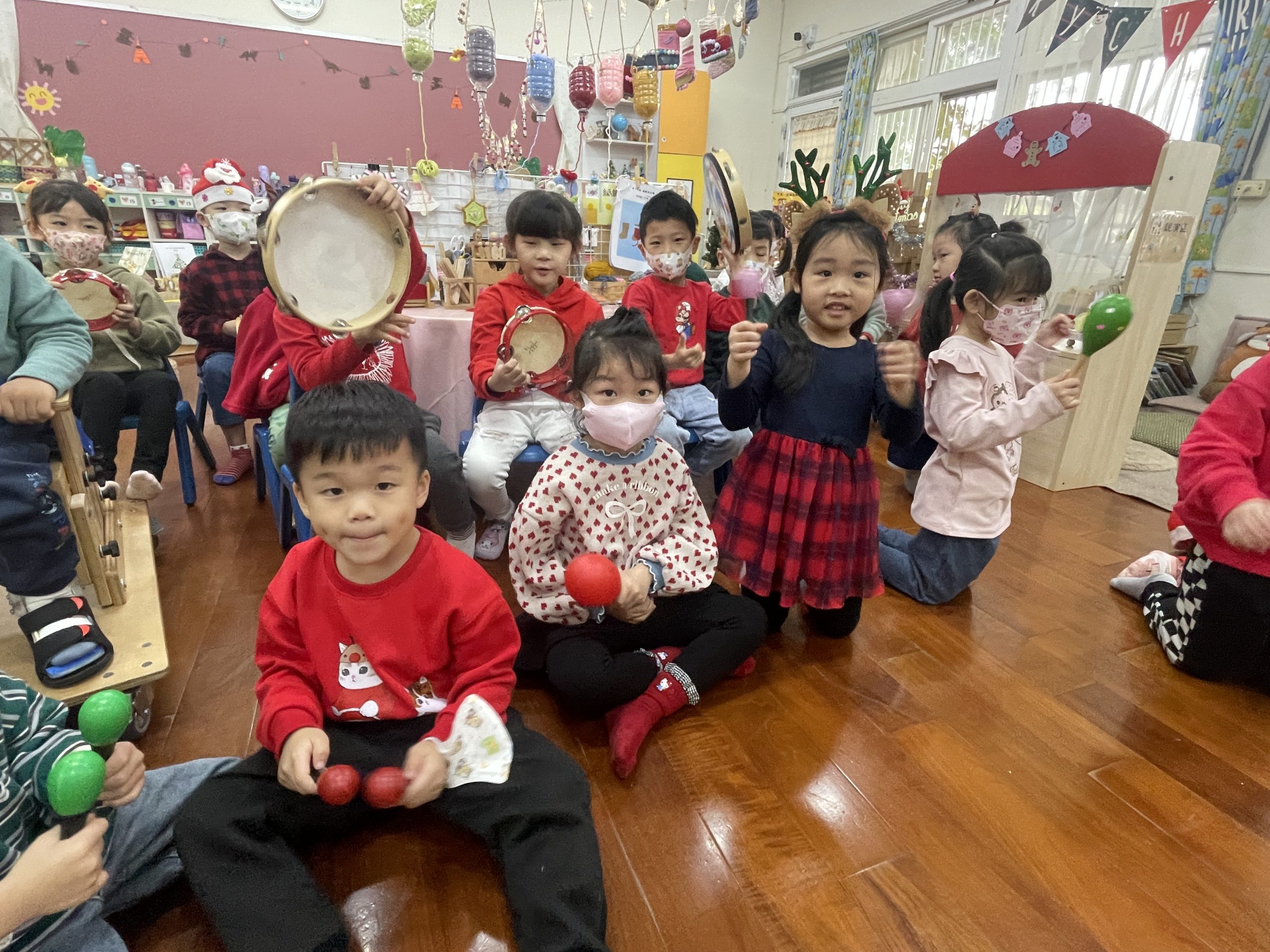 12/23 今天繼續練習兩首報佳音的歌曲~<聖誕老公公的鈴鐺不見了>和<粉紅色的聖誕節>,大班的三角鐵、鈴鼓與中班的沙鈴,邊唱邊跳邊打節奏,大家的專注力都進步囉!