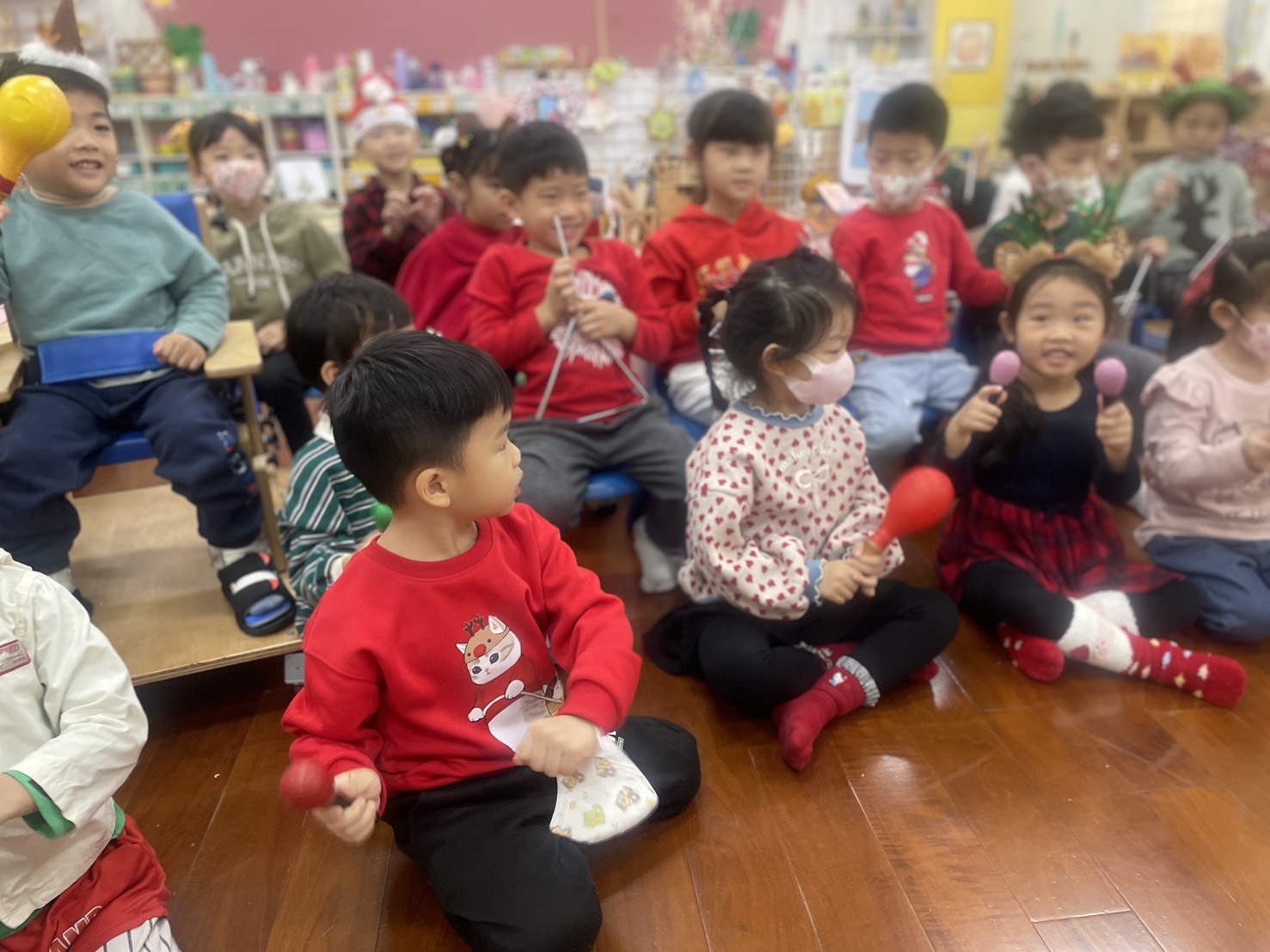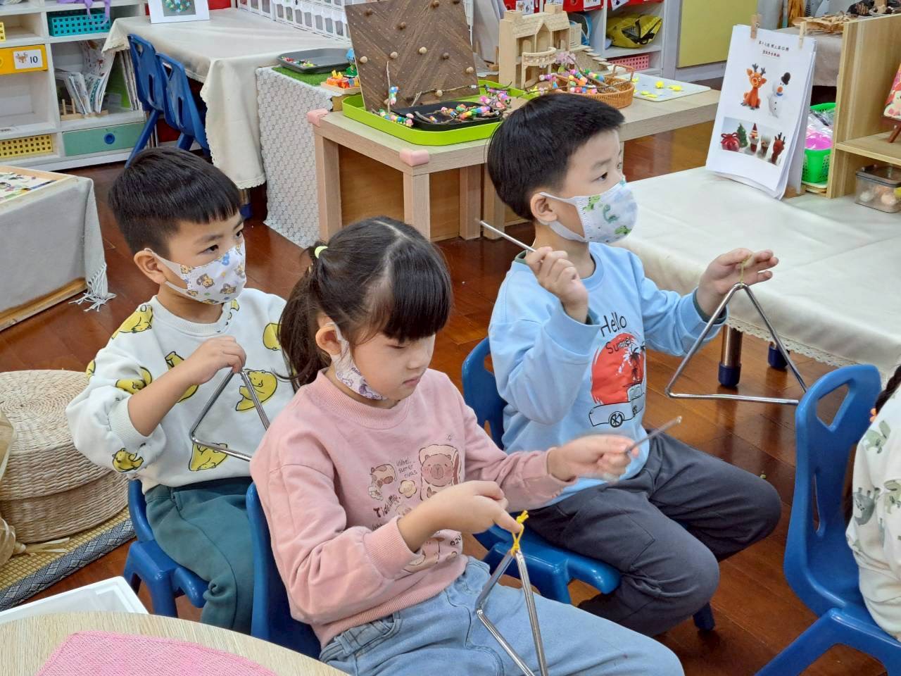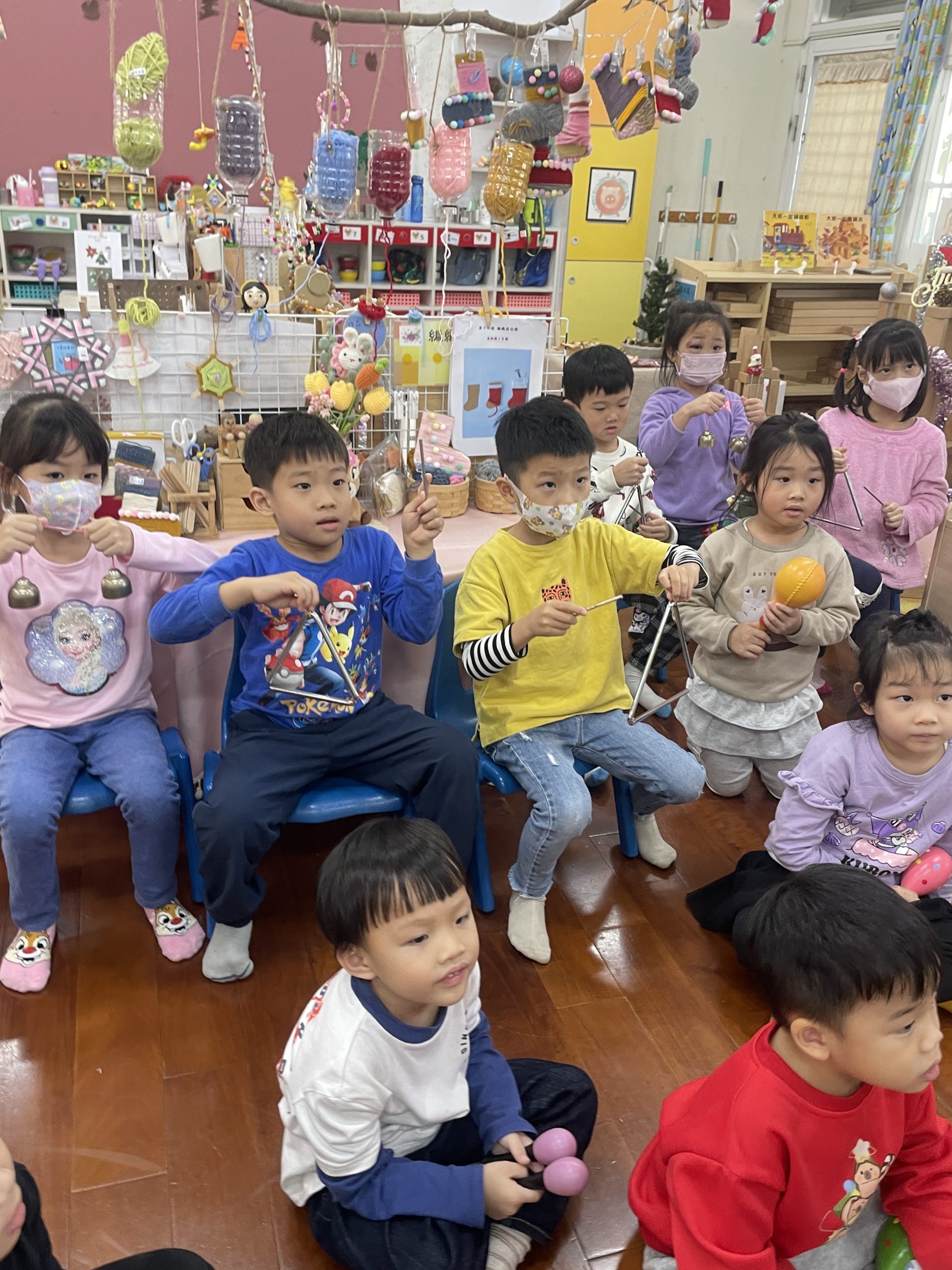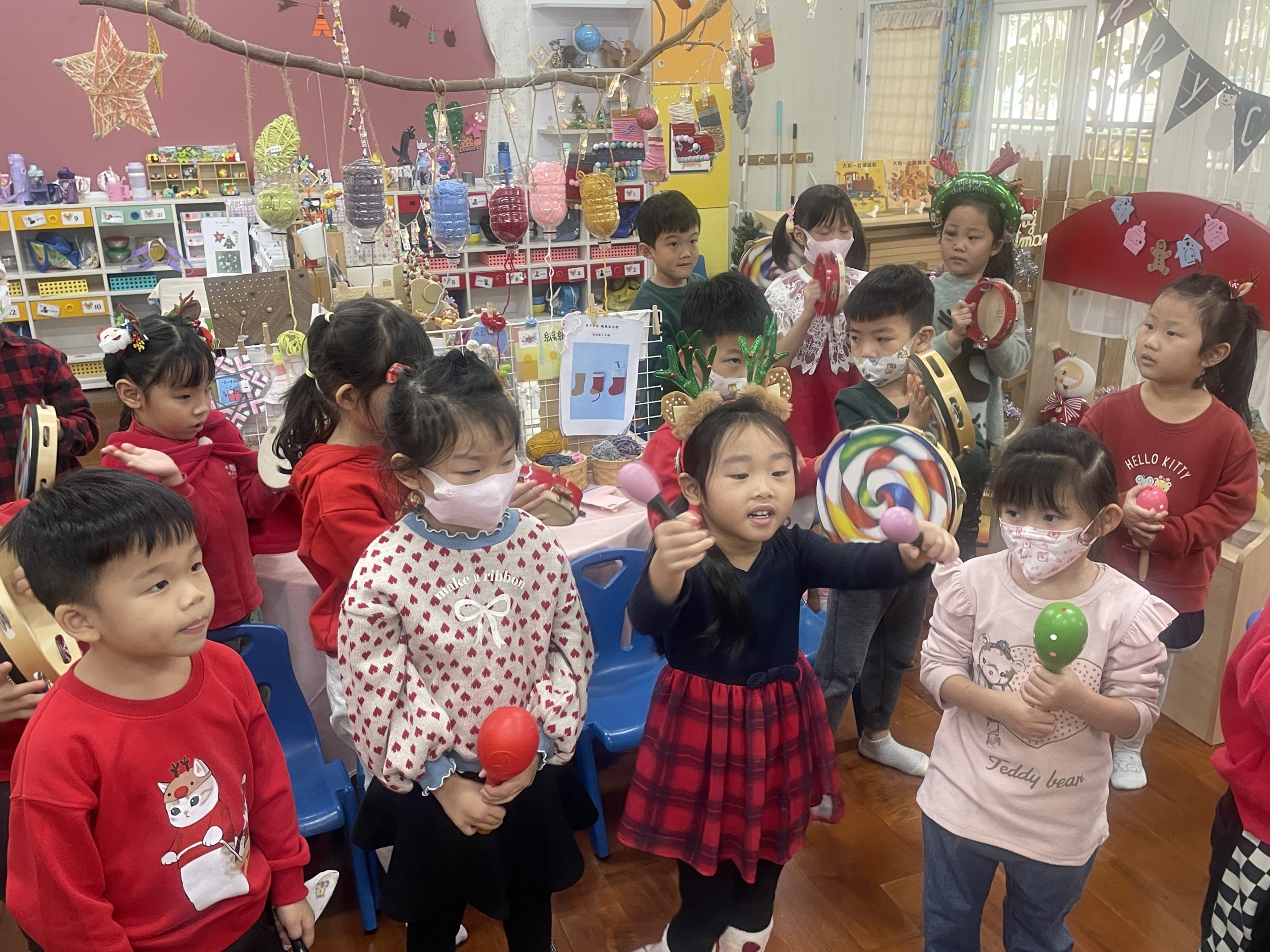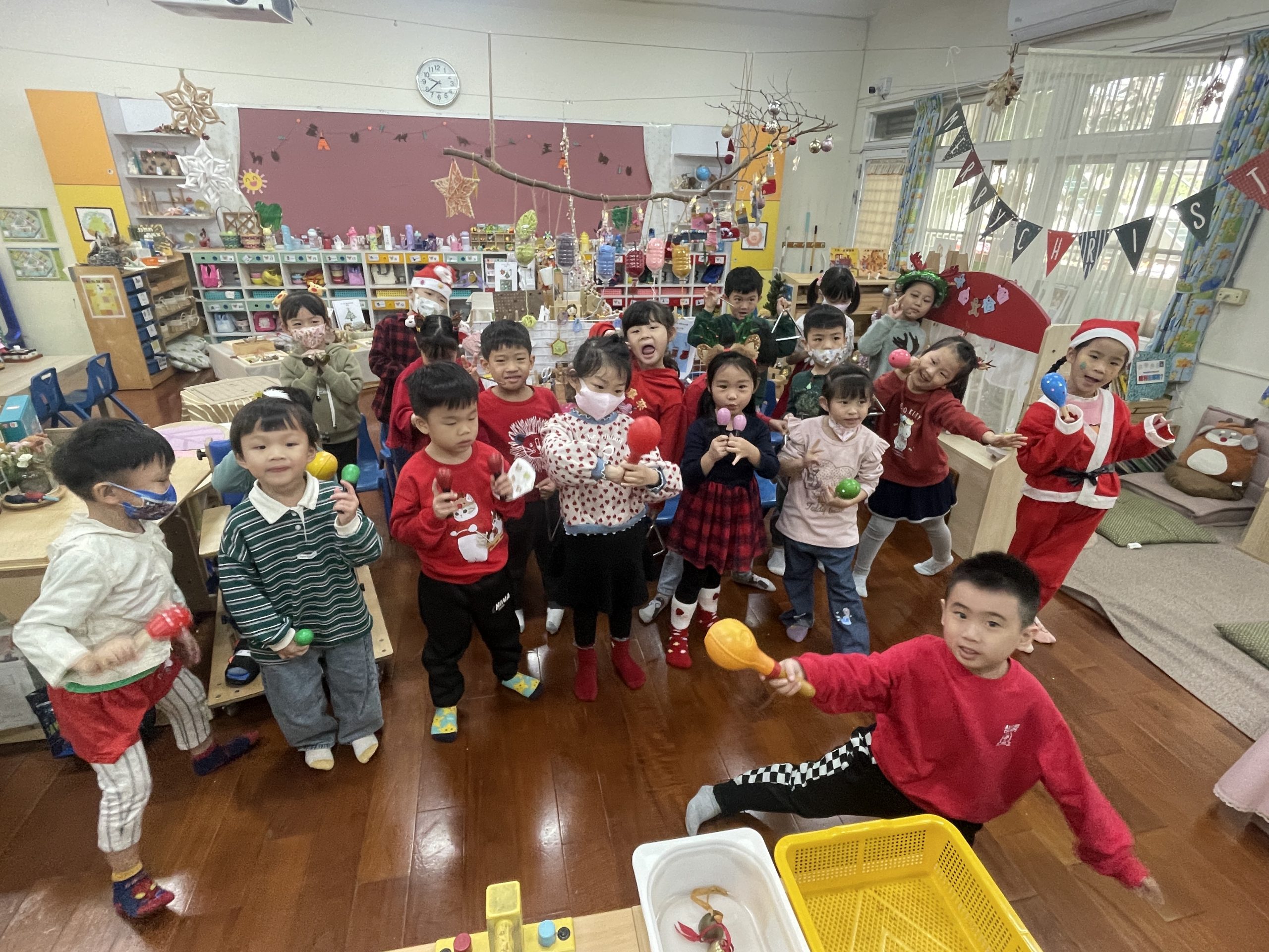 12/23 今天繼續練習兩首報佳音的歌曲~<聖誕老公公的鈴鐺不見了>和<粉紅色的聖誕節>,大班的三角鐵、鈴鼓與中班的沙鈴,邊唱邊跳邊打節奏,大家的專注力都進步囉!