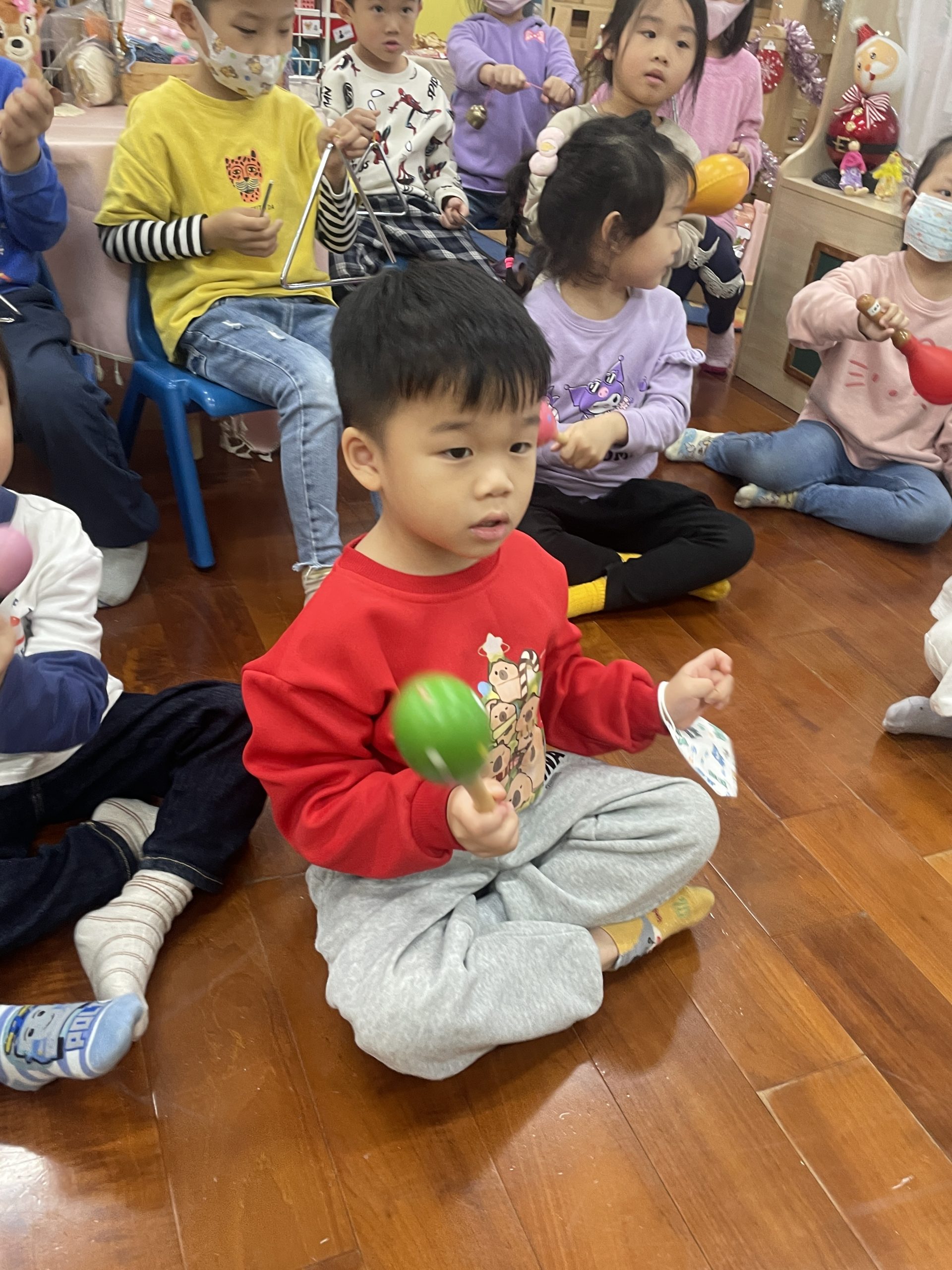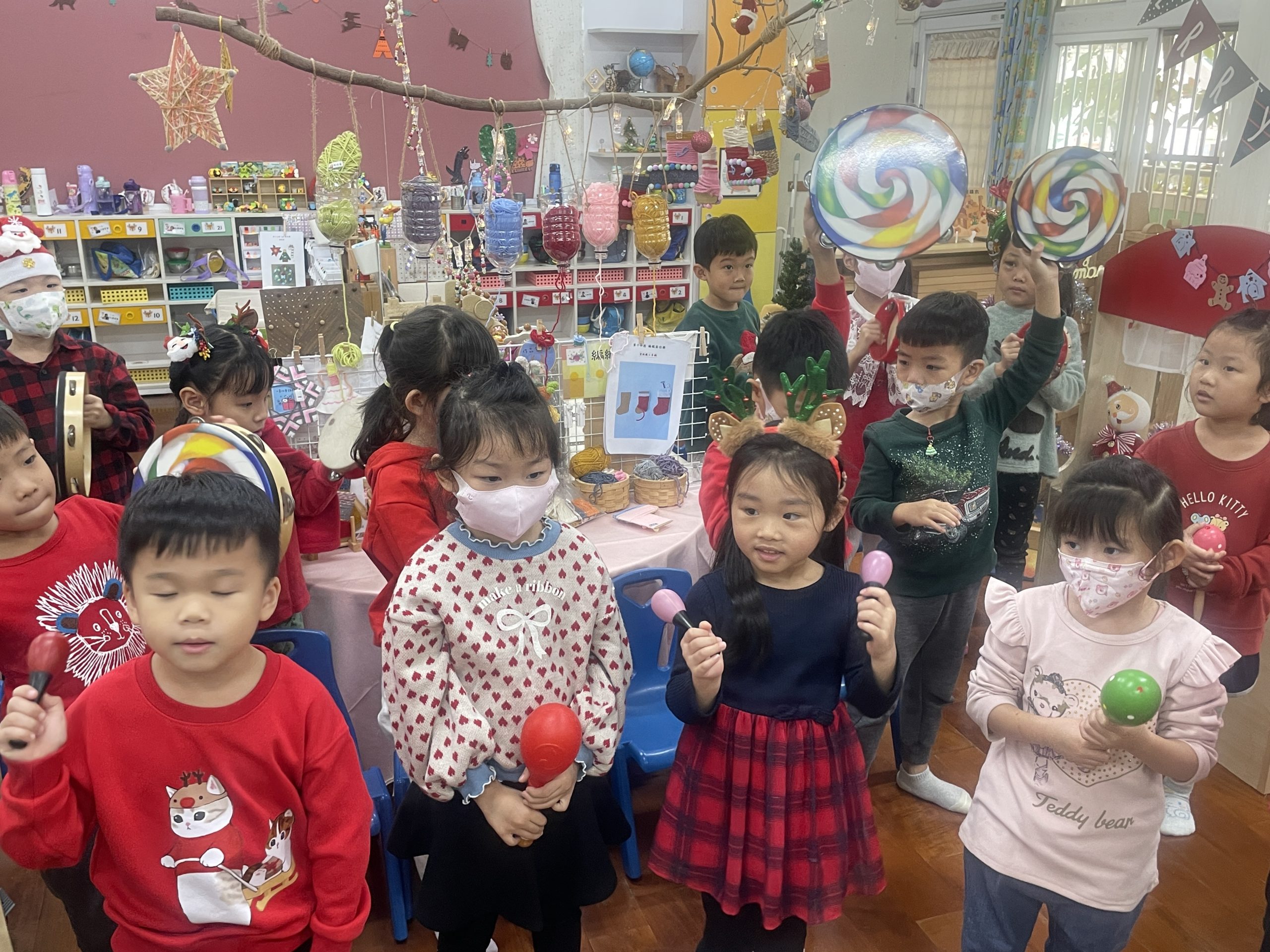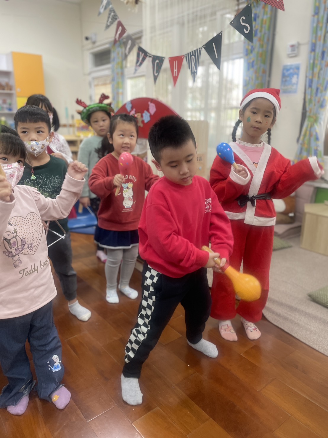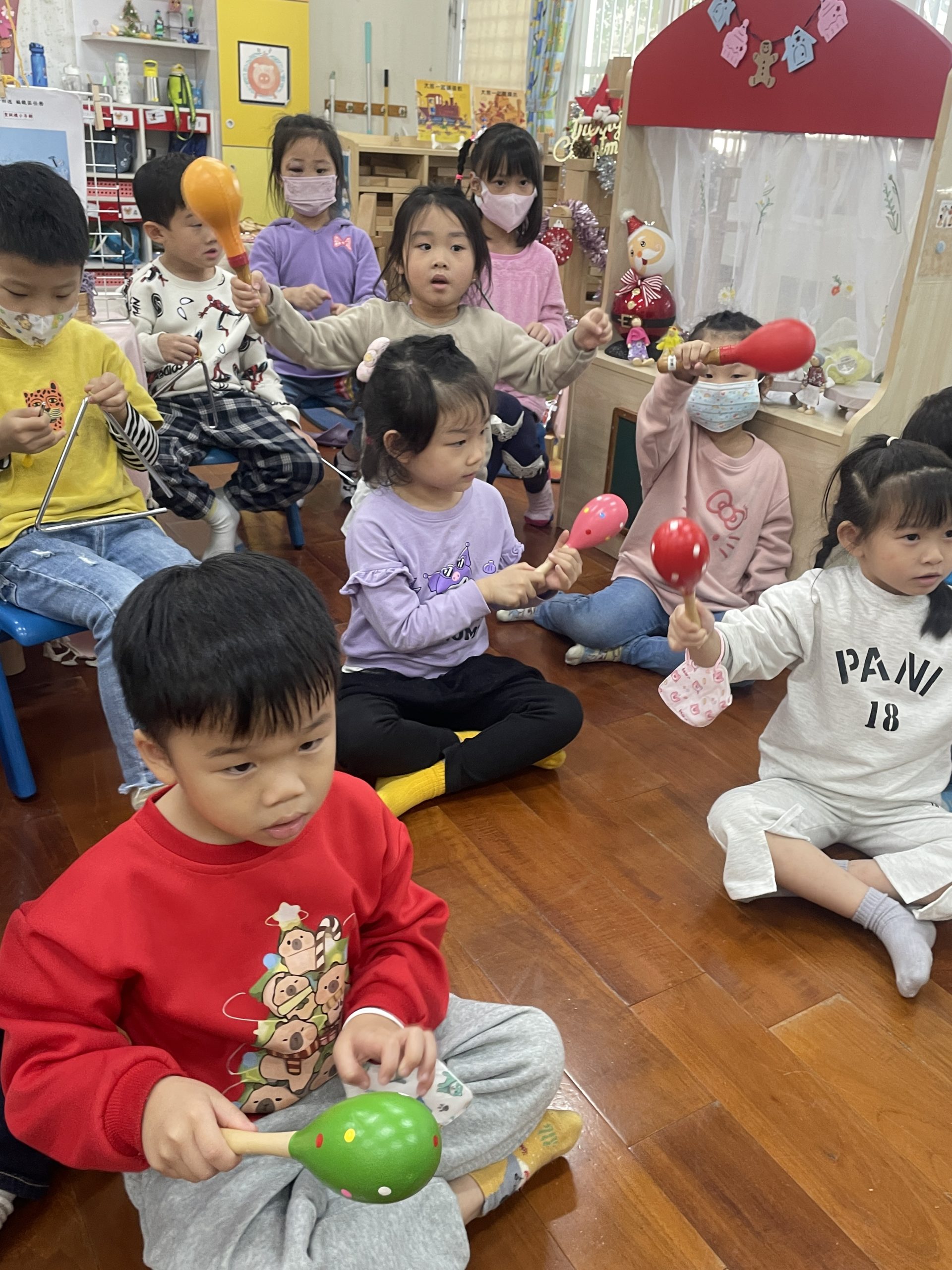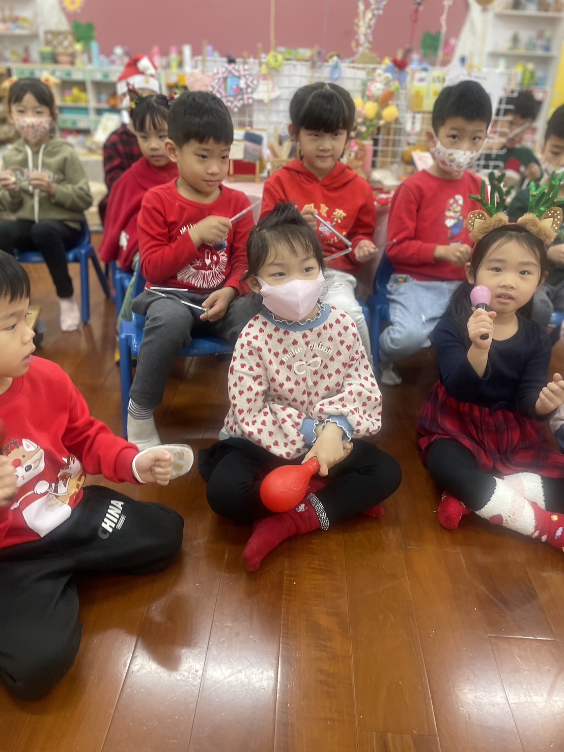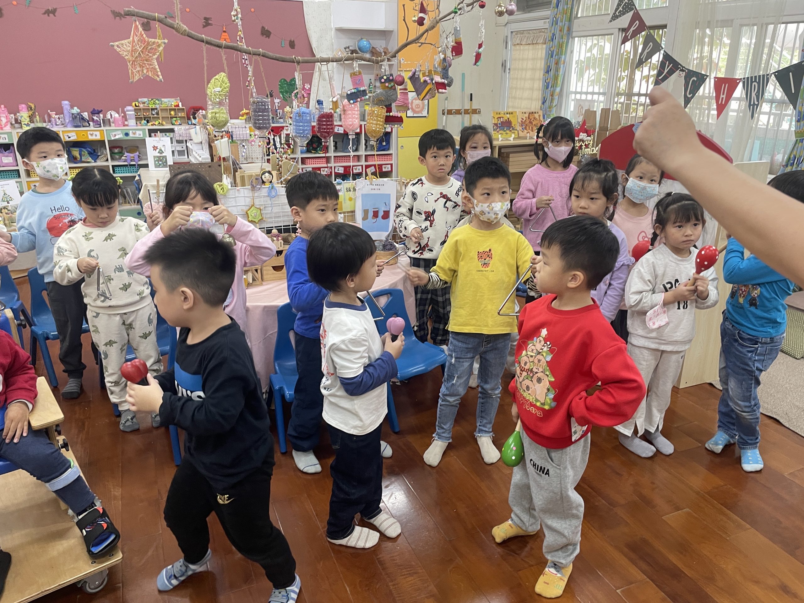 12/23 今天繼續練習兩首報佳音的歌曲~<聖誕老公公的鈴鐺不見了>和<粉紅色的聖誕節>,大班的三角鐵、鈴鼓與中班的沙鈴,邊唱邊跳邊打節奏,大家的專注力都進步囉!