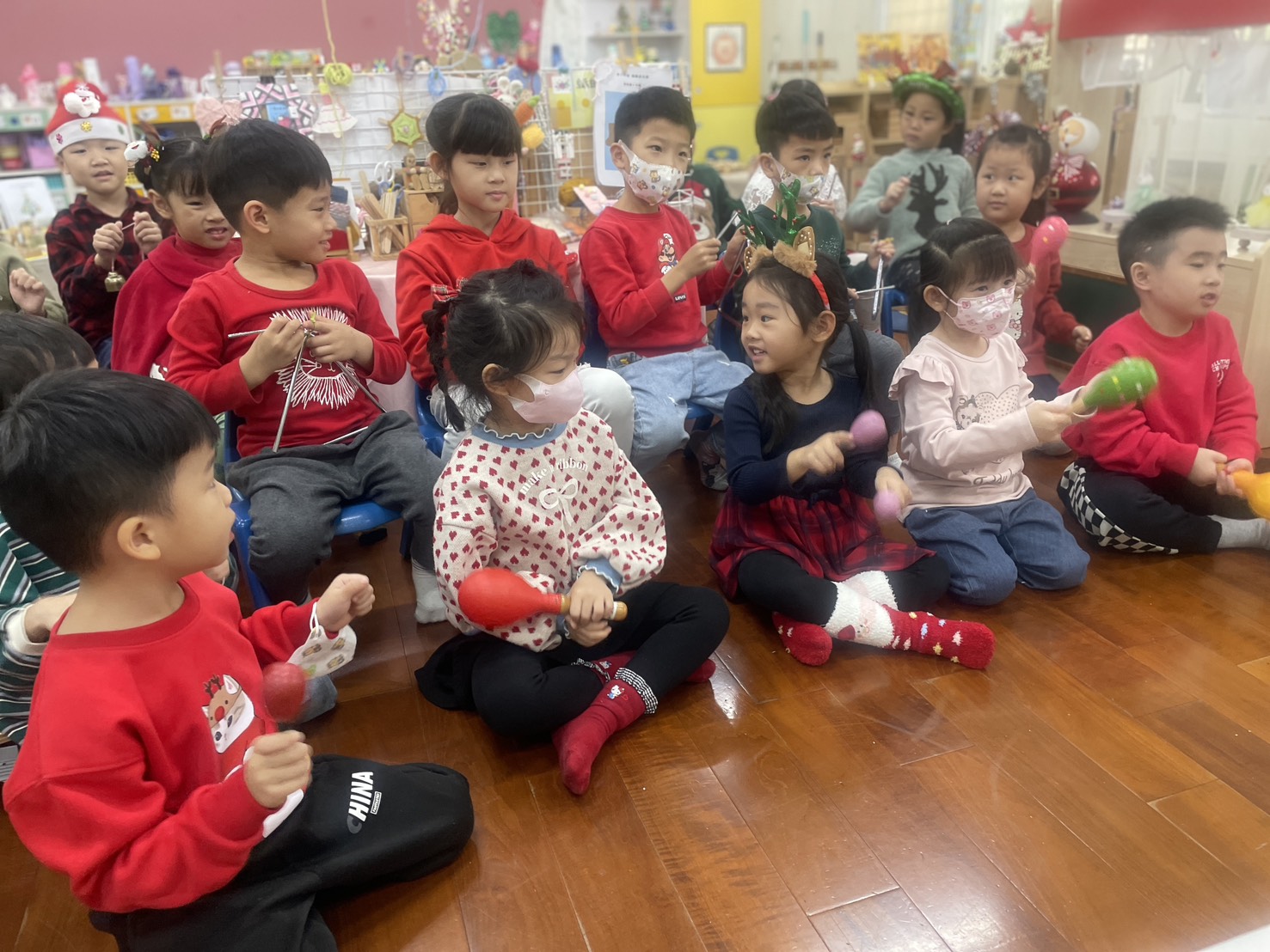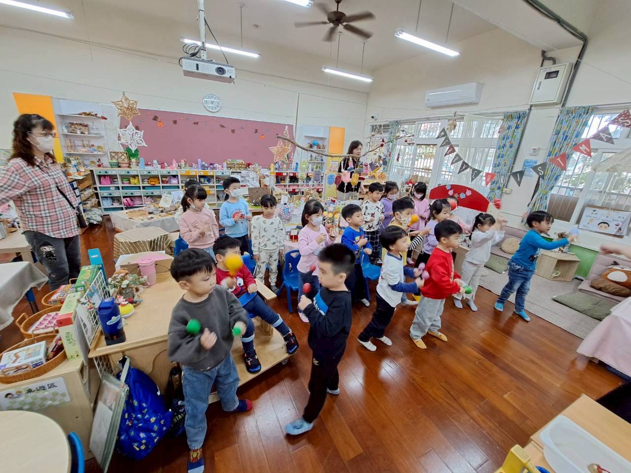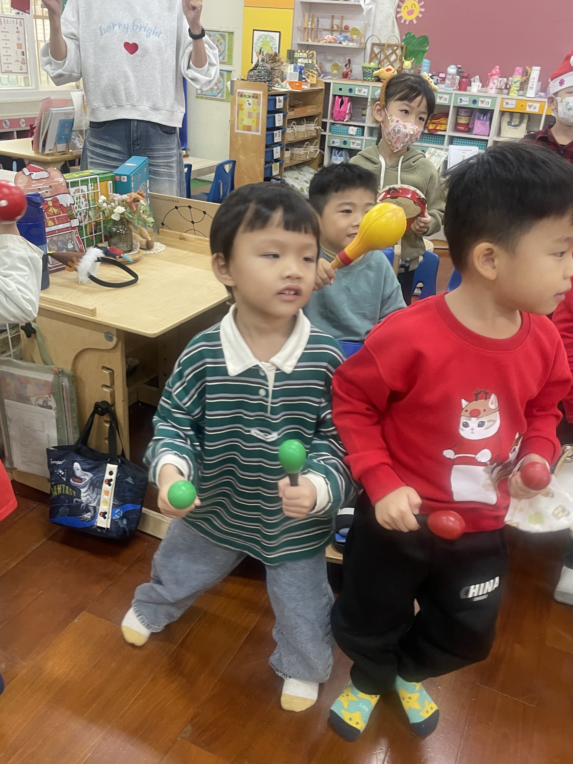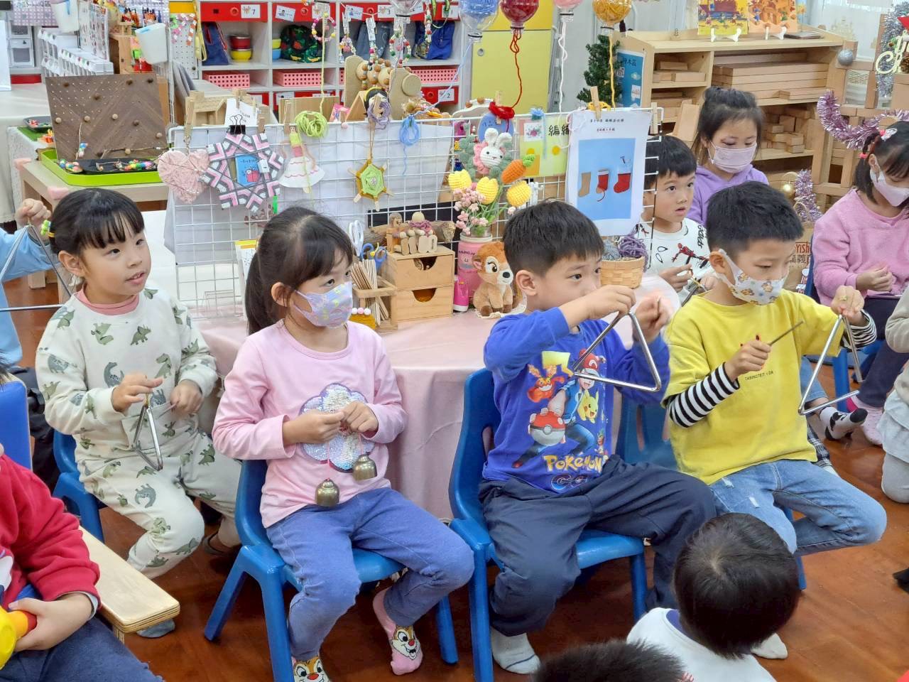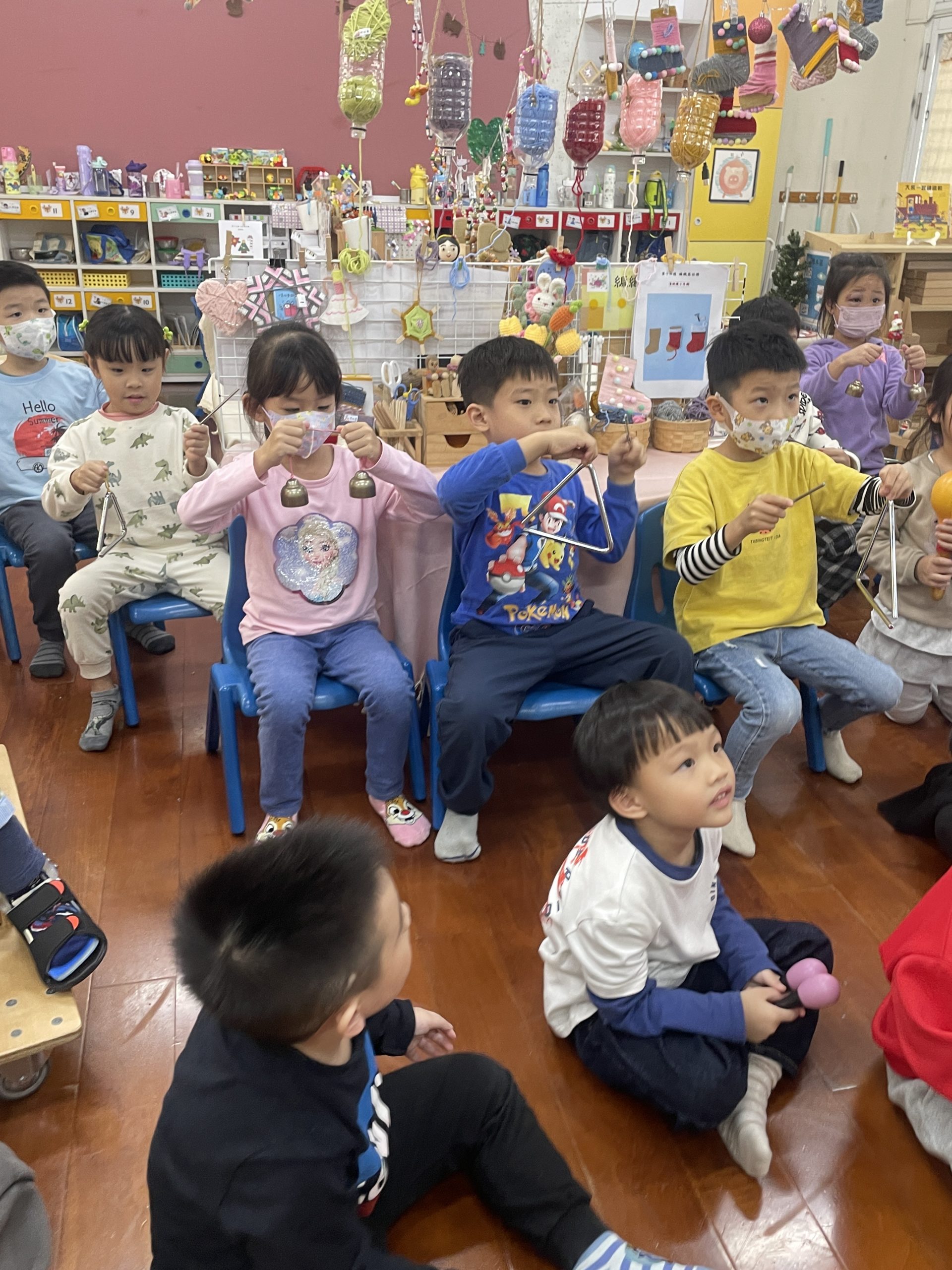12/23 今天繼續練習兩首報佳音的歌曲~<聖誕老公公的鈴鐺不見了>和<粉紅色的聖誕節>,大班的三角鐵、鈴鼓與中班的沙鈴,邊唱邊跳邊打節奏,大家的專注力都進步囉!