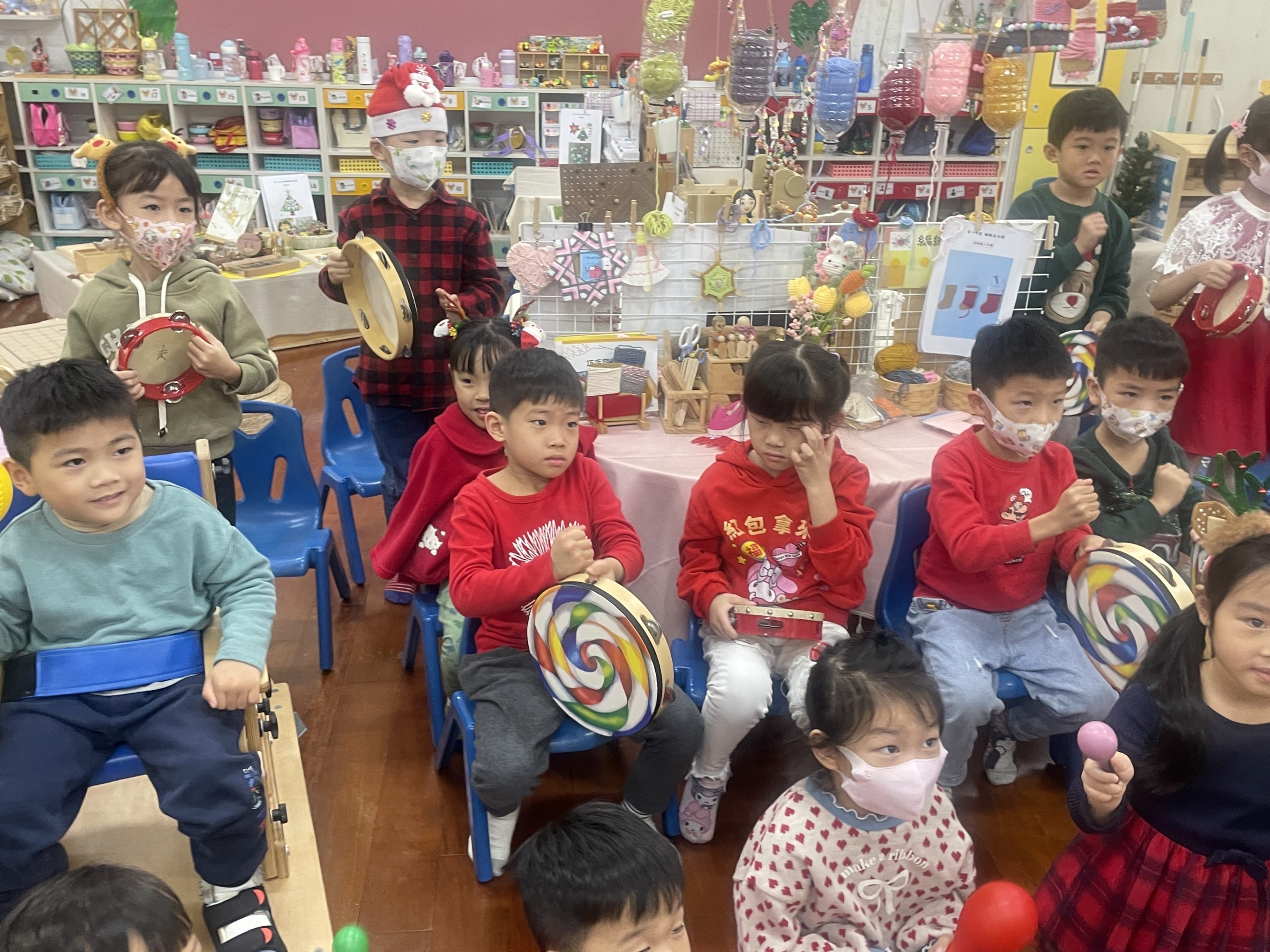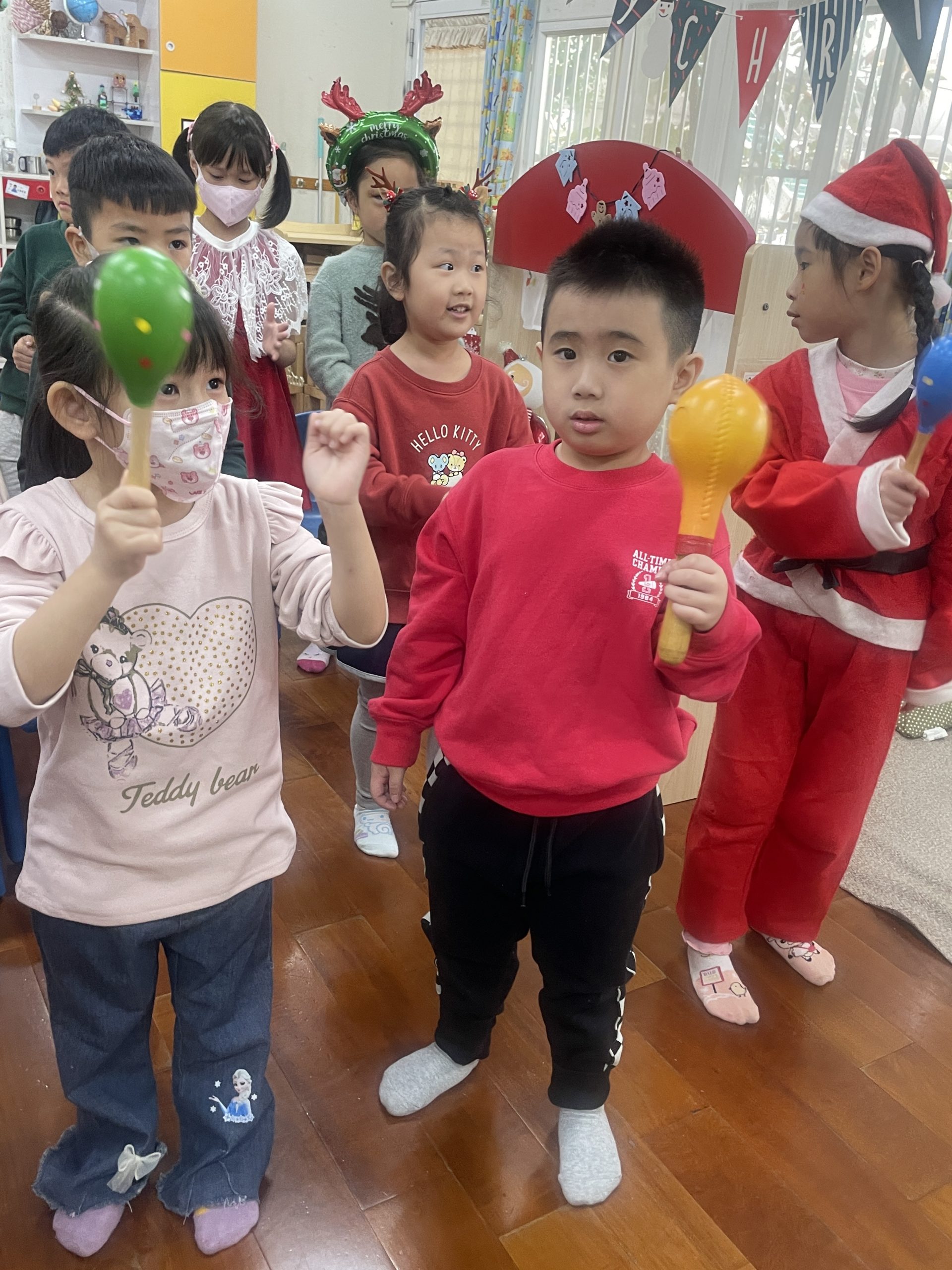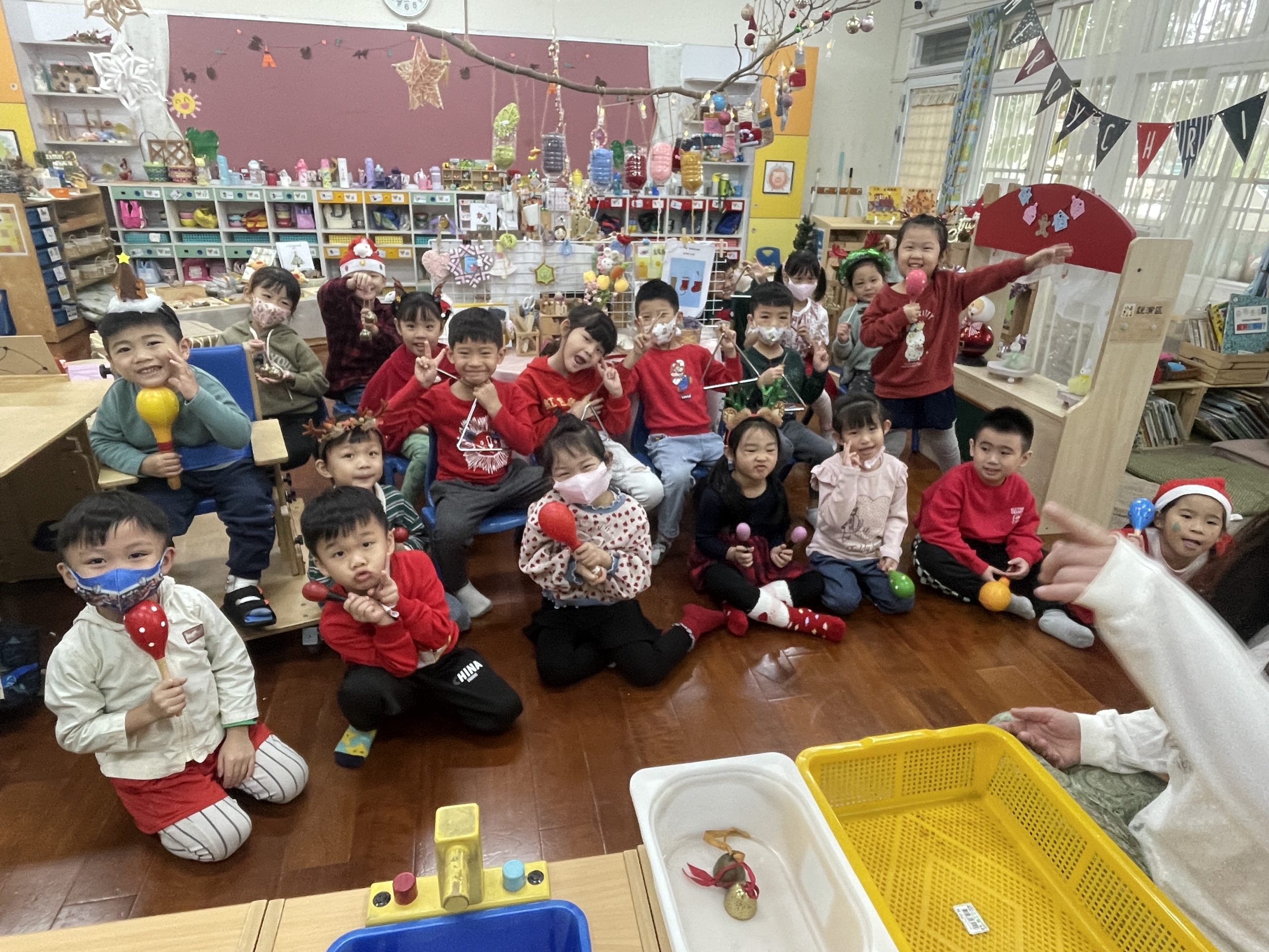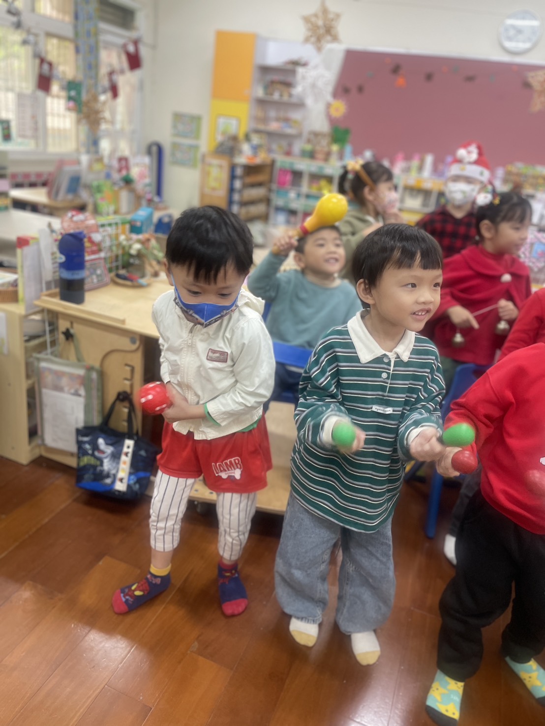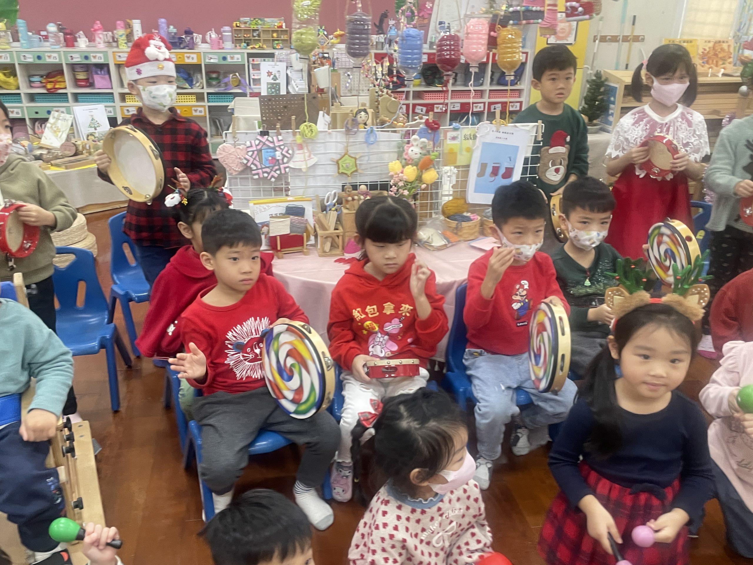 12/23 今天繼續練習兩首報佳音的歌曲~<聖誕老公公的鈴鐺不見了>和<粉紅色的聖誕節>,大班的三角鐵、鈴鼓與中班的沙鈴,邊唱邊跳邊打節奏,大家的專注力都進步囉!