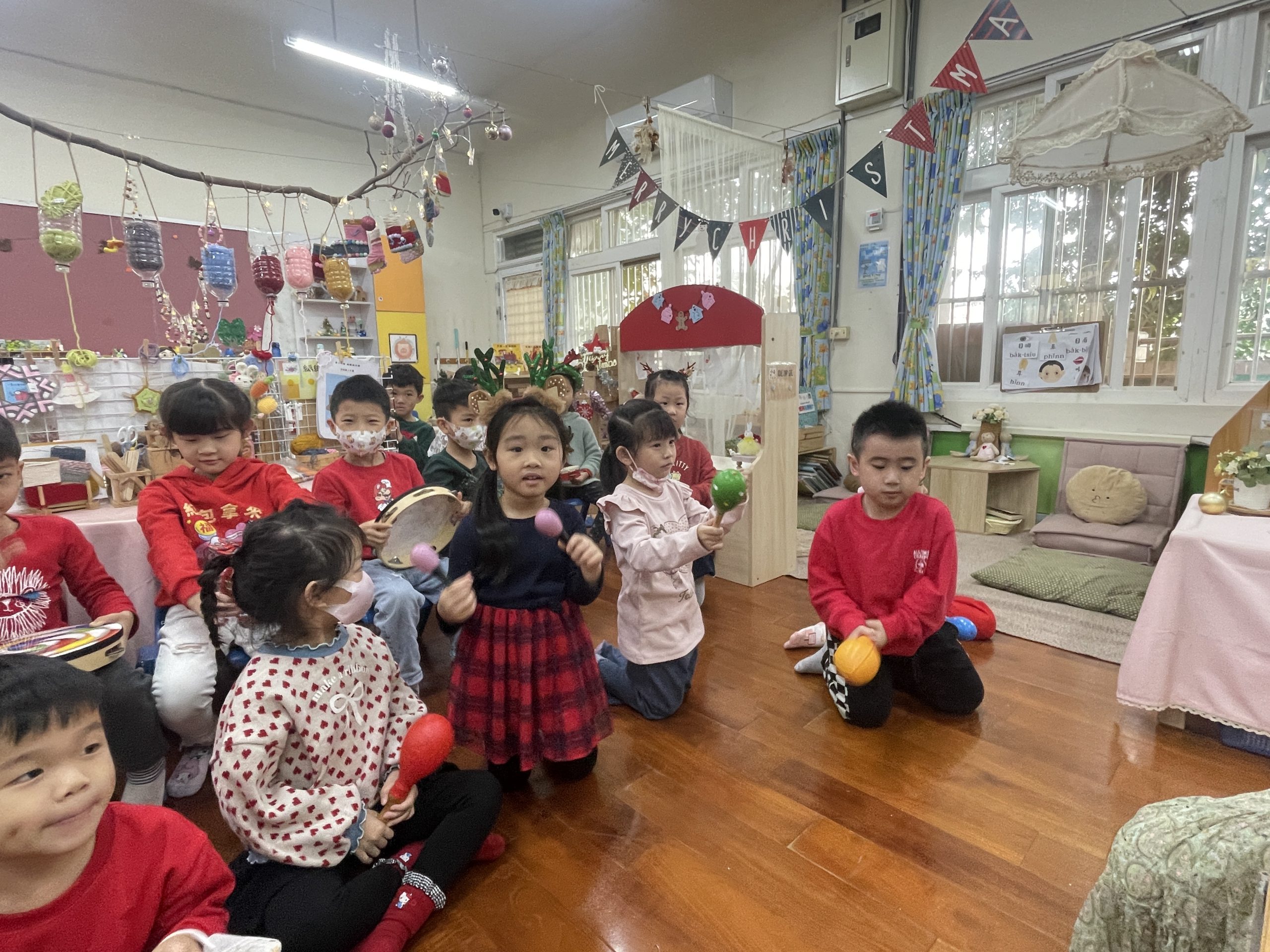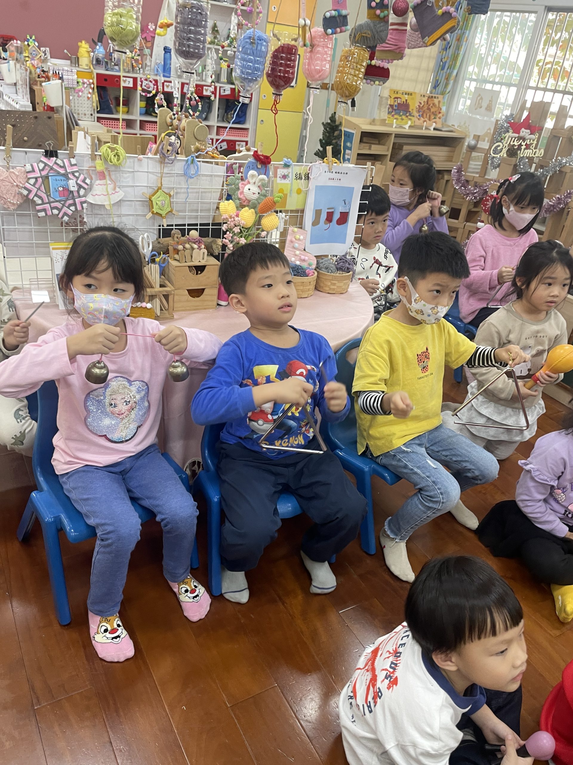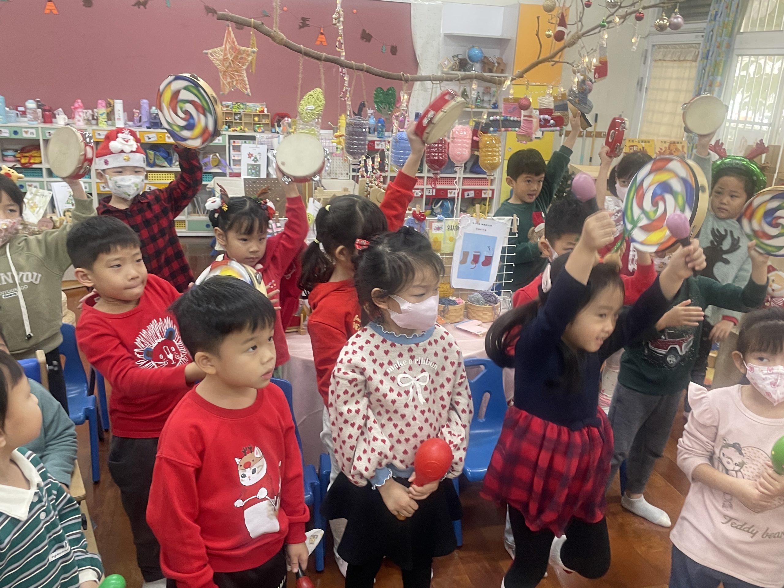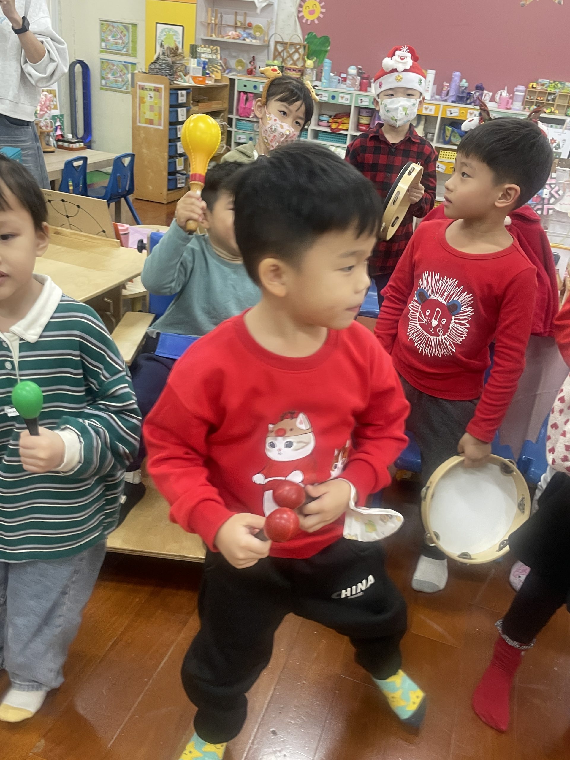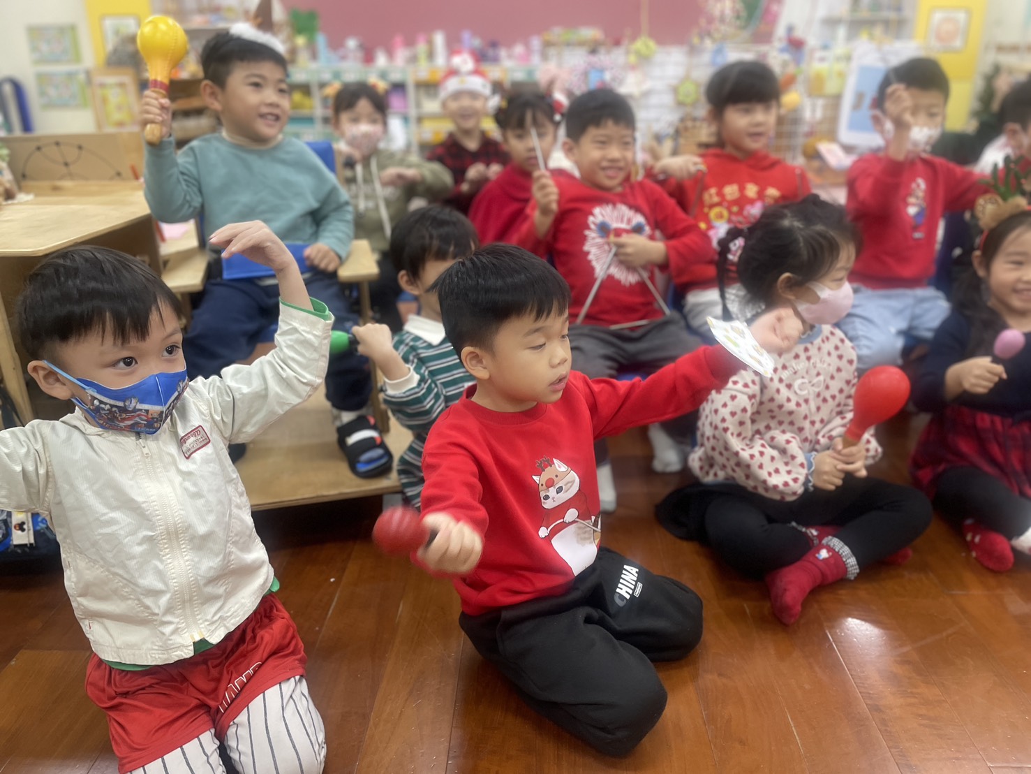12/23 今天繼續練習兩首報佳音的歌曲~<聖誕老公公的鈴鐺不見了>和<粉紅色的聖誕節>,大班的三角鐵、鈴鼓與中班的沙鈴,邊唱邊跳邊打節奏,大家的專注力都進步囉!