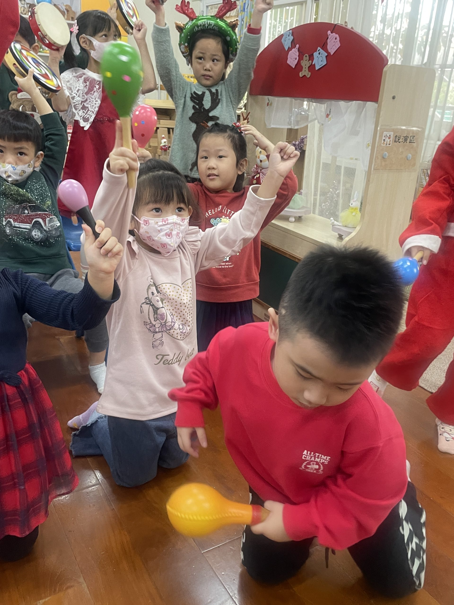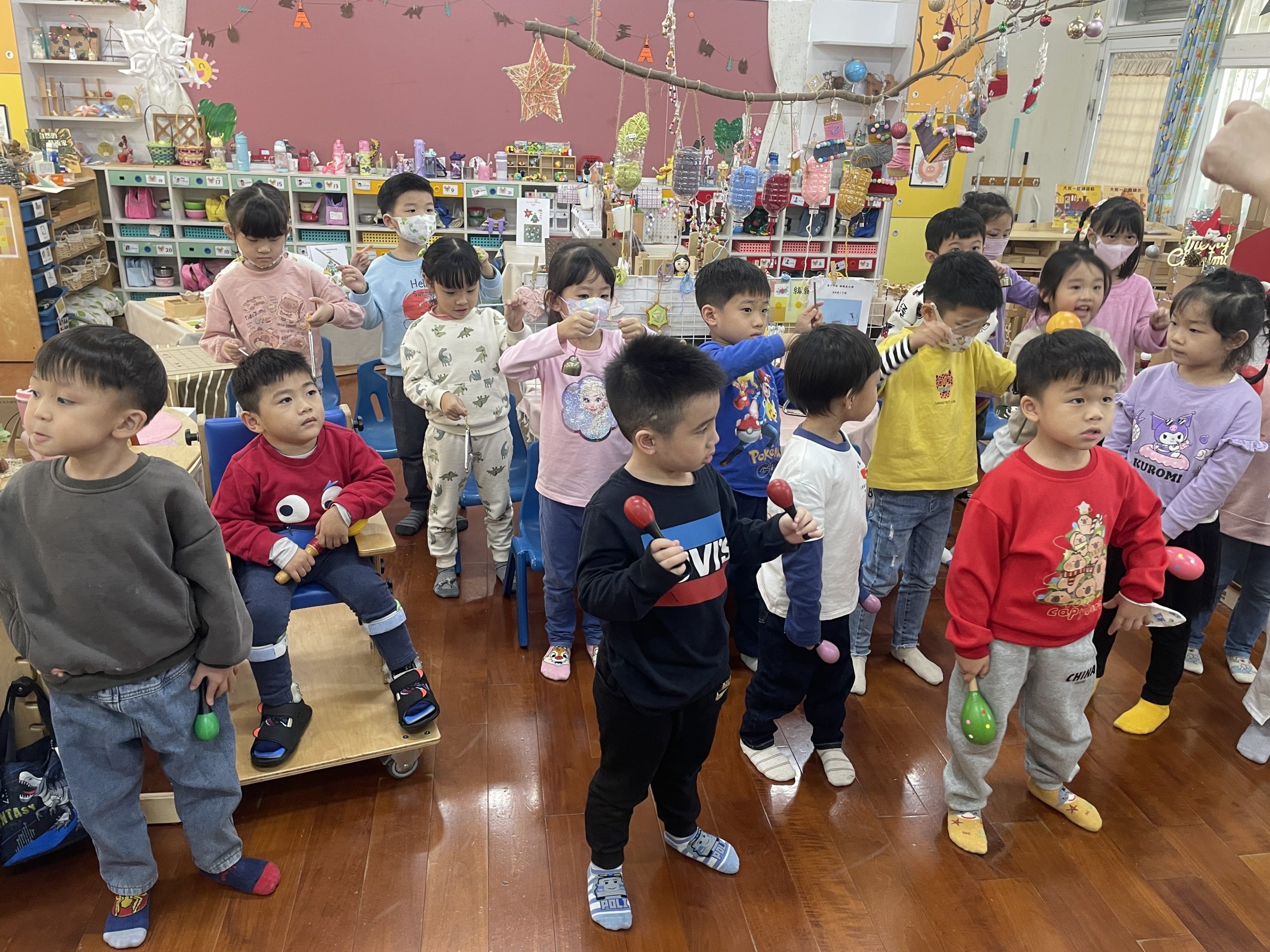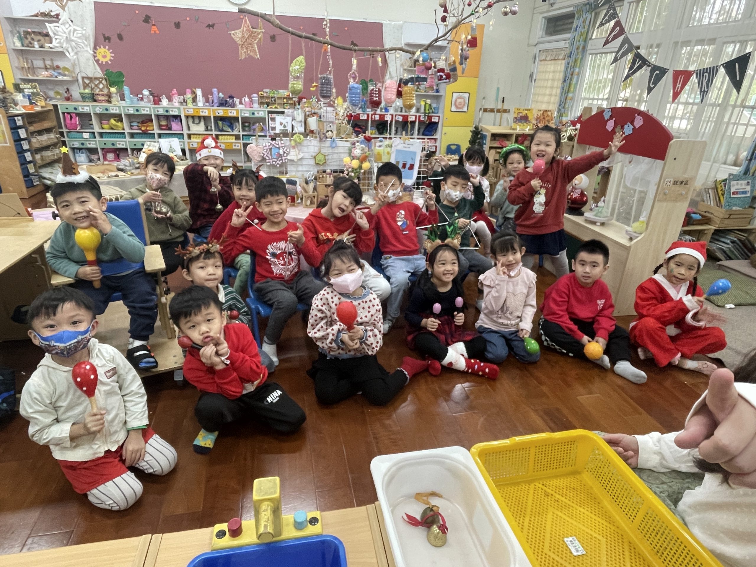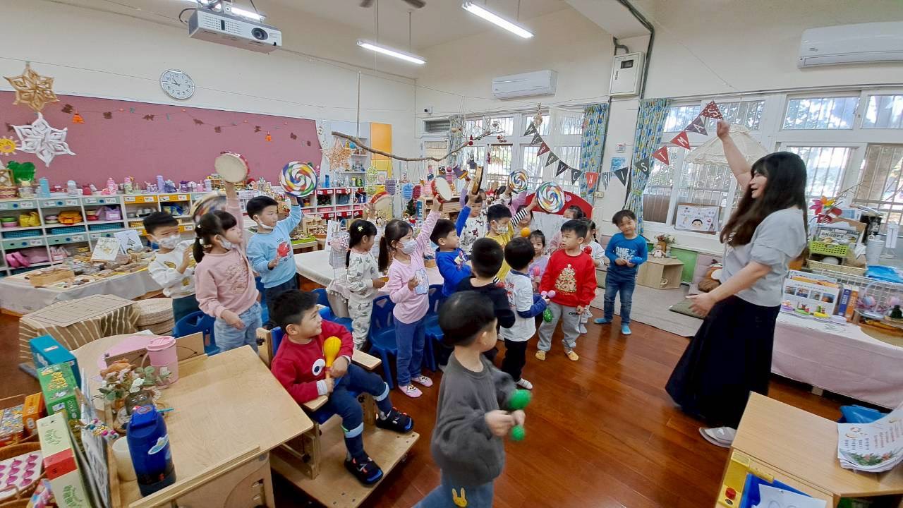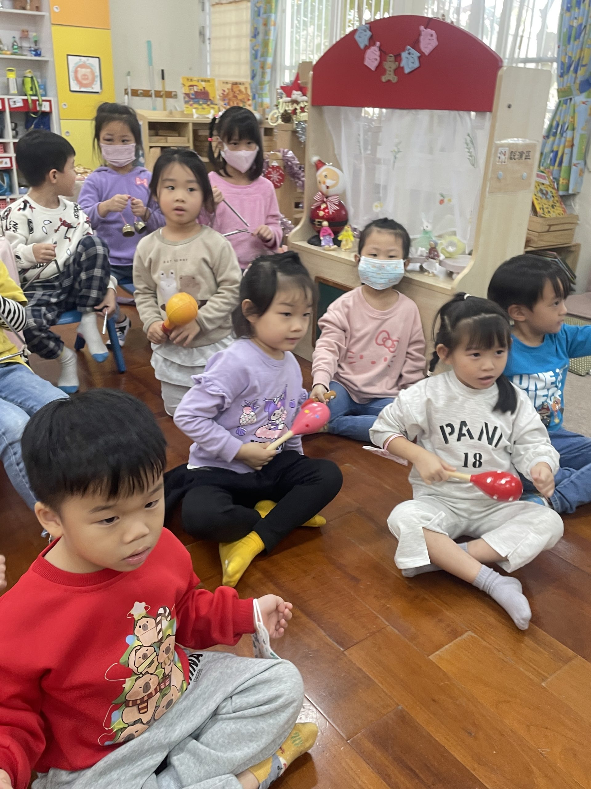 12/23 今天繼續練習兩首報佳音的歌曲~<聖誕老公公的鈴鐺不見了>和<粉紅色的聖誕節>,大班的三角鐵、鈴鼓與中班的沙鈴,邊唱邊跳邊打節奏,大家的專注力都進步囉!
