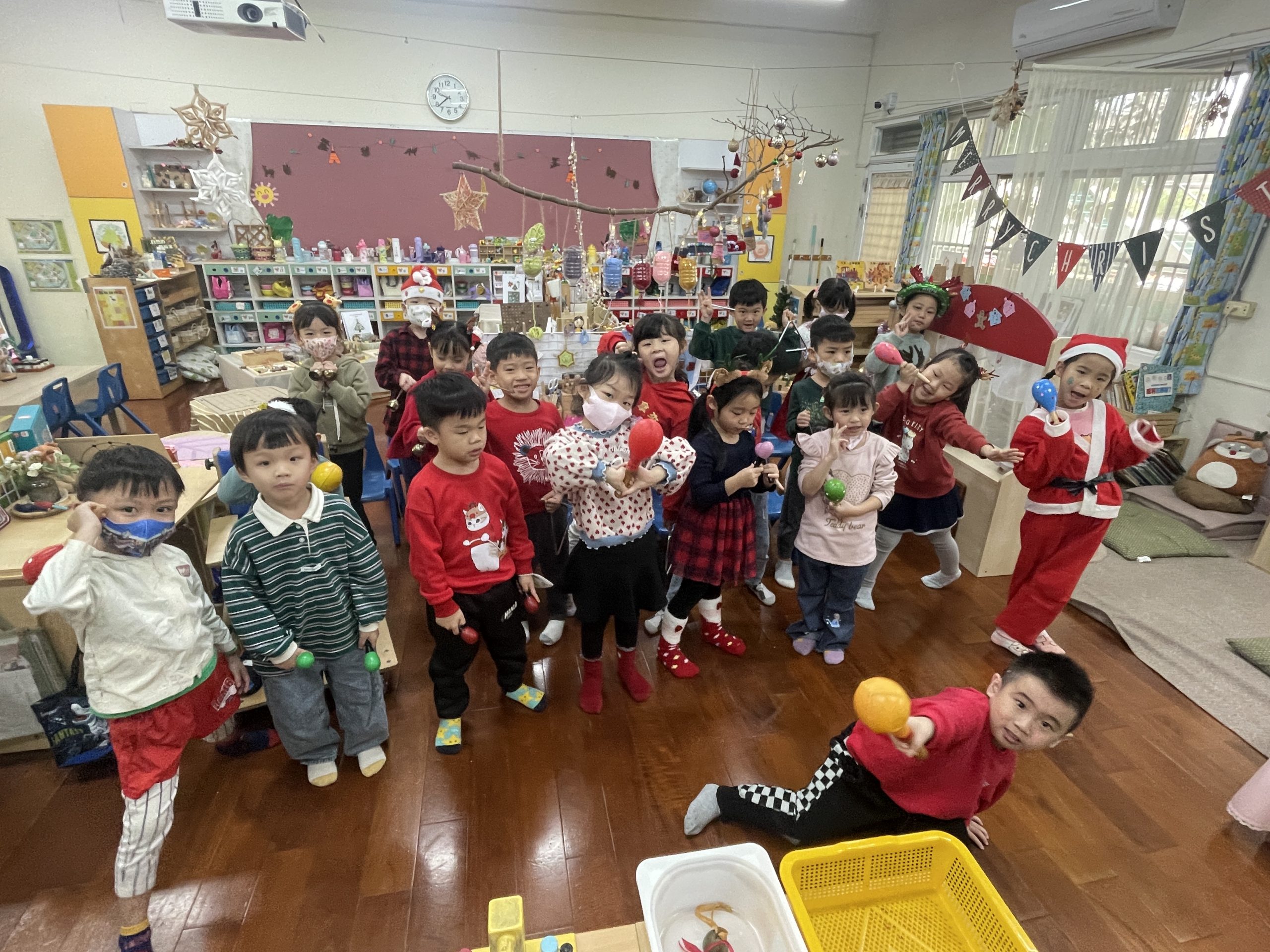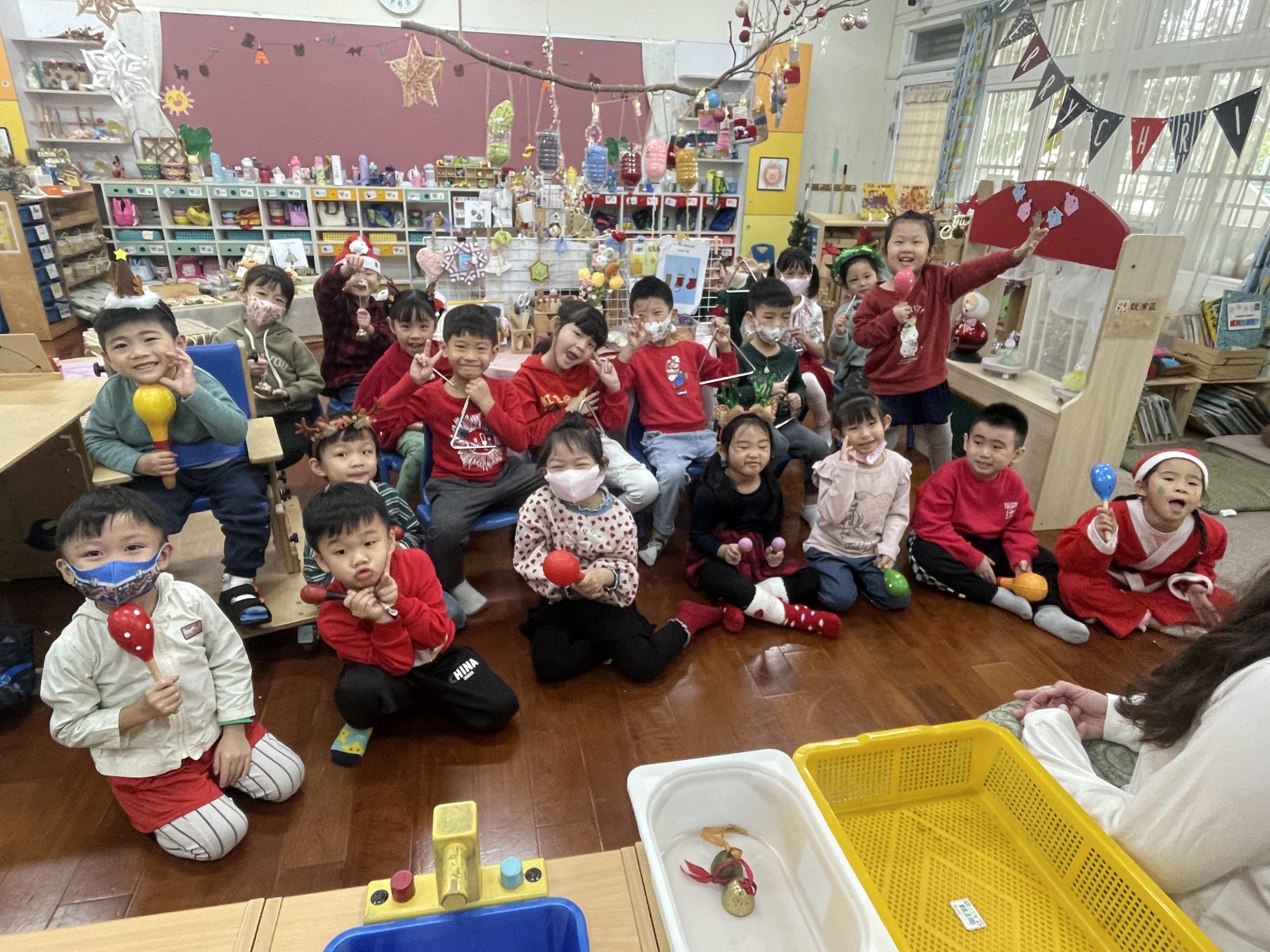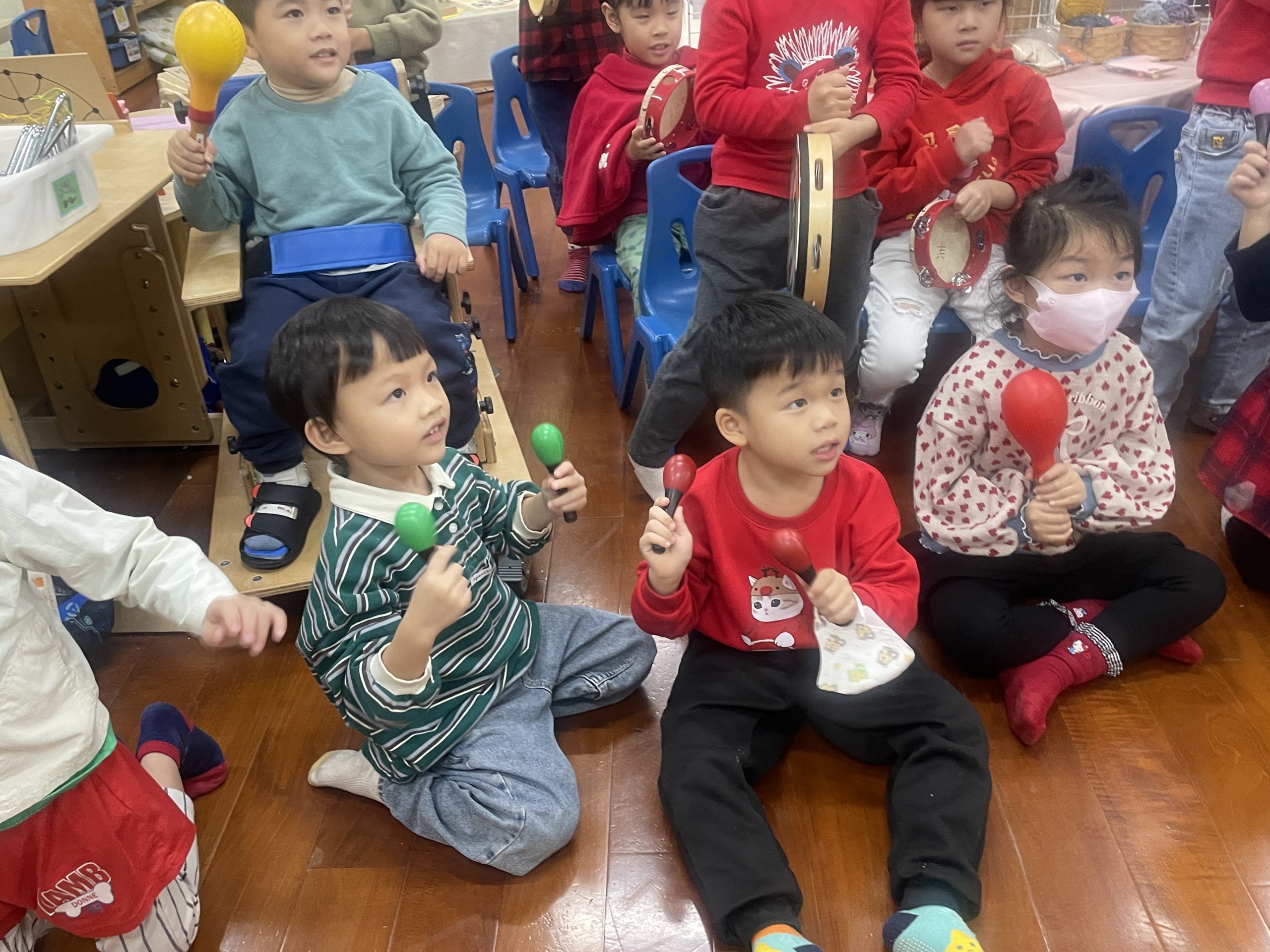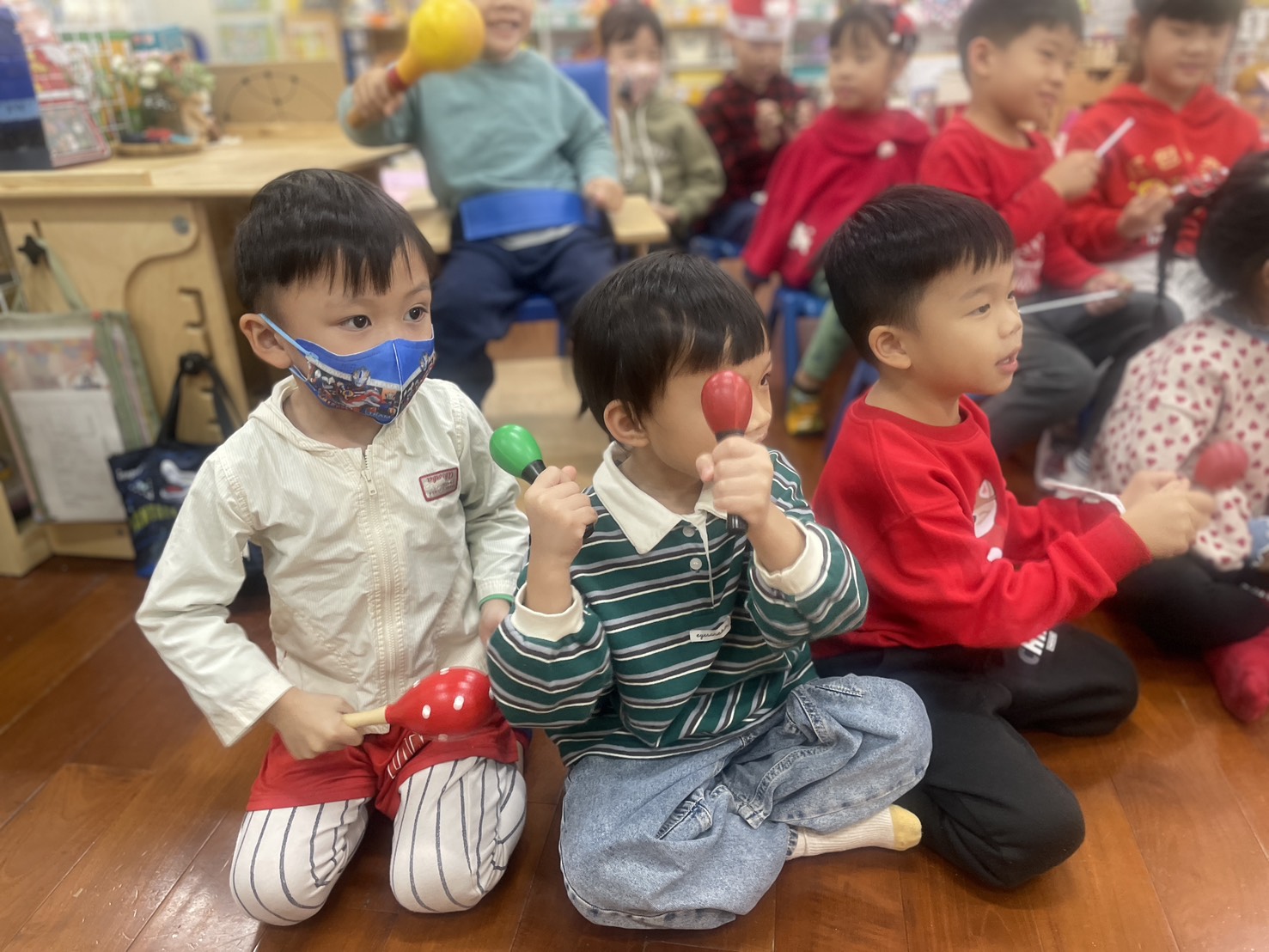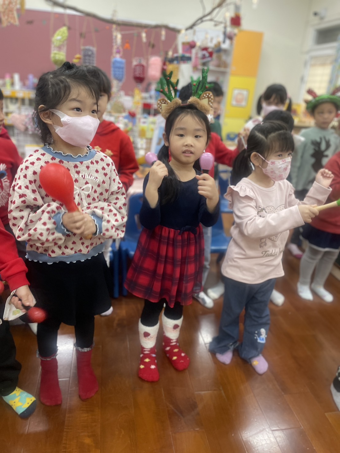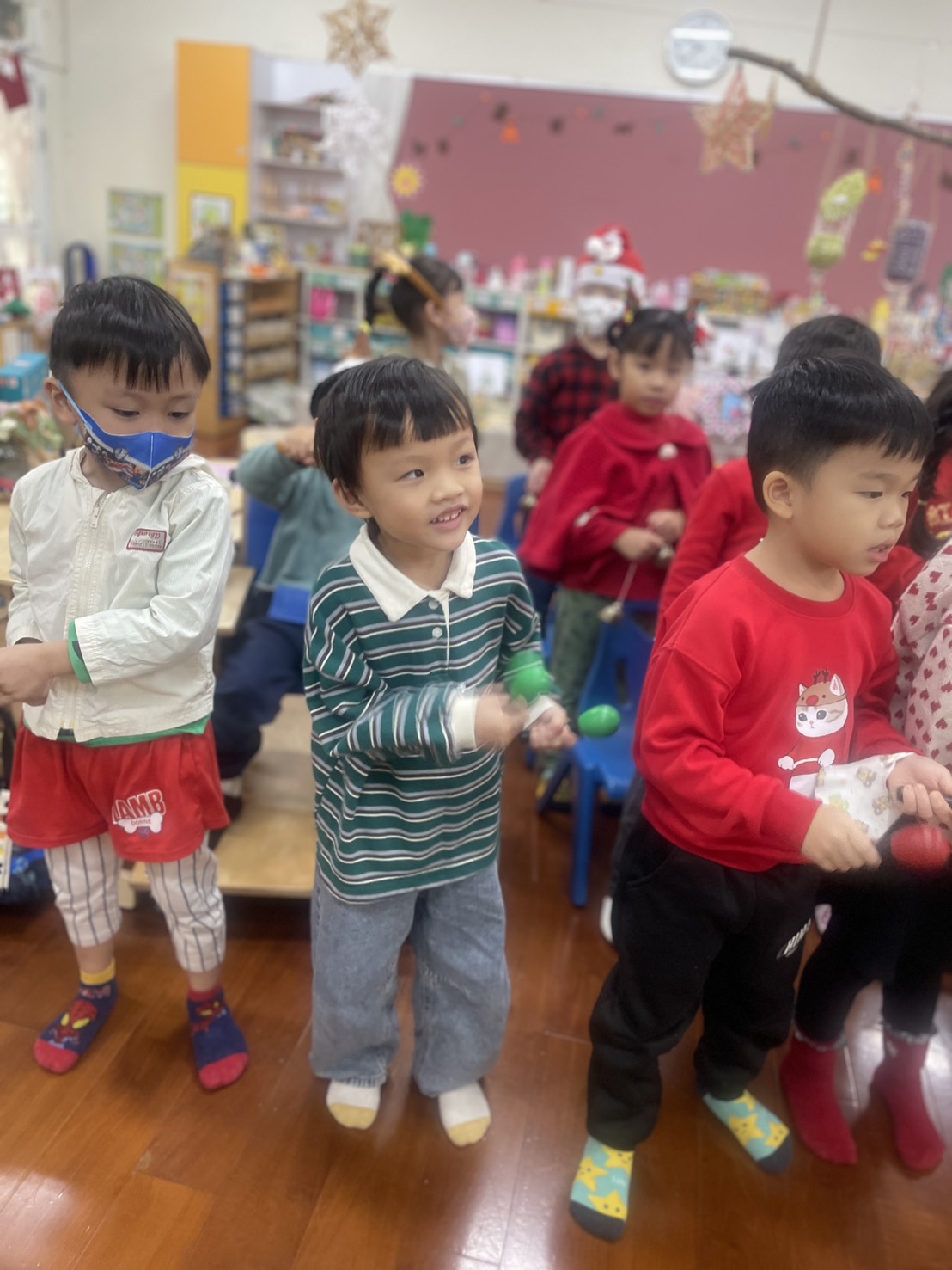 12/23 今天繼續練習兩首報佳音的歌曲~<聖誕老公公的鈴鐺不見了>和<粉紅色的聖誕節>,大班的三角鐵、鈴鼓與中班的沙鈴,邊唱邊跳邊打節奏,大家的專注力都進步囉!