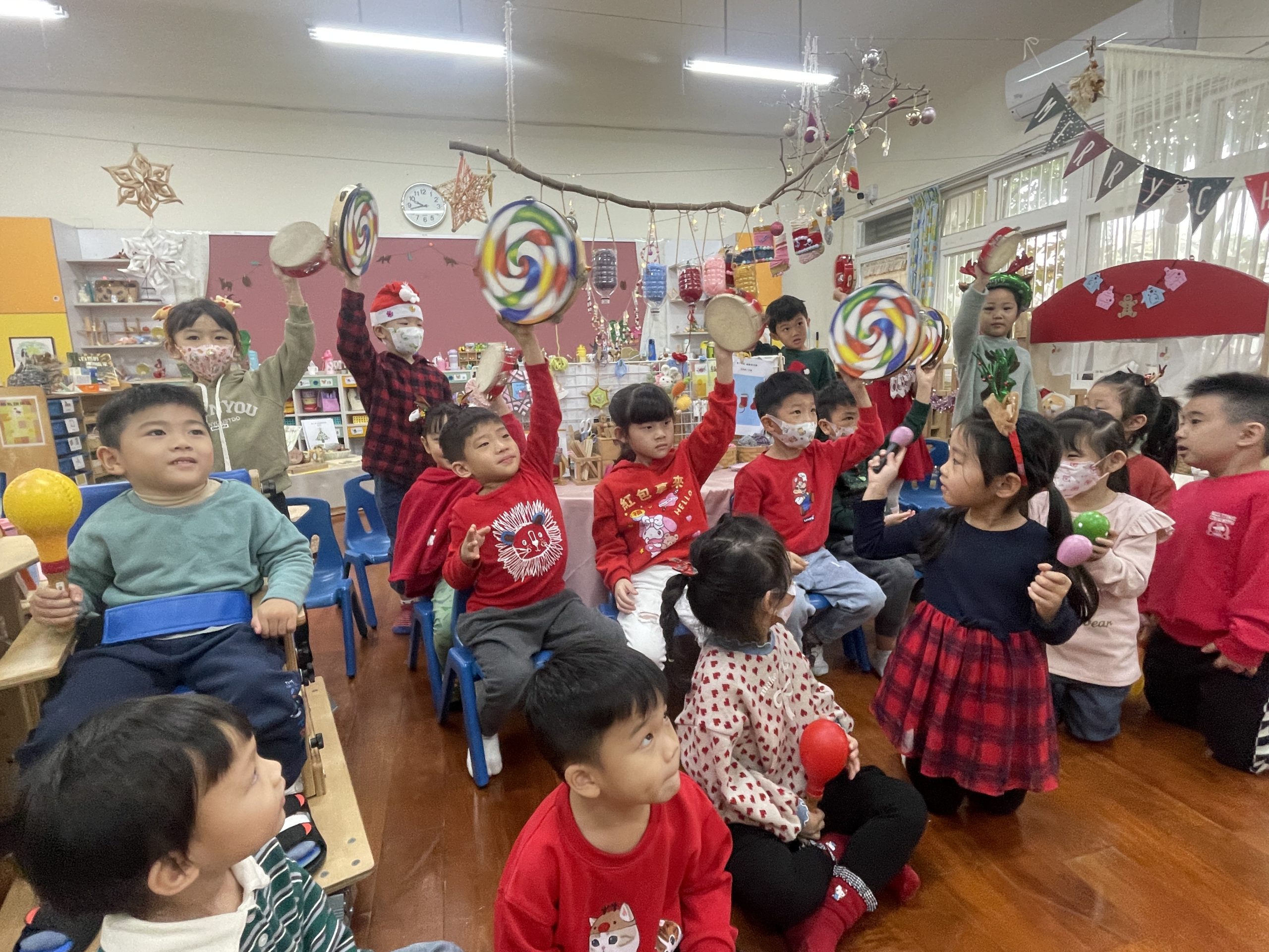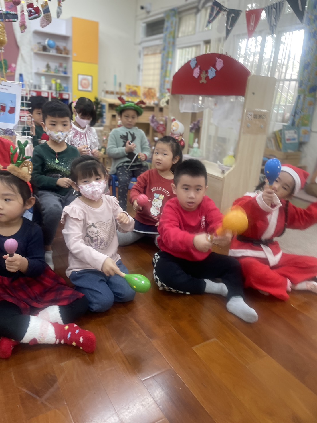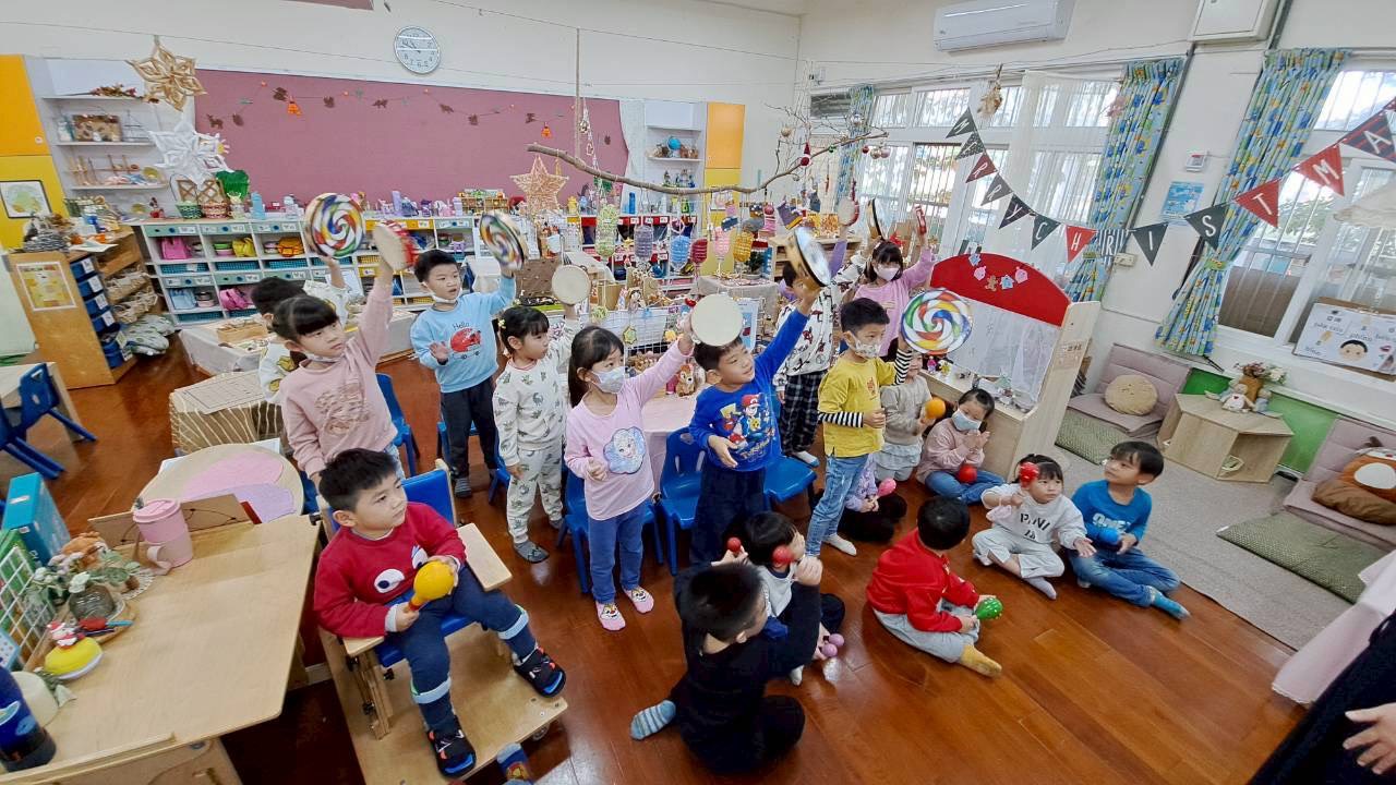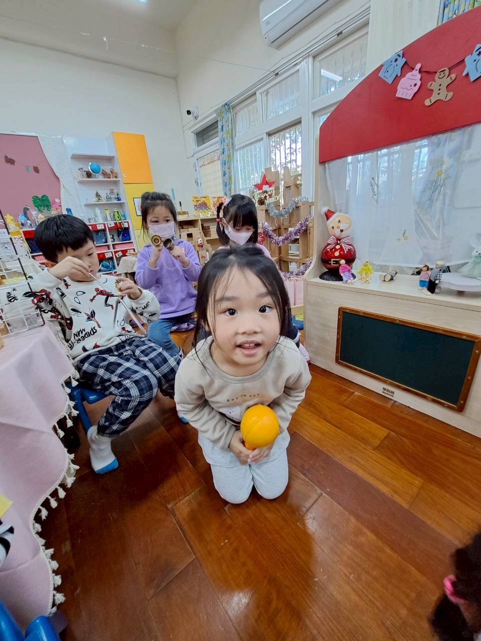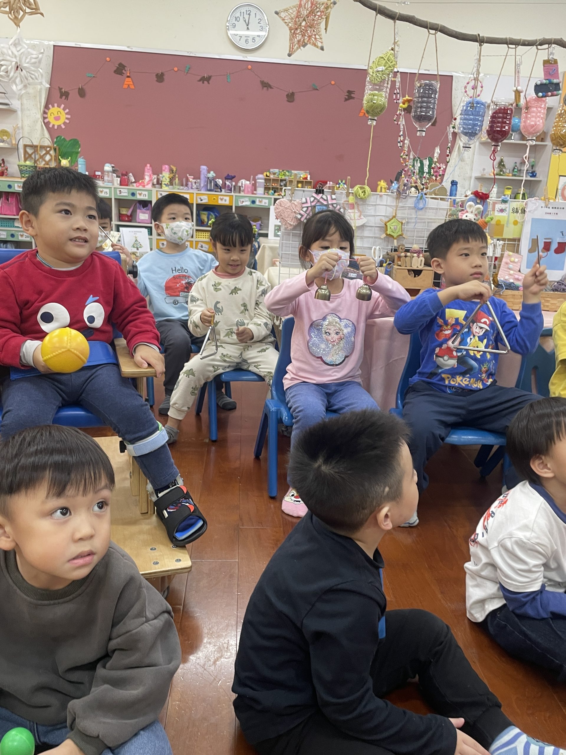 12/23 今天繼續練習兩首報佳音的歌曲~<聖誕老公公的鈴鐺不見了>和<粉紅色的聖誕節>,大班的三角鐵、鈴鼓與中班的沙鈴,邊唱邊跳邊打節奏,大家的專注力都進步囉!