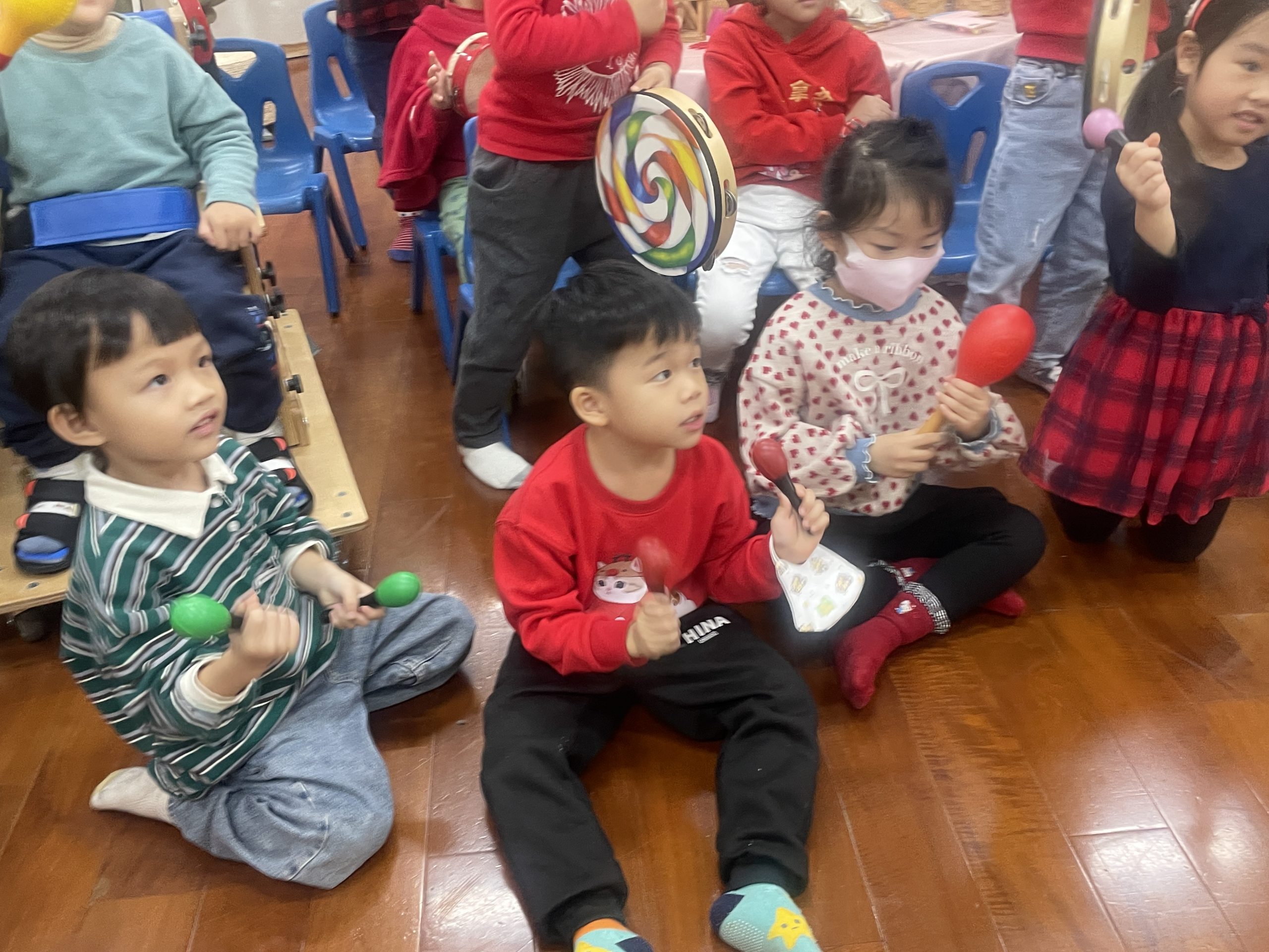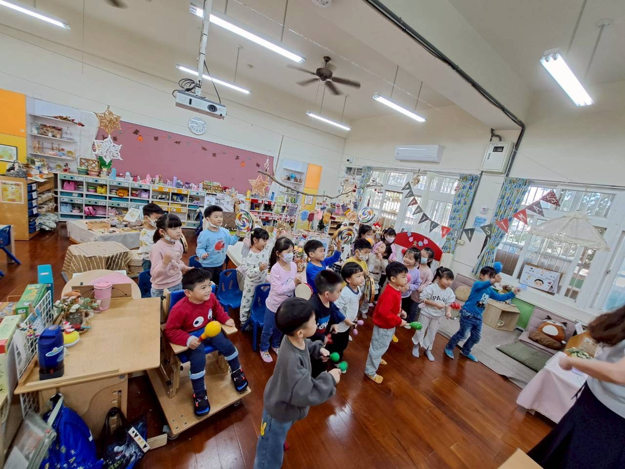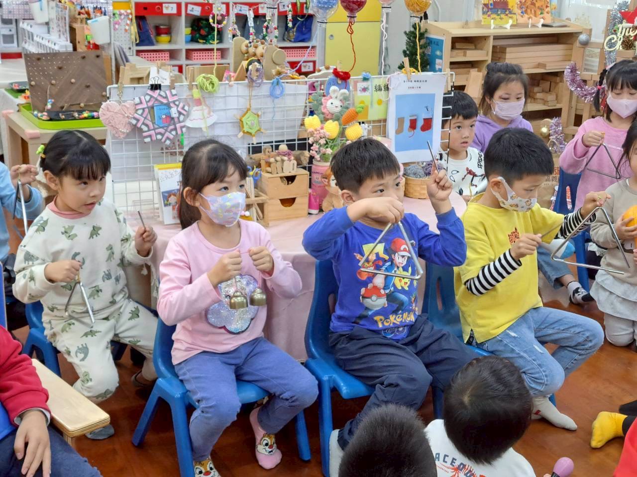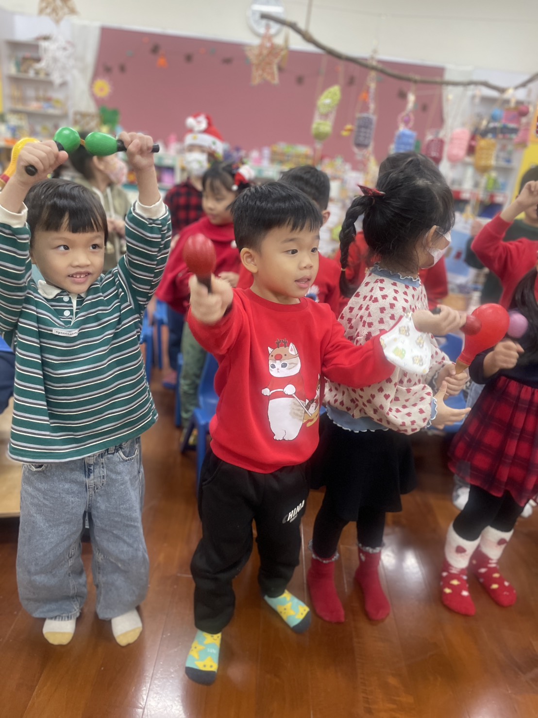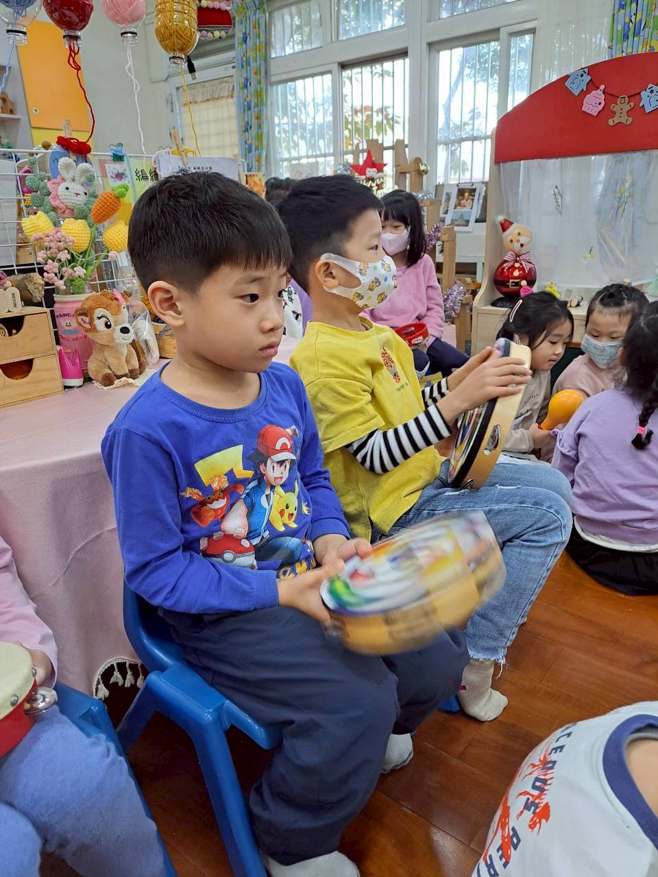 12/23 今天繼續練習兩首報佳音的歌曲~<聖誕老公公的鈴鐺不見了>和<粉紅色的聖誕節>,大班的三角鐵、鈴鼓與中班的沙鈴,邊唱邊跳邊打節奏,大家的專注力都進步囉!