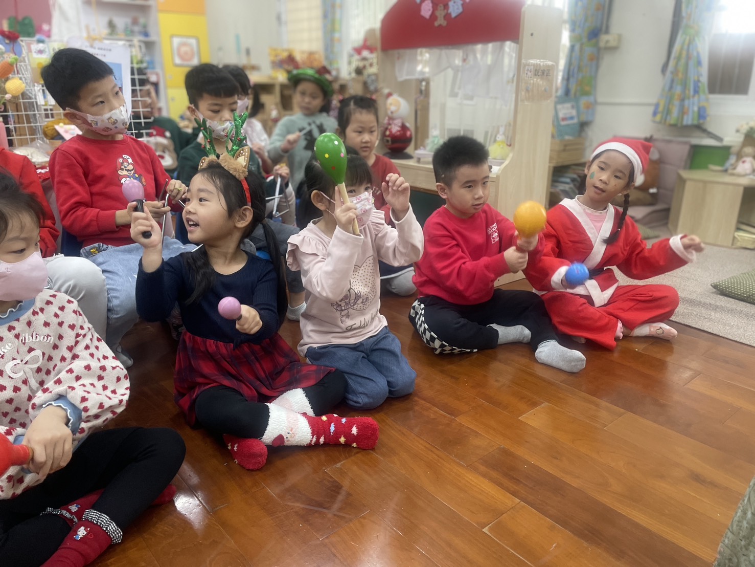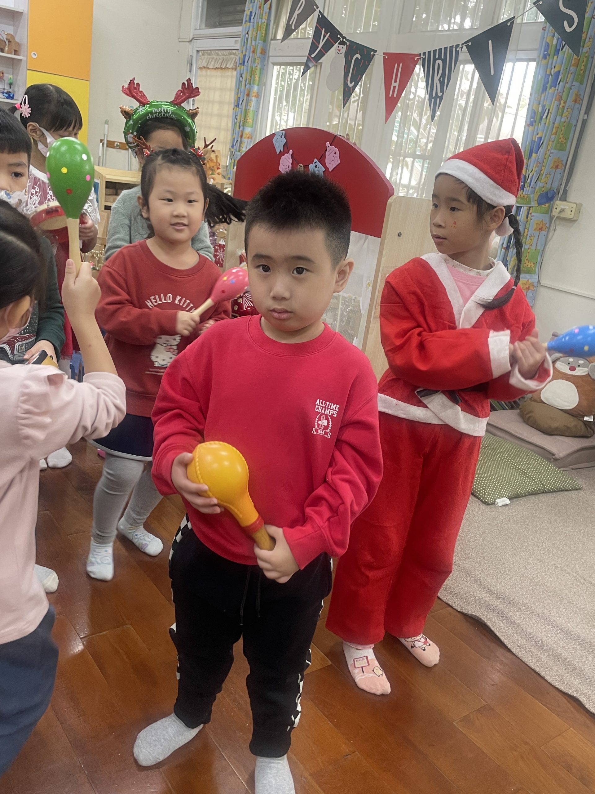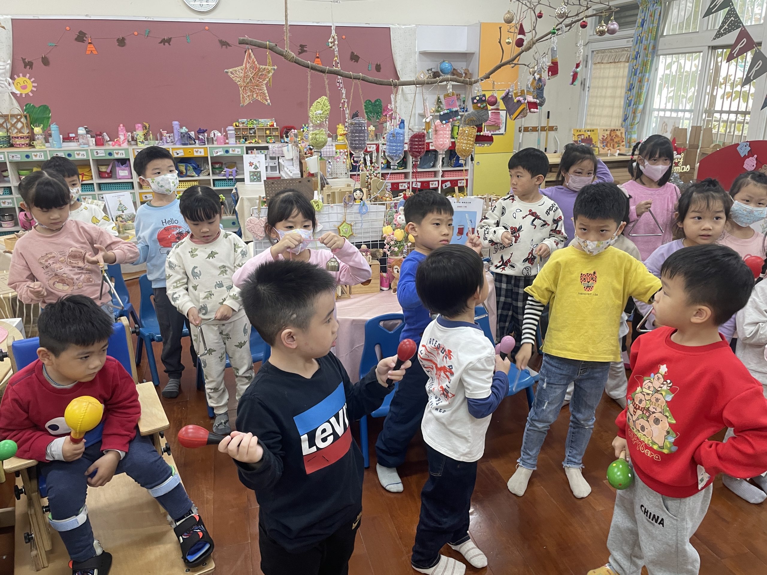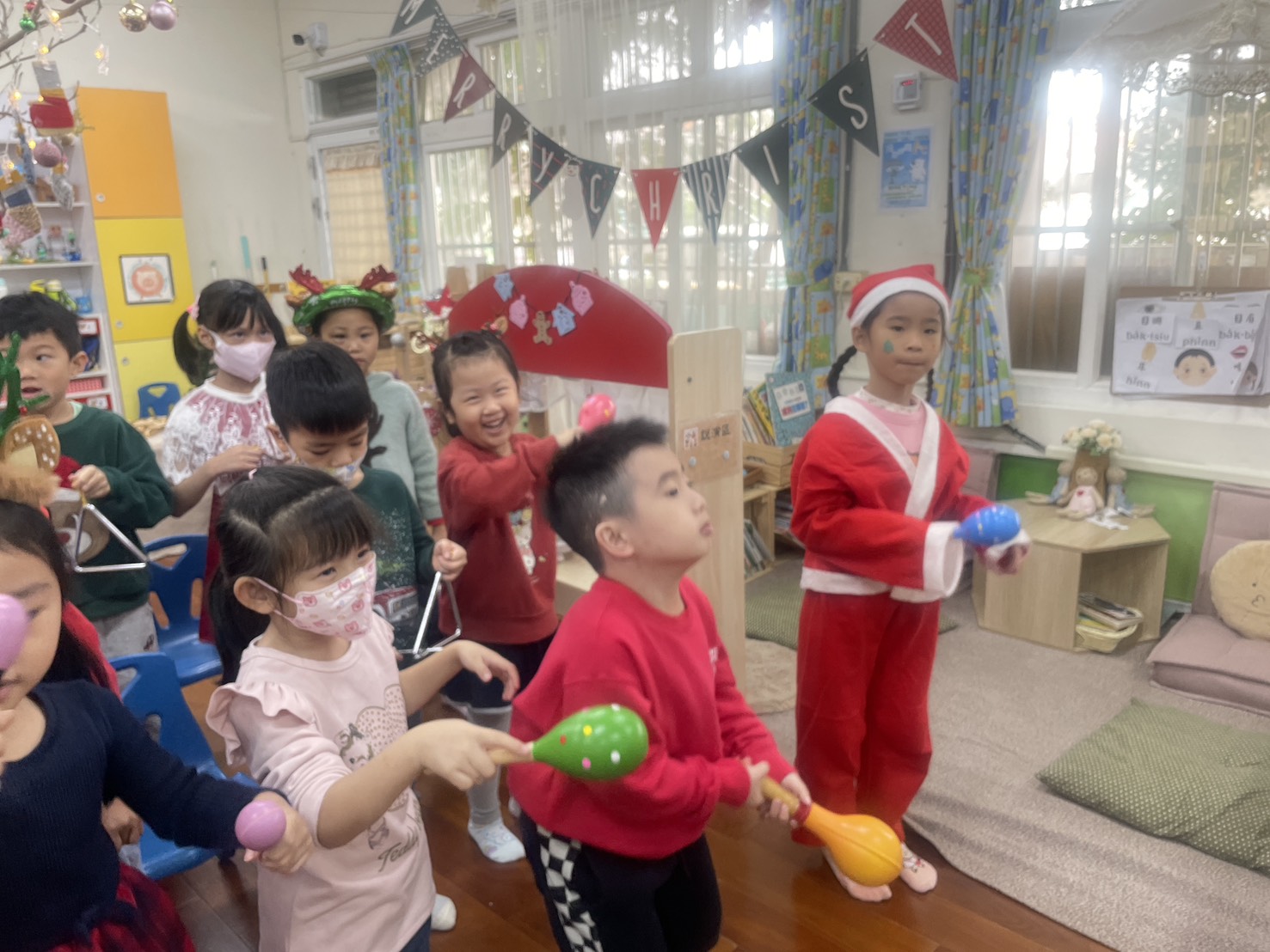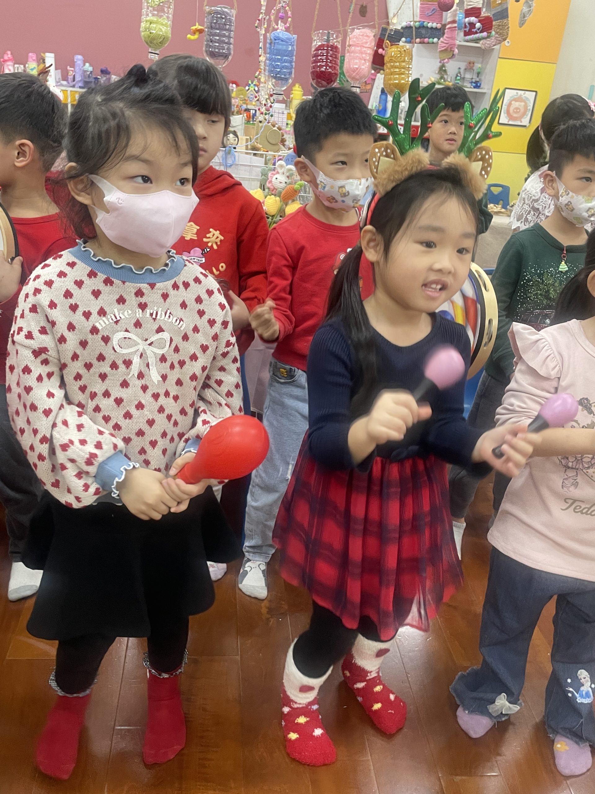 12/23 今天繼續練習兩首報佳音的歌曲~<聖誕老公公的鈴鐺不見了>和<粉紅色的聖誕節>,大班的三角鐵、鈴鼓與中班的沙鈴,邊唱邊跳邊打節奏,大家的專注力都進步囉!