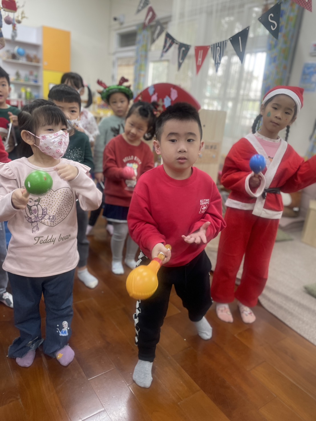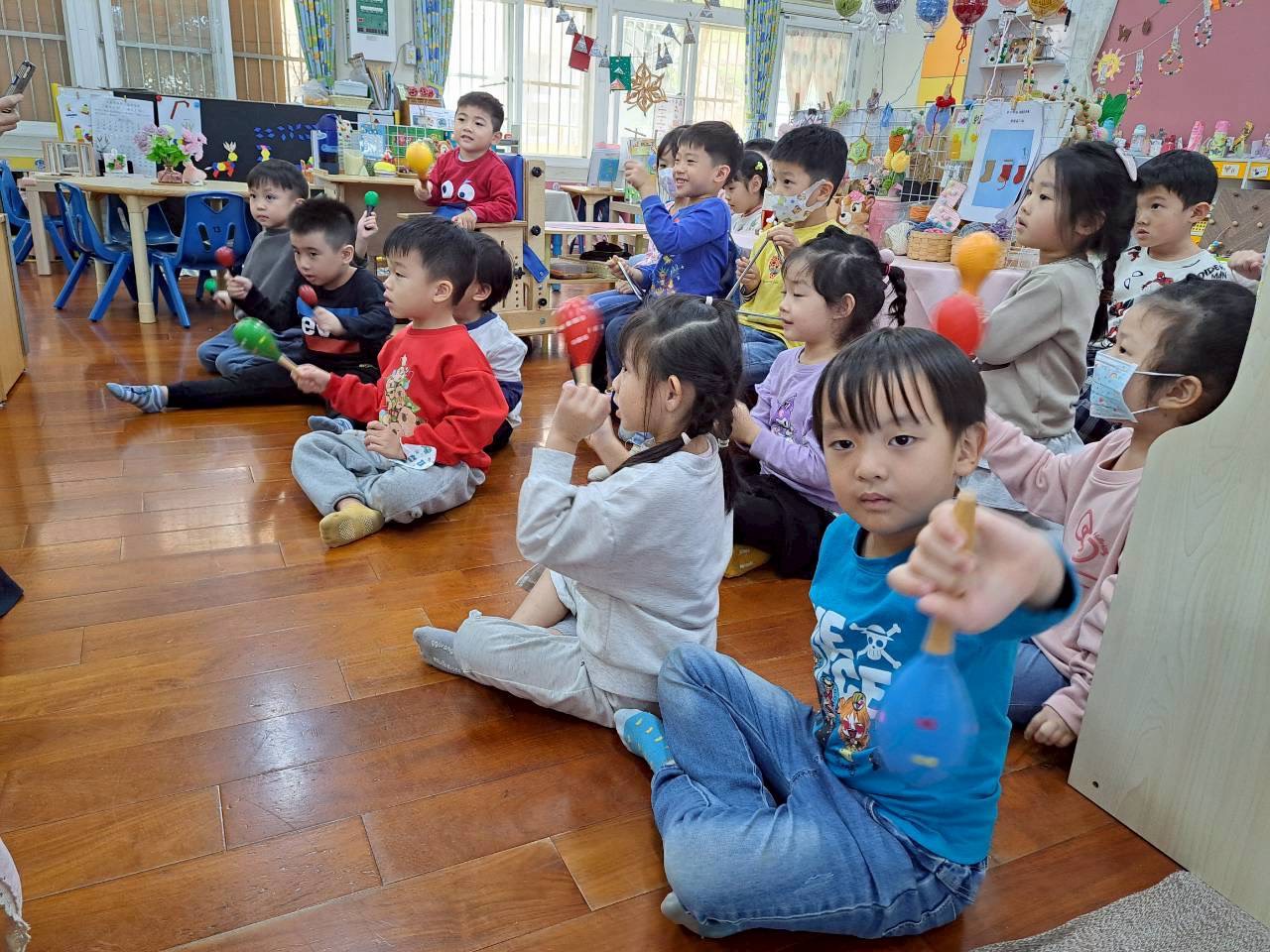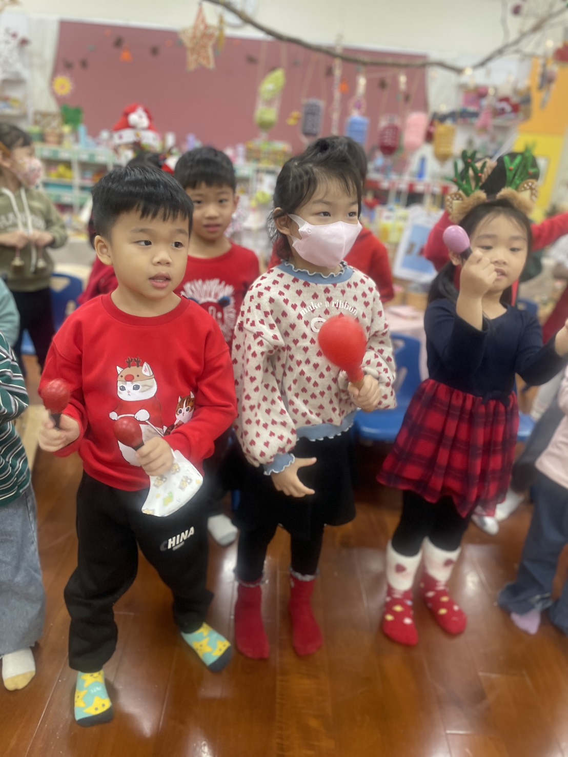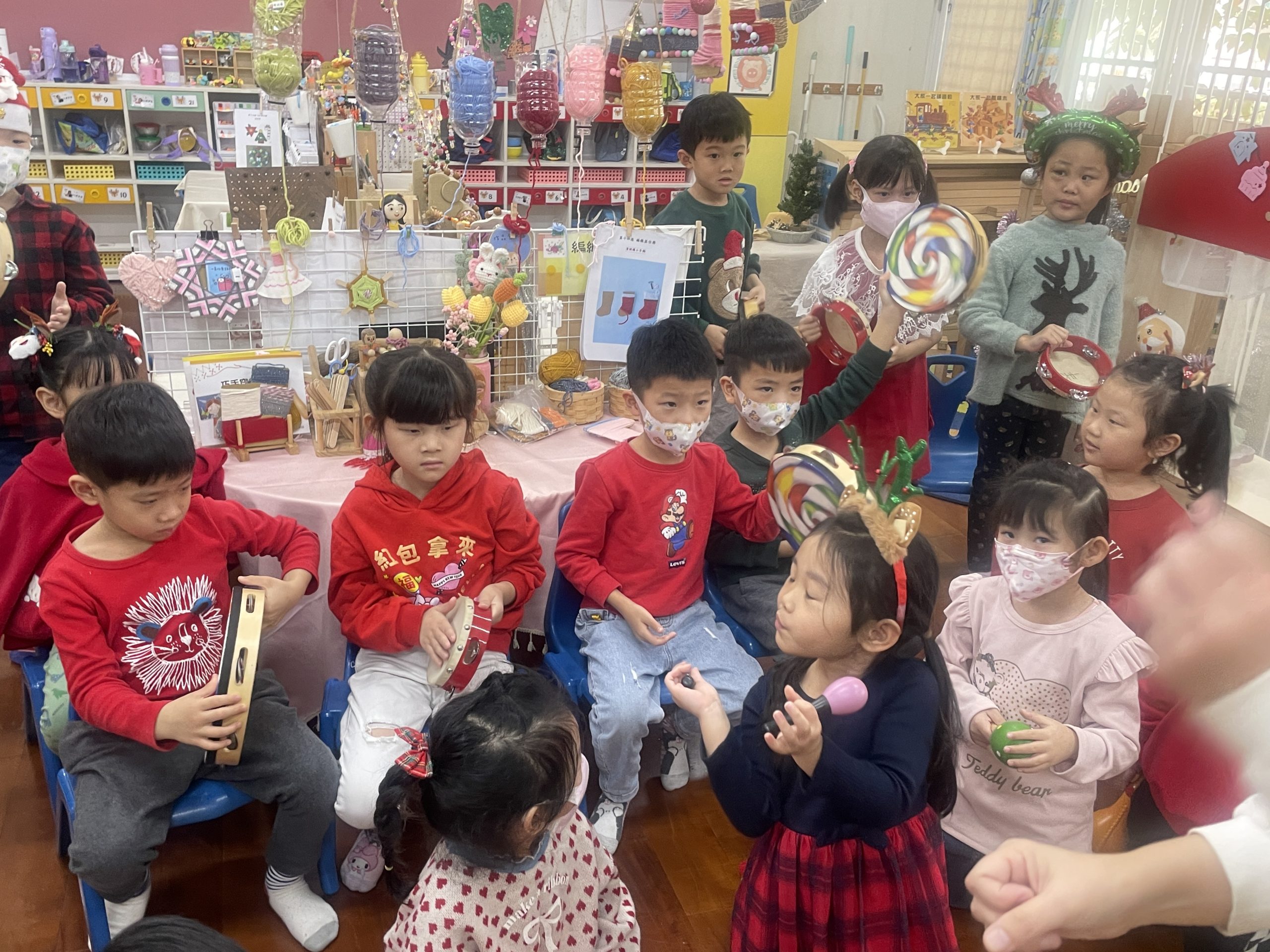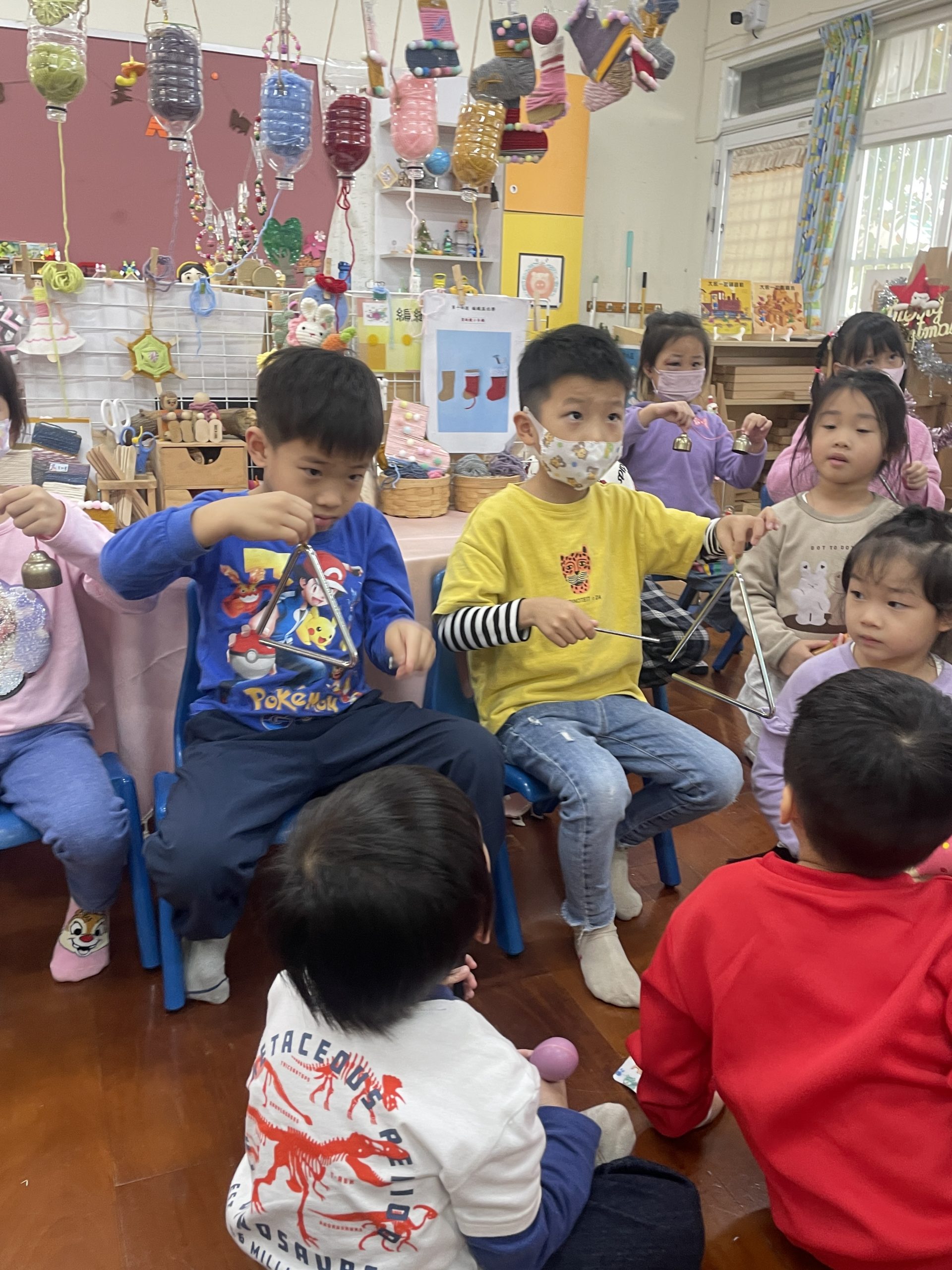 12/23 今天繼續練習兩首報佳音的歌曲~<聖誕老公公的鈴鐺不見了>和<粉紅色的聖誕節>,大班的三角鐵、鈴鼓與中班的沙鈴,邊唱邊跳邊打節奏,大家的專注力都進步囉!