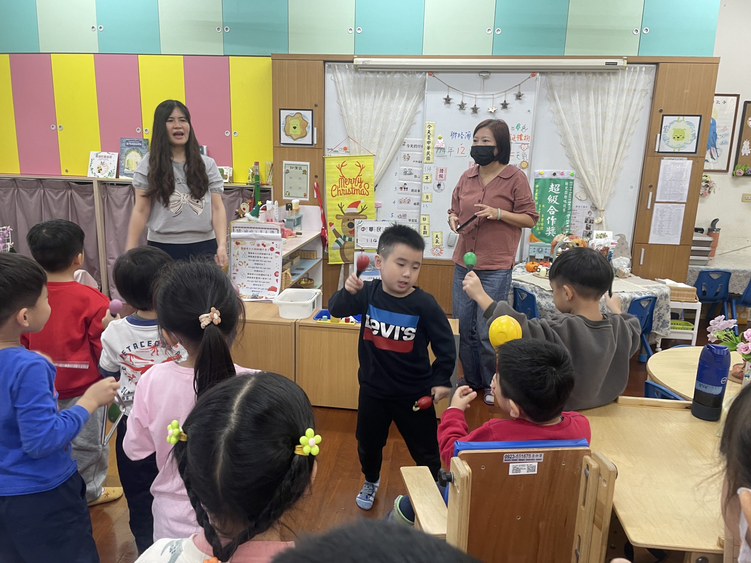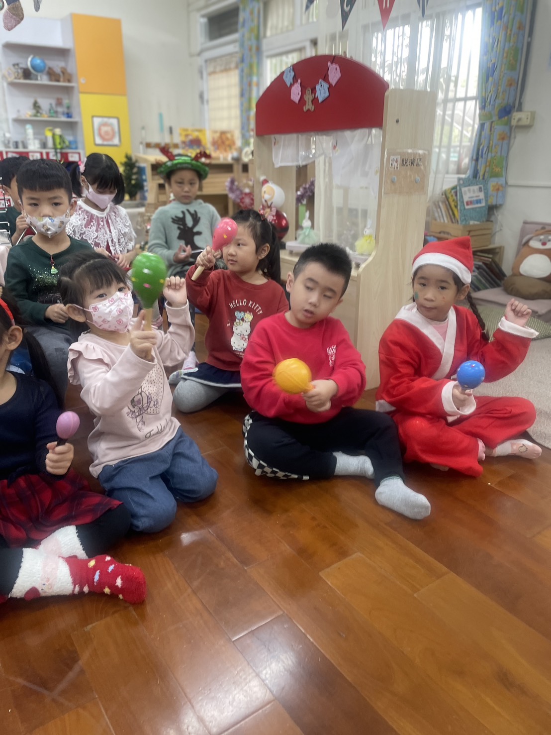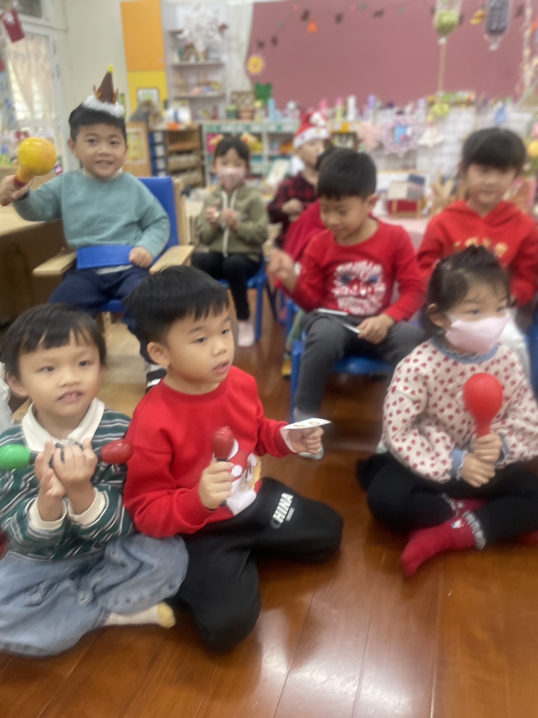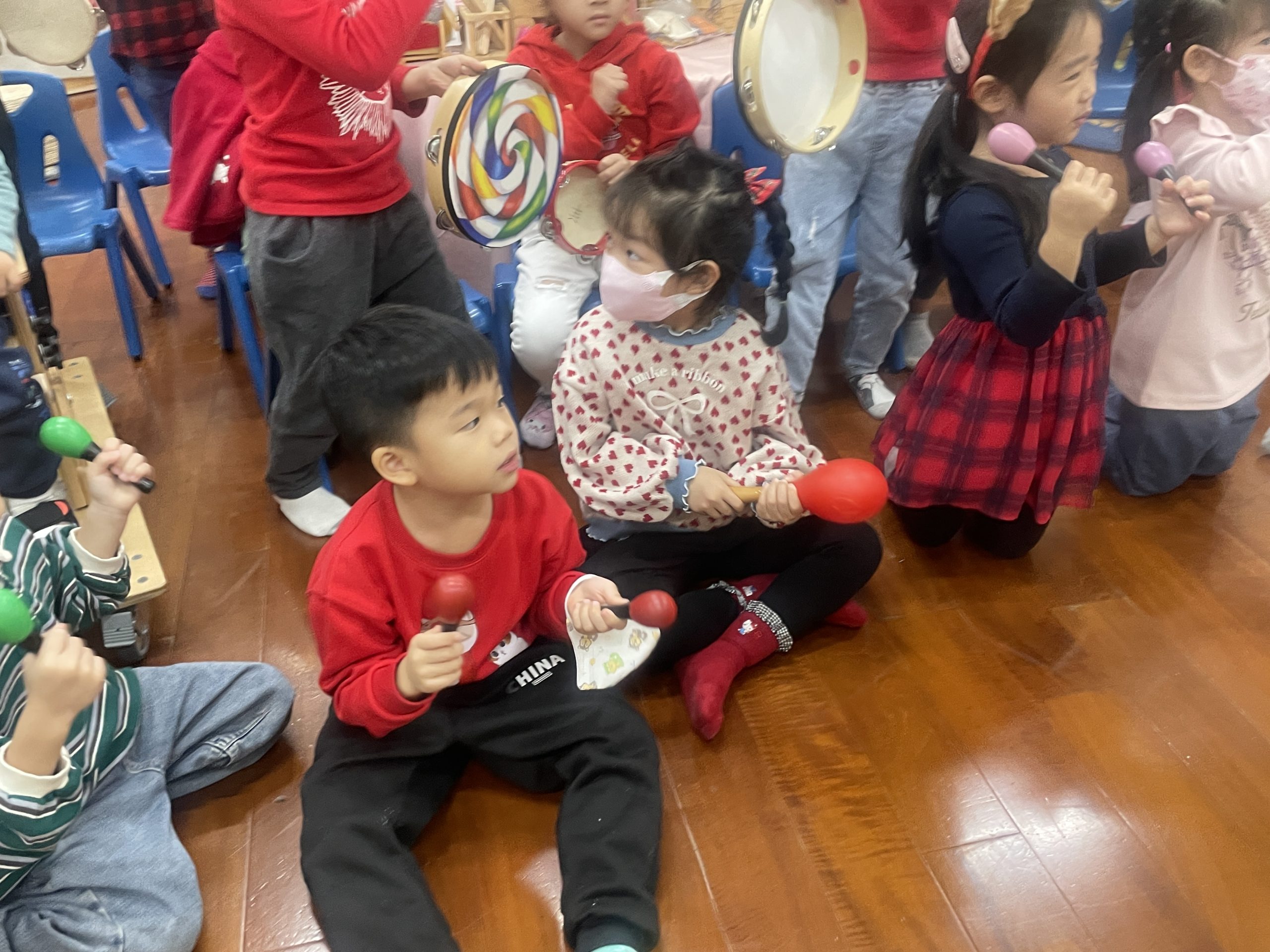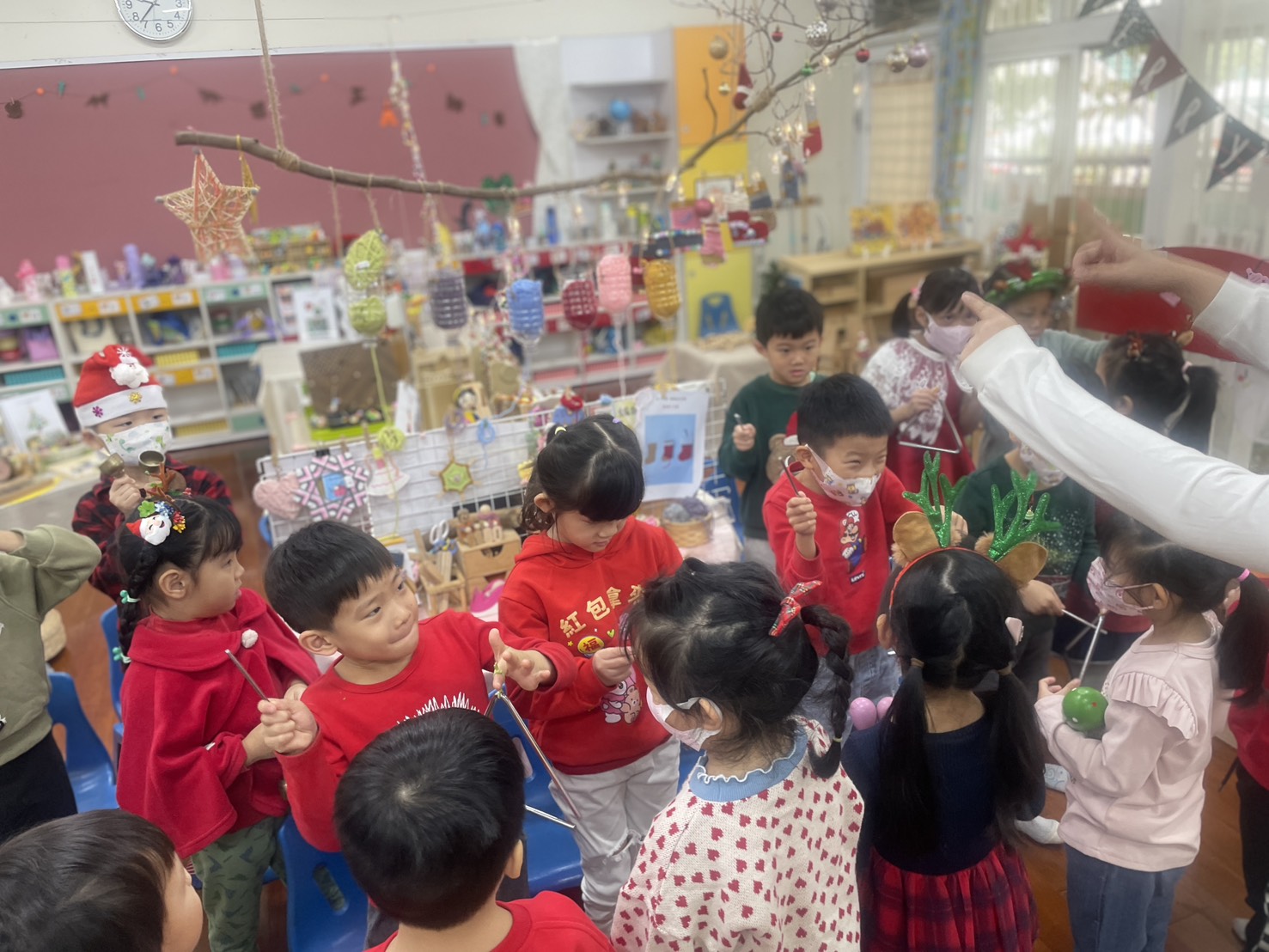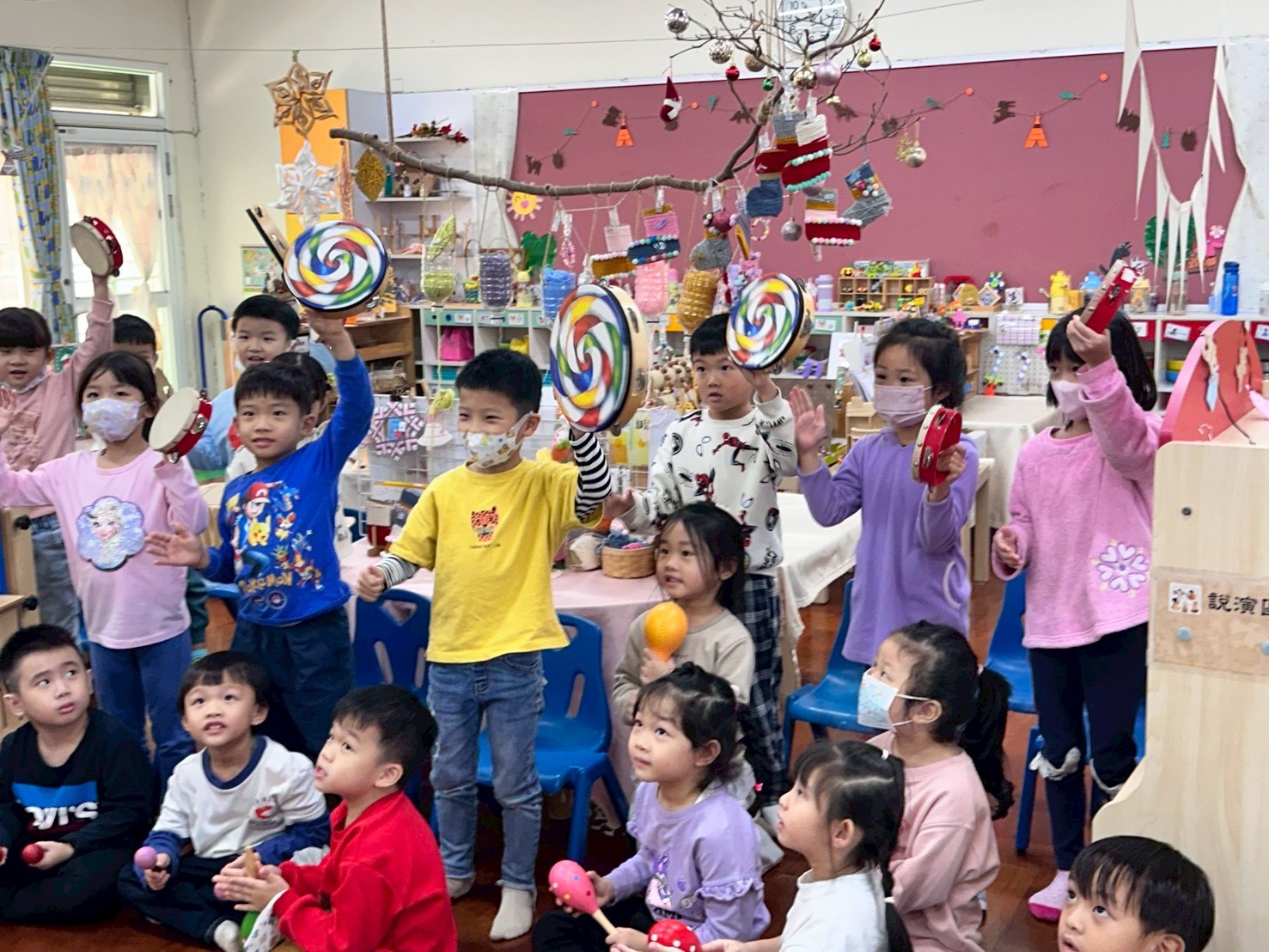 12/23 今天繼續練習兩首報佳音的歌曲~<聖誕老公公的鈴鐺不見了>和<粉紅色的聖誕節>,大班的三角鐵、鈴鼓與中班的沙鈴,邊唱邊跳邊打節奏,大家的專注力都進步囉!