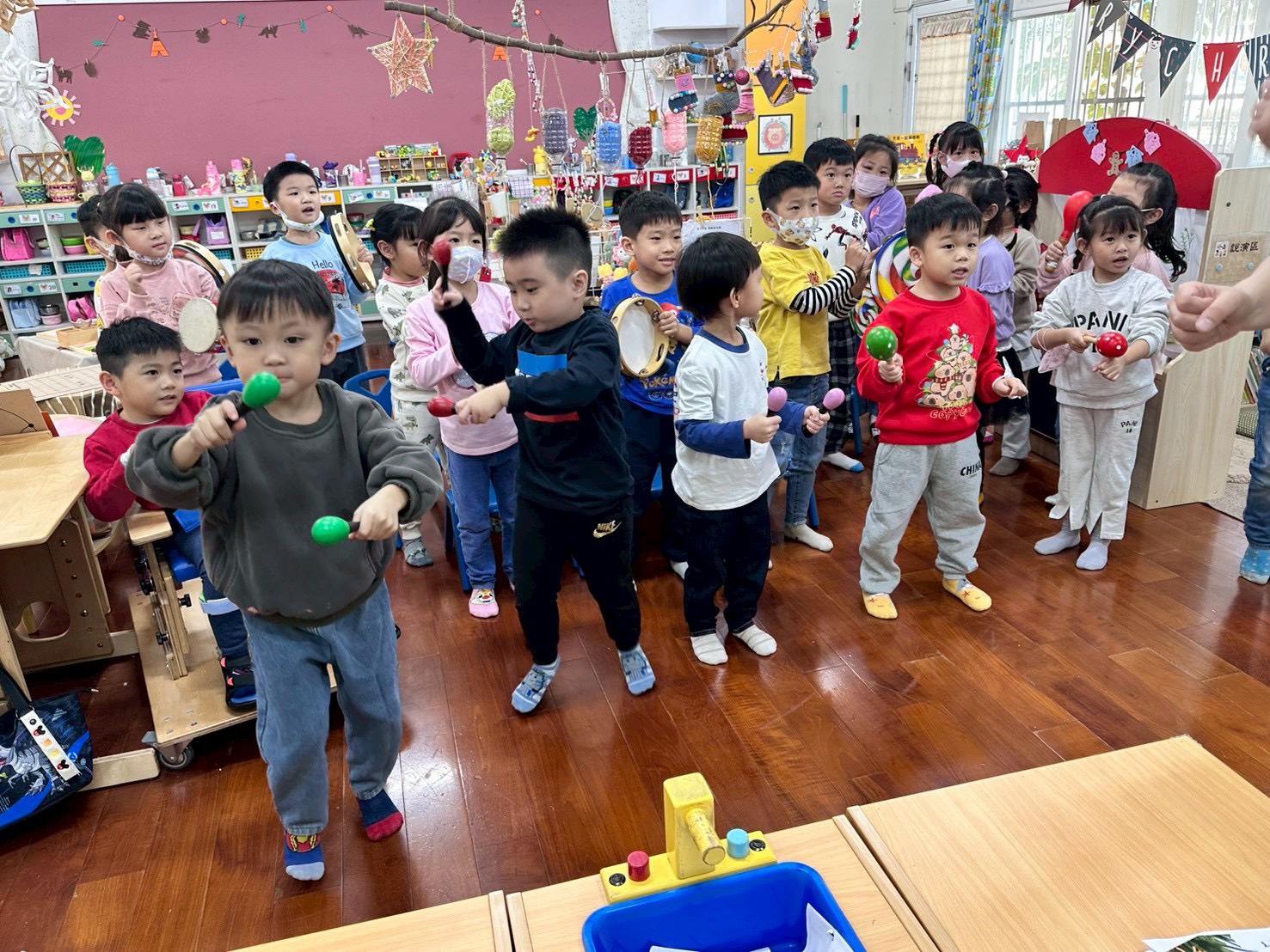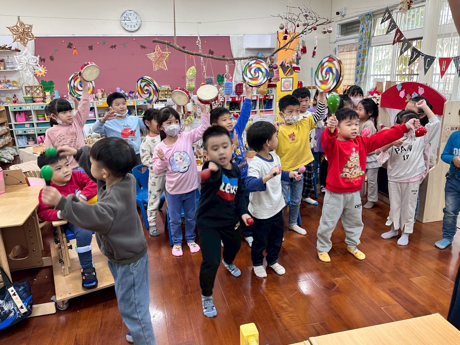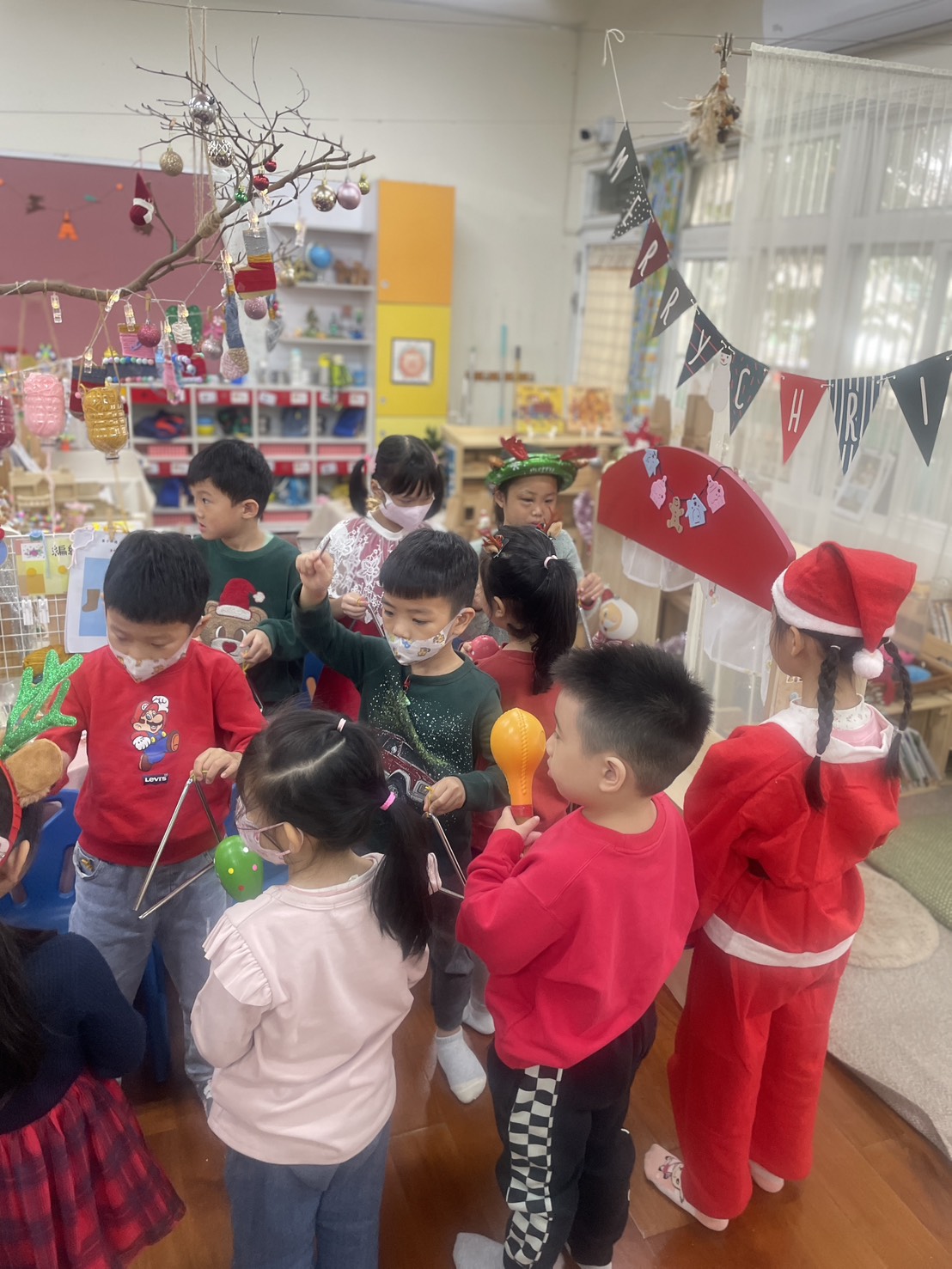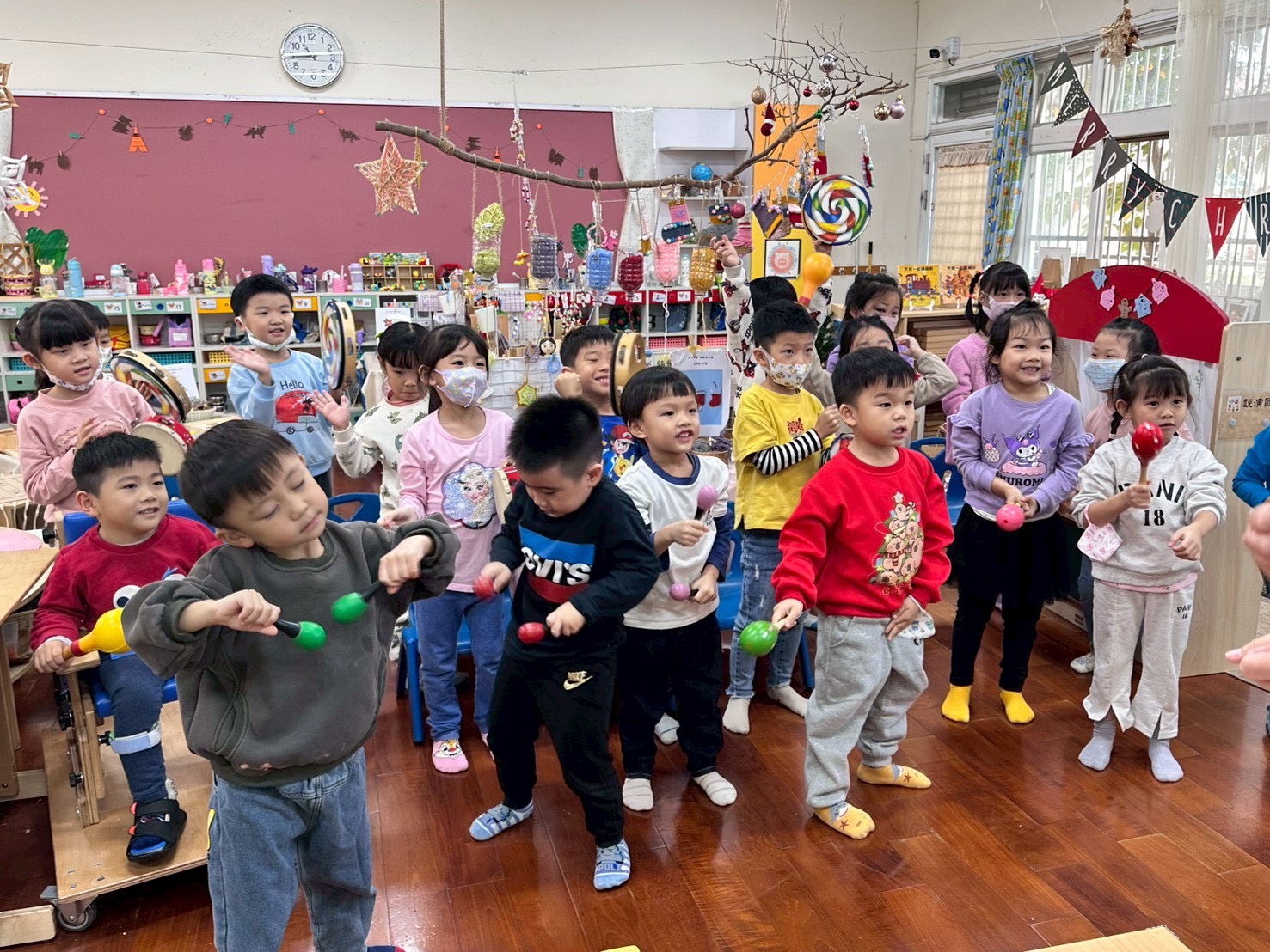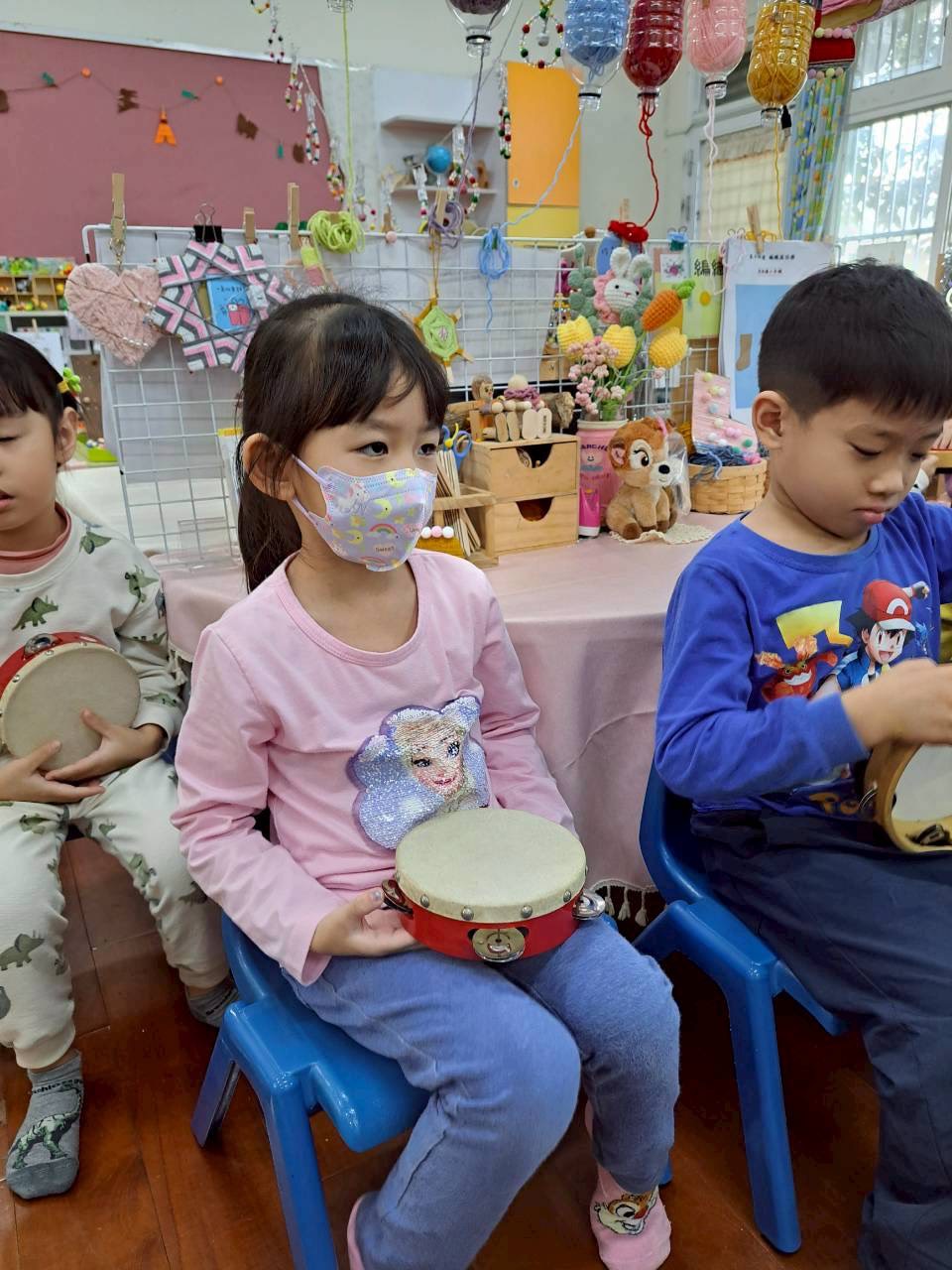 12/23 今天繼續練習兩首報佳音的歌曲~<聖誕老公公的鈴鐺不見了>和<粉紅色的聖誕節>,大班的三角鐵、鈴鼓與中班的沙鈴,邊唱邊跳邊打節奏,大家的專注力都進步囉!