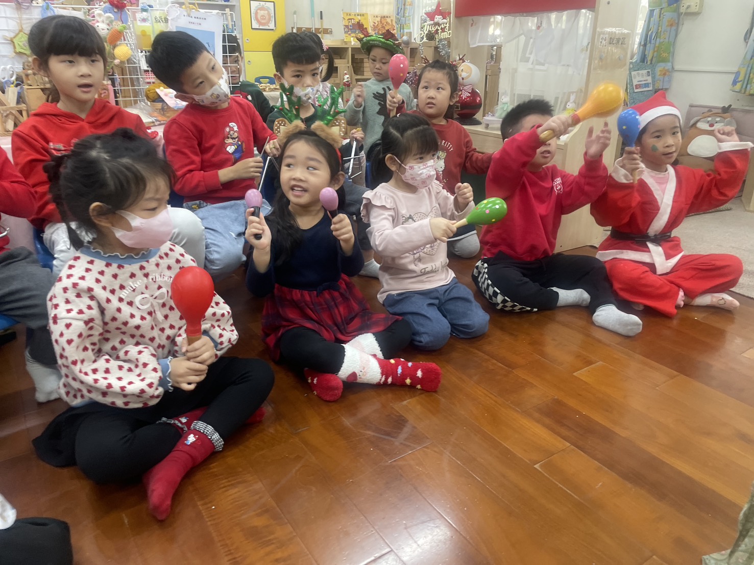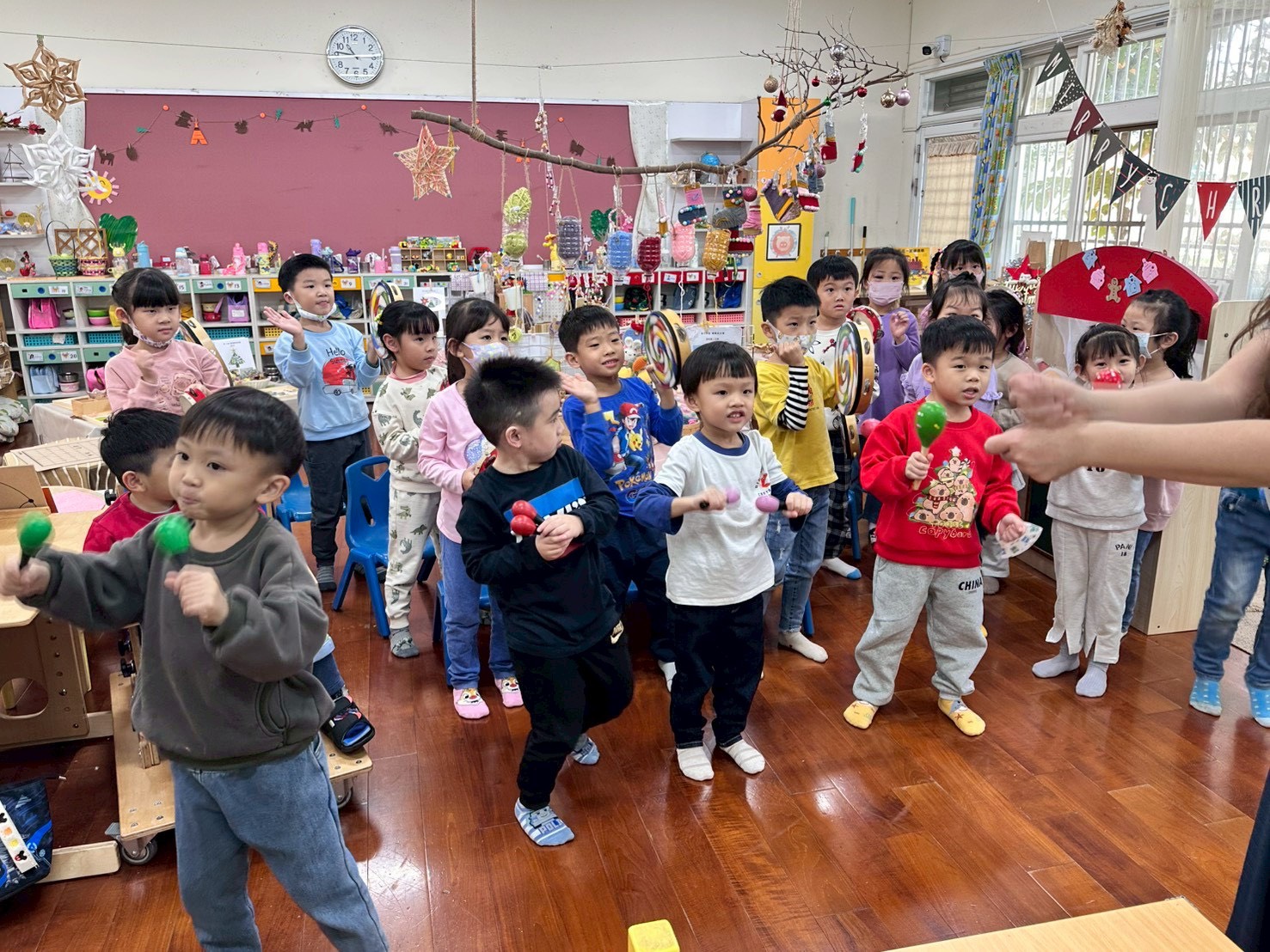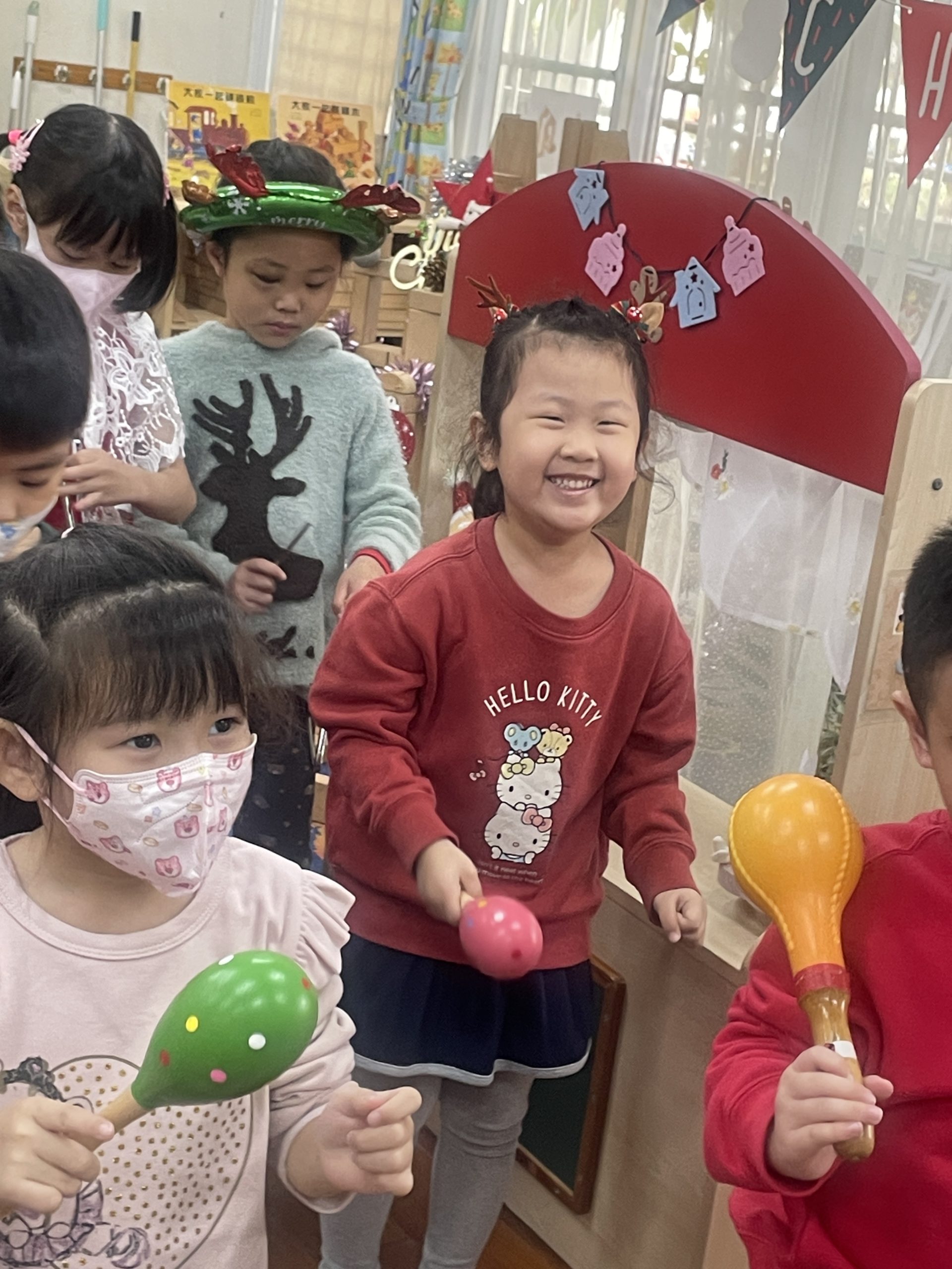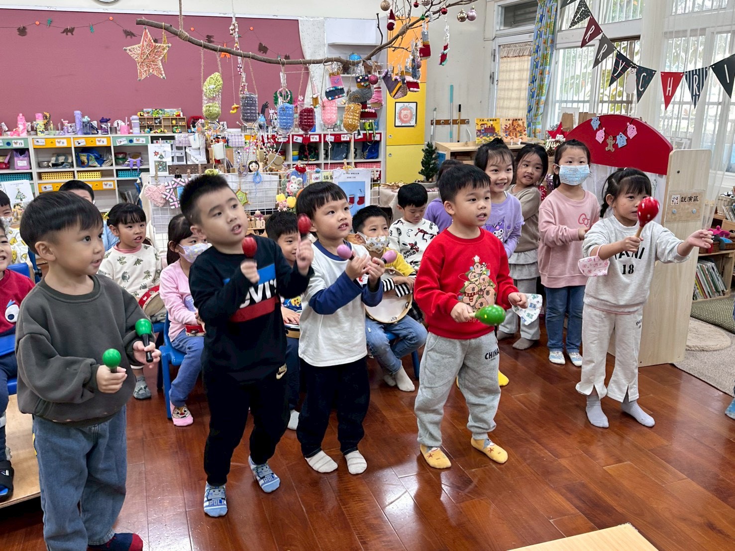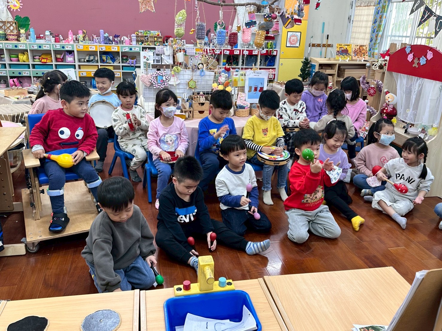12/23 今天繼續練習兩首報佳音的歌曲~<聖誕老公公的鈴鐺不見了>和<粉紅色的聖誕節>,大班的三角鐵、鈴鼓與中班的沙鈴,邊唱邊跳邊打節奏,大家的專注力都進步囉!