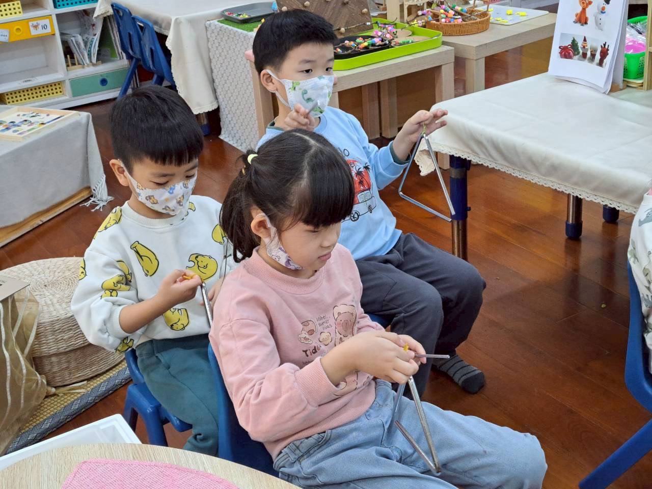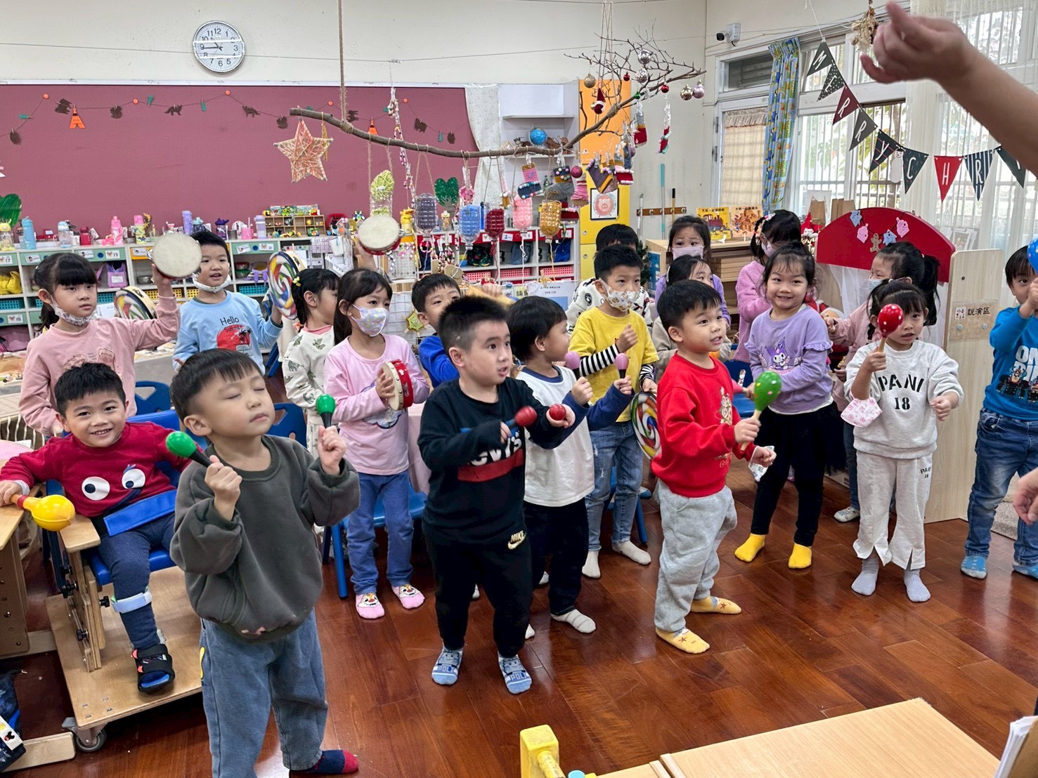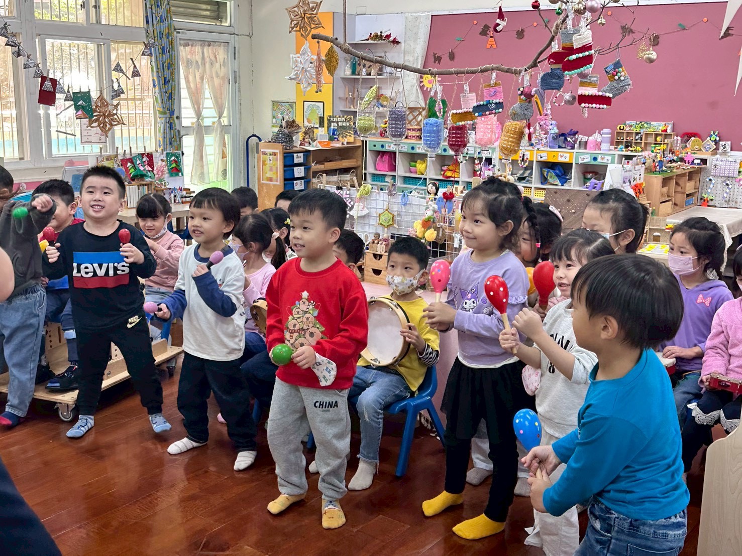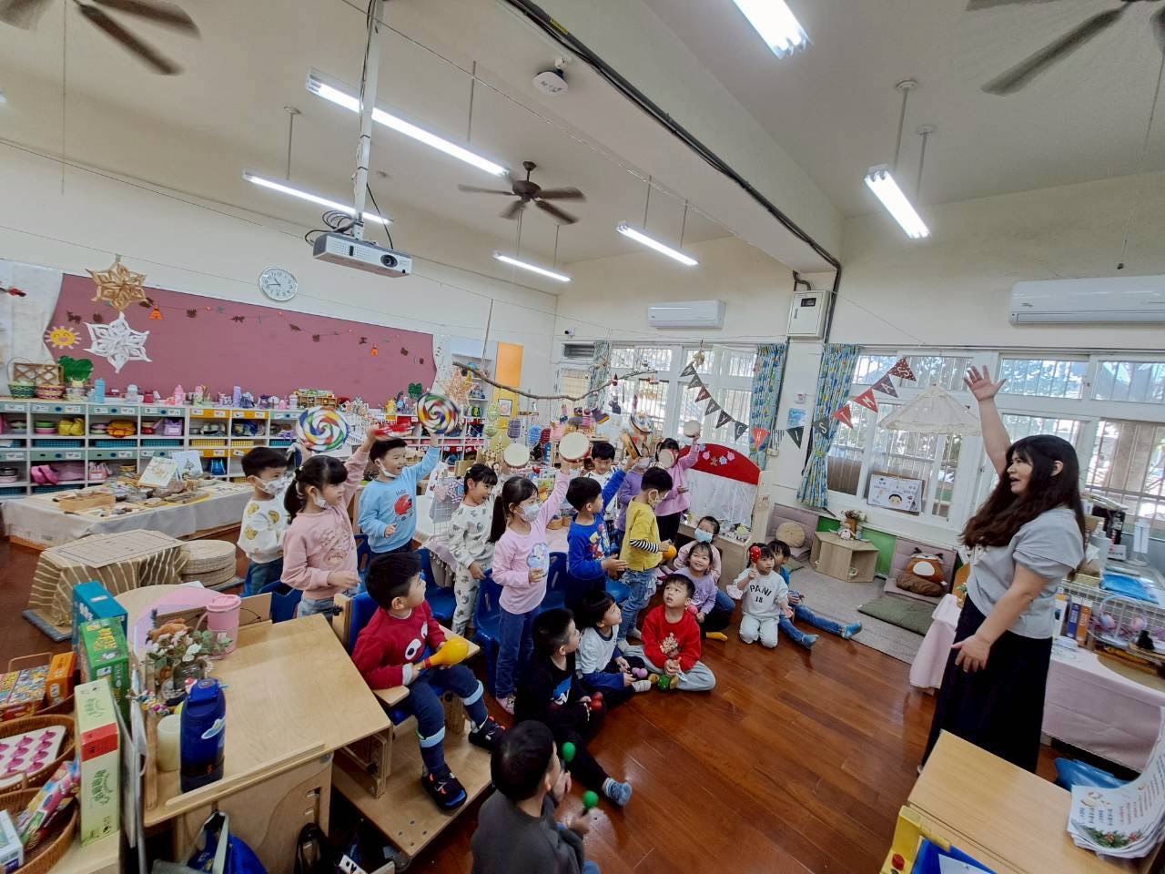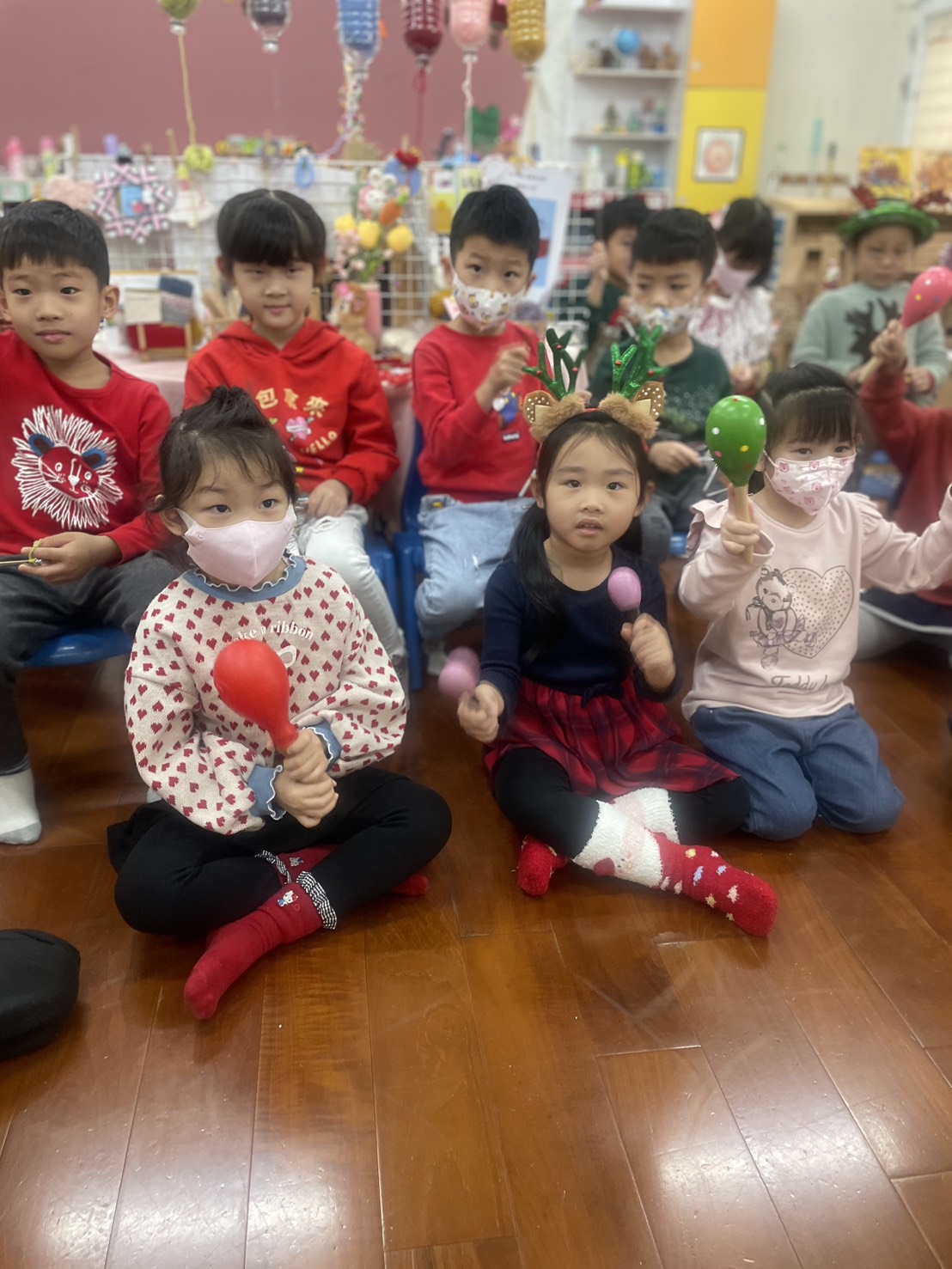 12/23 今天繼續練習兩首報佳音的歌曲~<聖誕老公公的鈴鐺不見了>和<粉紅色的聖誕節>,大班的三角鐵、鈴鼓與中班的沙鈴,邊唱邊跳邊打節奏,大家的專注力都進步囉!