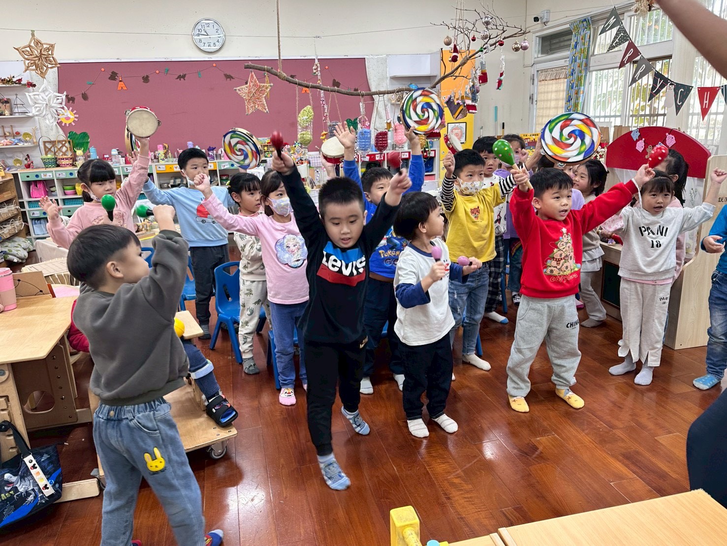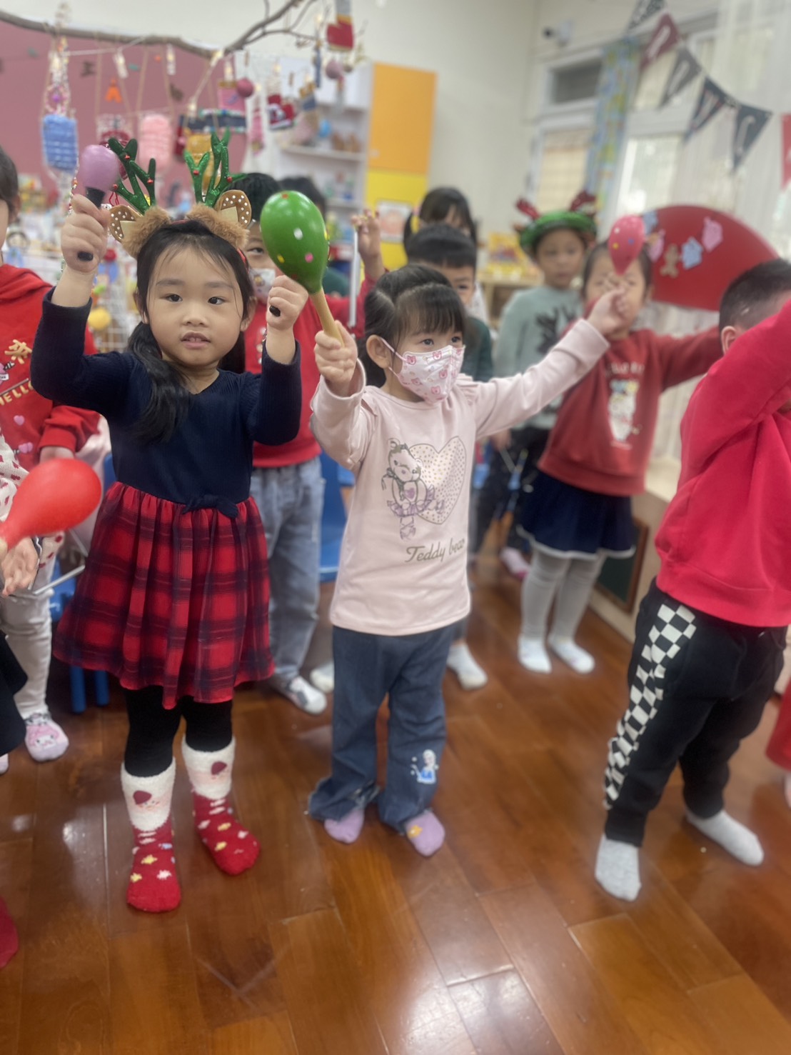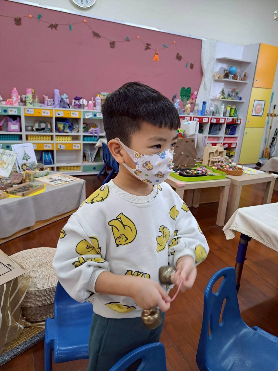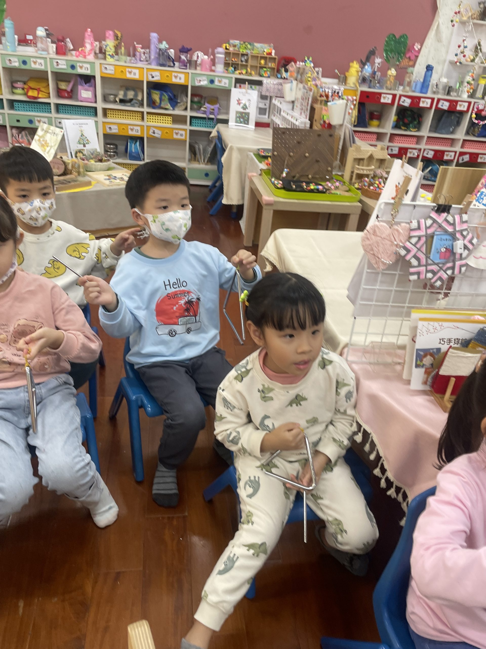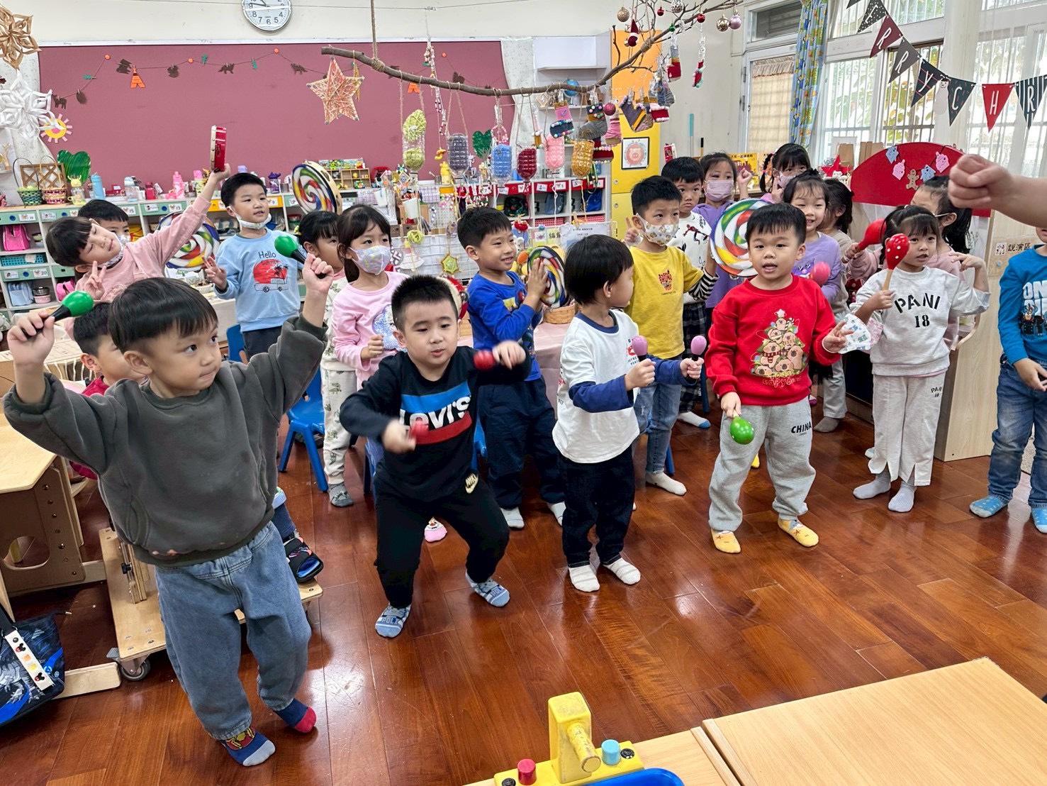 12/23 今天繼續練習兩首報佳音的歌曲~<聖誕老公公的鈴鐺不見了>和<粉紅色的聖誕節>,大班的三角鐵、鈴鼓與中班的沙鈴,邊唱邊跳邊打節奏,大家的專注力都進步囉!