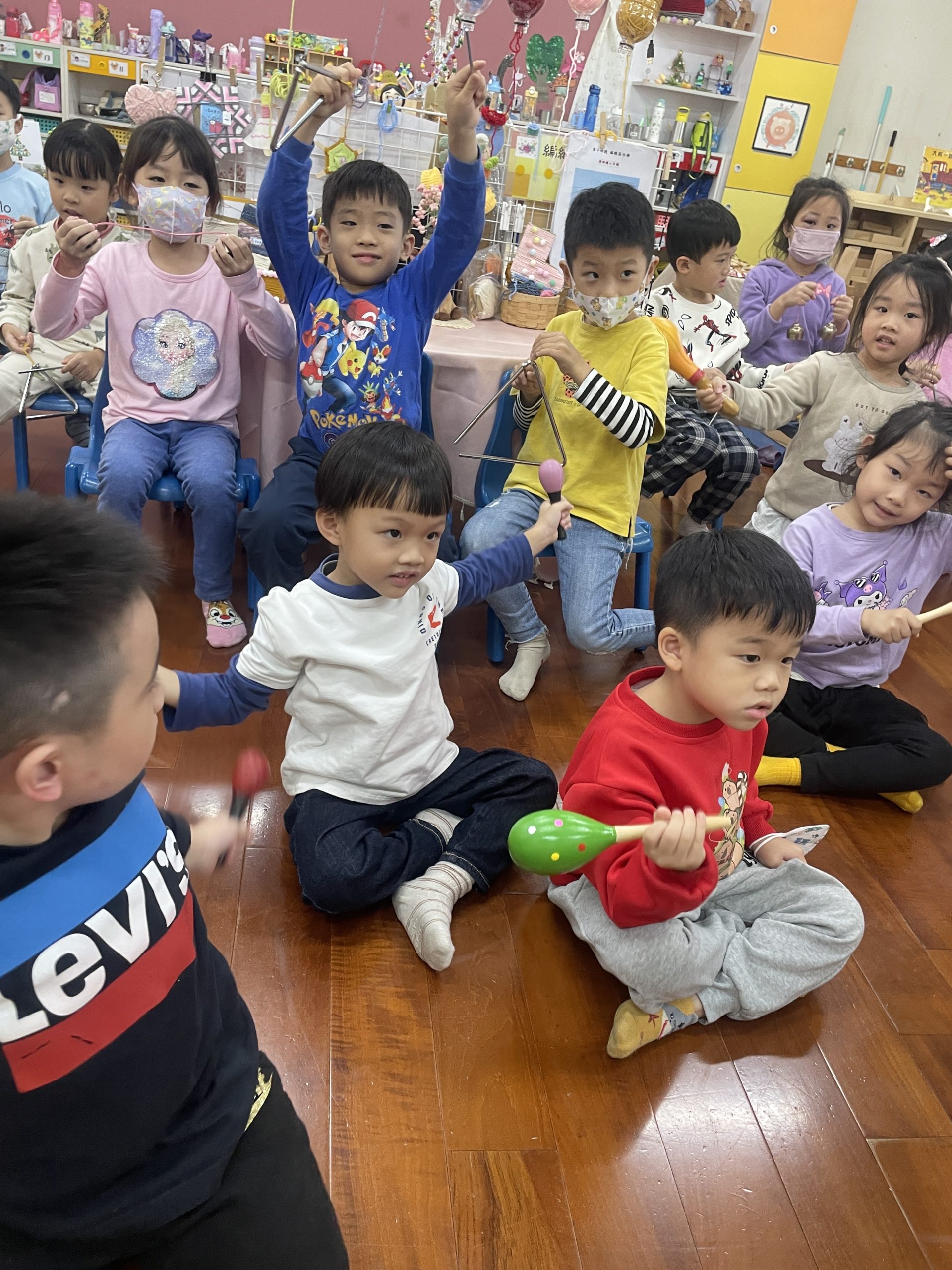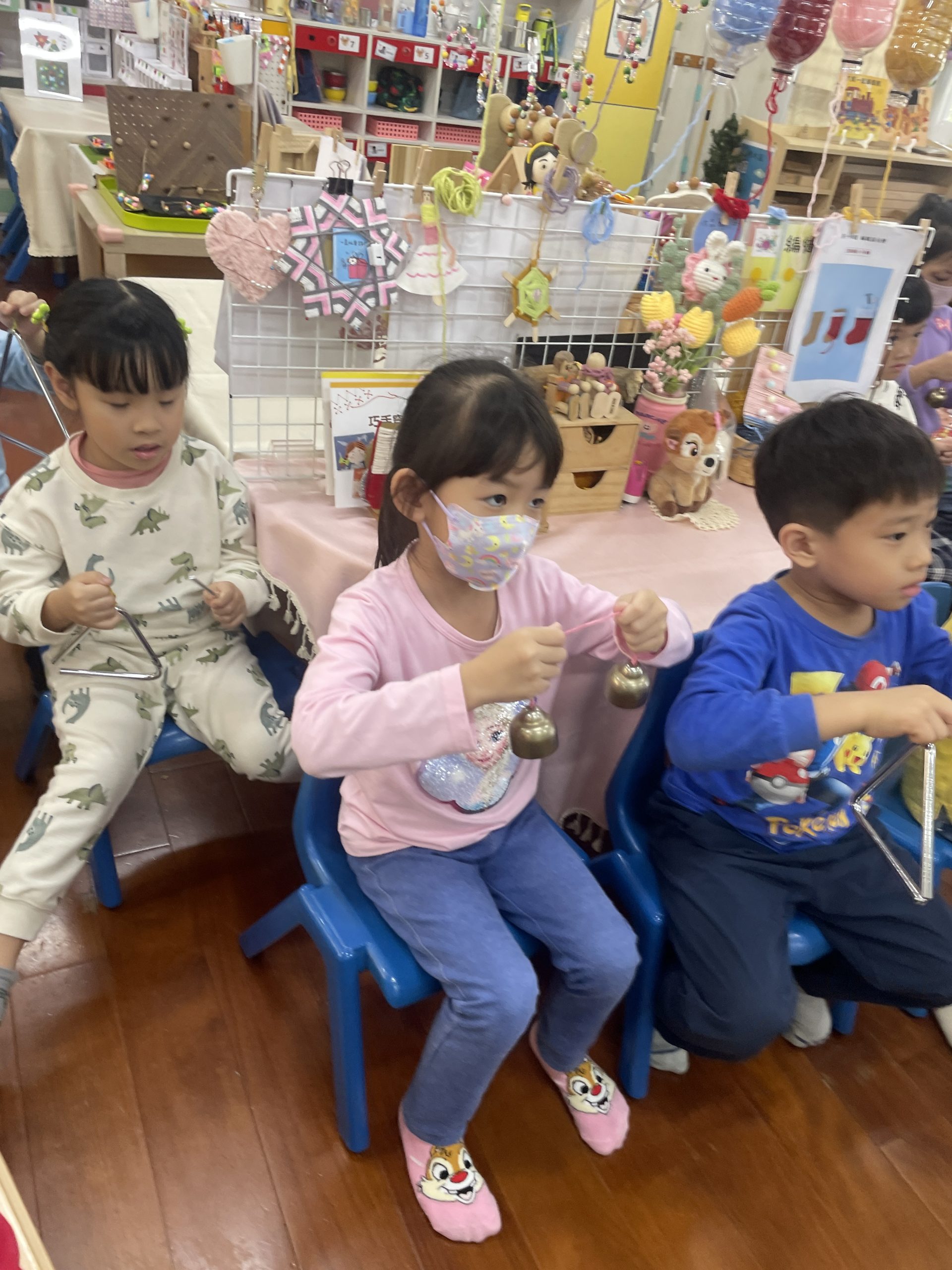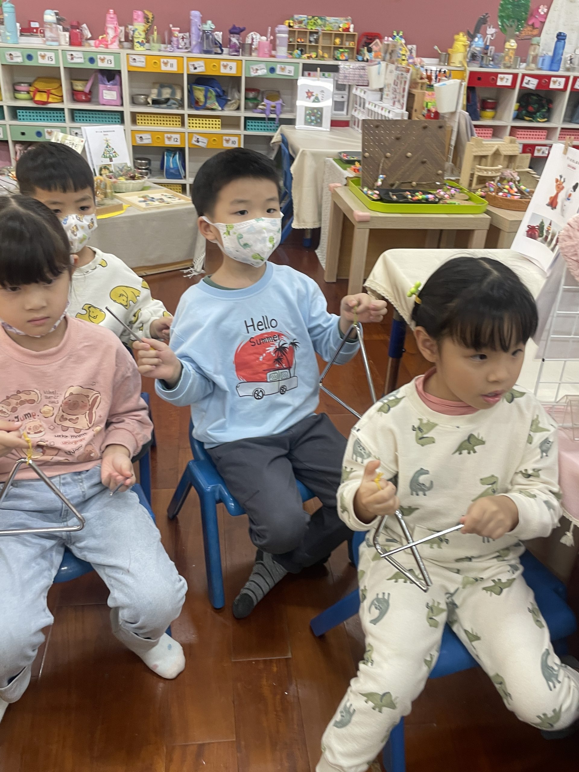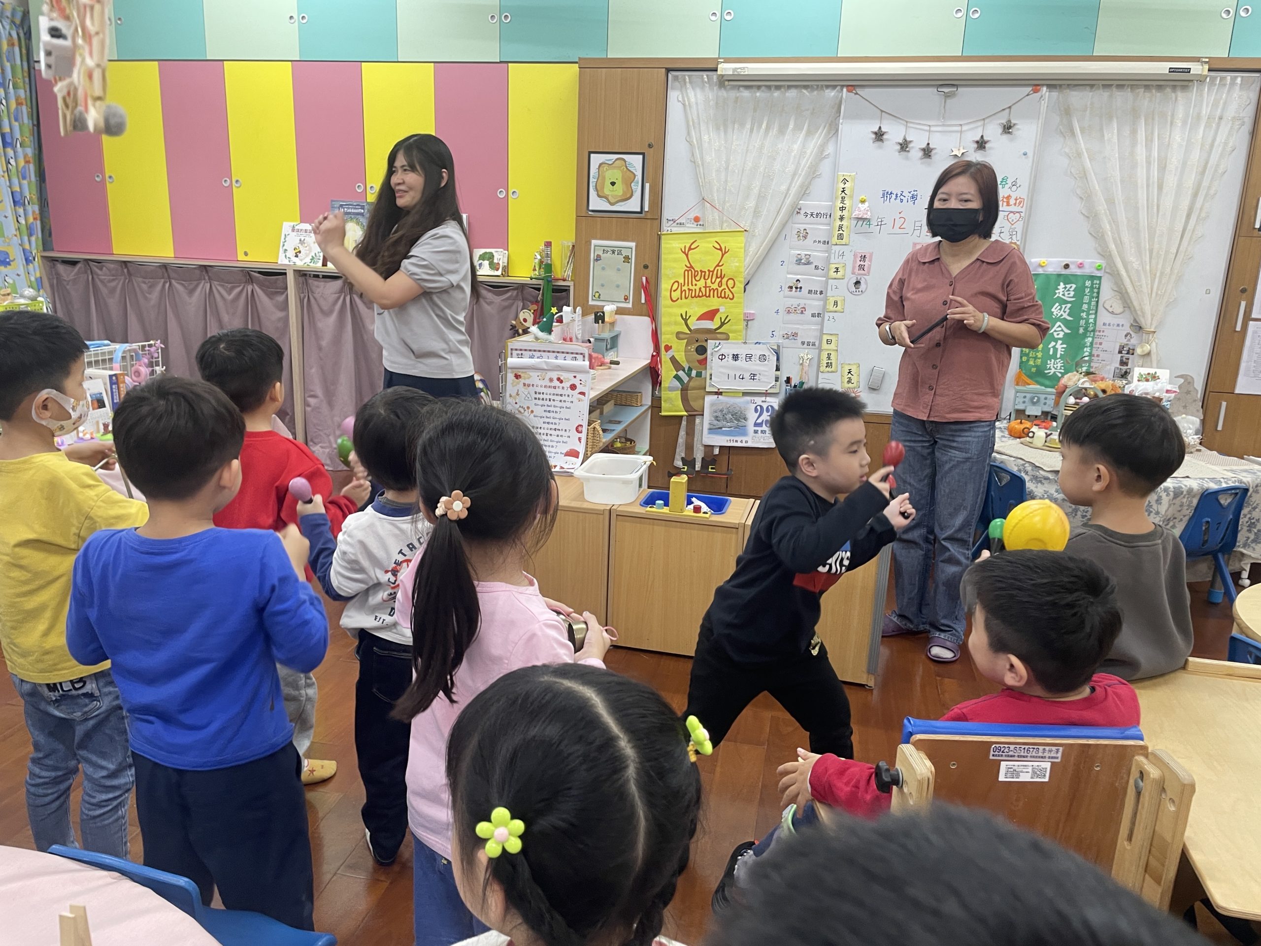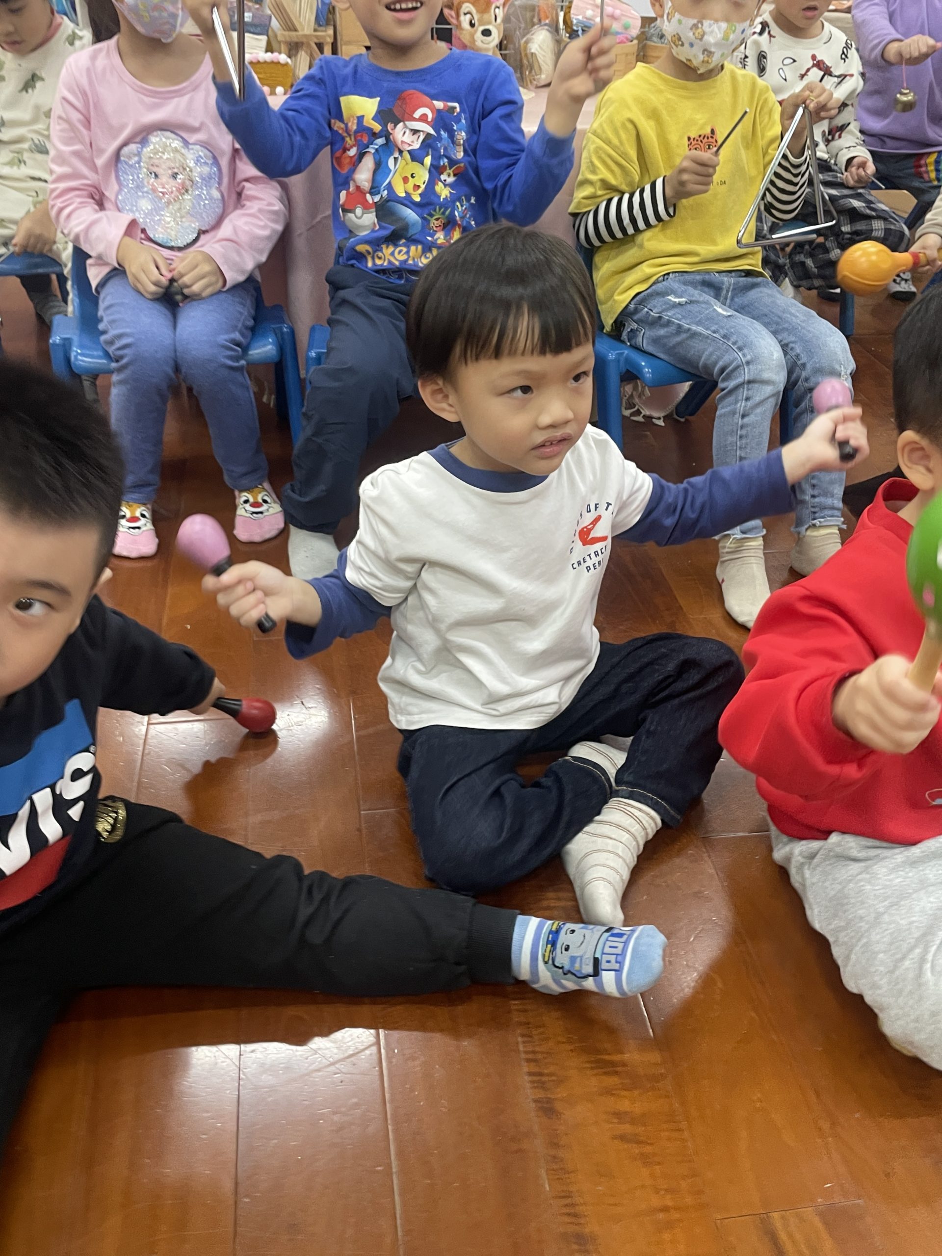 12/23 今天繼續練習兩首報佳音的歌曲~<聖誕老公公的鈴鐺不見了>和<粉紅色的聖誕節>,大班的三角鐵、鈴鼓與中班的沙鈴,邊唱邊跳邊打節奏,大家的專注力都進步囉!