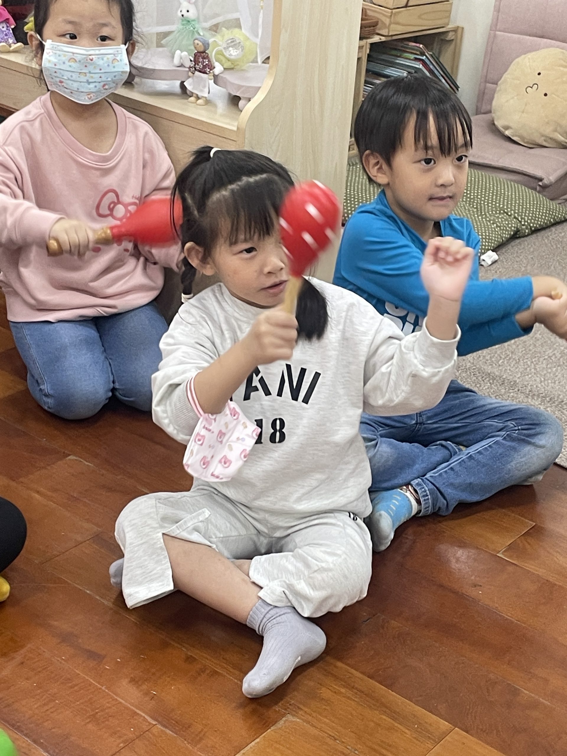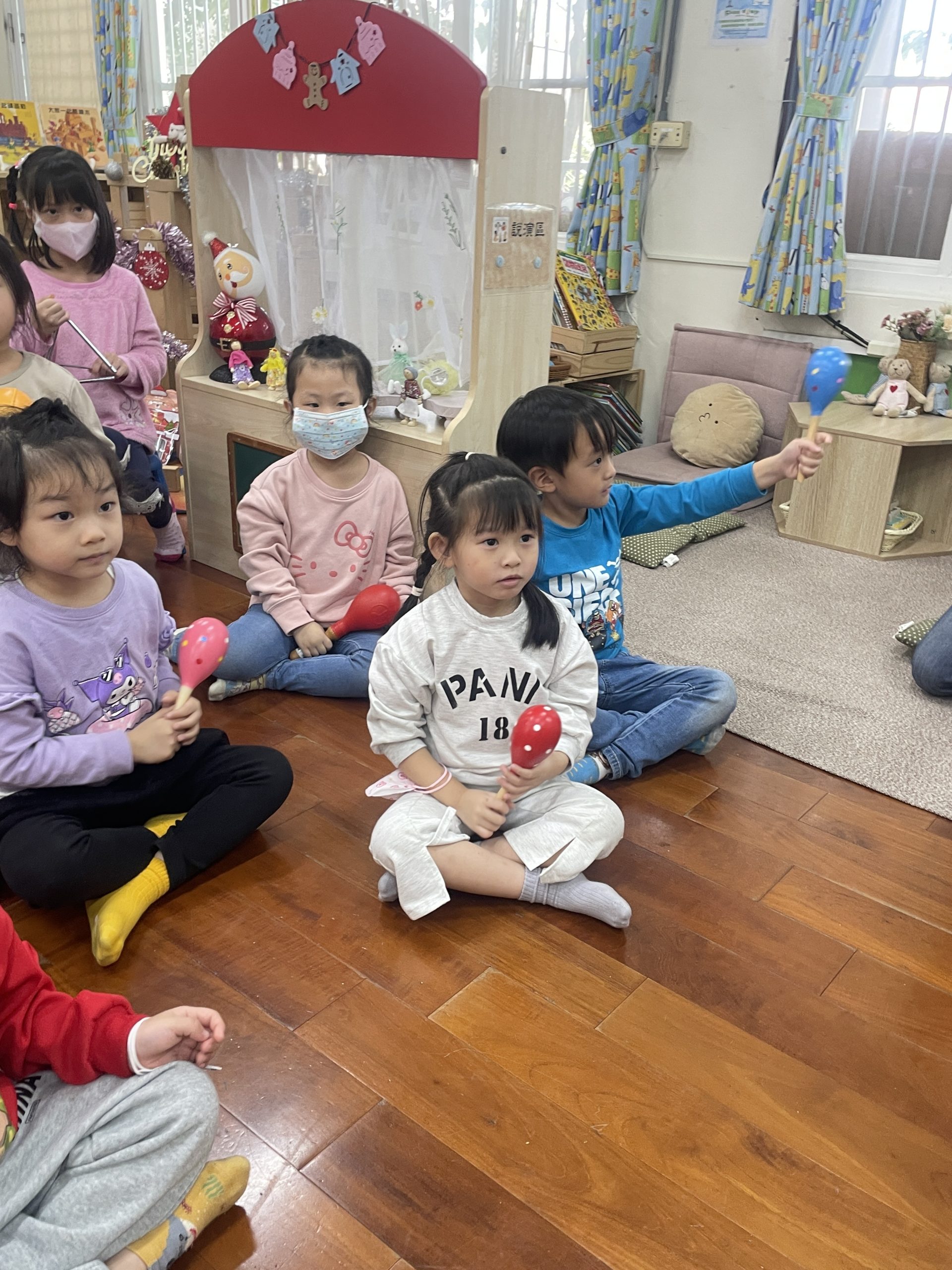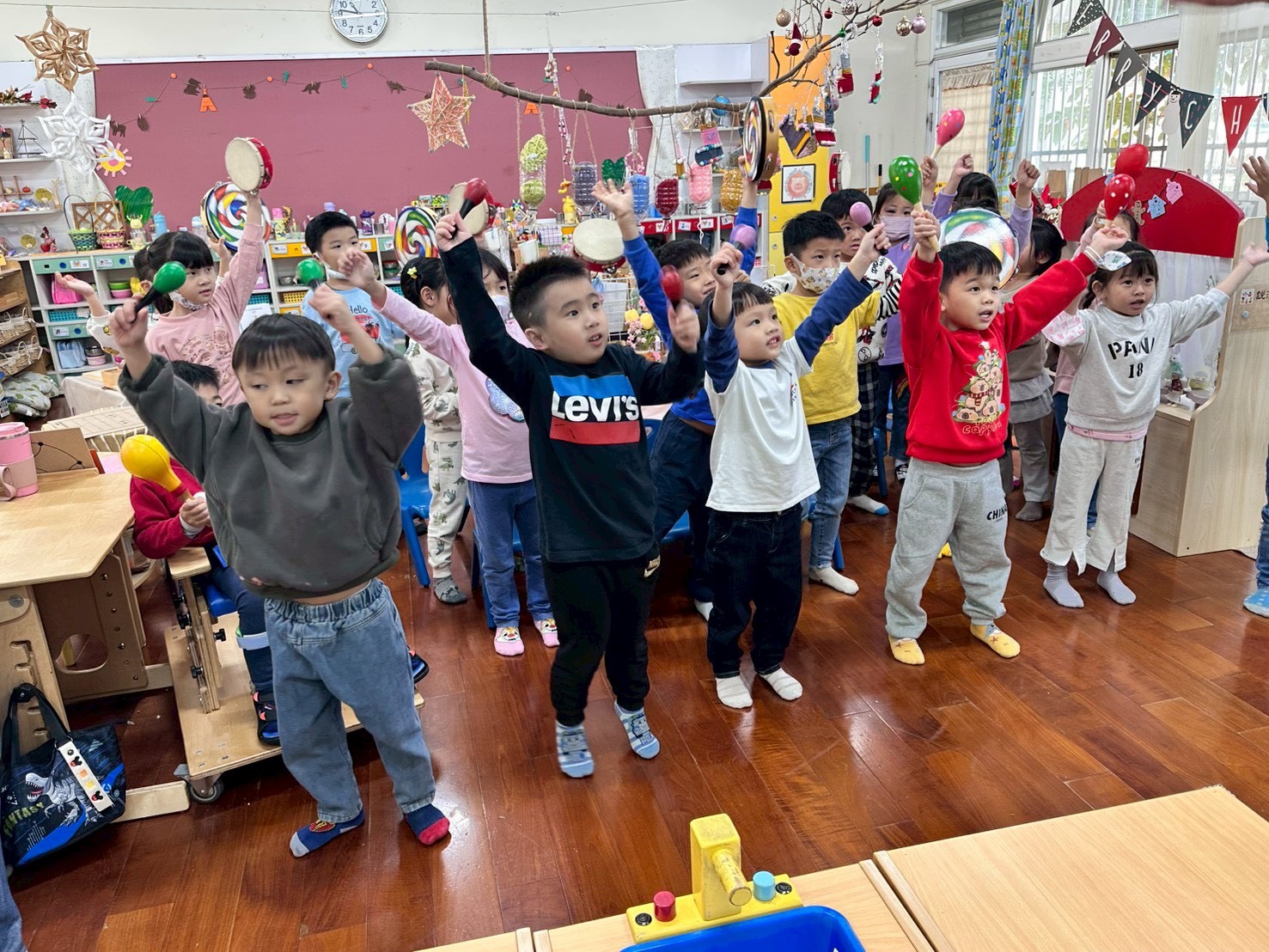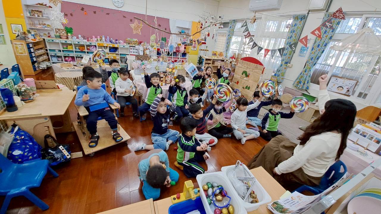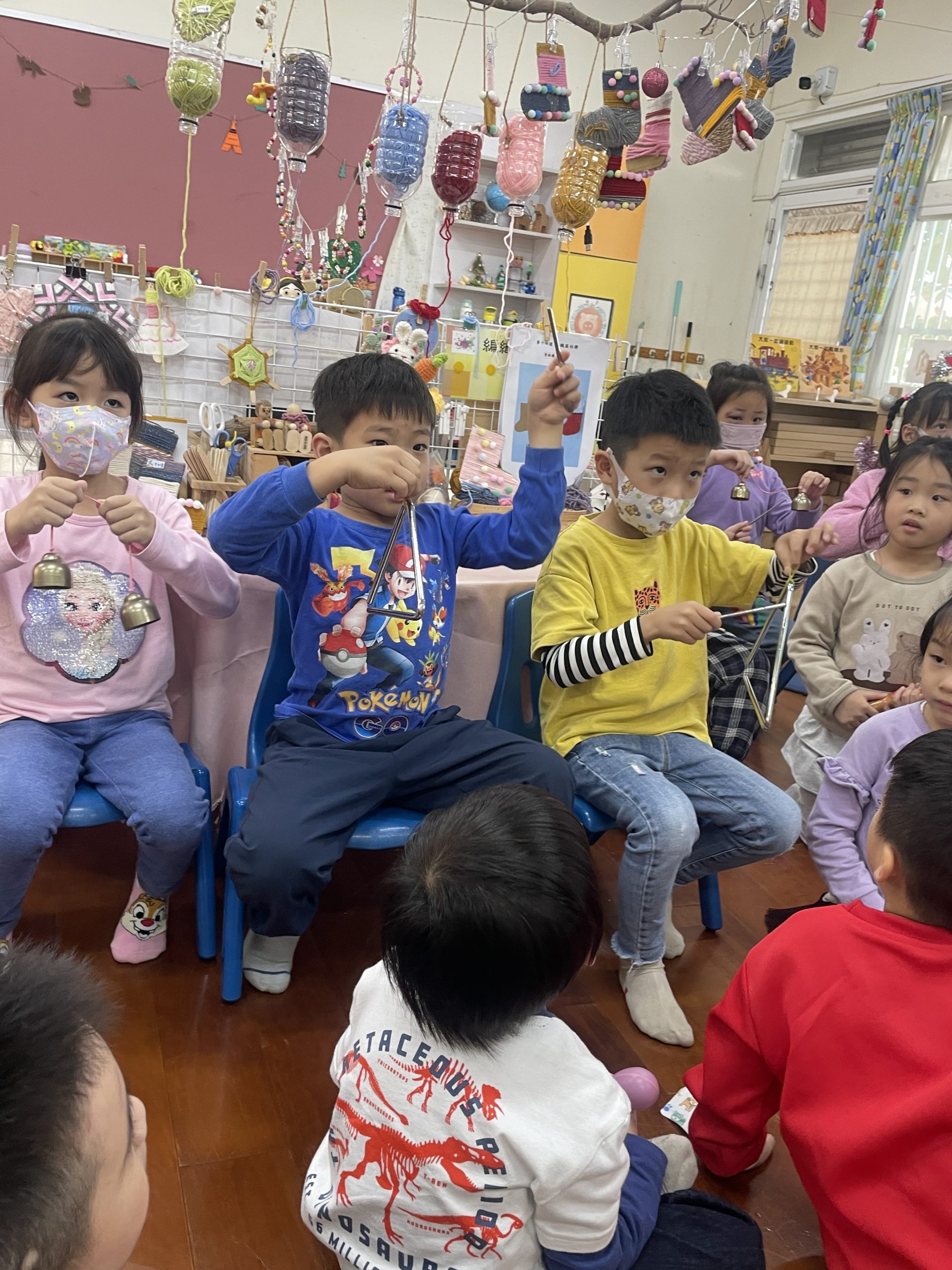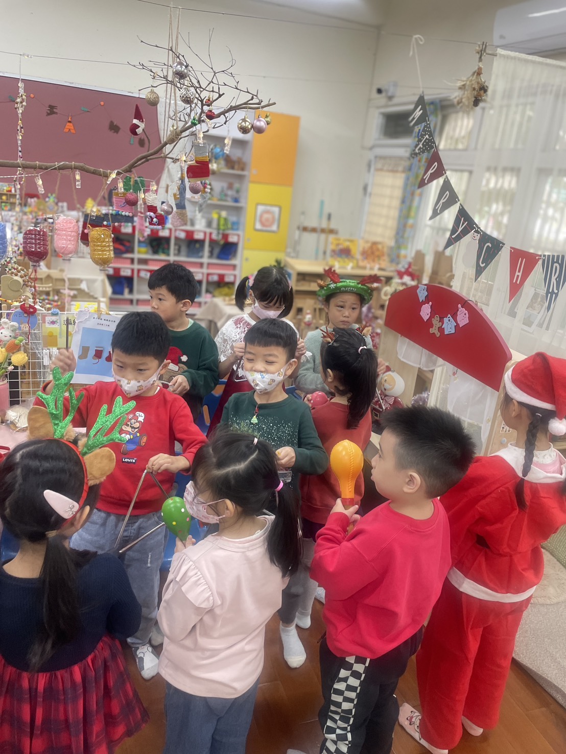 12/23 今天繼續練習兩首報佳音的歌曲~<聖誕老公公的鈴鐺不見了>和<粉紅色的聖誕節>,大班的三角鐵、鈴鼓與中班的沙鈴,邊唱邊跳邊打節奏,大家的專注力都進步囉!
