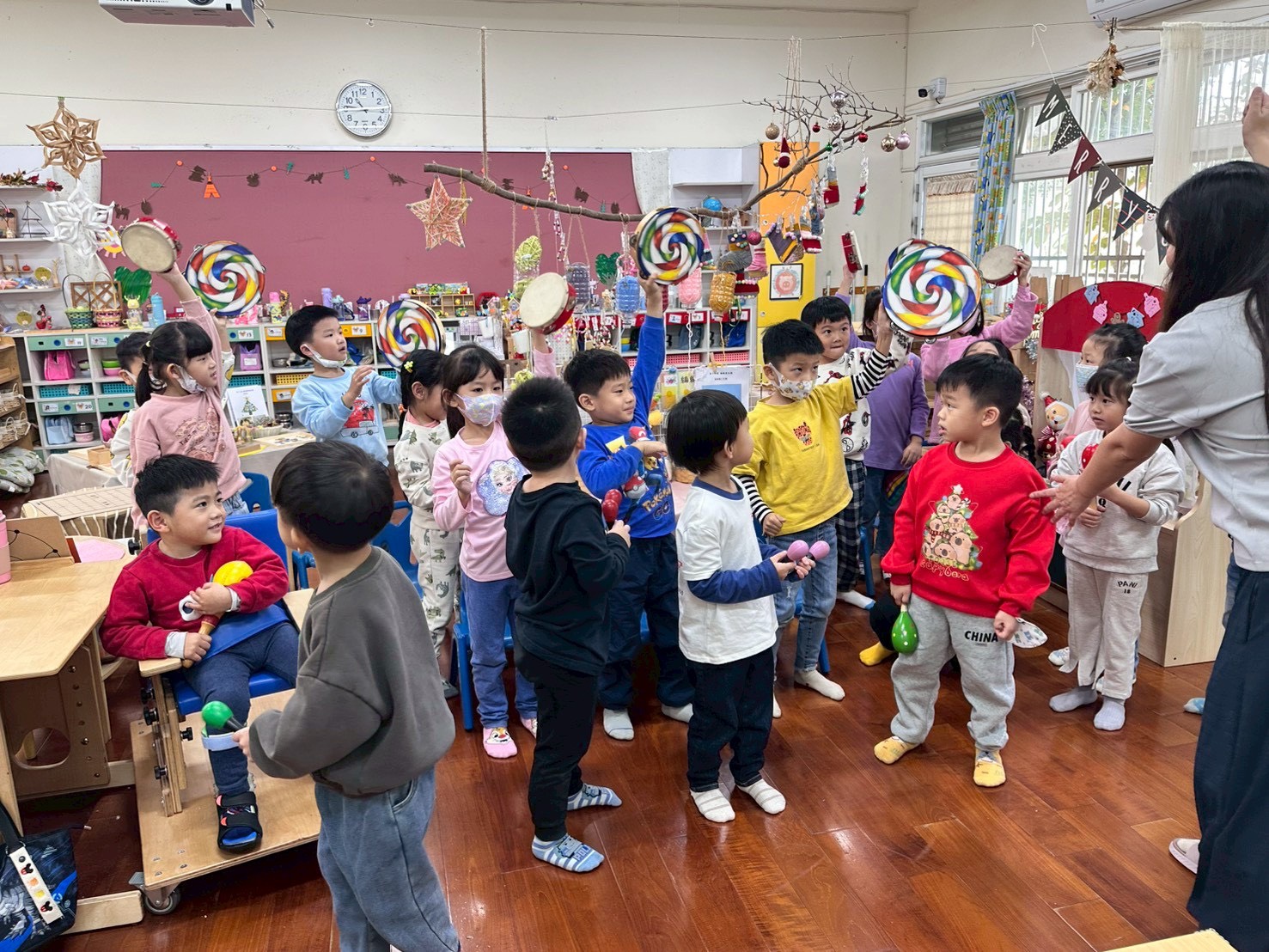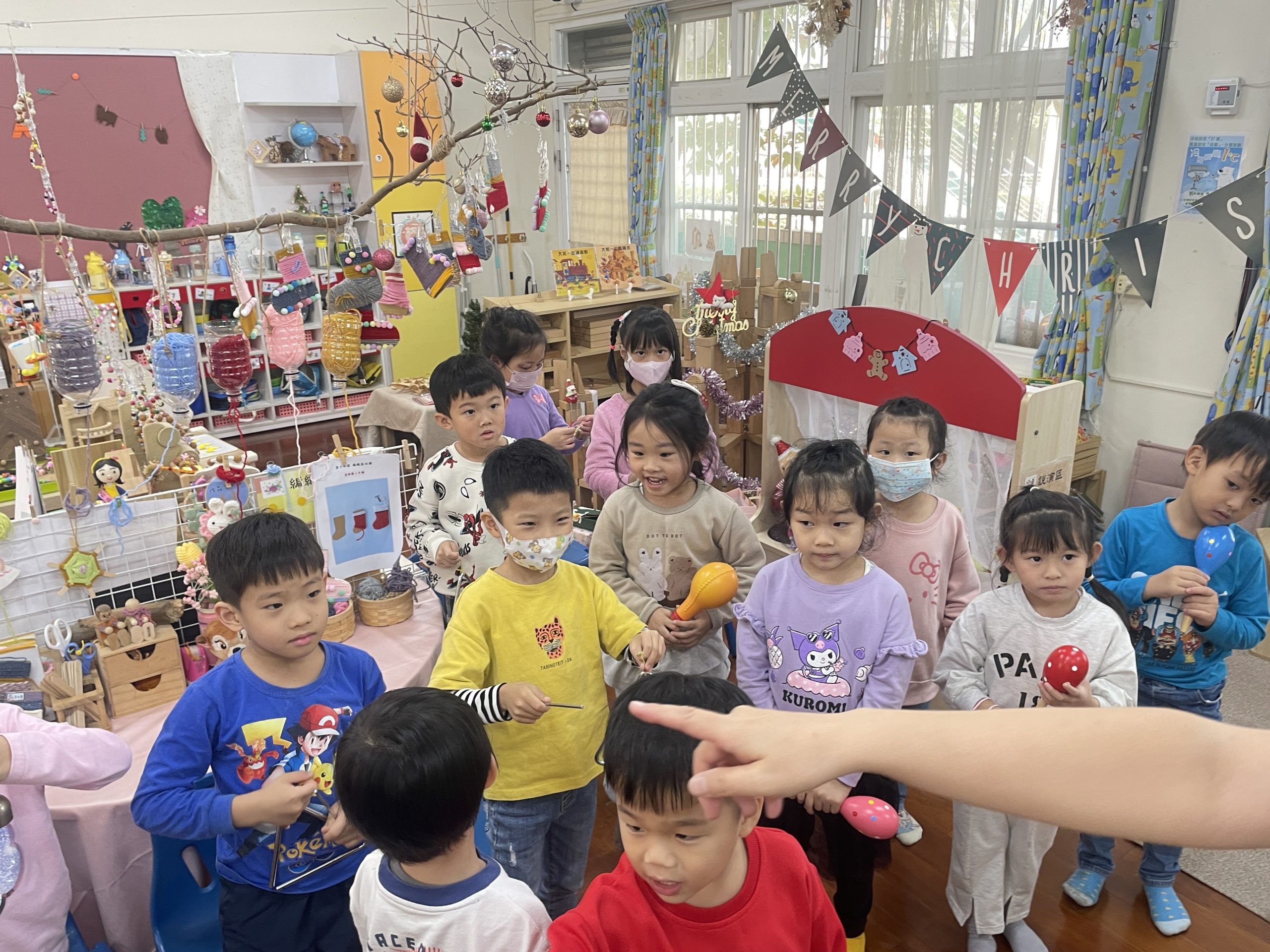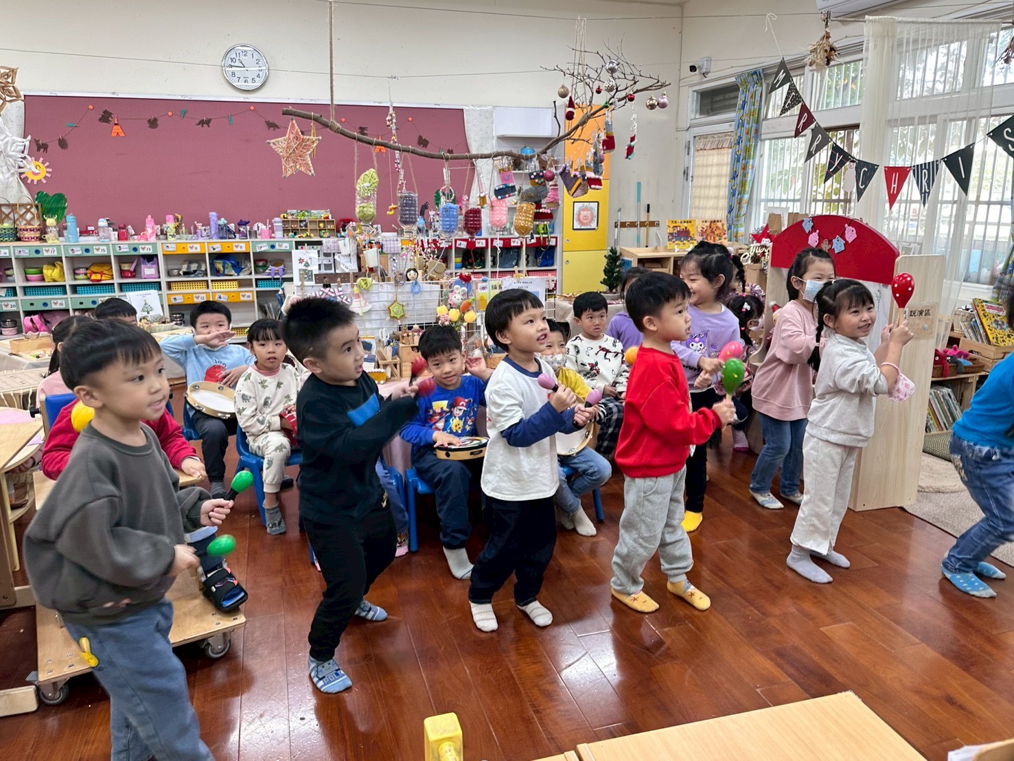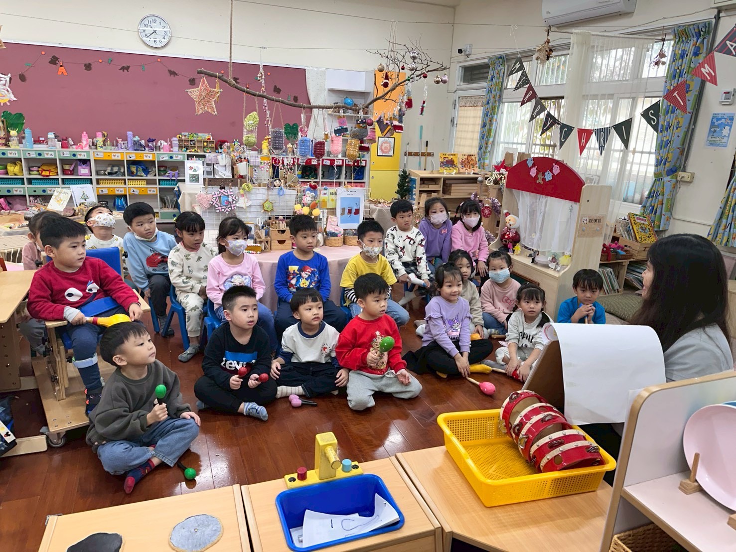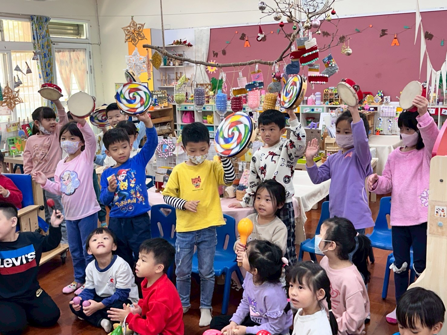12/23 今天繼續練習兩首報佳音的歌曲~<聖誕老公公的鈴鐺不見了>和<粉紅色的聖誕節>,大班的三角鐵、鈴鼓與中班的沙鈴,邊唱邊跳邊打節奏,大家的專注力都進步囉!