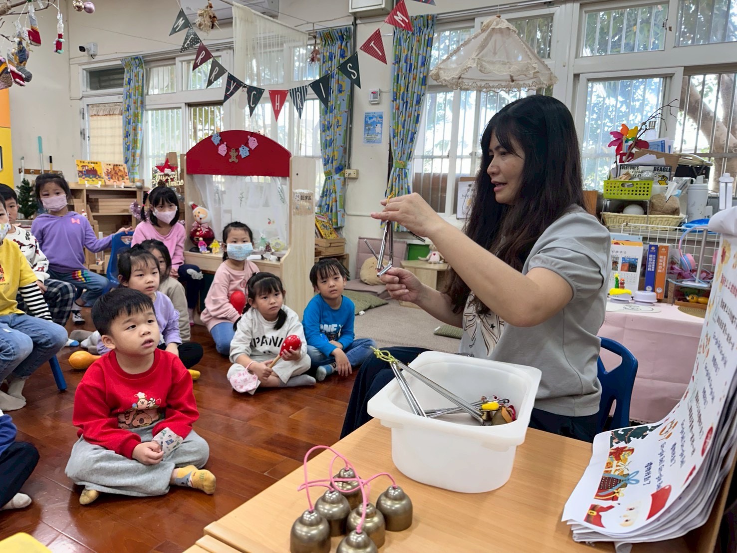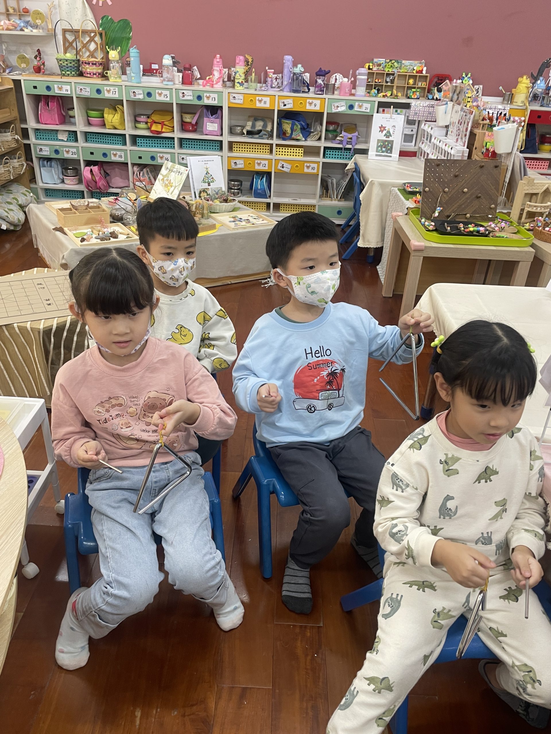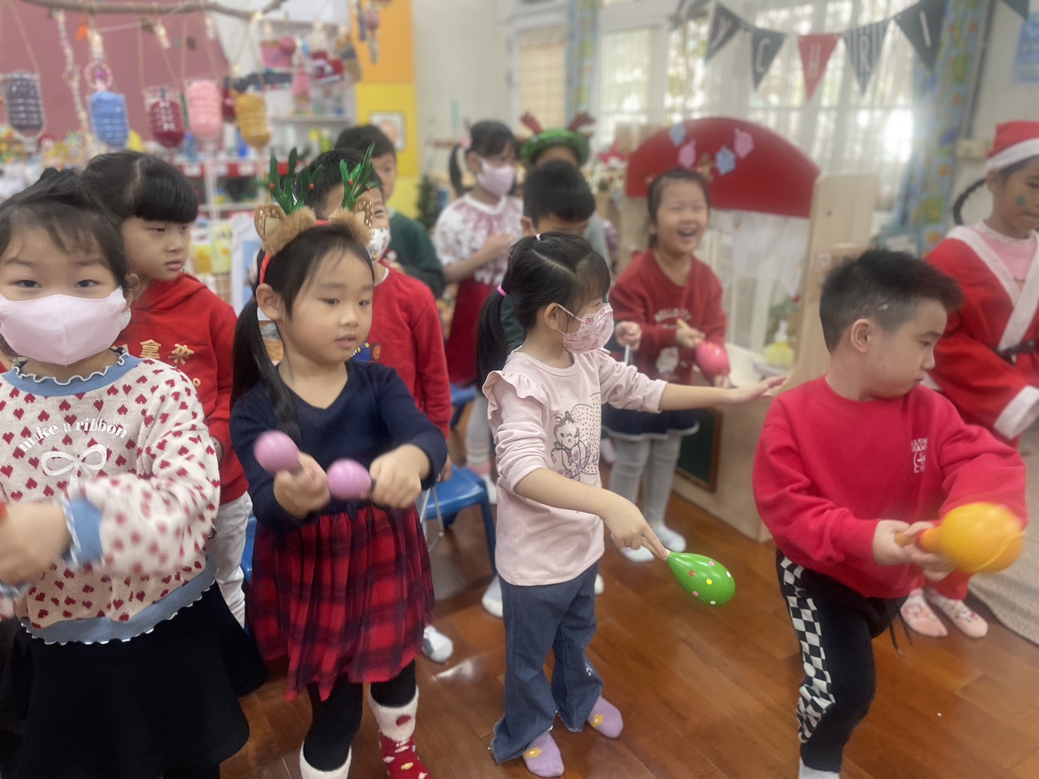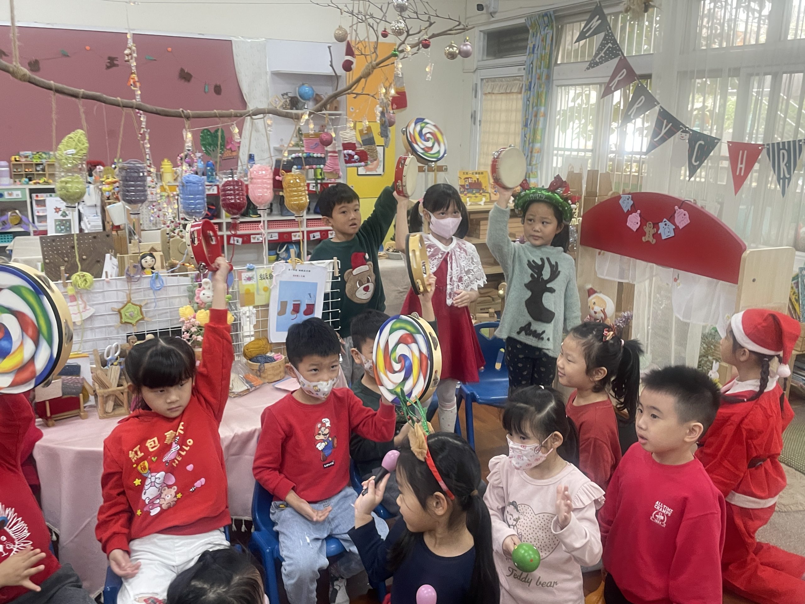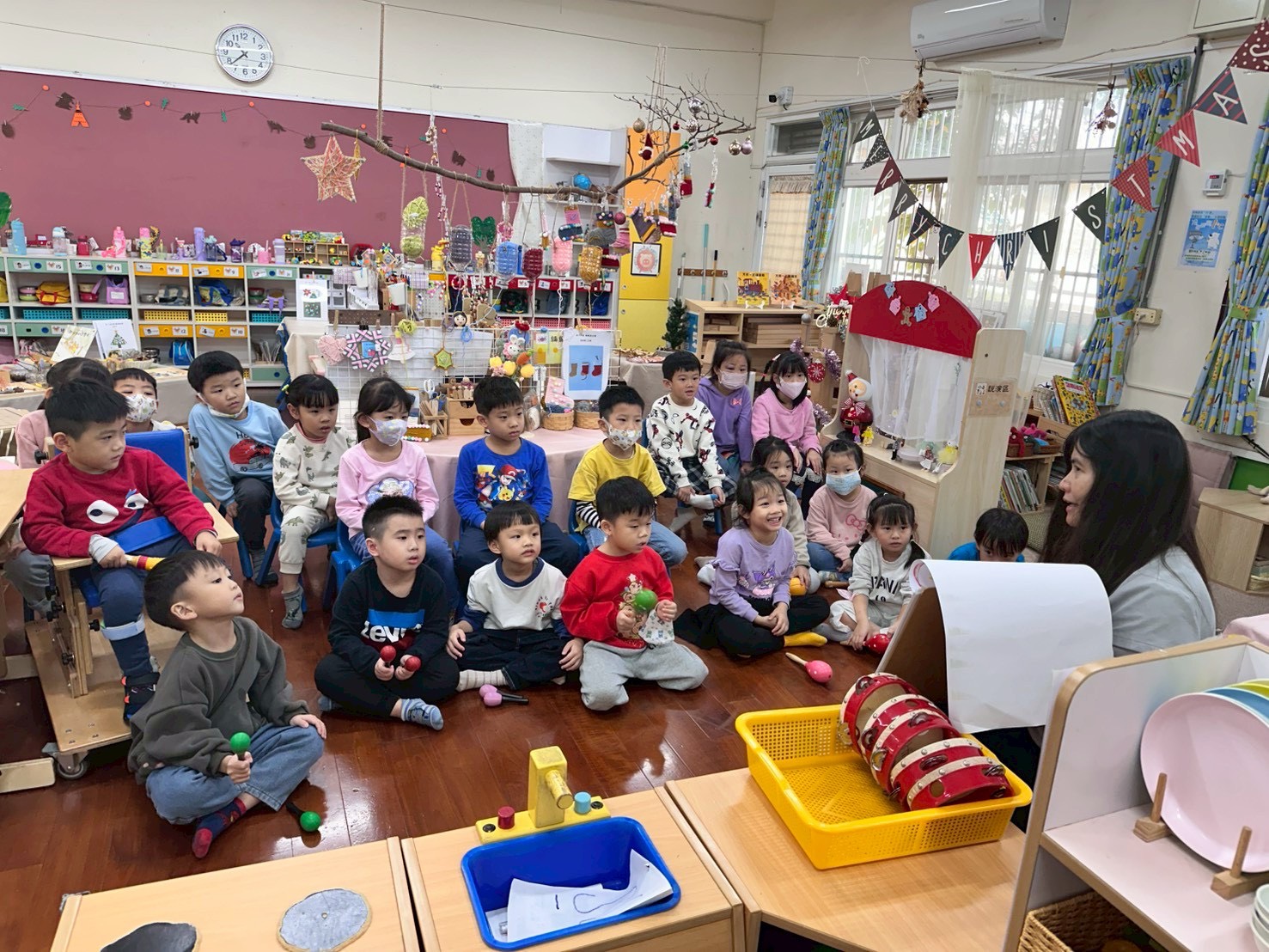 12/23 今天繼續練習兩首報佳音的歌曲~<聖誕老公公的鈴鐺不見了>和<粉紅色的聖誕節>,大班的三角鐵、鈴鼓與中班的沙鈴,邊唱邊跳邊打節奏,大家的專注力都進步囉!