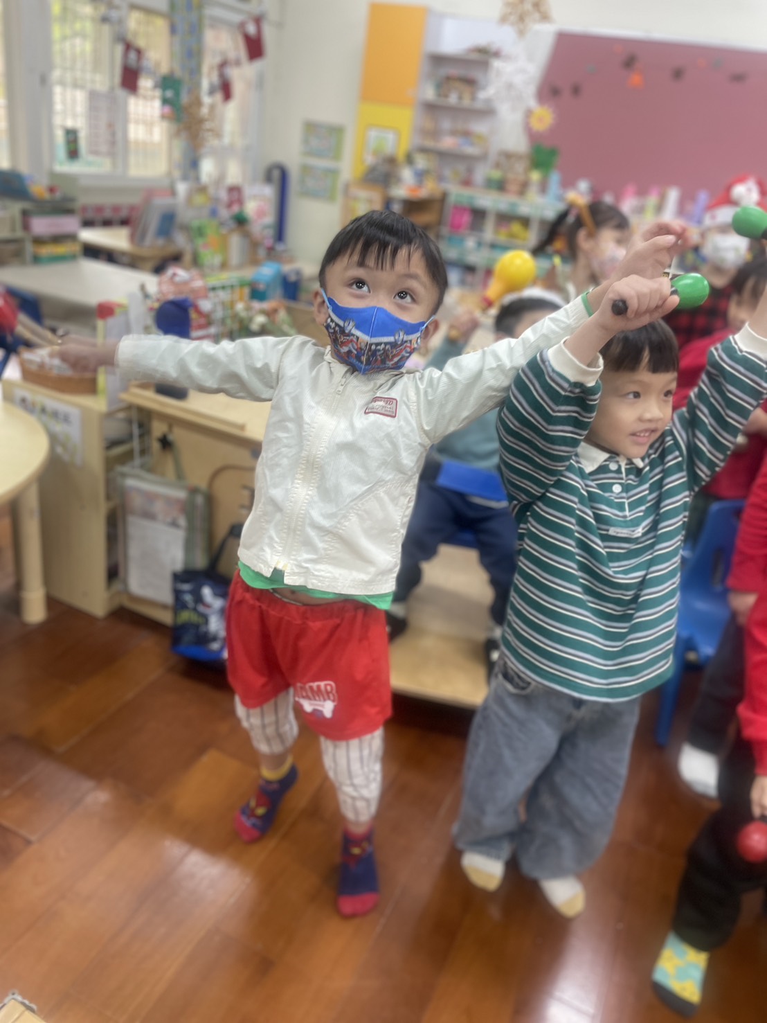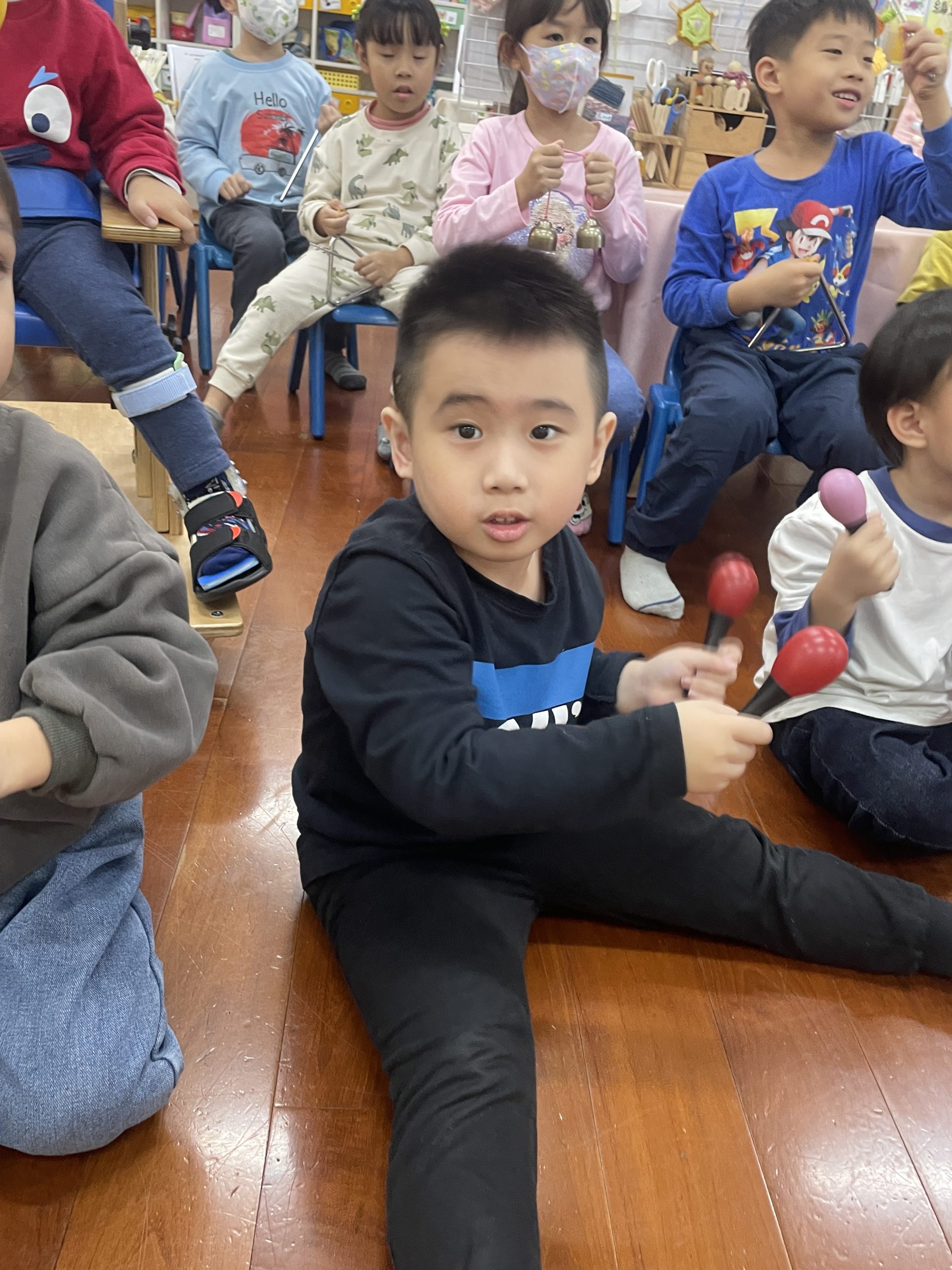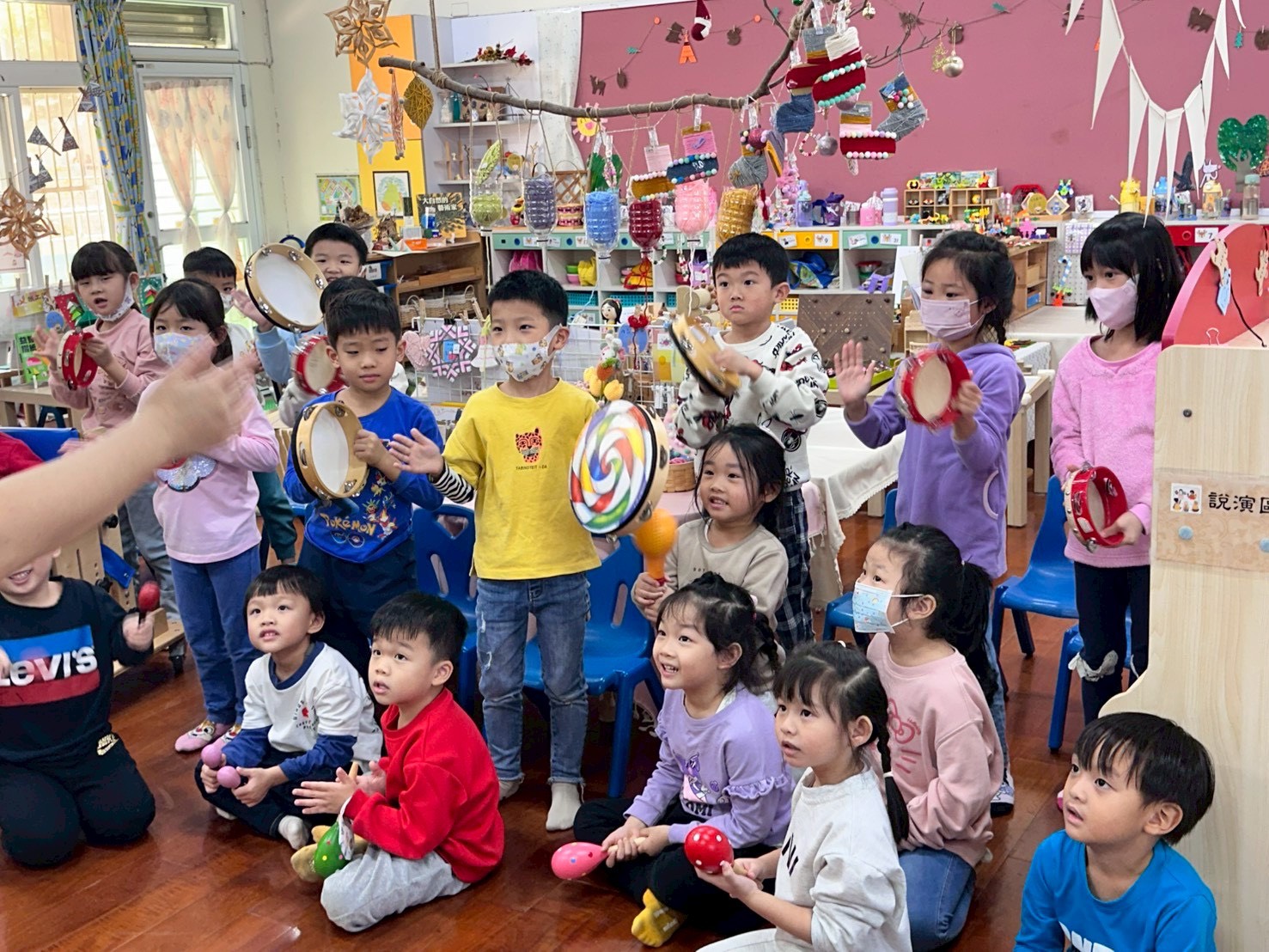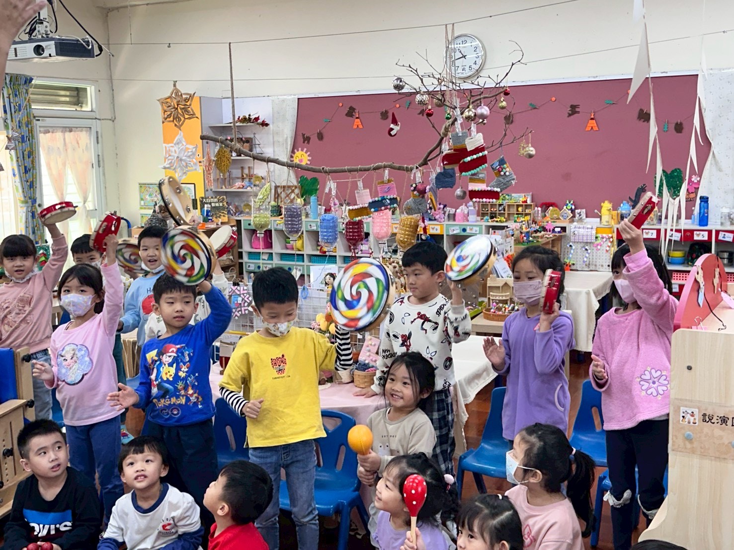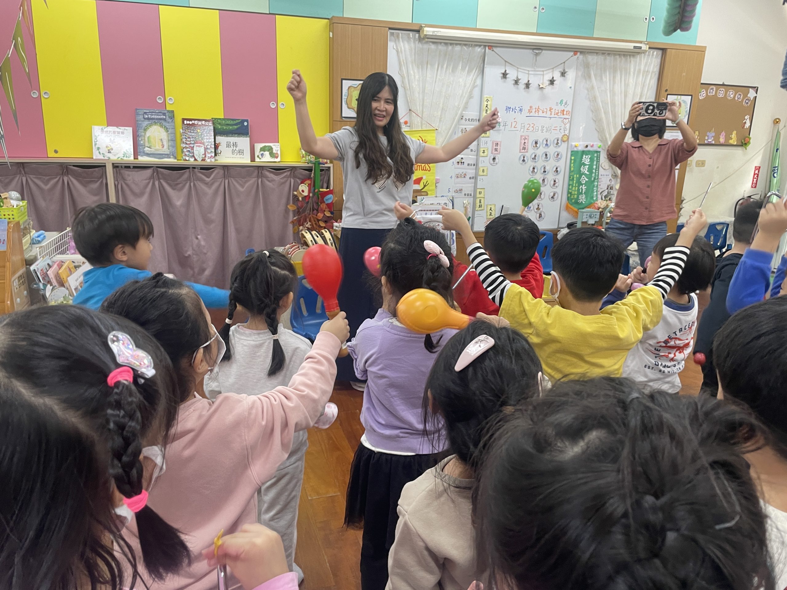 12/23 今天繼續練習兩首報佳音的歌曲~<聖誕老公公的鈴鐺不見了>和<粉紅色的聖誕節>,大班的三角鐵、鈴鼓與中班的沙鈴,邊唱邊跳邊打節奏,大家的專注力都進步囉!