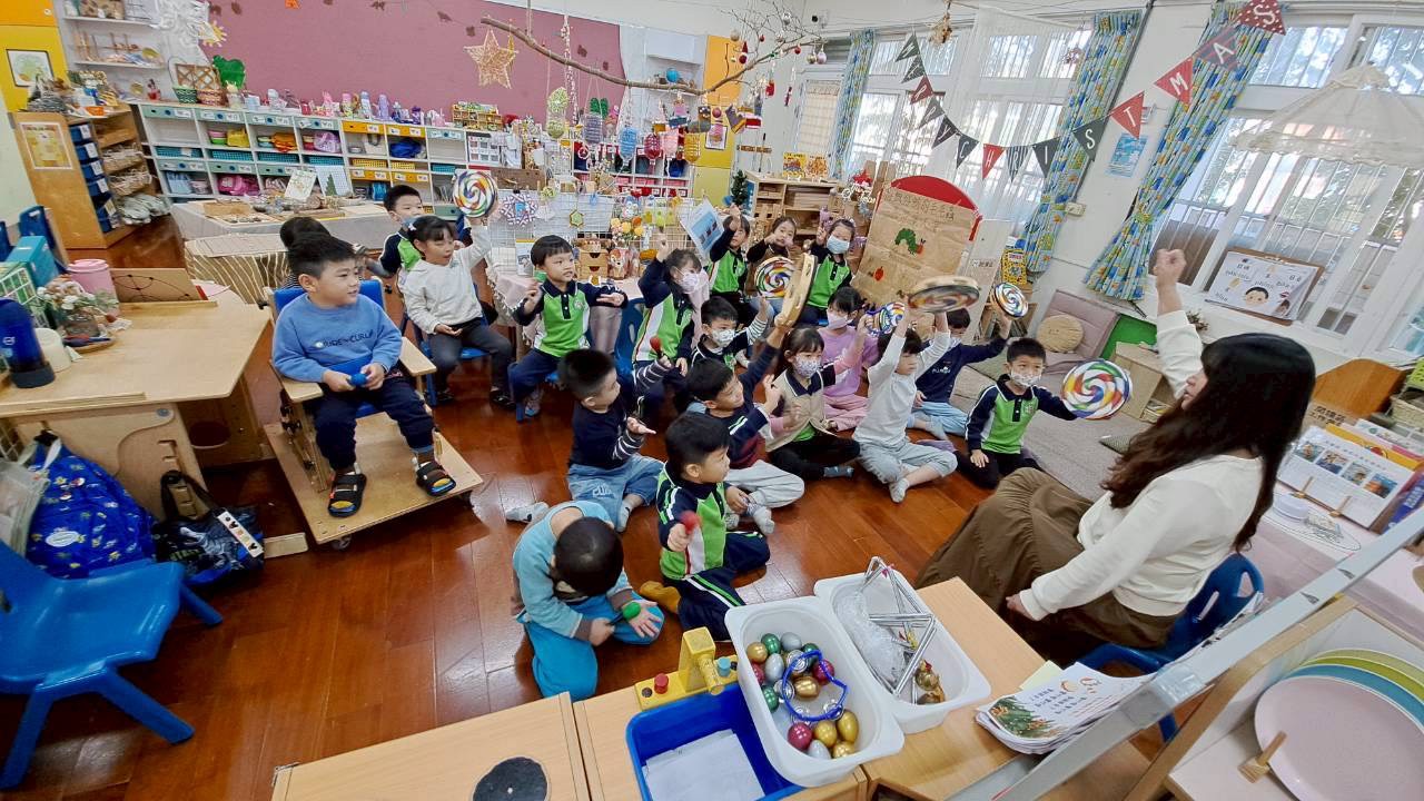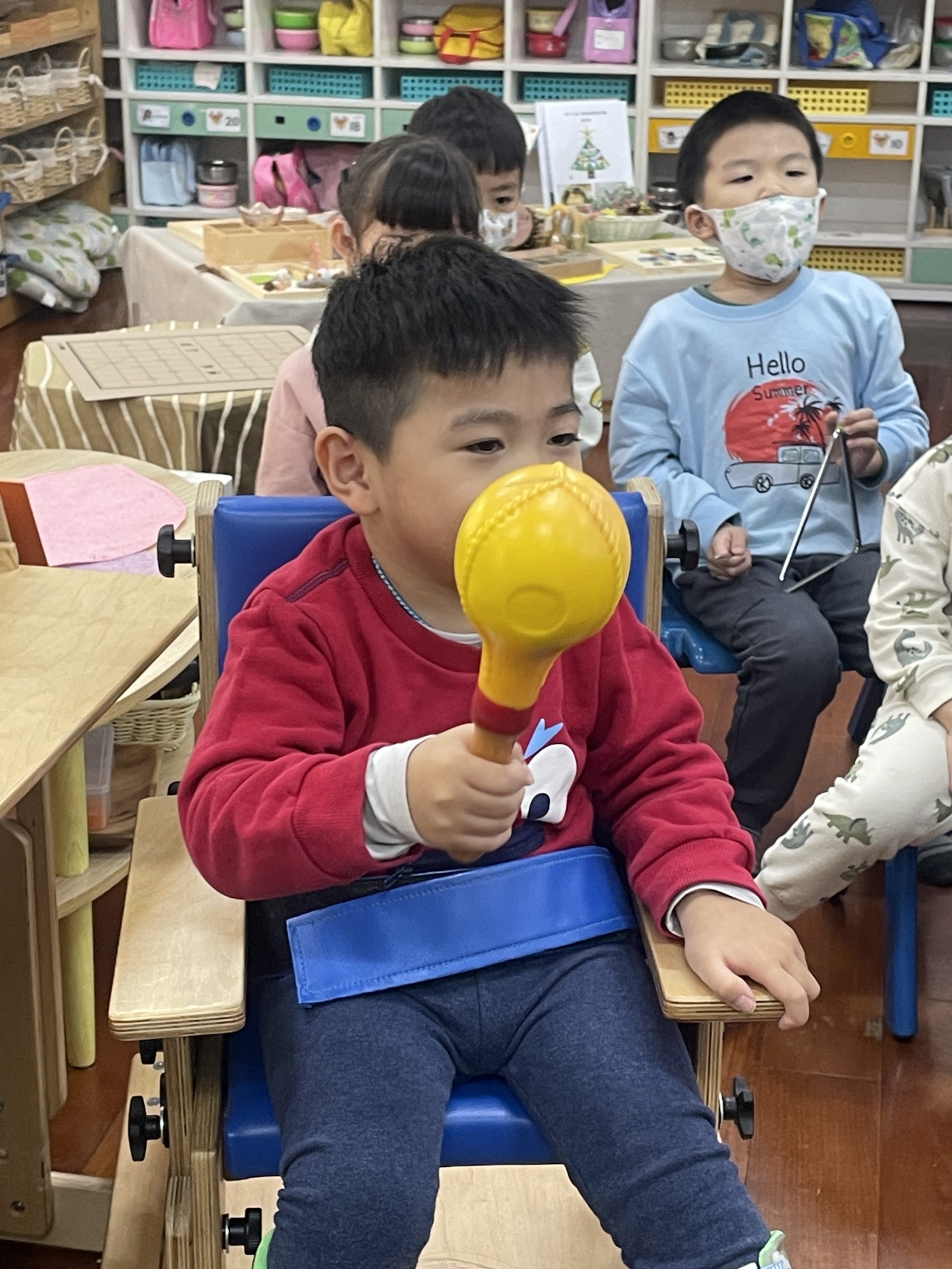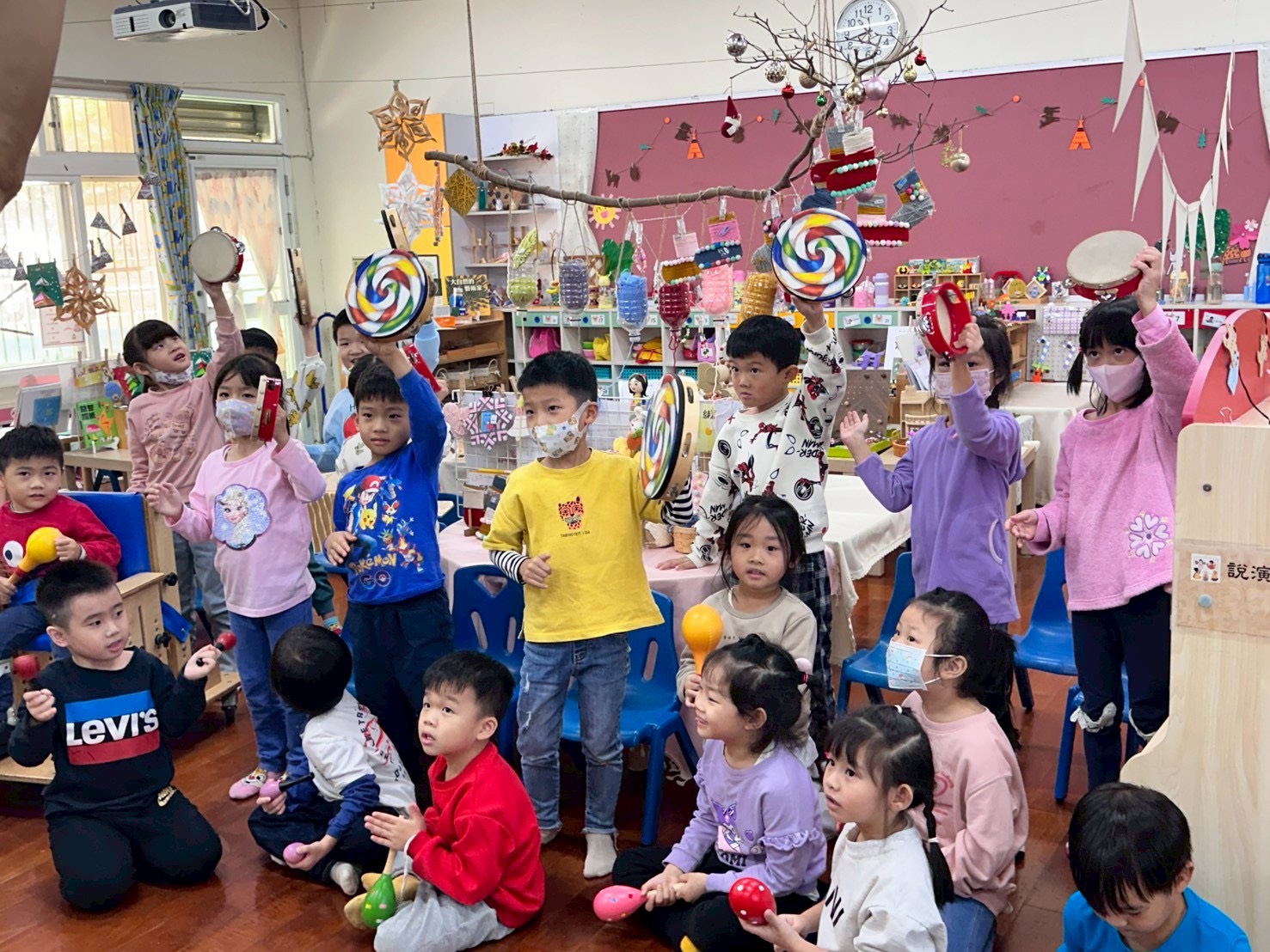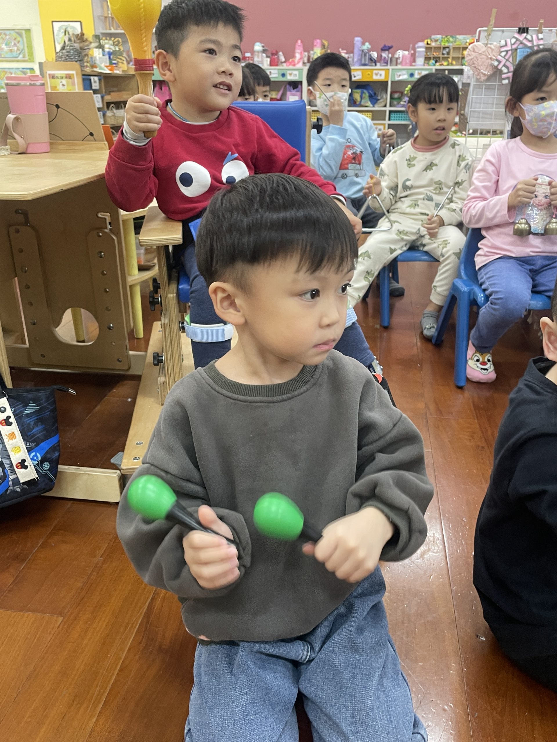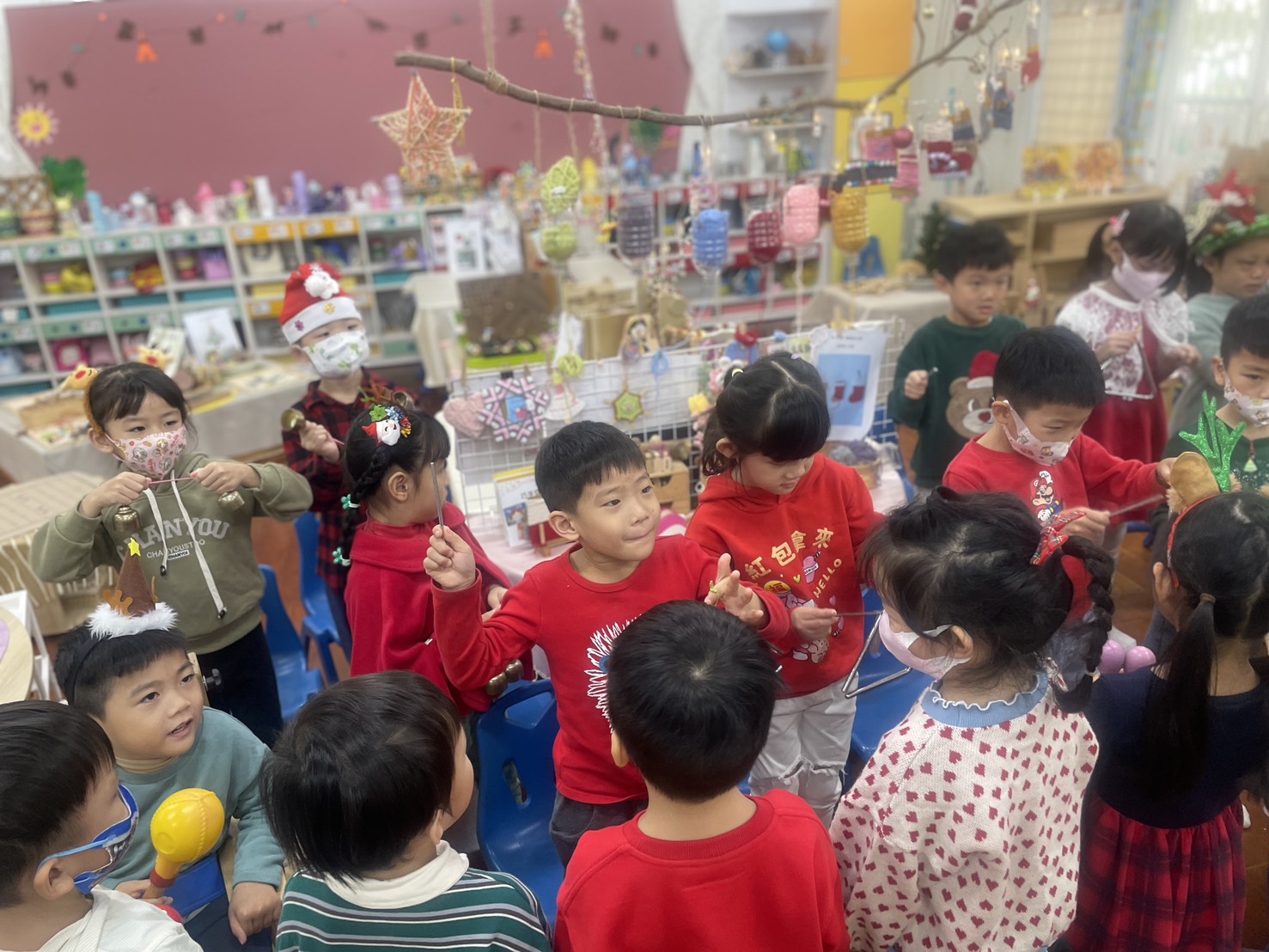 12/23 今天繼續練習兩首報佳音的歌曲~<聖誕老公公的鈴鐺不見了>和<粉紅色的聖誕節>,大班的三角鐵、鈴鼓與中班的沙鈴,邊唱邊跳邊打節奏,大家的專注力都進步囉!