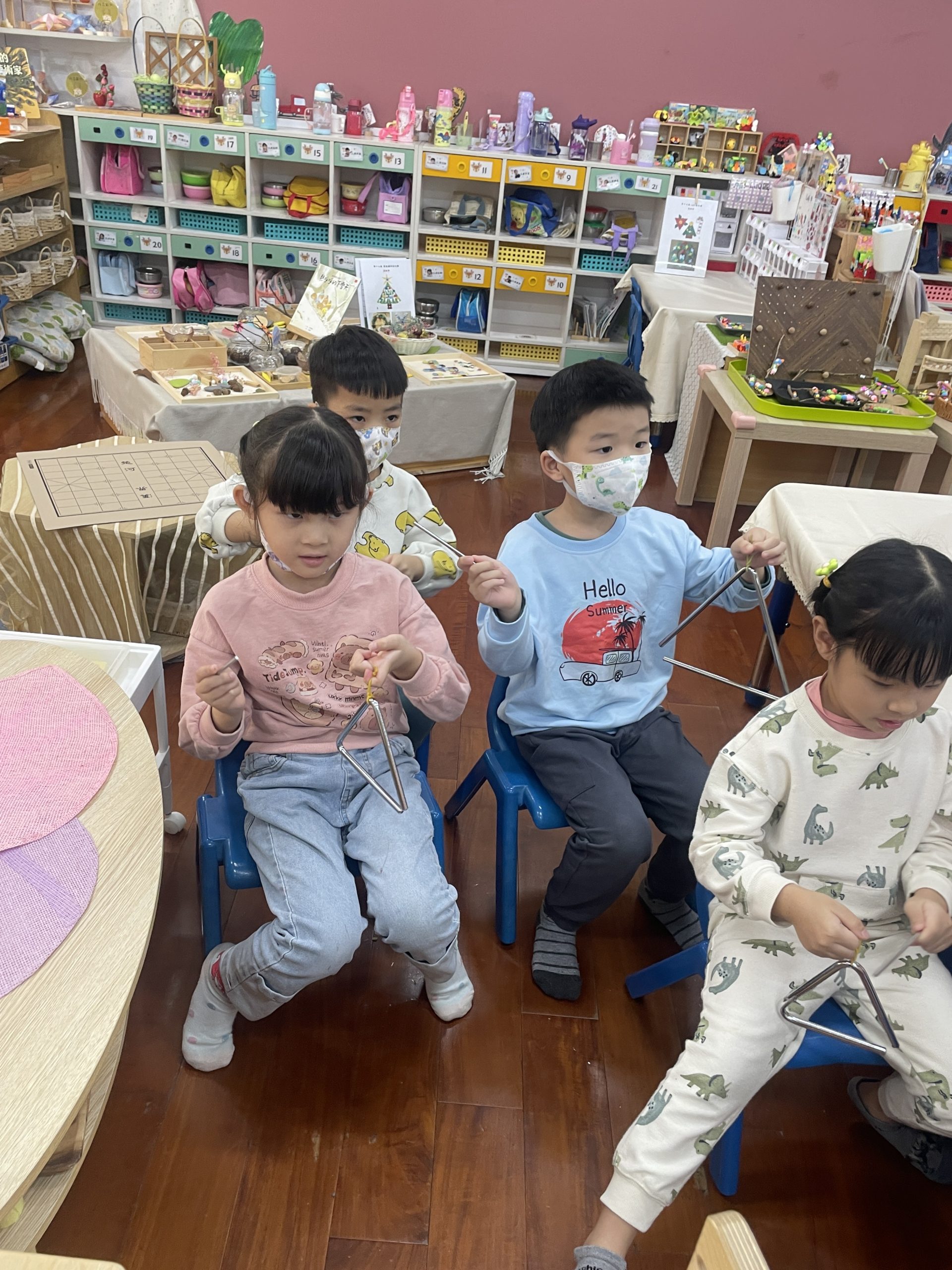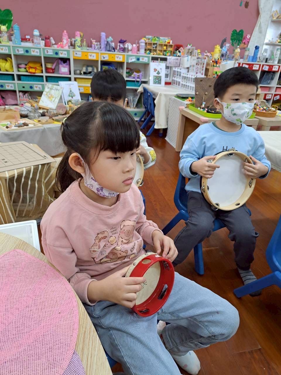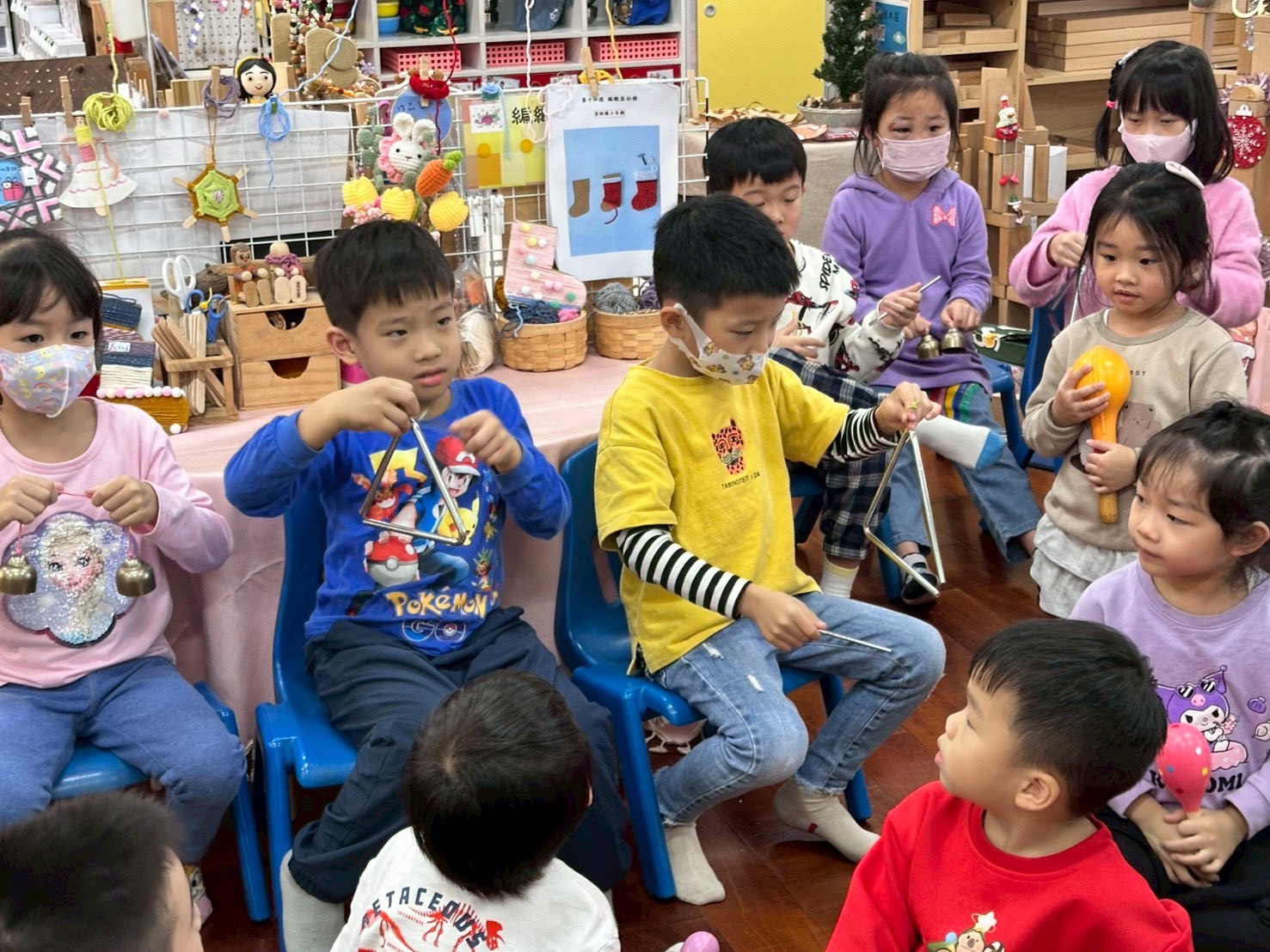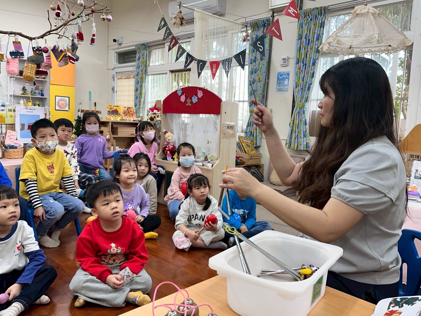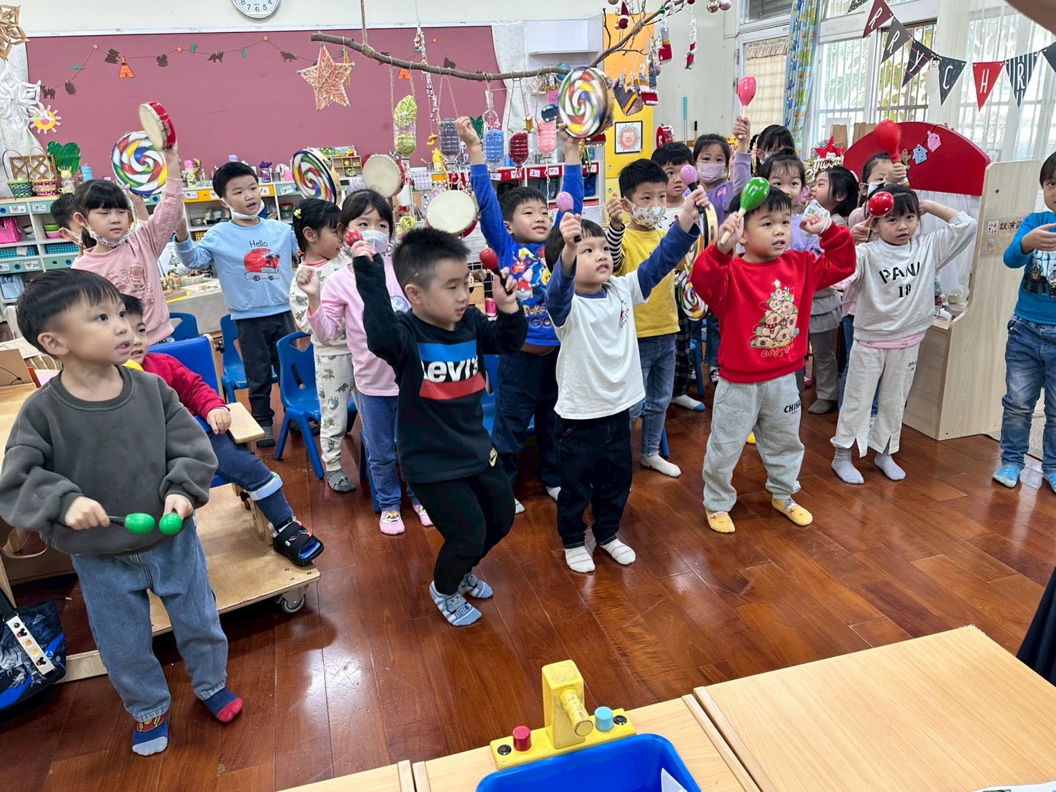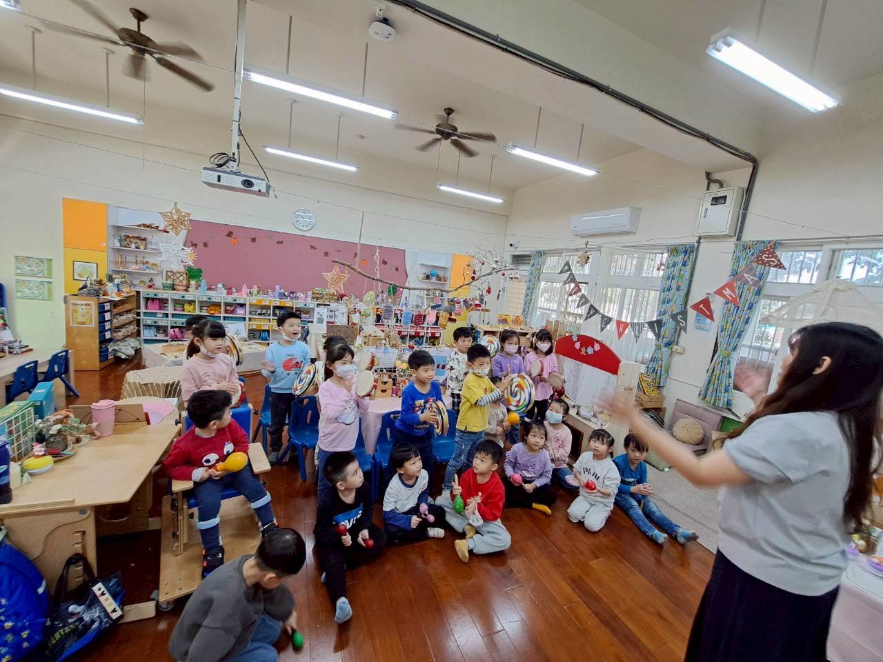 12/23 今天繼續練習兩首報佳音的歌曲~<聖誕老公公的鈴鐺不見了>和<粉紅色的聖誕節>,大班的三角鐵、鈴鼓與中班的沙鈴,邊唱邊跳邊打節奏,大家的專注力都進步囉!