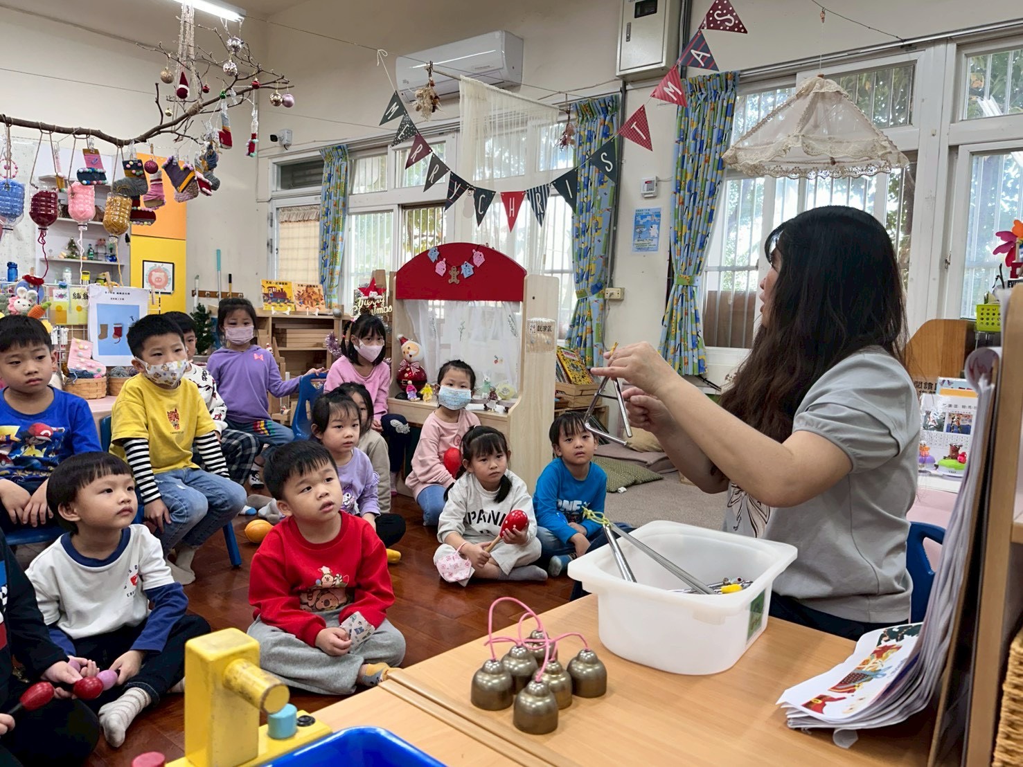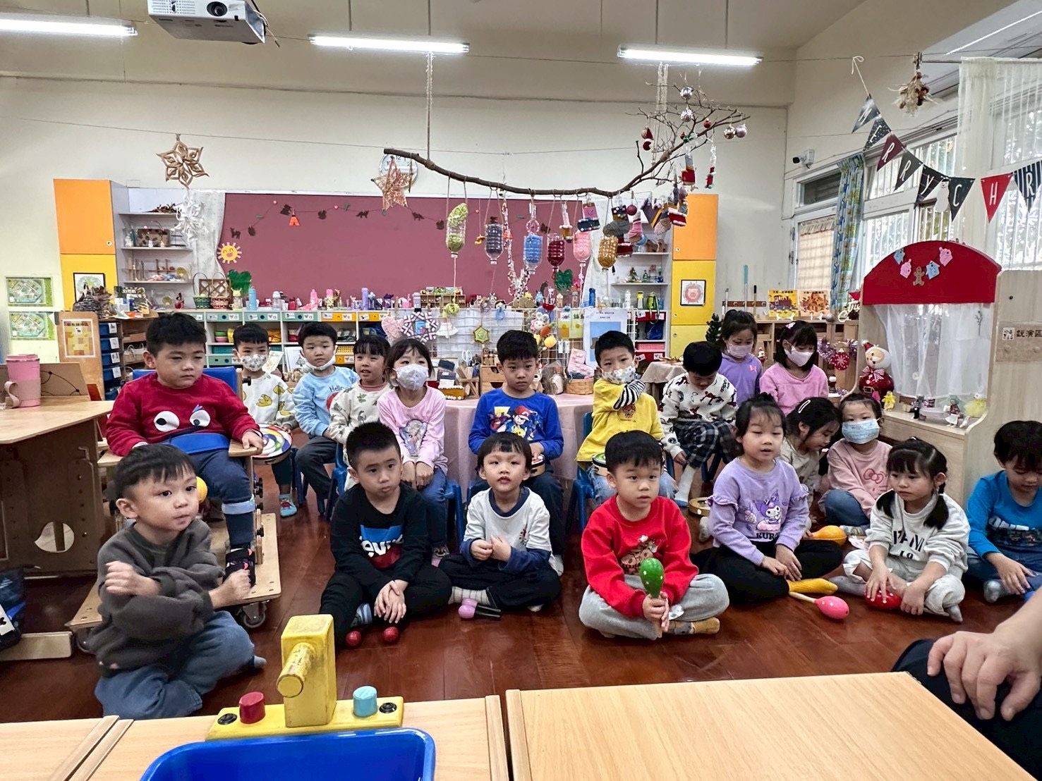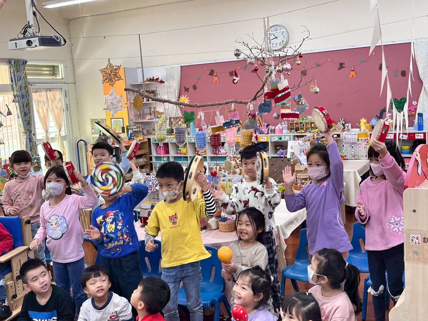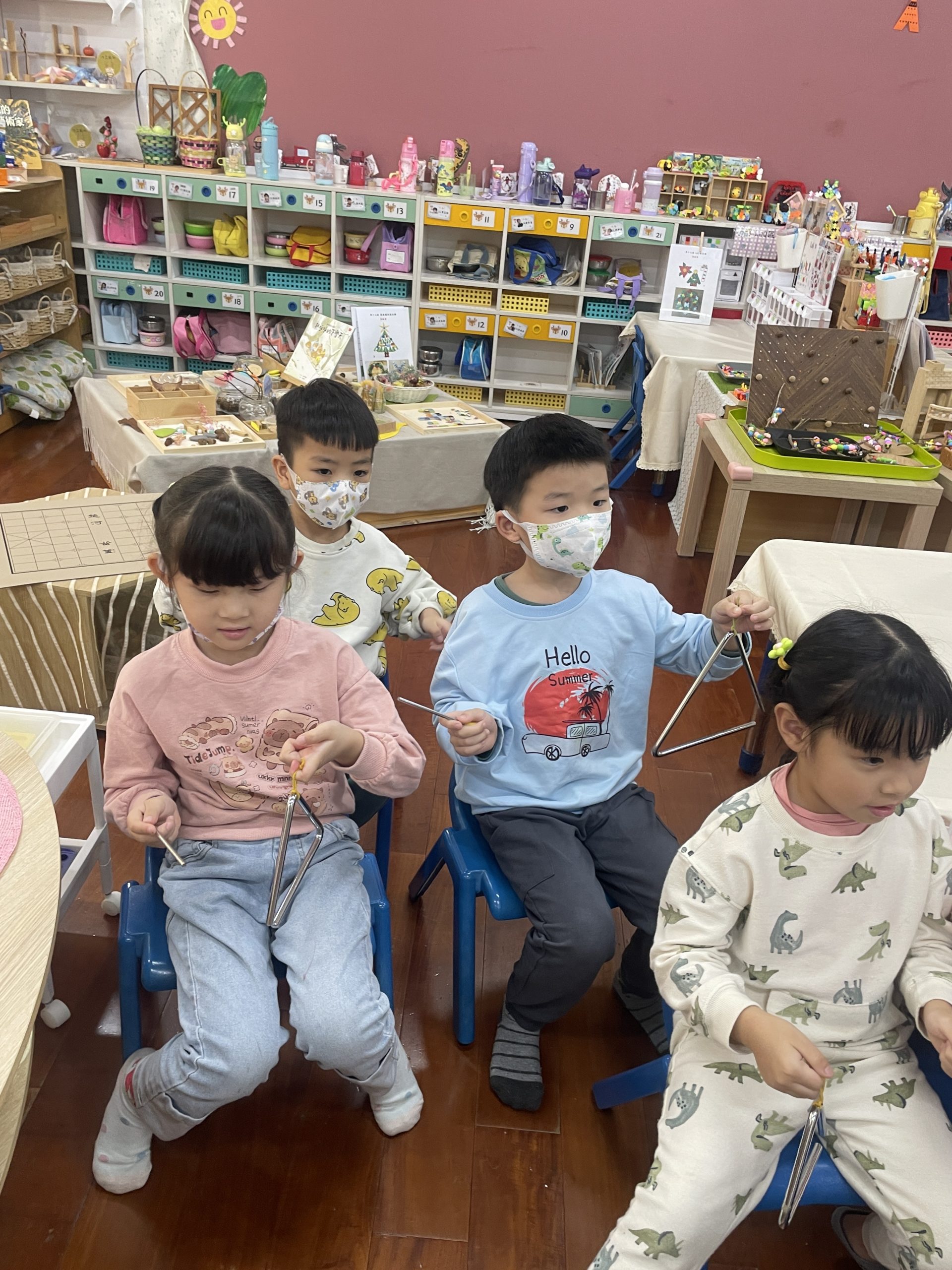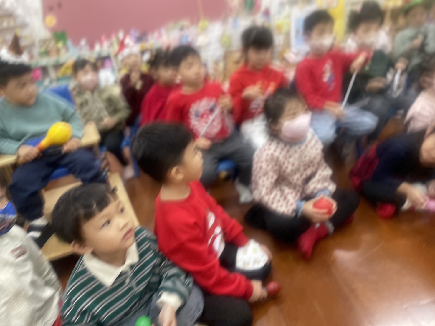 12/23 今天繼續練習兩首報佳音的歌曲~<聖誕老公公的鈴鐺不見了>和<粉紅色的聖誕節>,大班的三角鐵、鈴鼓與中班的沙鈴,邊唱邊跳邊打節奏,大家的專注力都進步囉!
