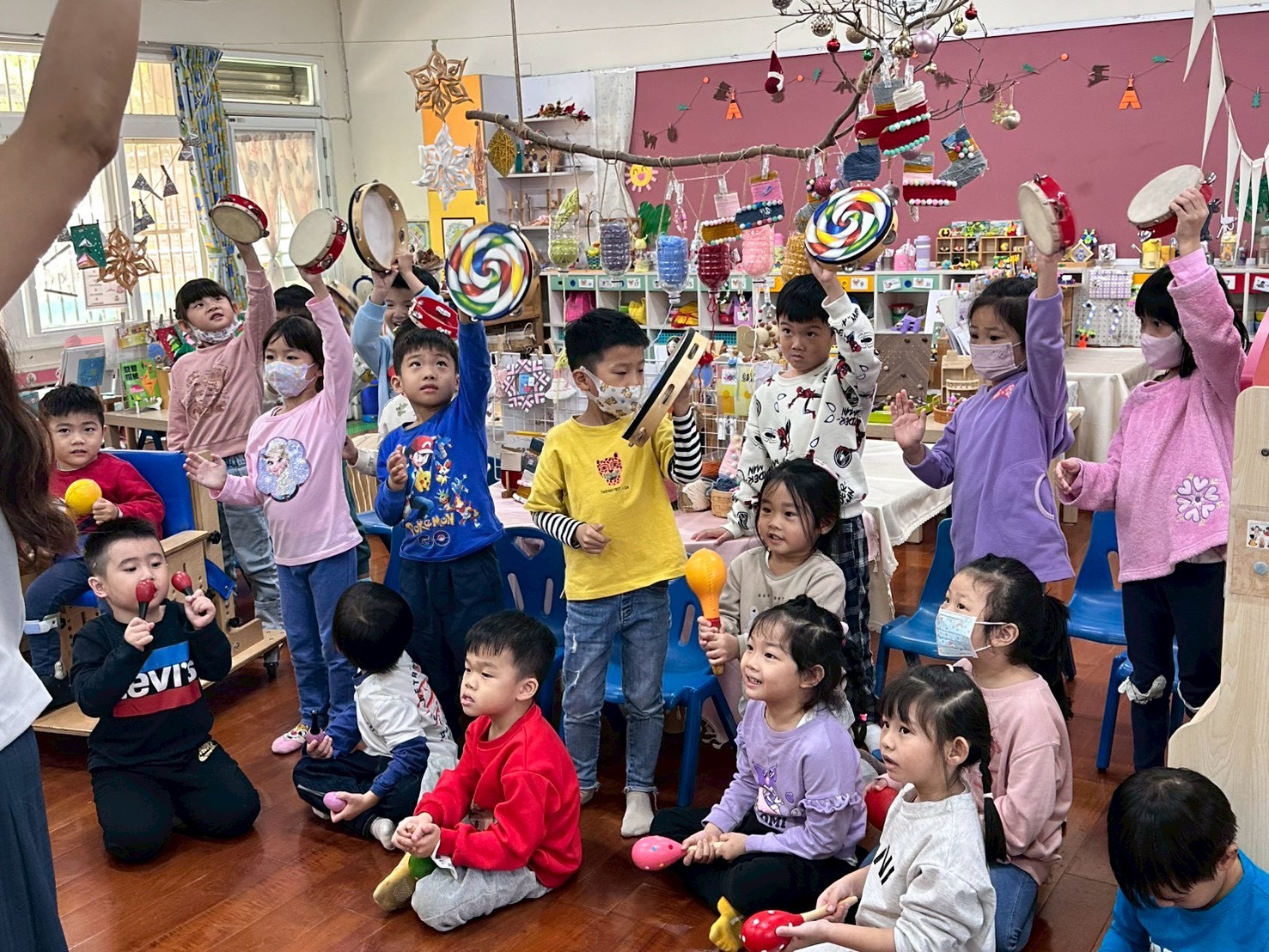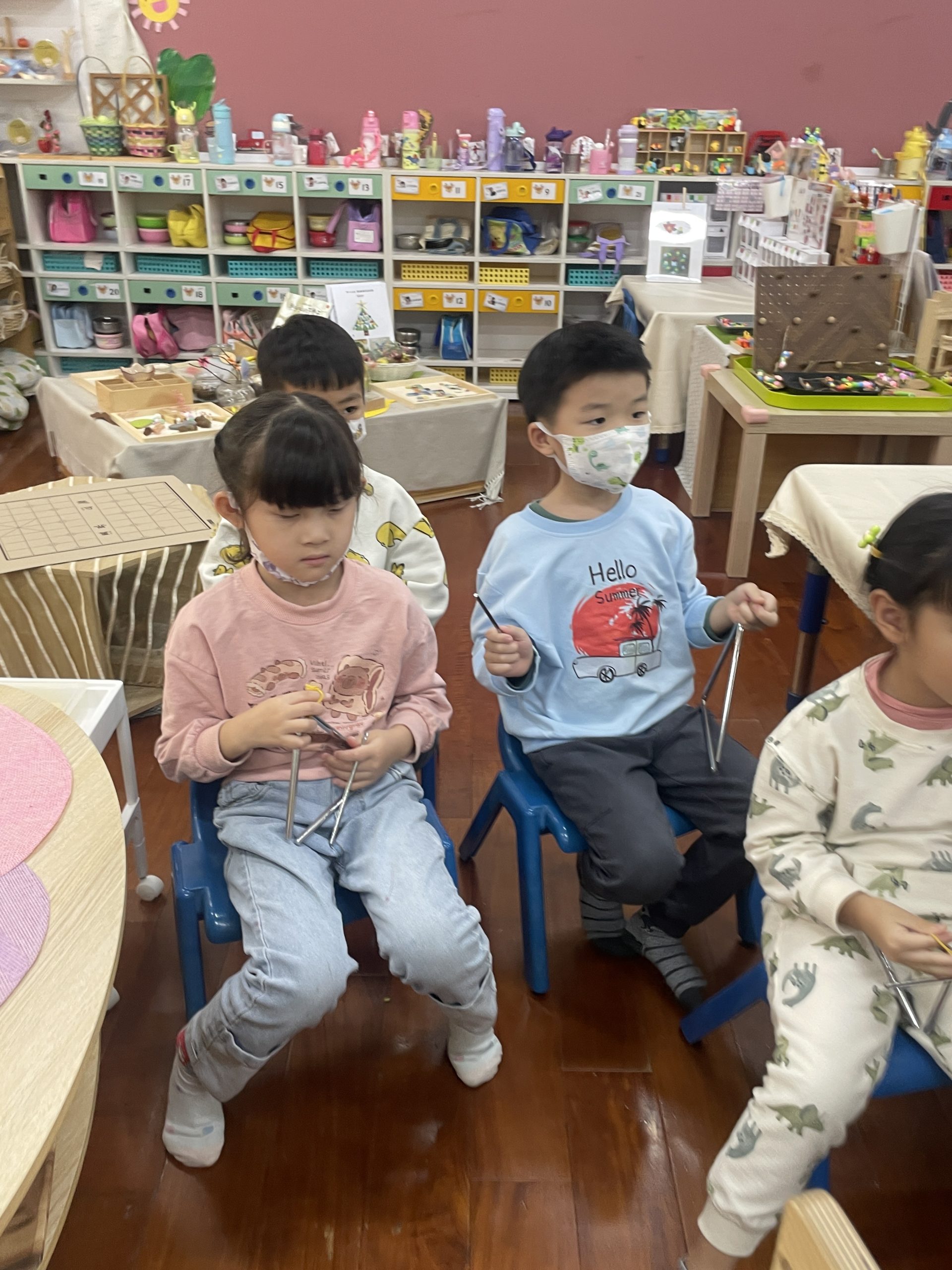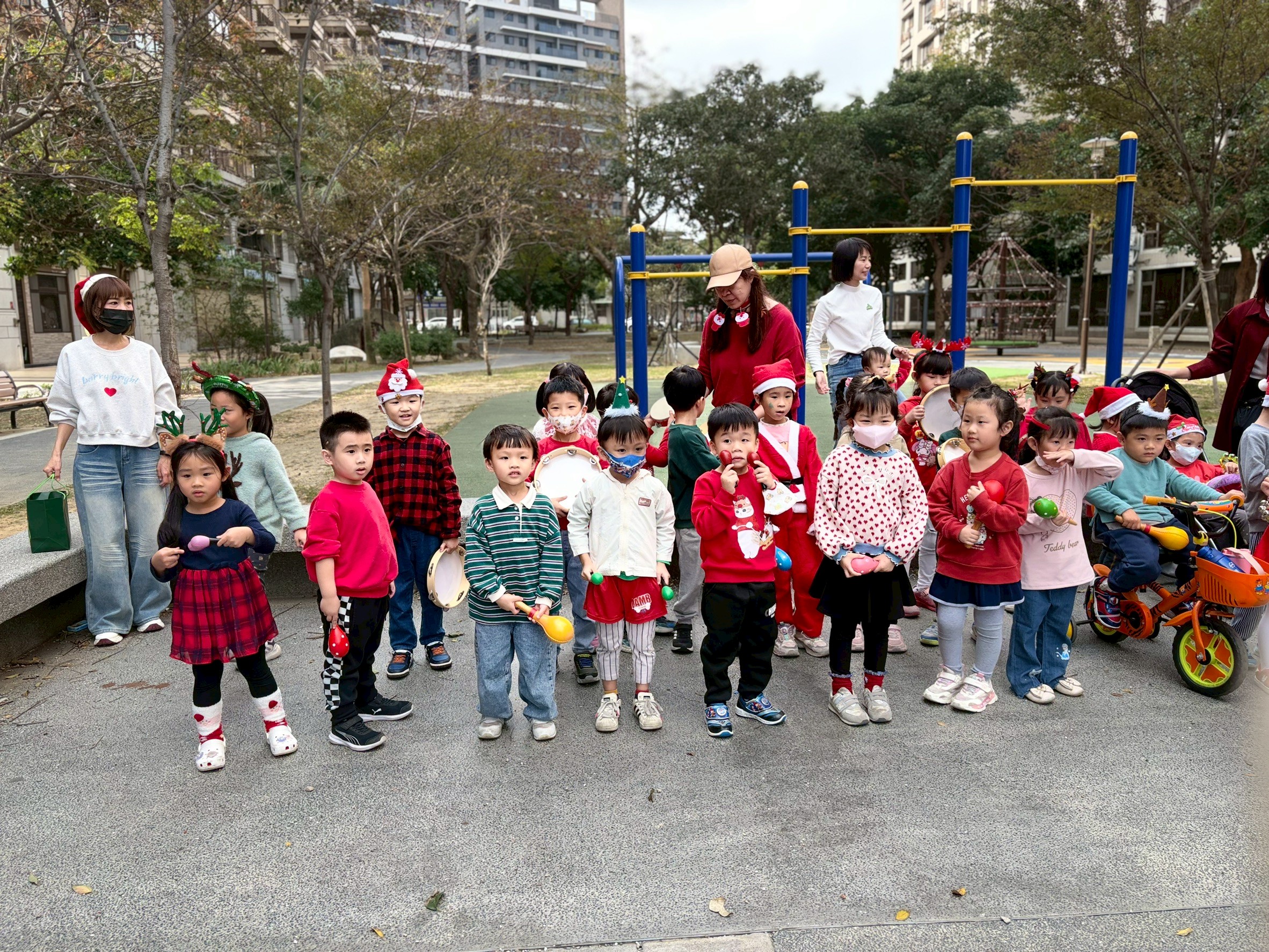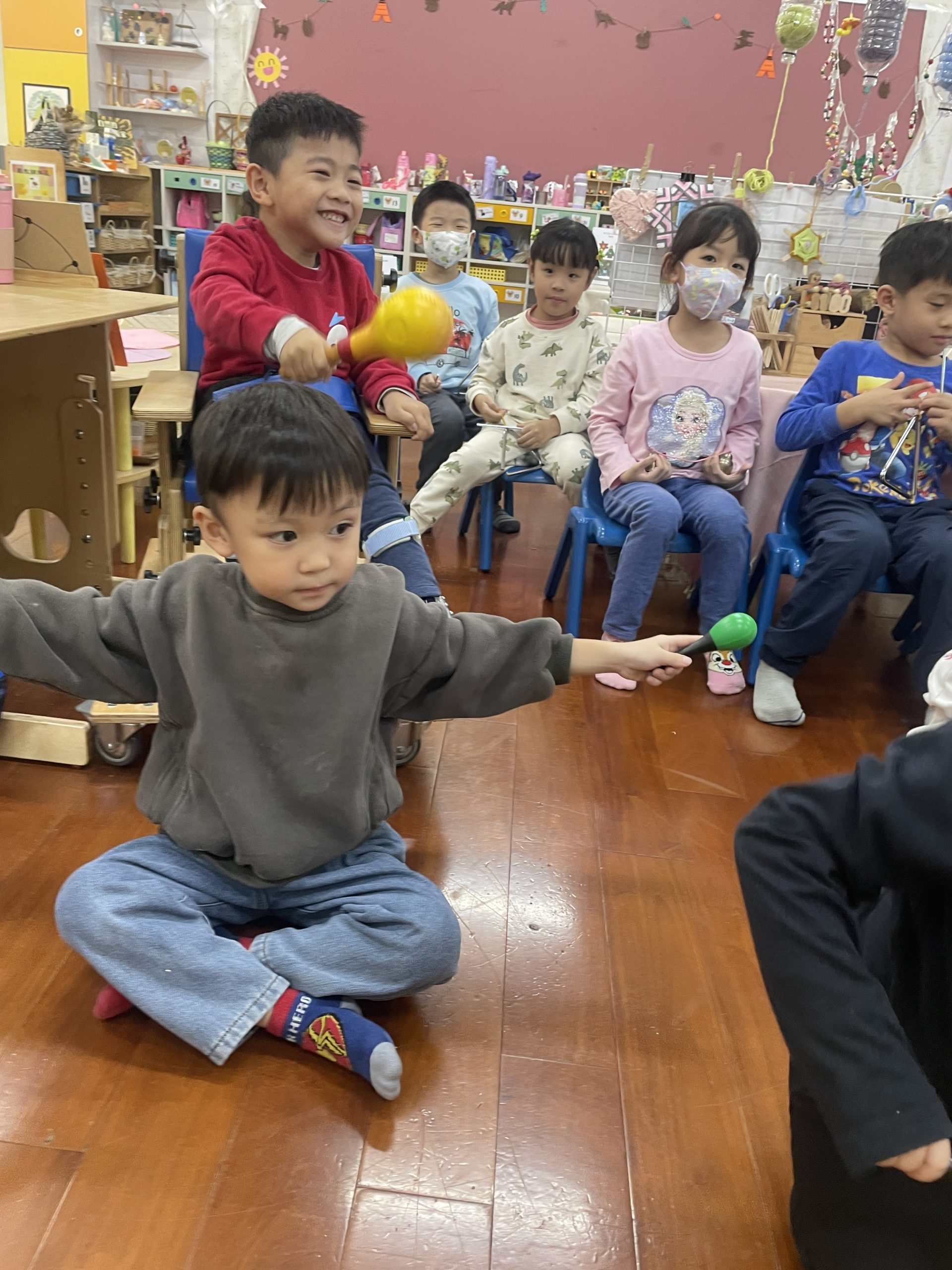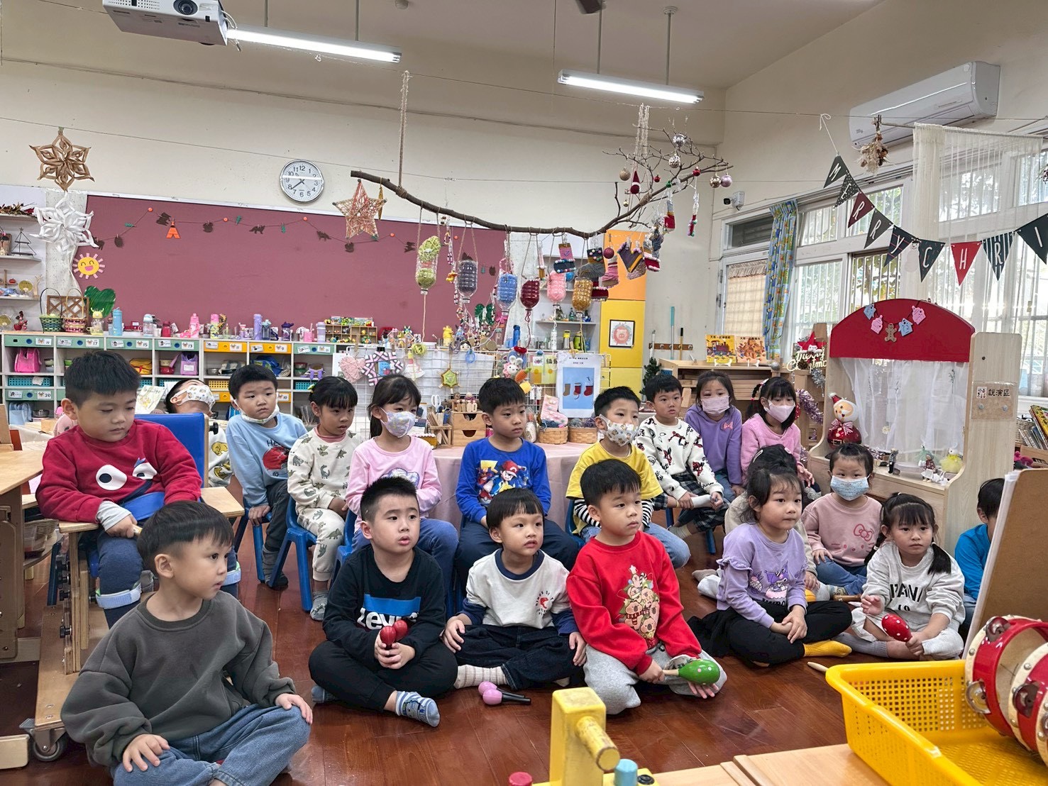 12/23 今天繼續練習兩首報佳音的歌曲~<聖誕老公公的鈴鐺不見了>和<粉紅色的聖誕節>,大班的三角鐵、鈴鼓與中班的沙鈴,邊唱邊跳邊打節奏,大家的專注力都進步囉!