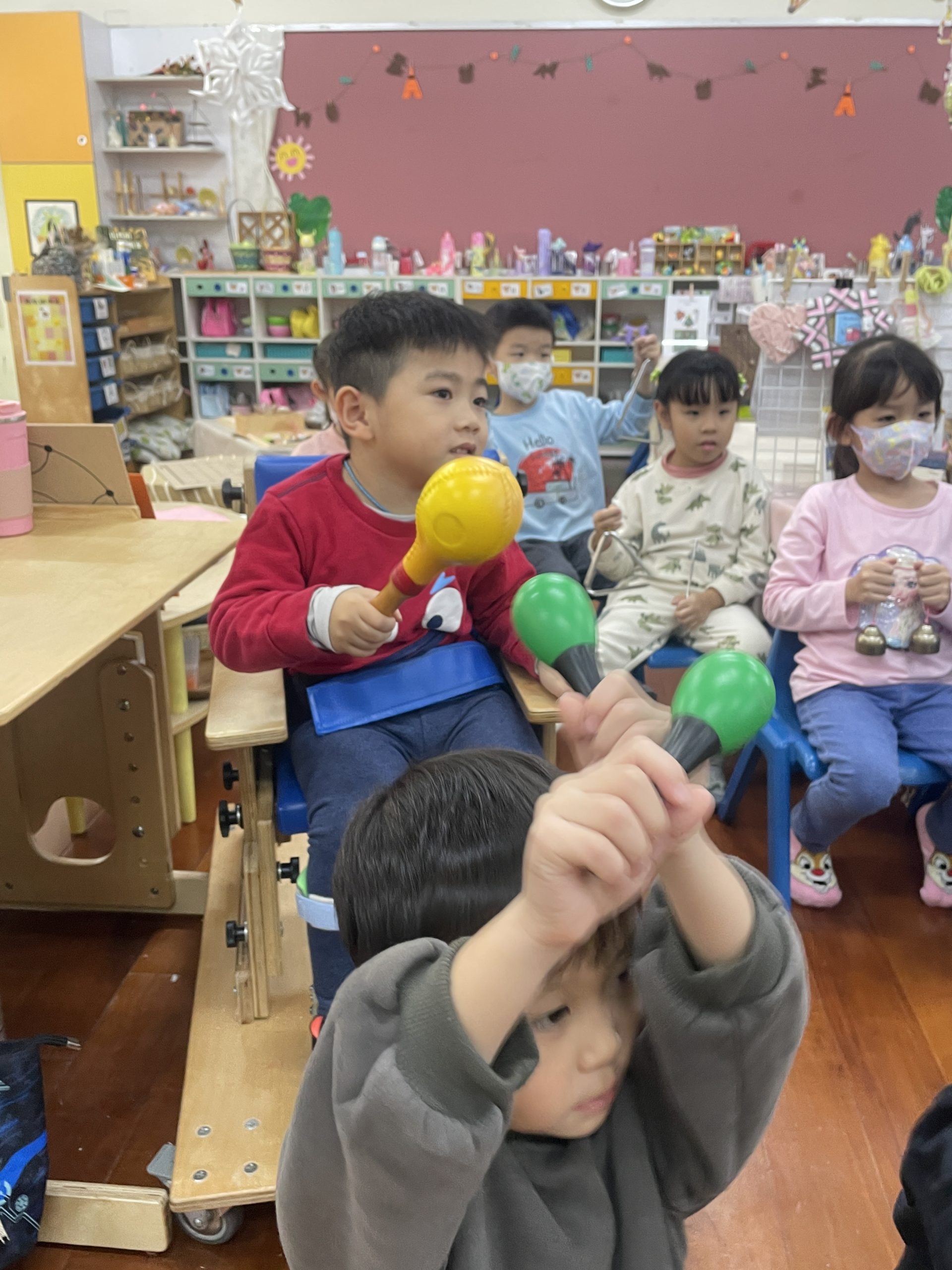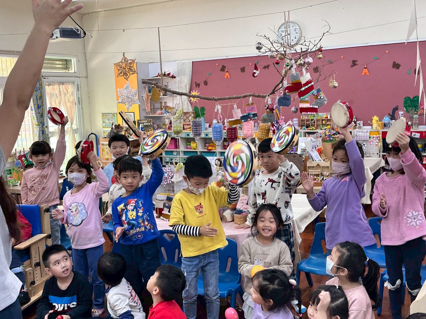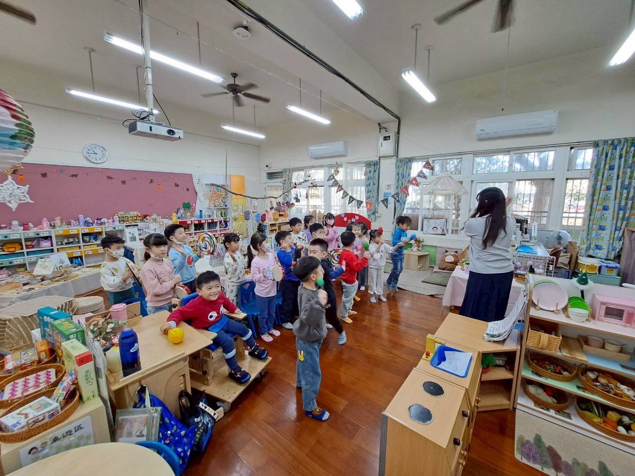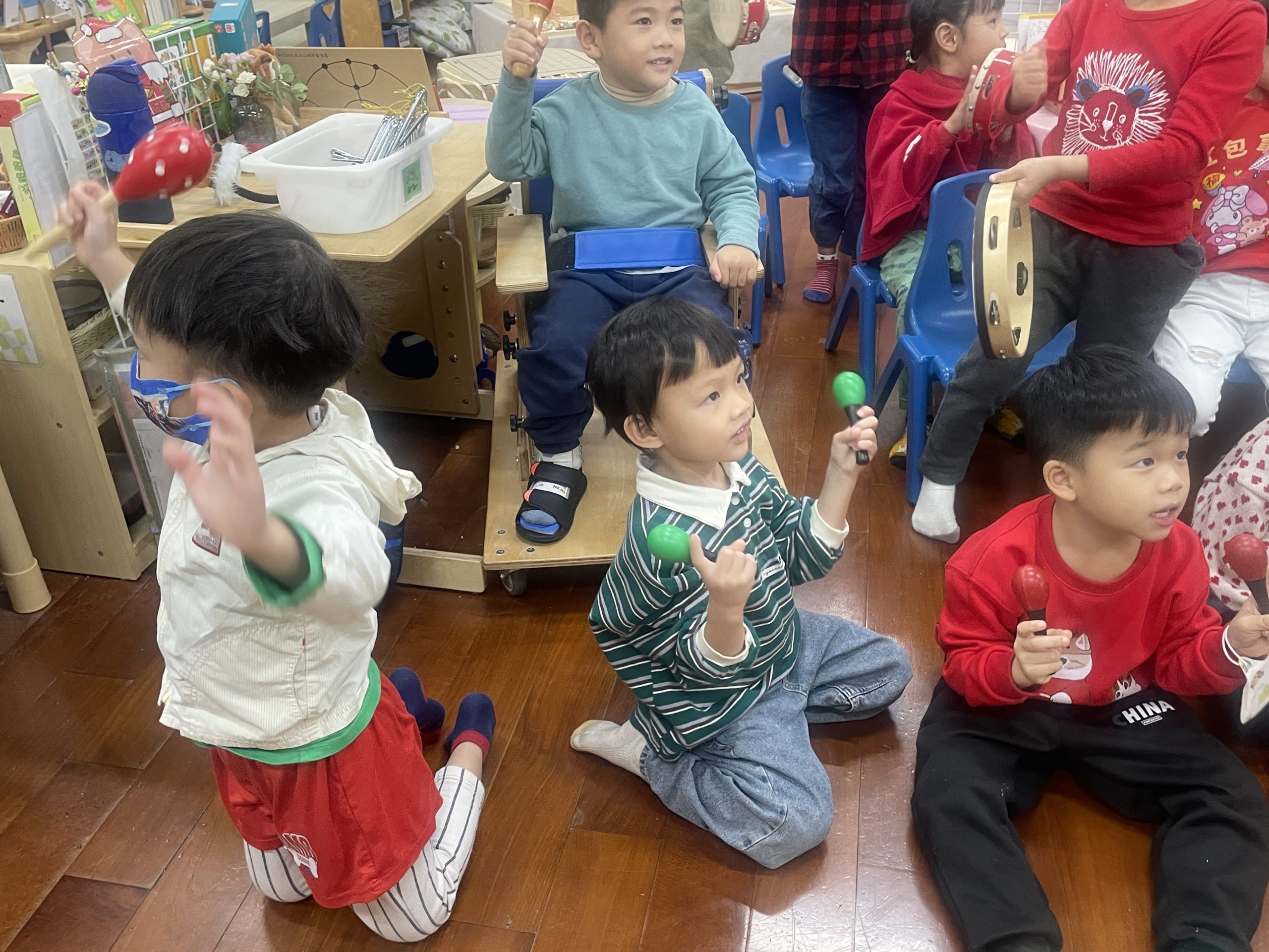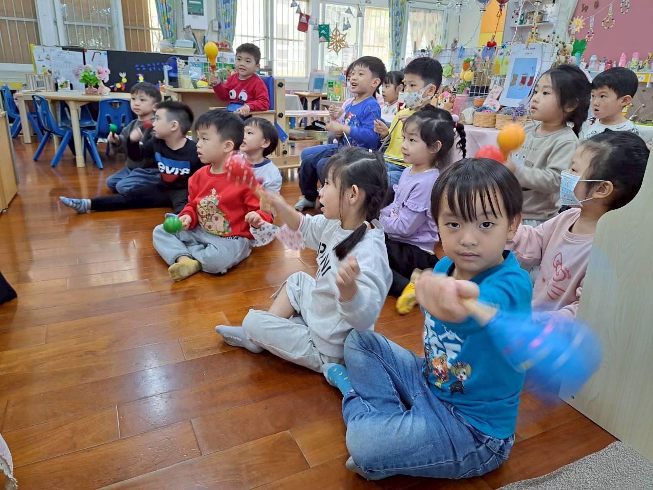 12/23 今天繼續練習兩首報佳音的歌曲~<聖誕老公公的鈴鐺不見了>和<粉紅色的聖誕節>,大班的三角鐵、鈴鼓與中班的沙鈴,邊唱邊跳邊打節奏,大家的專注力都進步囉!