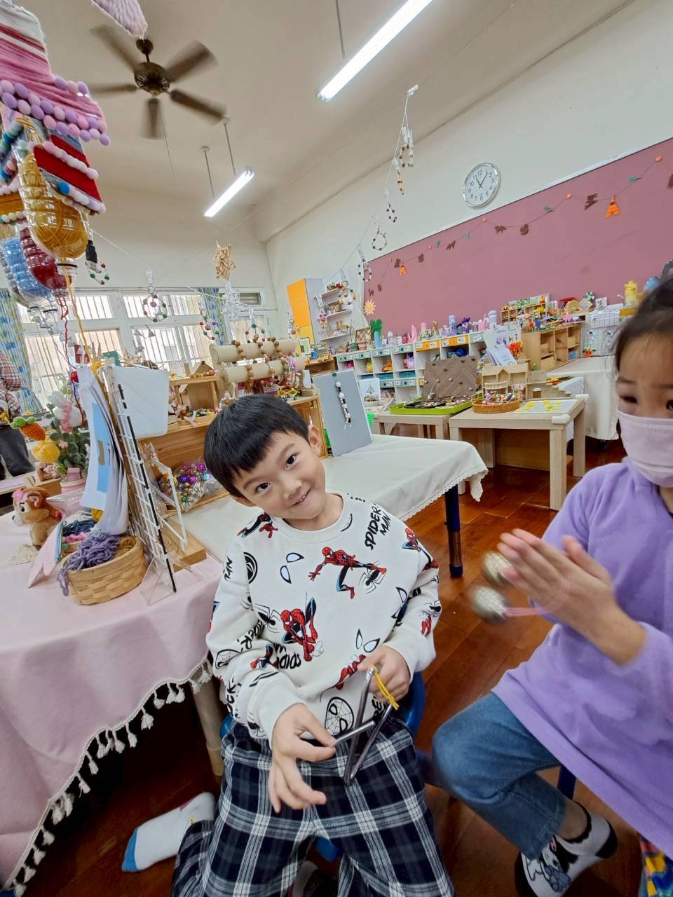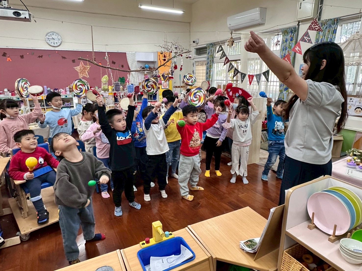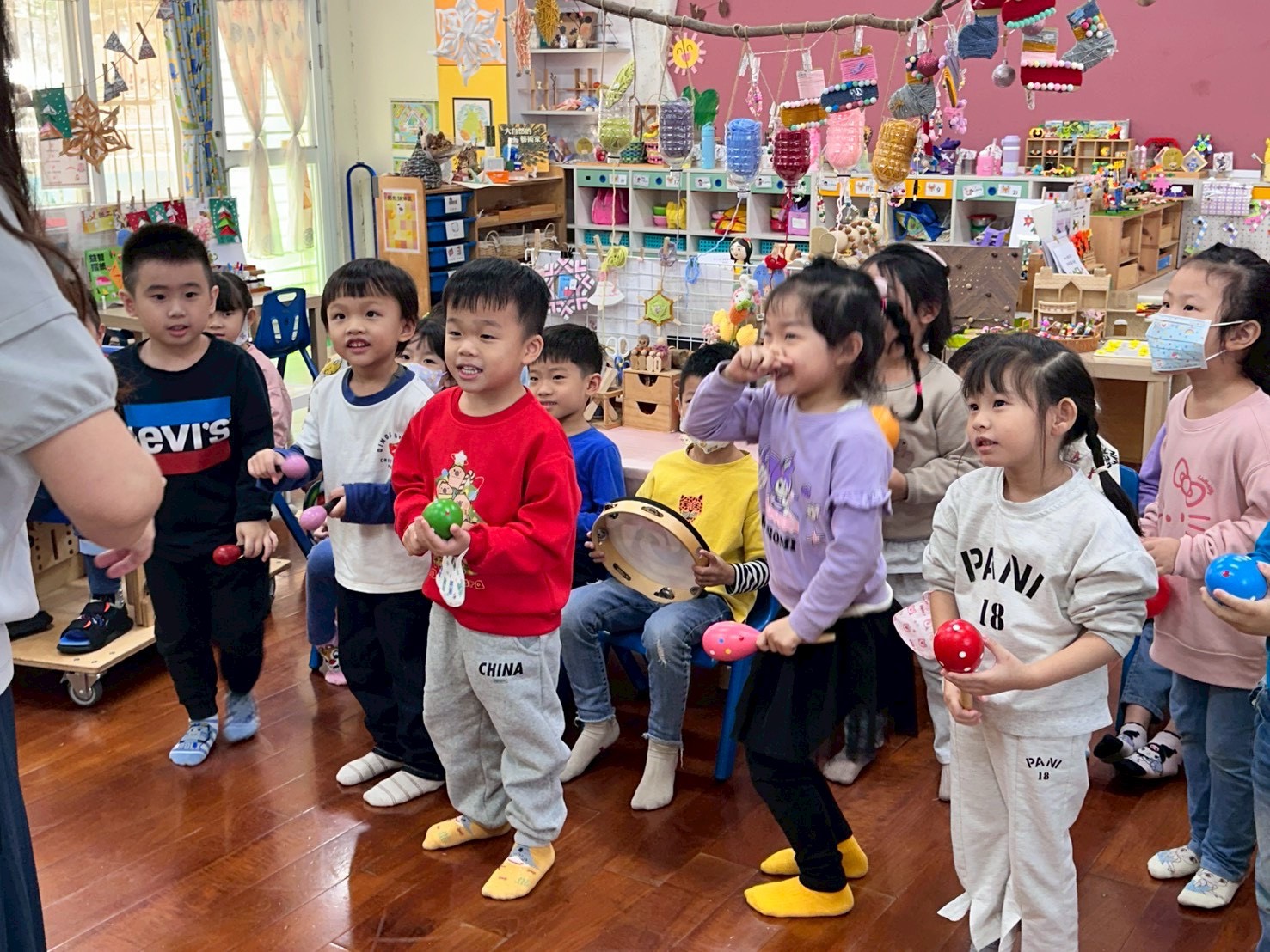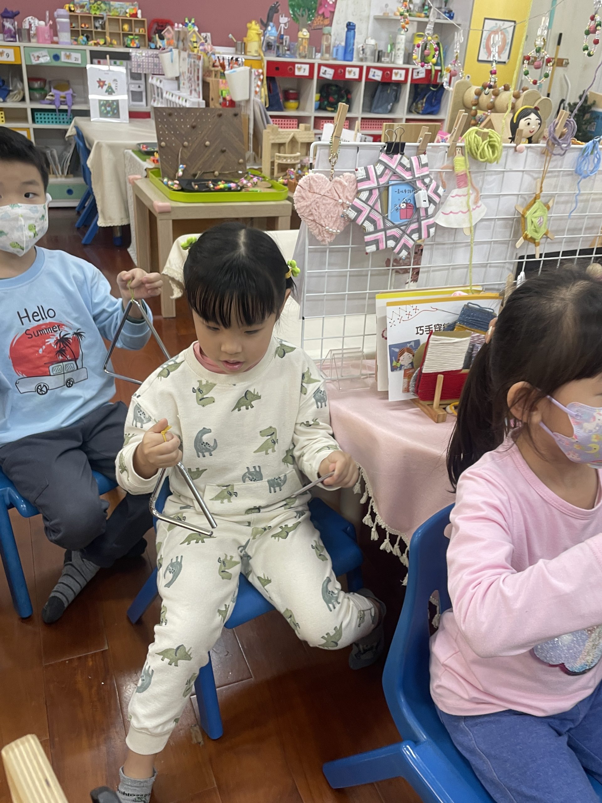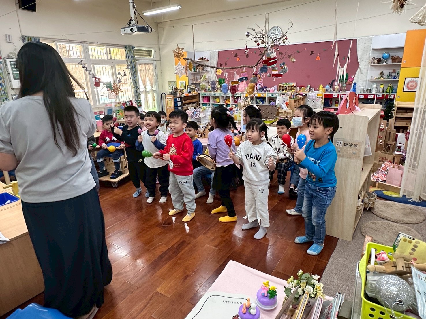 12/23 今天繼續練習兩首報佳音的歌曲~<聖誕老公公的鈴鐺不見了>和<粉紅色的聖誕節>,大班的三角鐵、鈴鼓與中班的沙鈴,邊唱邊跳邊打節奏,大家的專注力都進步囉!