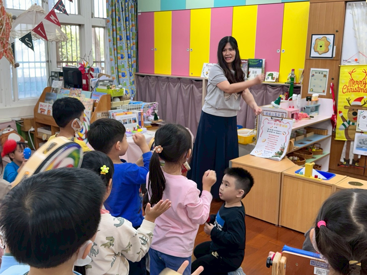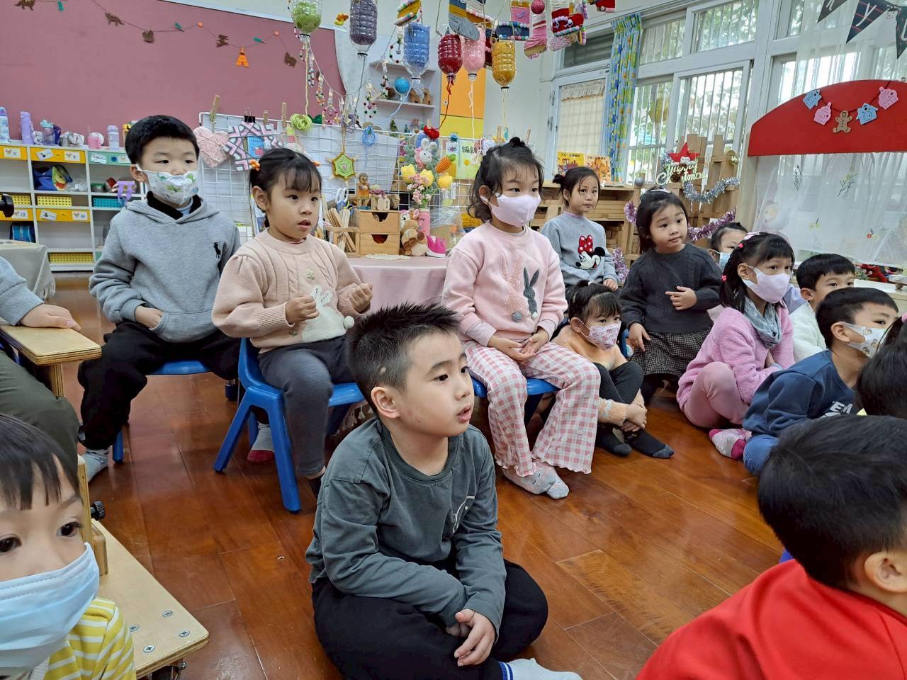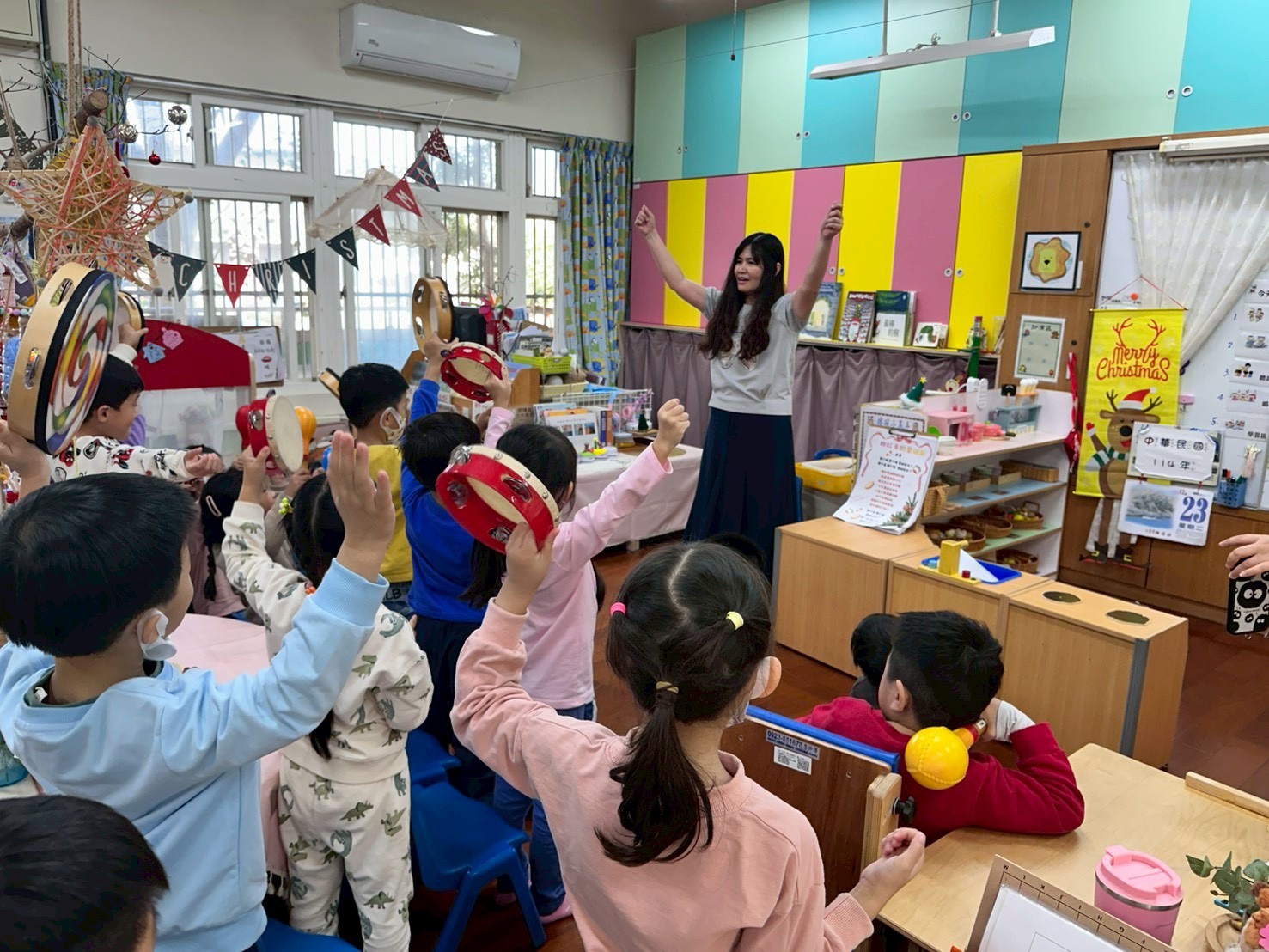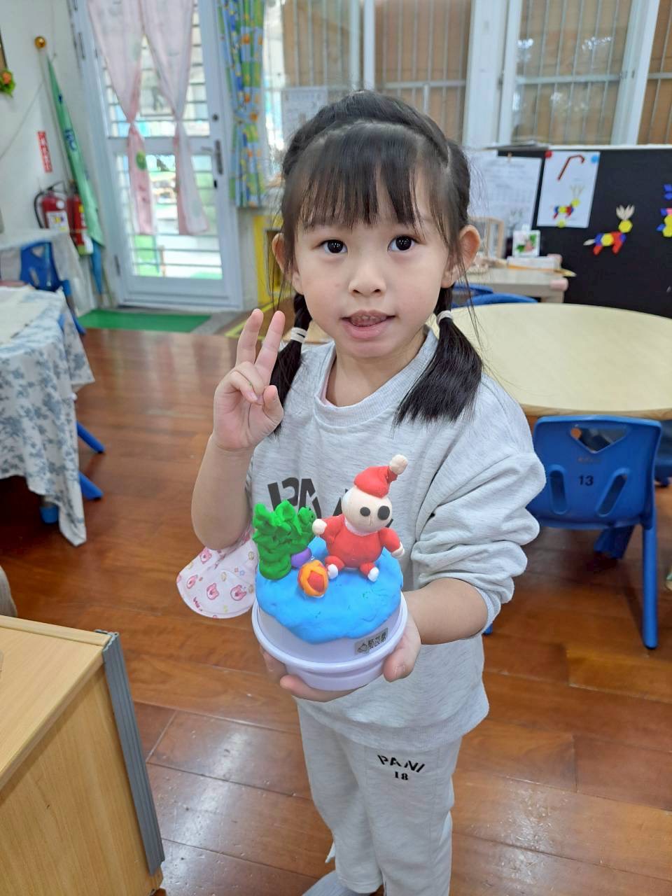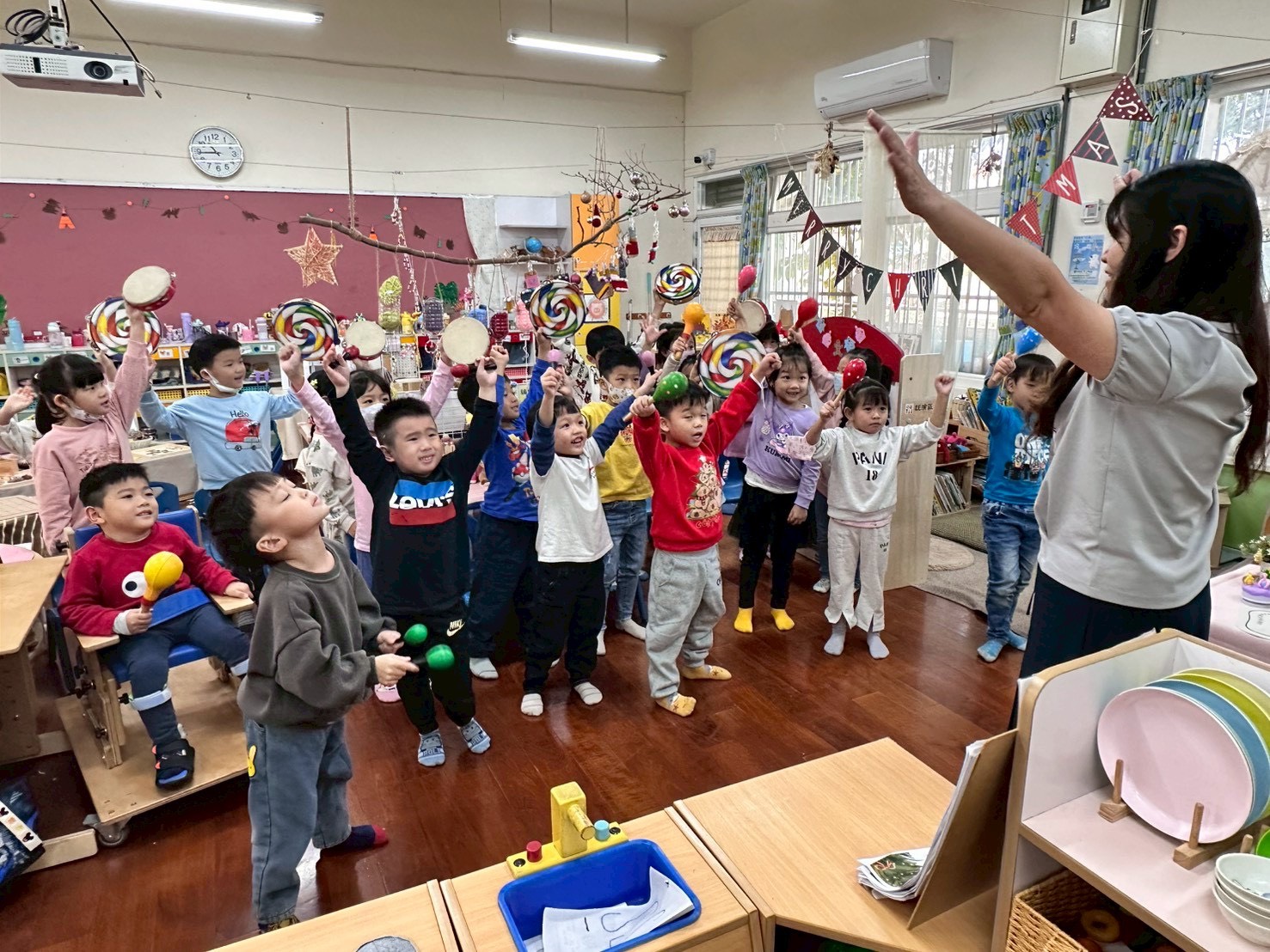 12/23 今天繼續練習兩首報佳音的歌曲~<聖誕老公公的鈴鐺不見了>和<粉紅色的聖誕節>,大班的三角鐵、鈴鼓與中班的沙鈴,邊唱邊跳邊打節奏,大家的專注力都進步囉!