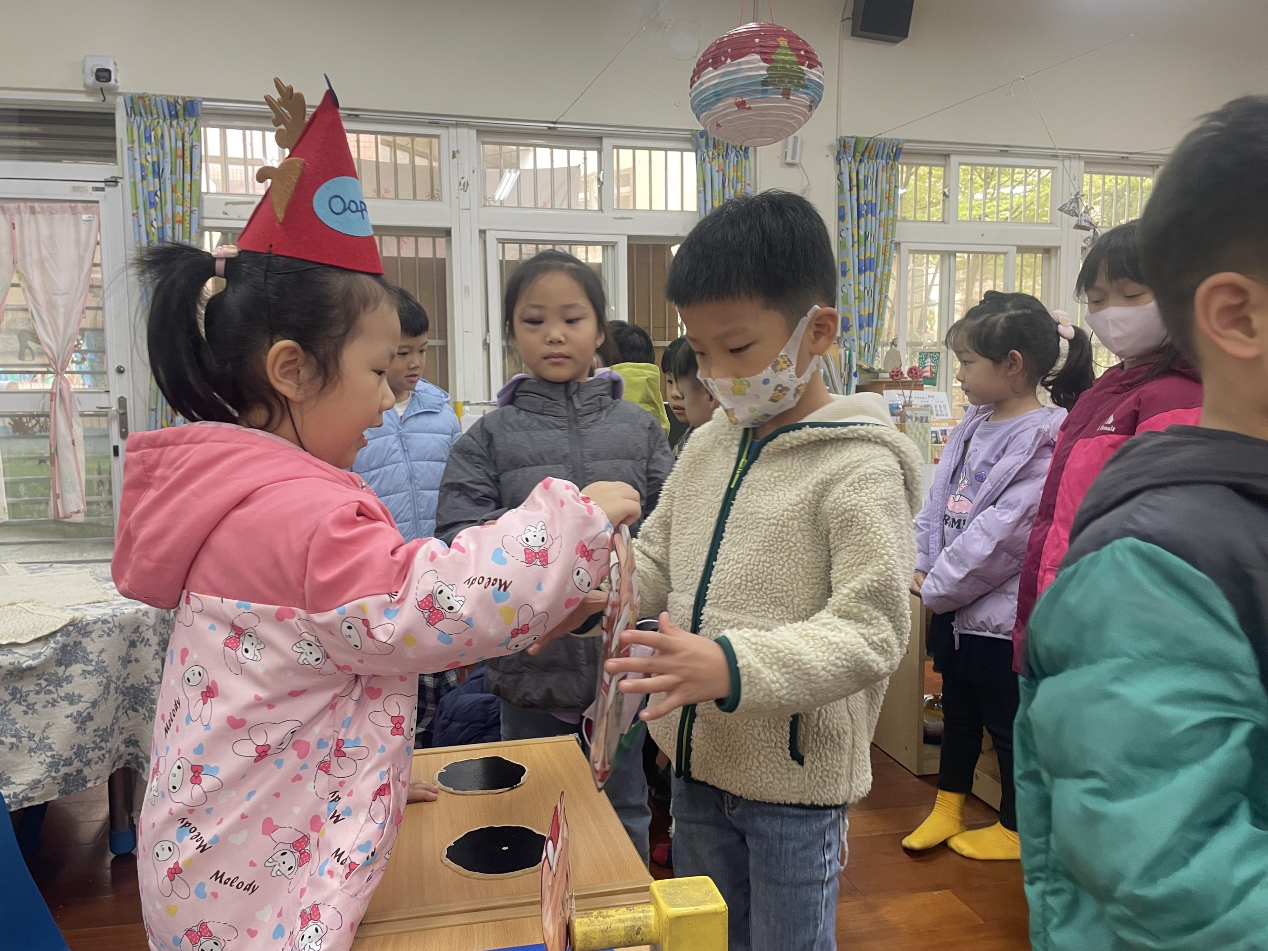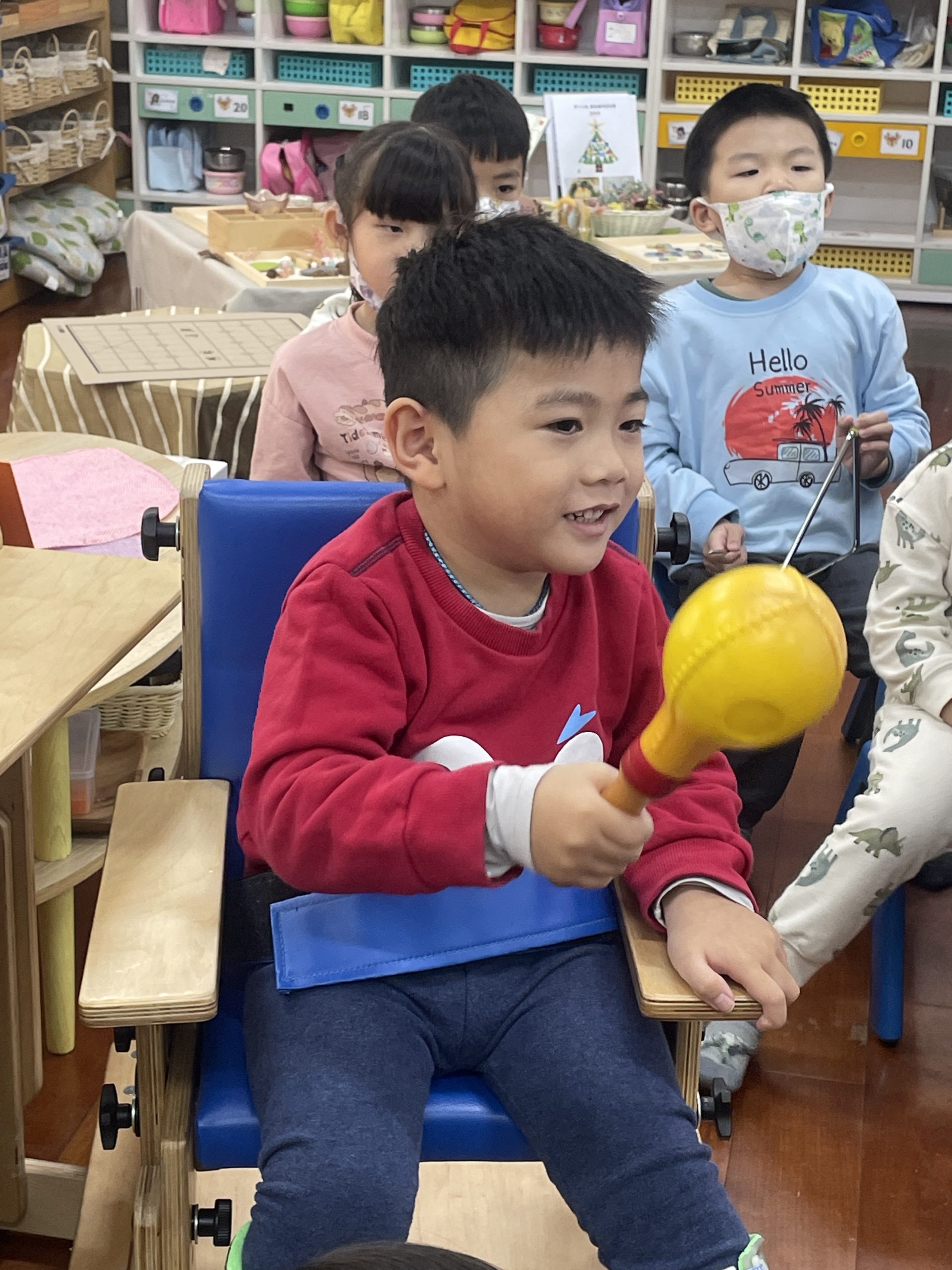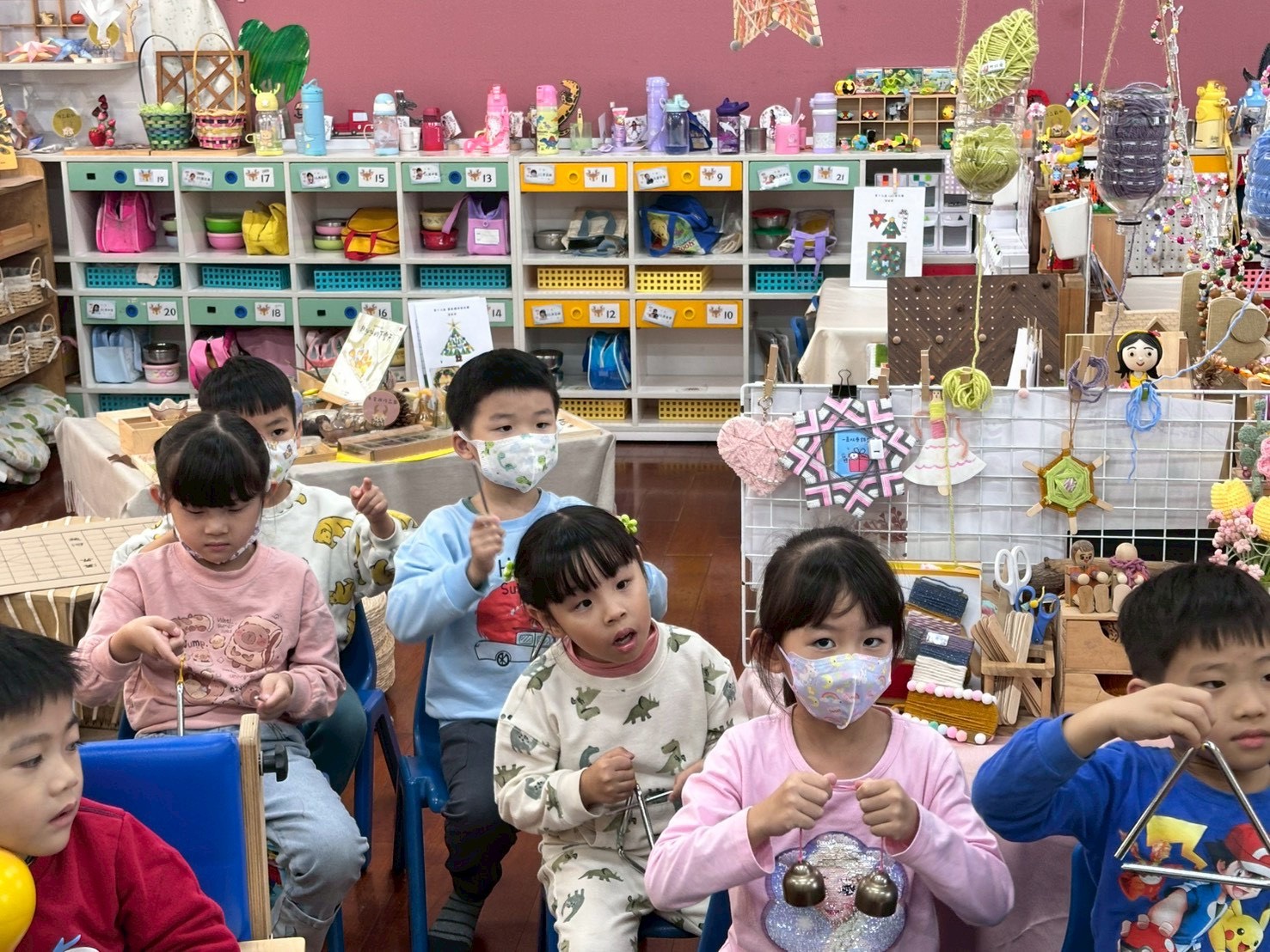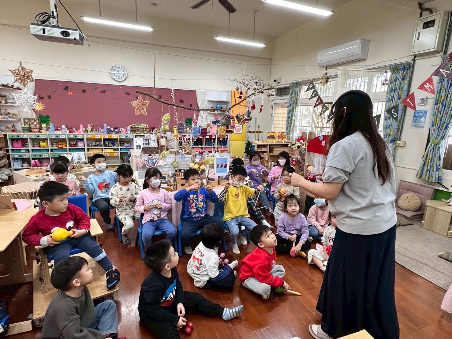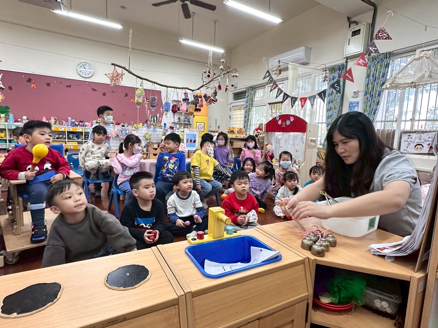 12/23 今天繼續練習兩首報佳音的歌曲~<聖誕老公公的鈴鐺不見了>和<粉紅色的聖誕節>,大班的三角鐵、鈴鼓與中班的沙鈴,邊唱邊跳邊打節奏,大家的專注力都進步囉!