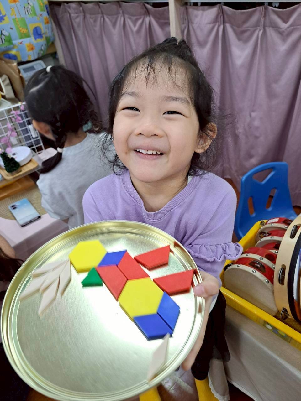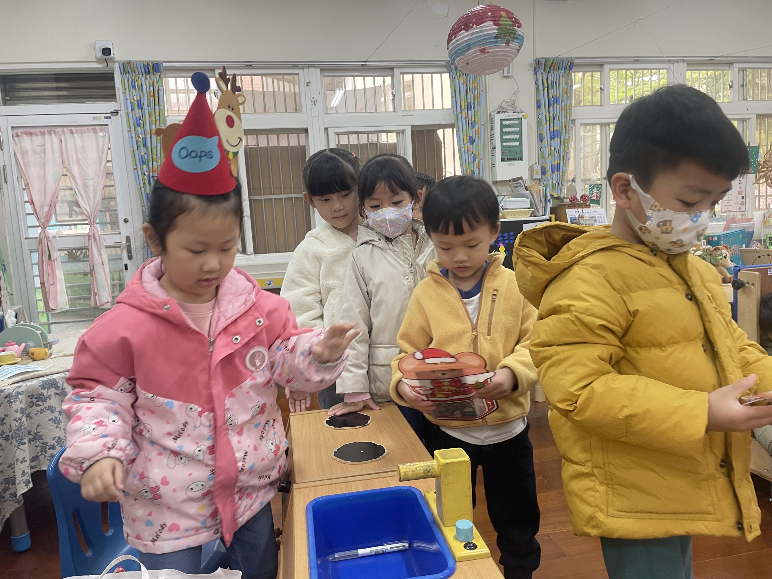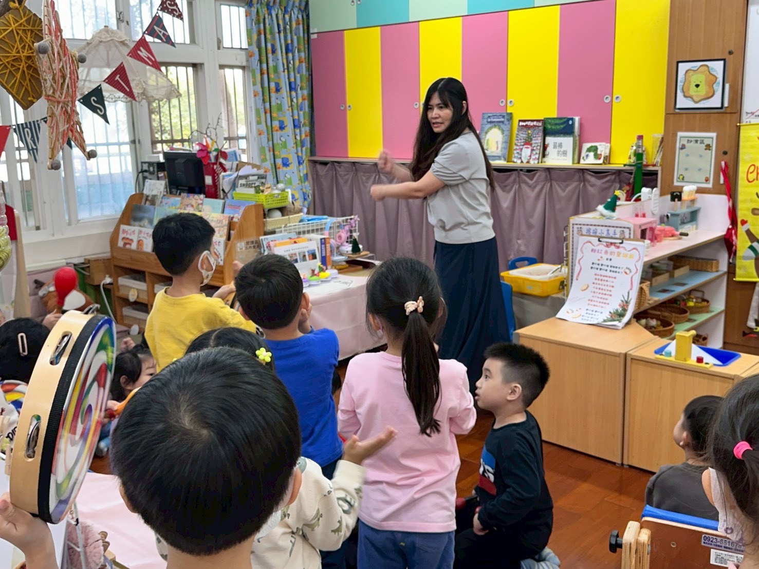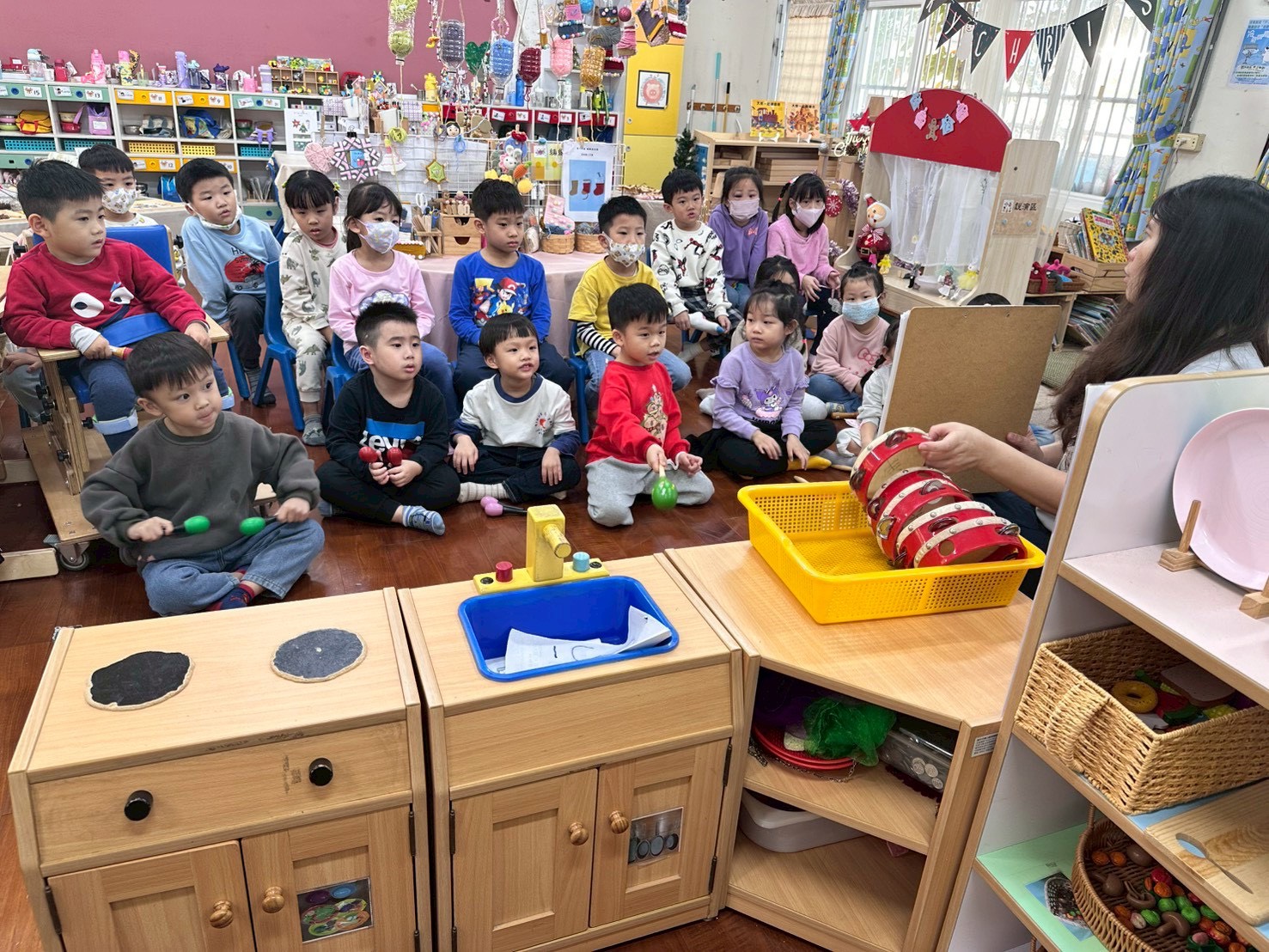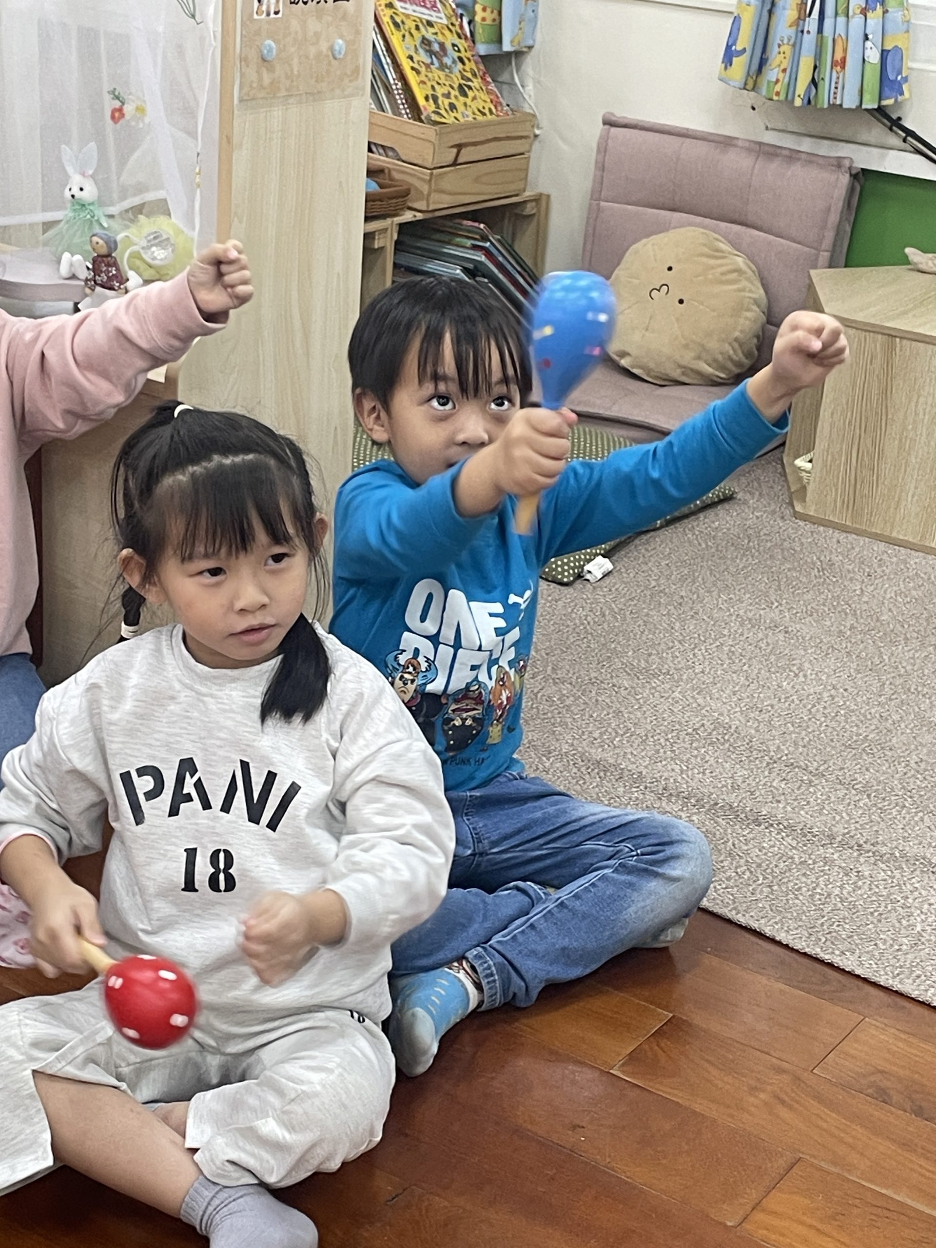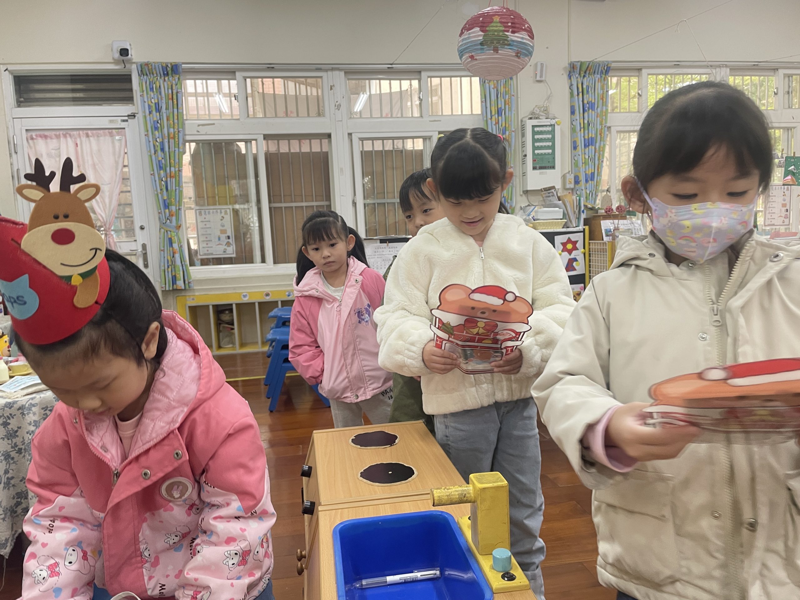 12/23 今天繼續練習兩首報佳音的歌曲~<聖誕老公公的鈴鐺不見了>和<粉紅色的聖誕節>,大班的三角鐵、鈴鼓與中班的沙鈴,邊唱邊跳邊打節奏,大家的專注力都進步囉!
