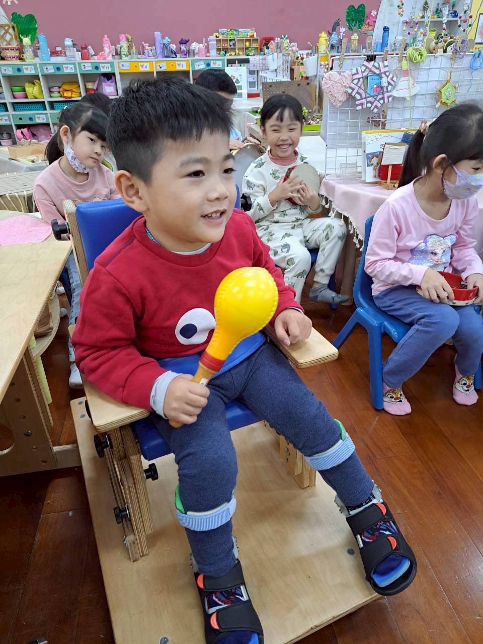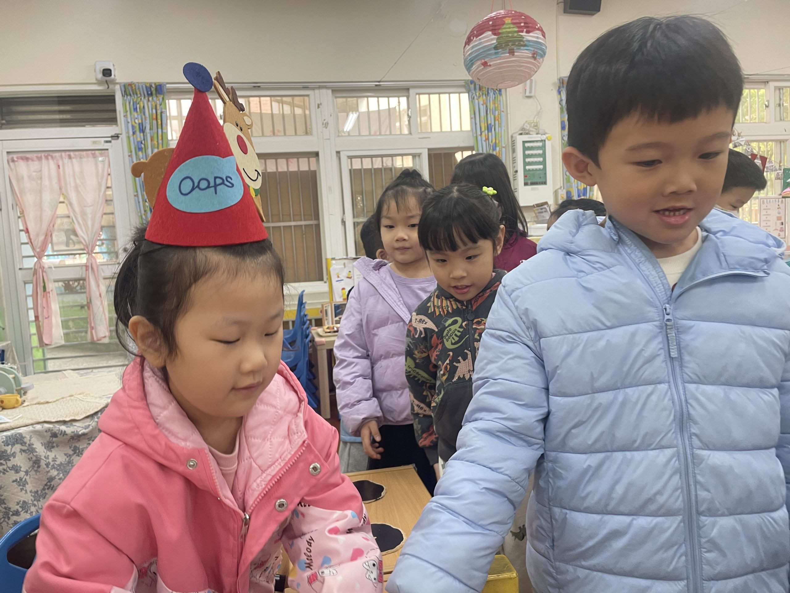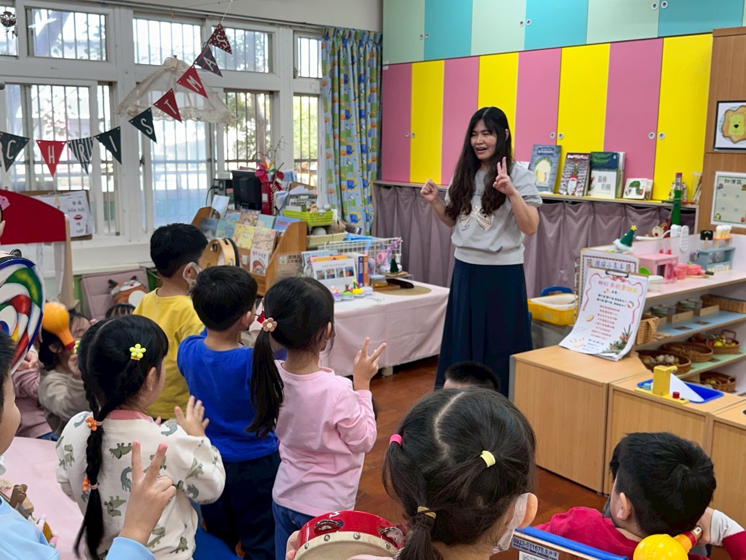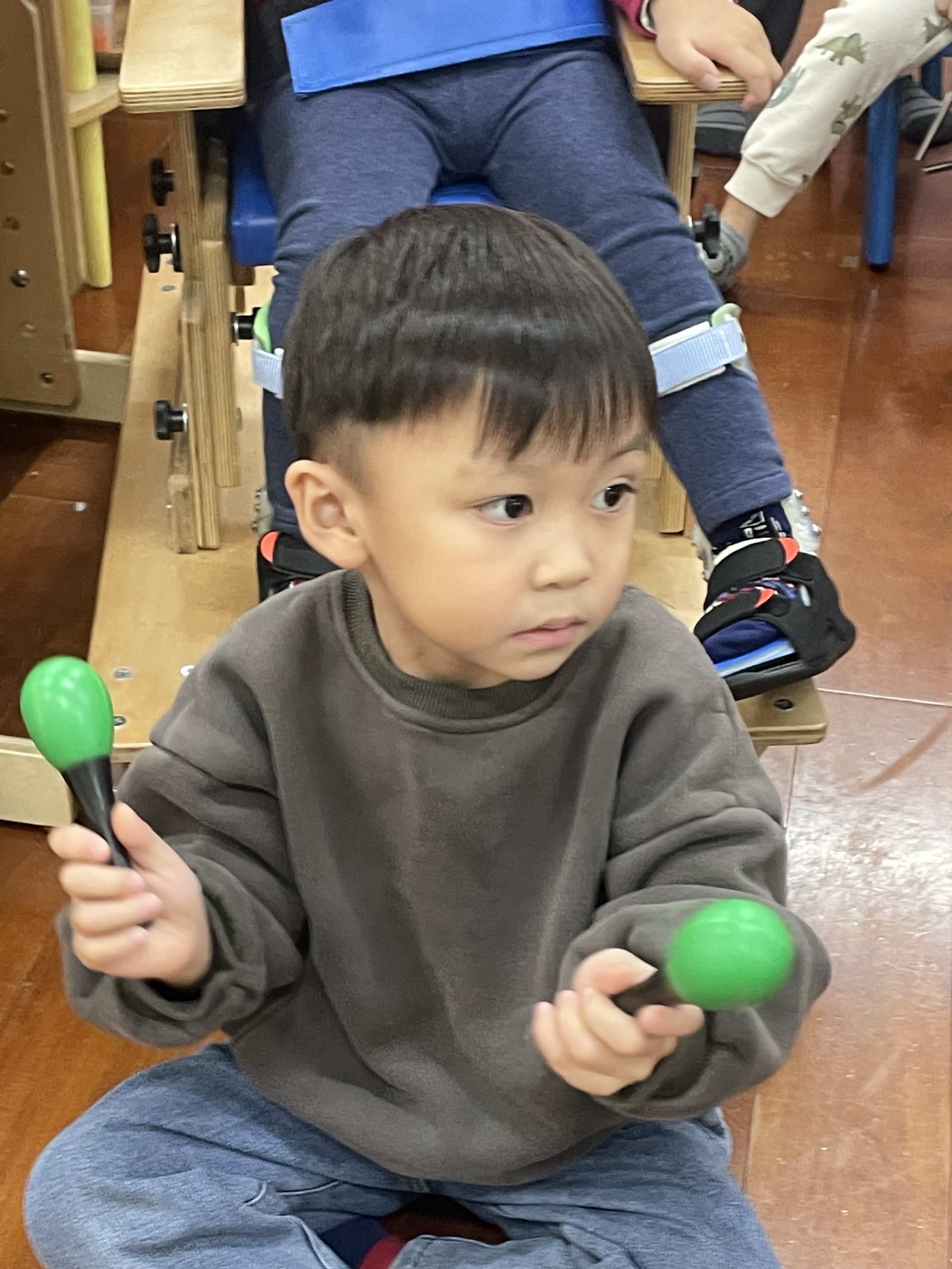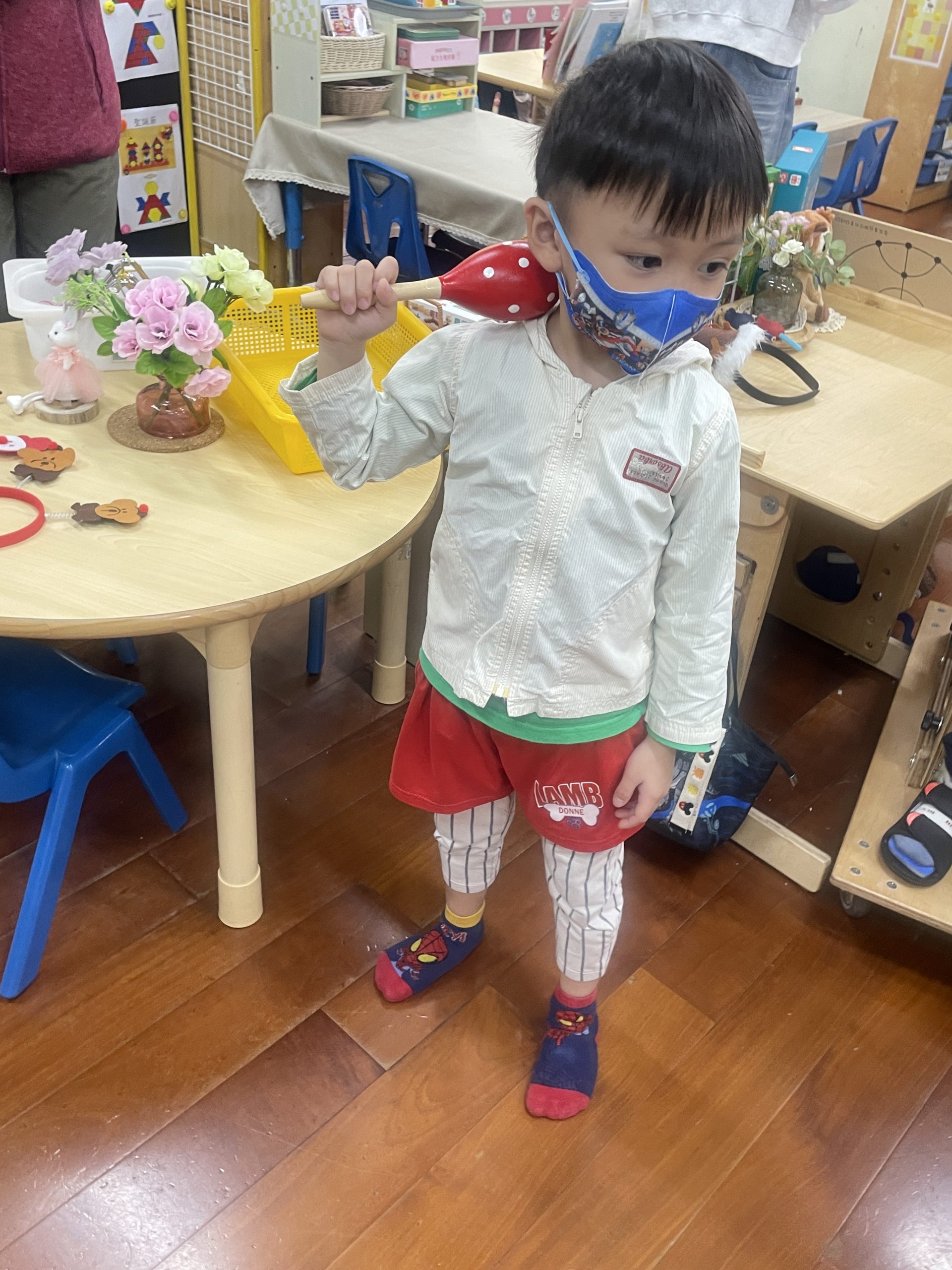 12/23 今天繼續練習兩首報佳音的歌曲~<聖誕老公公的鈴鐺不見了>和<粉紅色的聖誕節>,大班的三角鐵、鈴鼓與中班的沙鈴,邊唱邊跳邊打節奏,大家的專注力都進步囉!