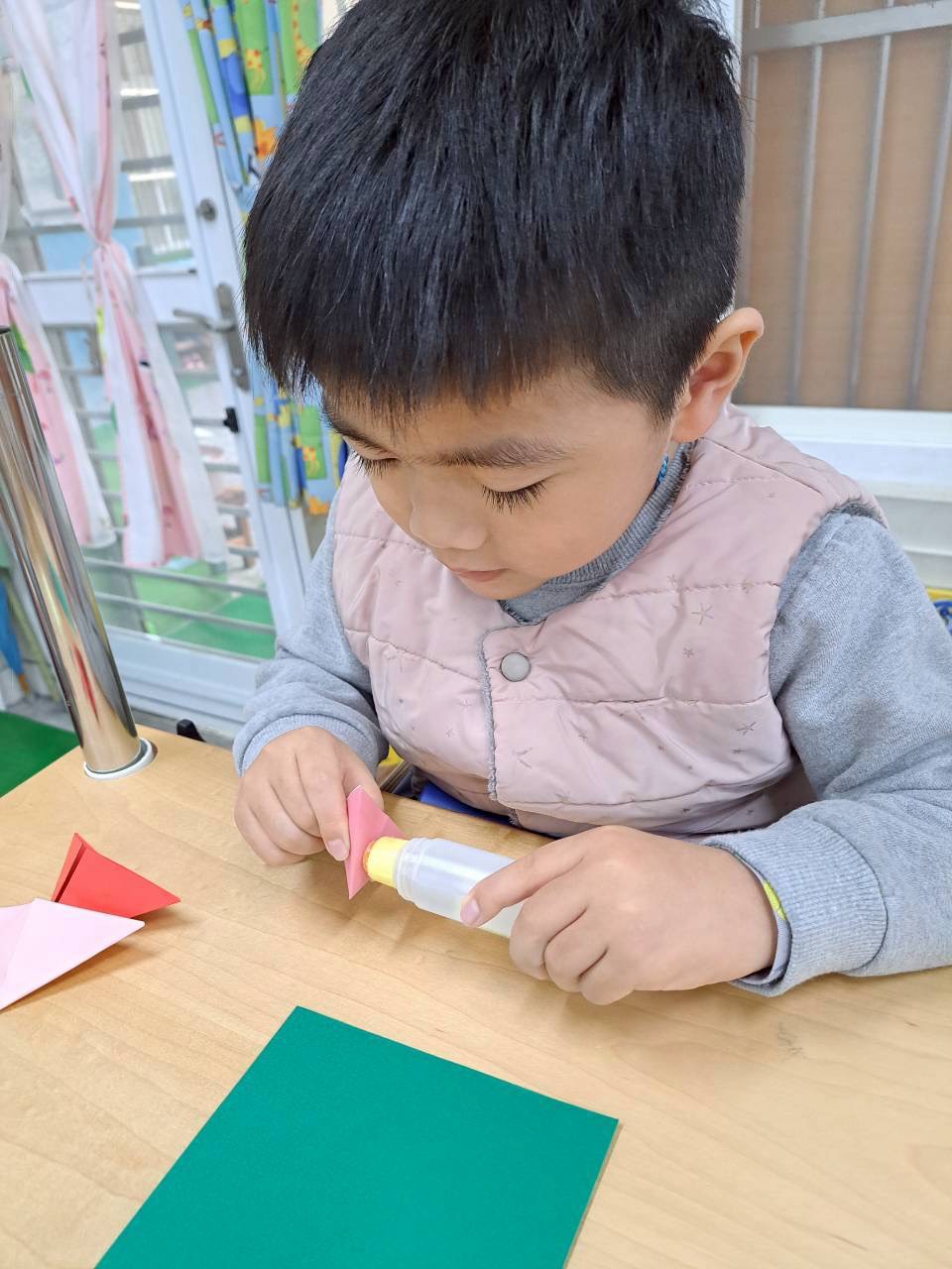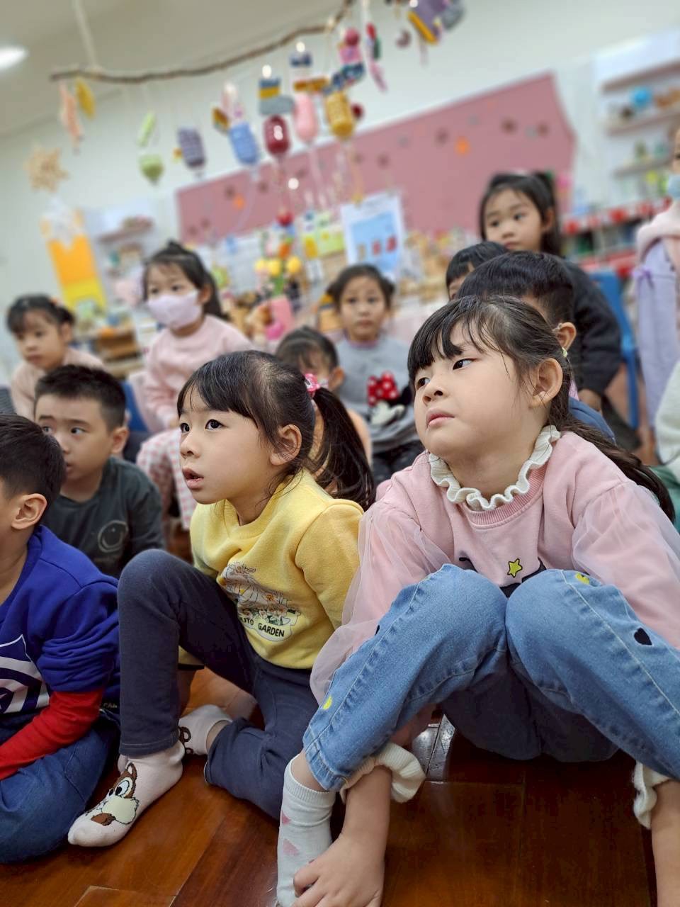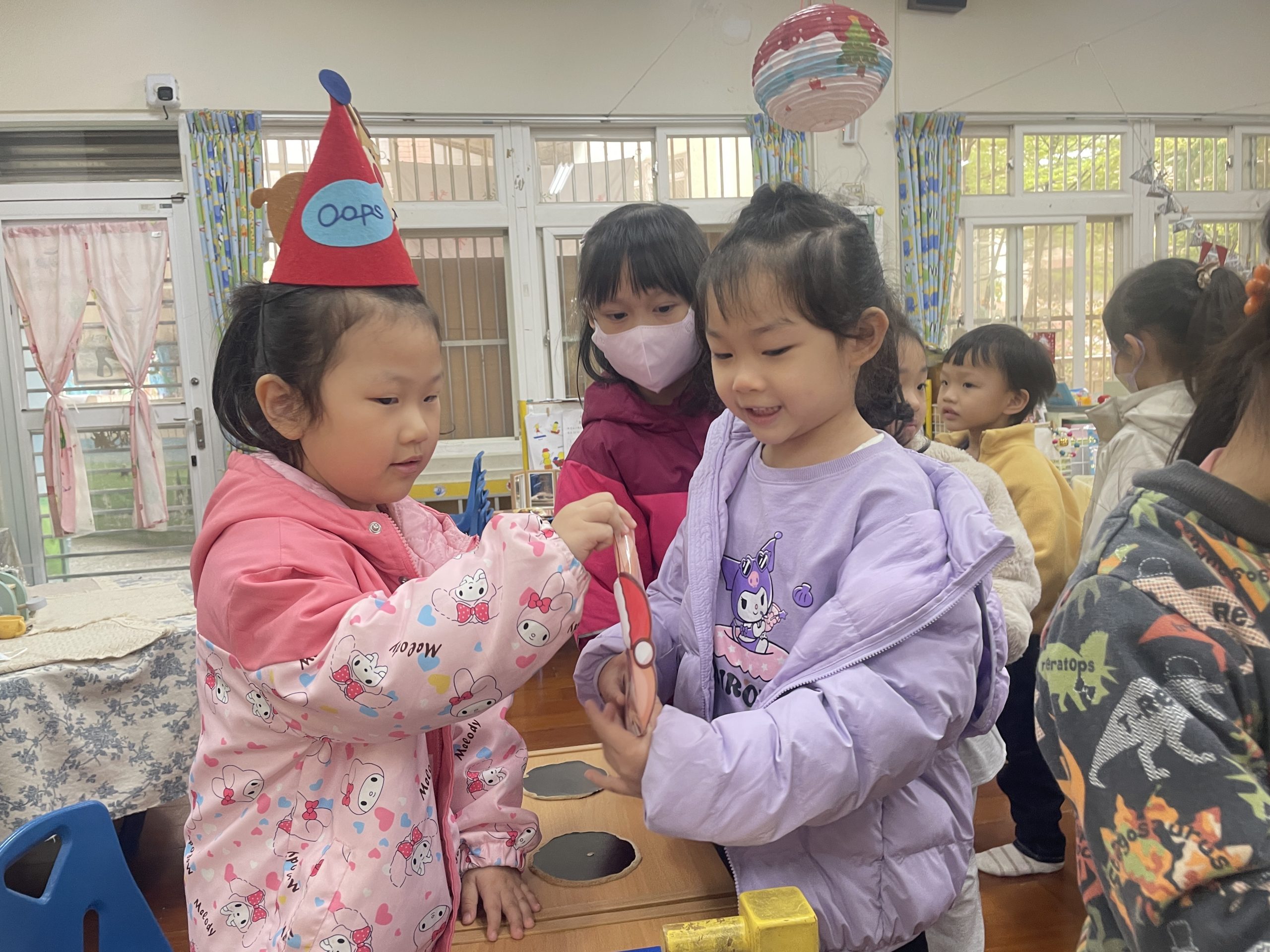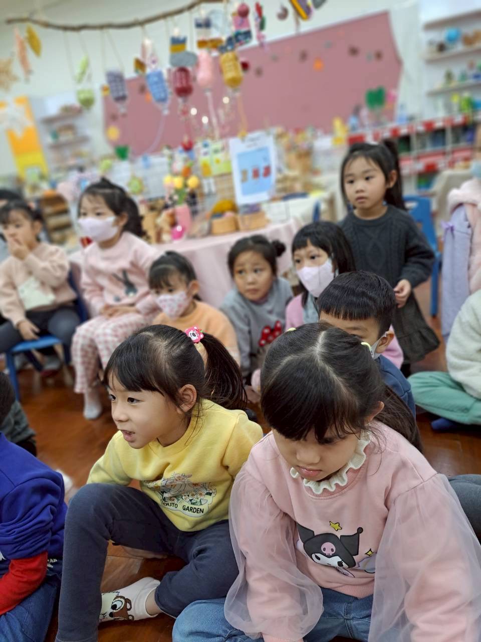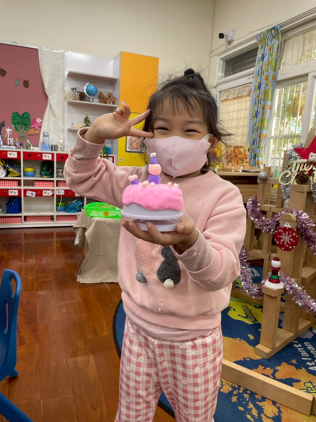 12/23 今天繼續練習兩首報佳音的歌曲~<聖誕老公公的鈴鐺不見了>和<粉紅色的聖誕節>,大班的三角鐵、鈴鼓與中班的沙鈴,邊唱邊跳邊打節奏,大家的專注力都進步囉!