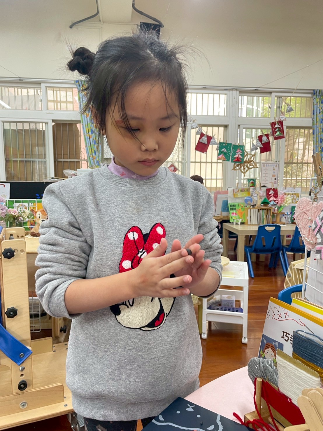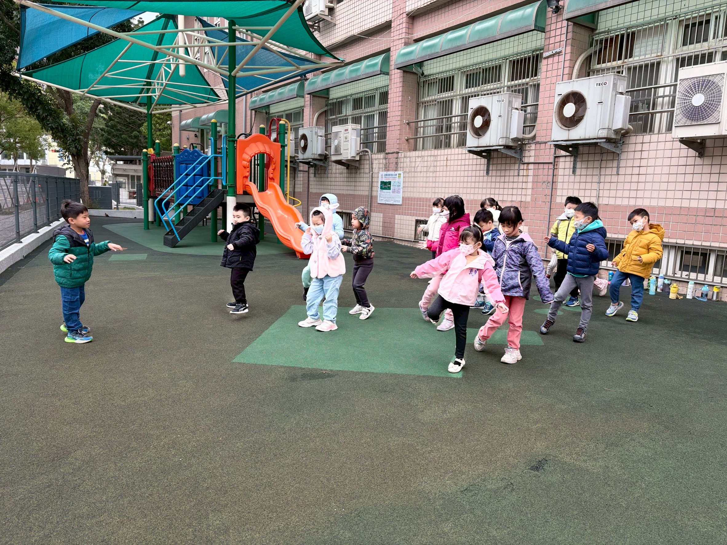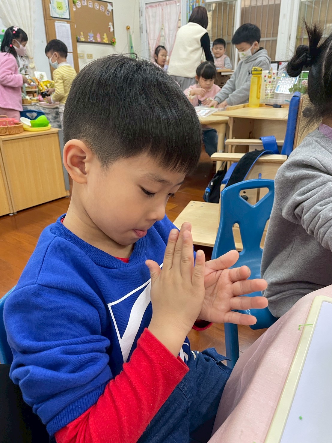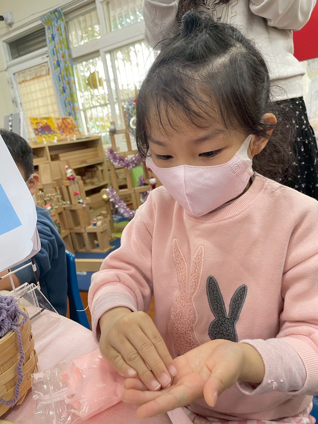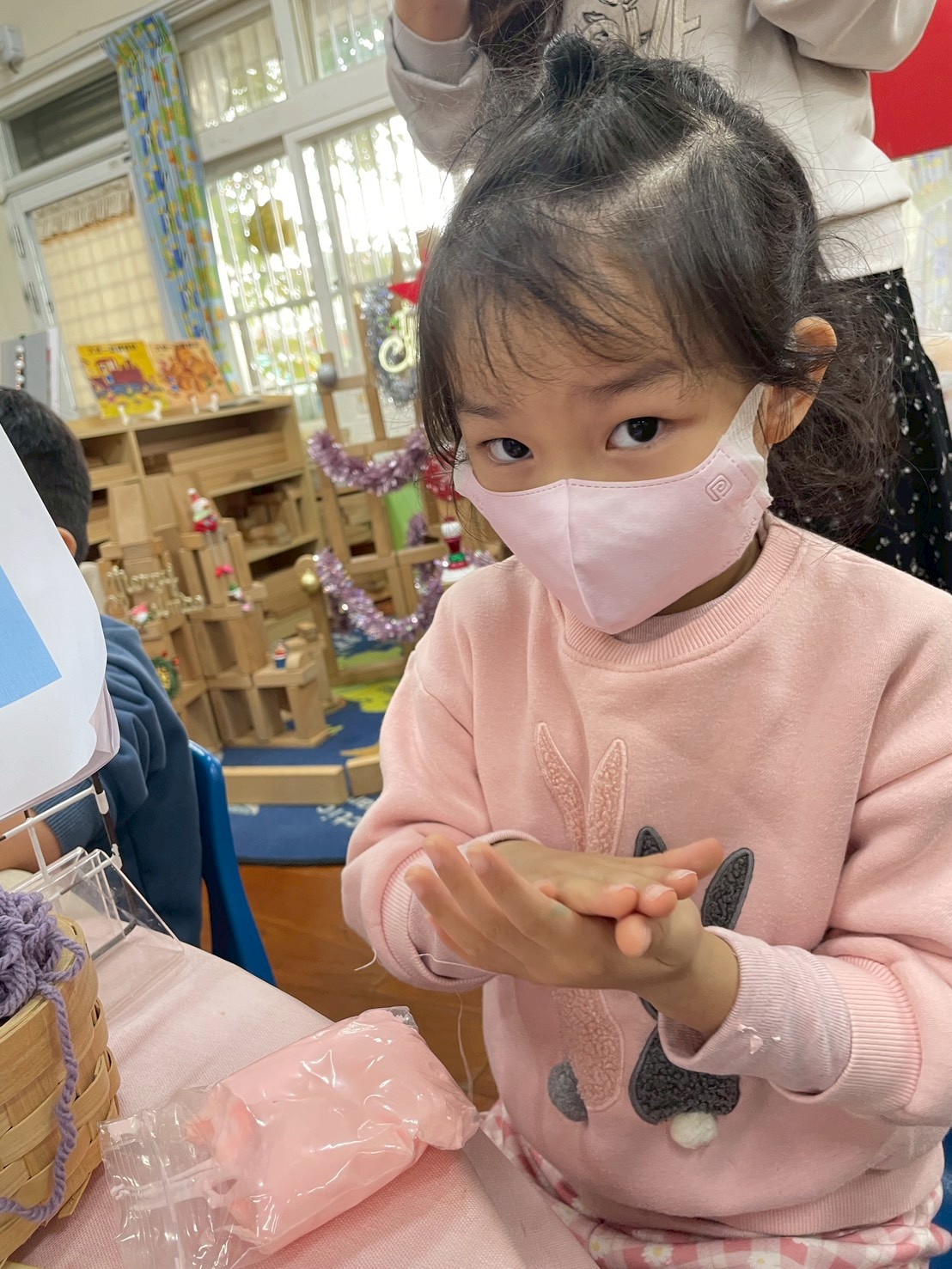 12/23 今天繼續練習兩首報佳音的歌曲~<聖誕老公公的鈴鐺不見了>和<粉紅色的聖誕節>,大班的三角鐵、鈴鼓與中班的沙鈴,邊唱邊跳邊打節奏,大家的專注力都進步囉!