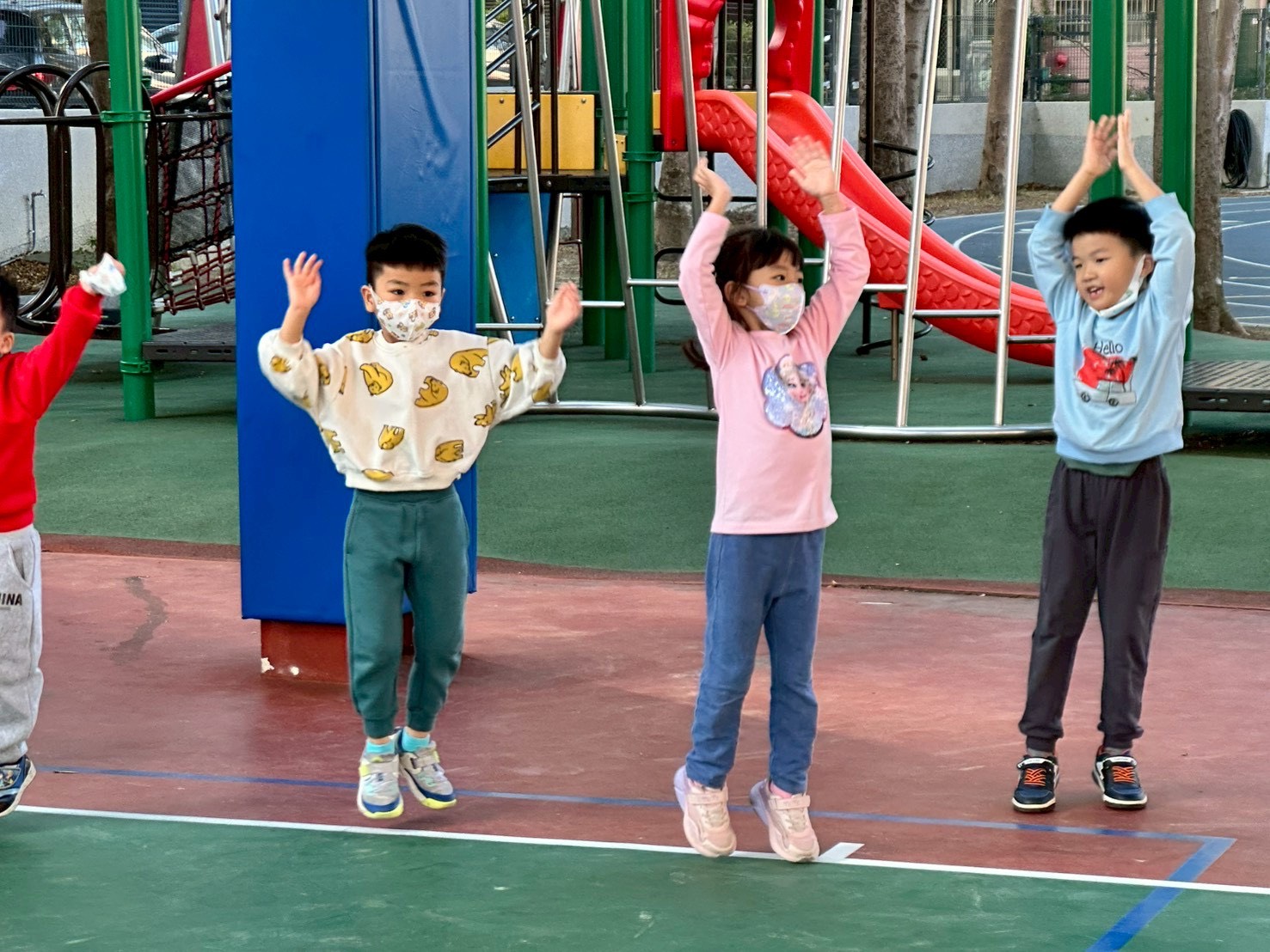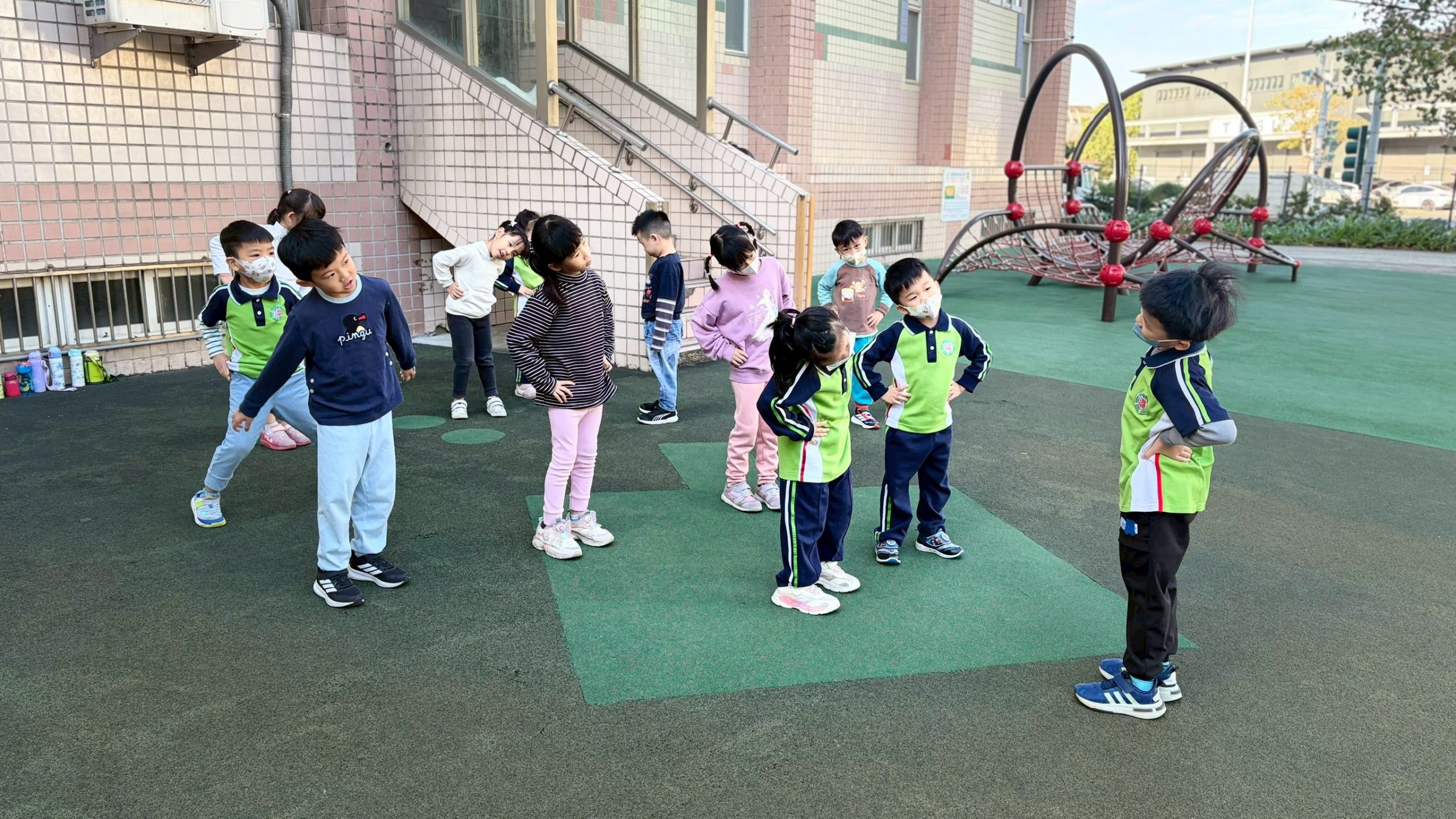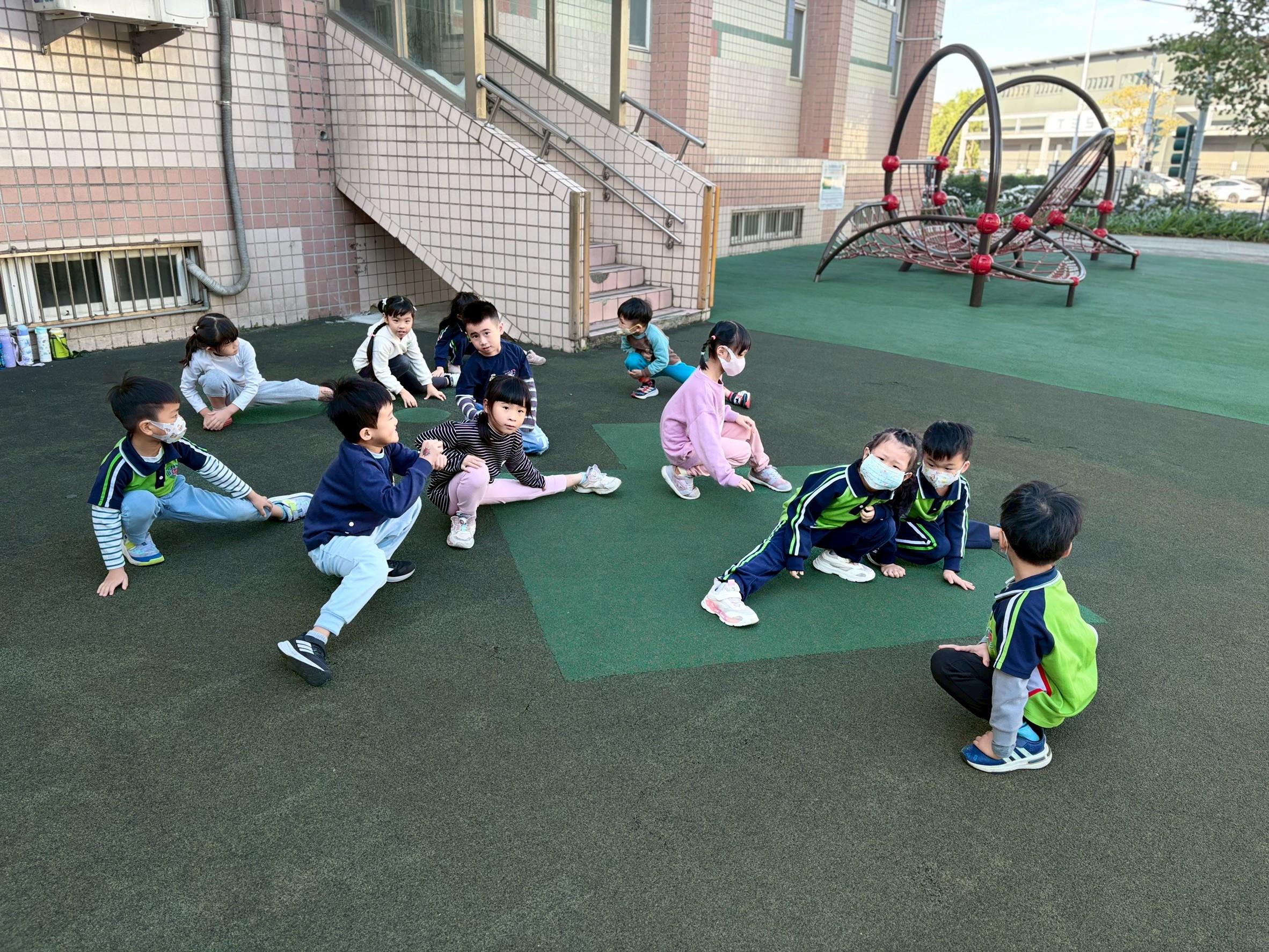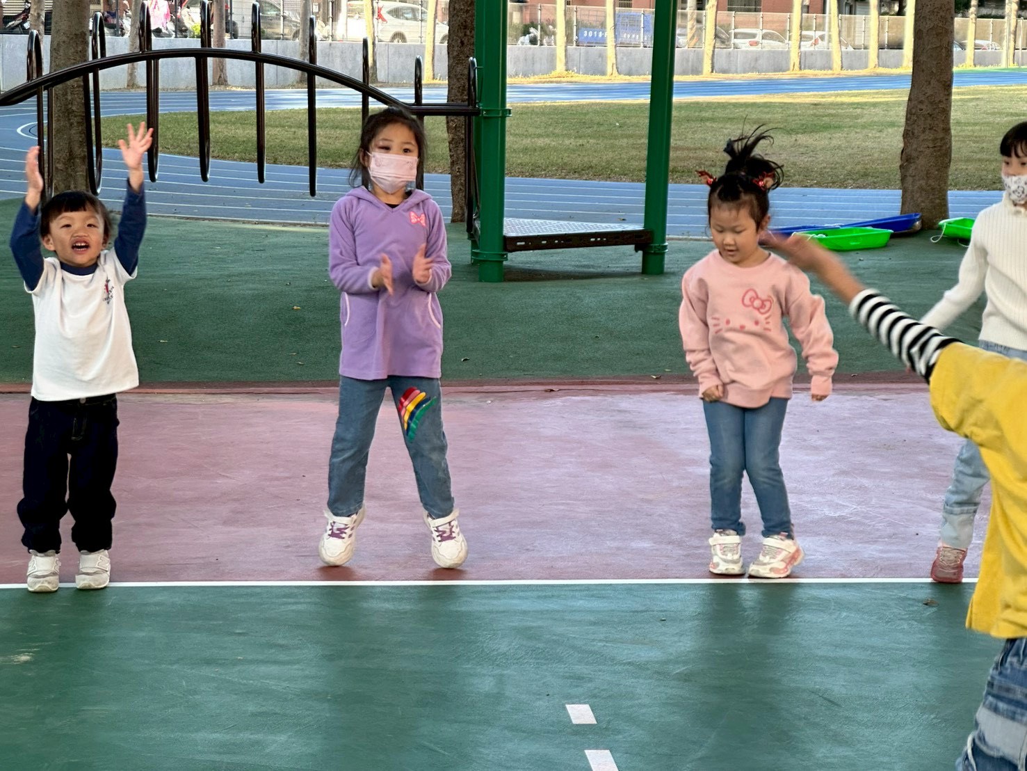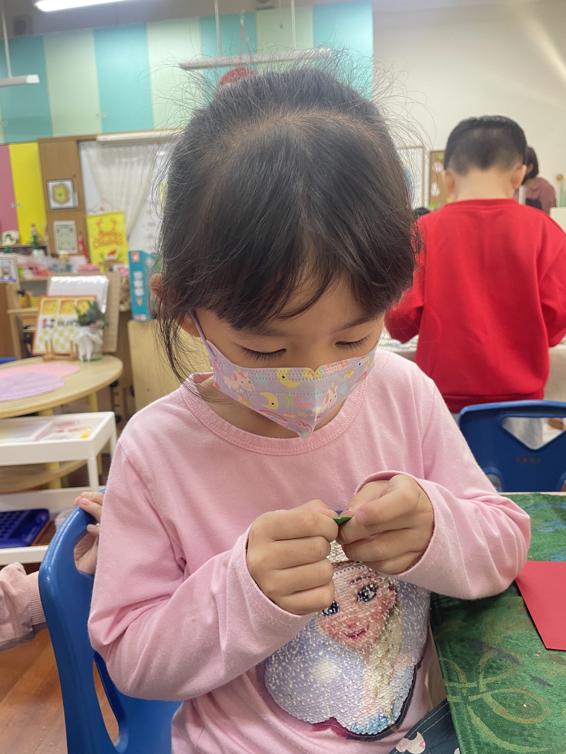 12/23 今天繼續練習兩首報佳音的歌曲~<聖誕老公公的鈴鐺不見了>和<粉紅色的聖誕節>,大班的三角鐵、鈴鼓與中班的沙鈴,邊唱邊跳邊打節奏,大家的專注力都進步囉!