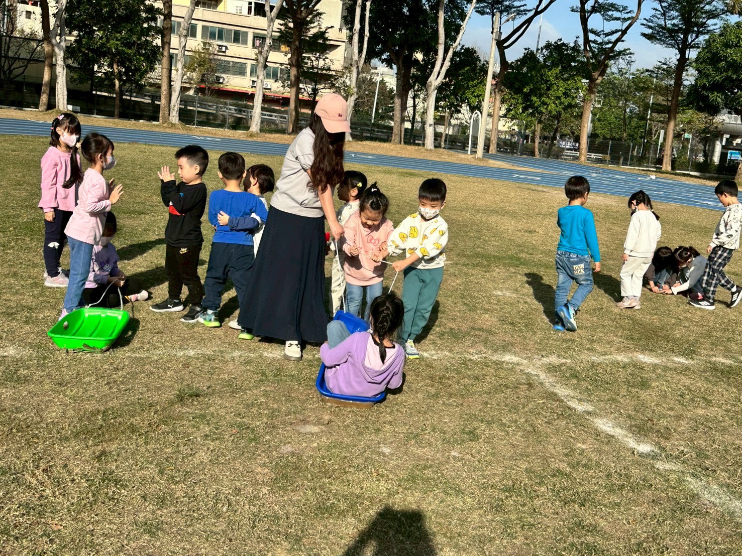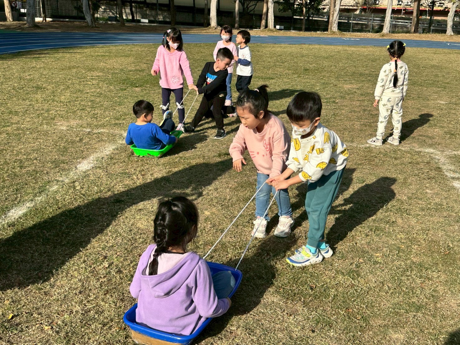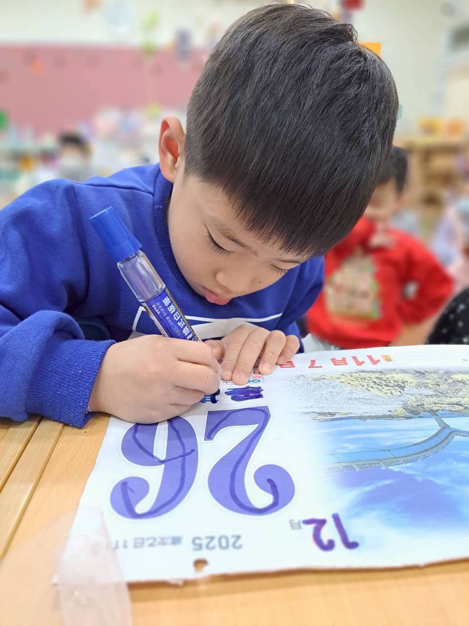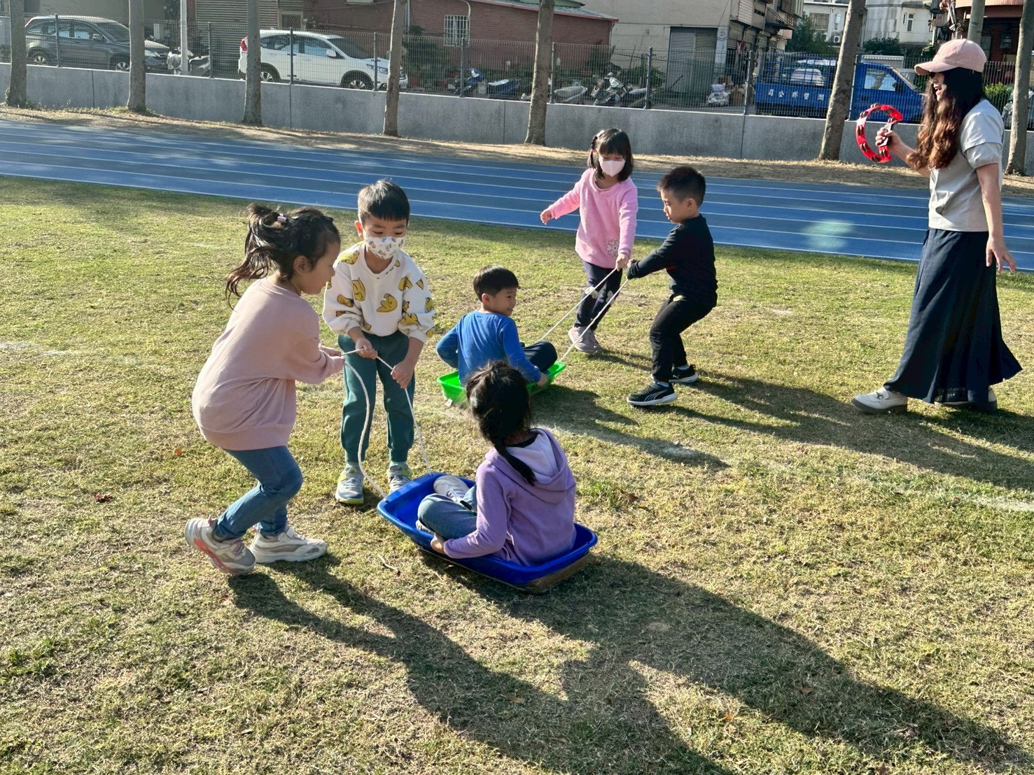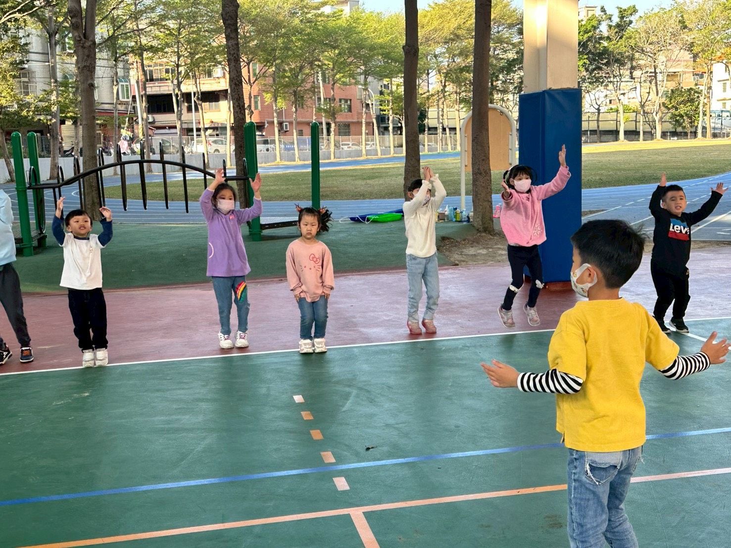 12/23 今天繼續練習兩首報佳音的歌曲~<聖誕老公公的鈴鐺不見了>和<粉紅色的聖誕節>,大班的三角鐵、鈴鼓與中班的沙鈴,邊唱邊跳邊打節奏,大家的專注力都進步囉!