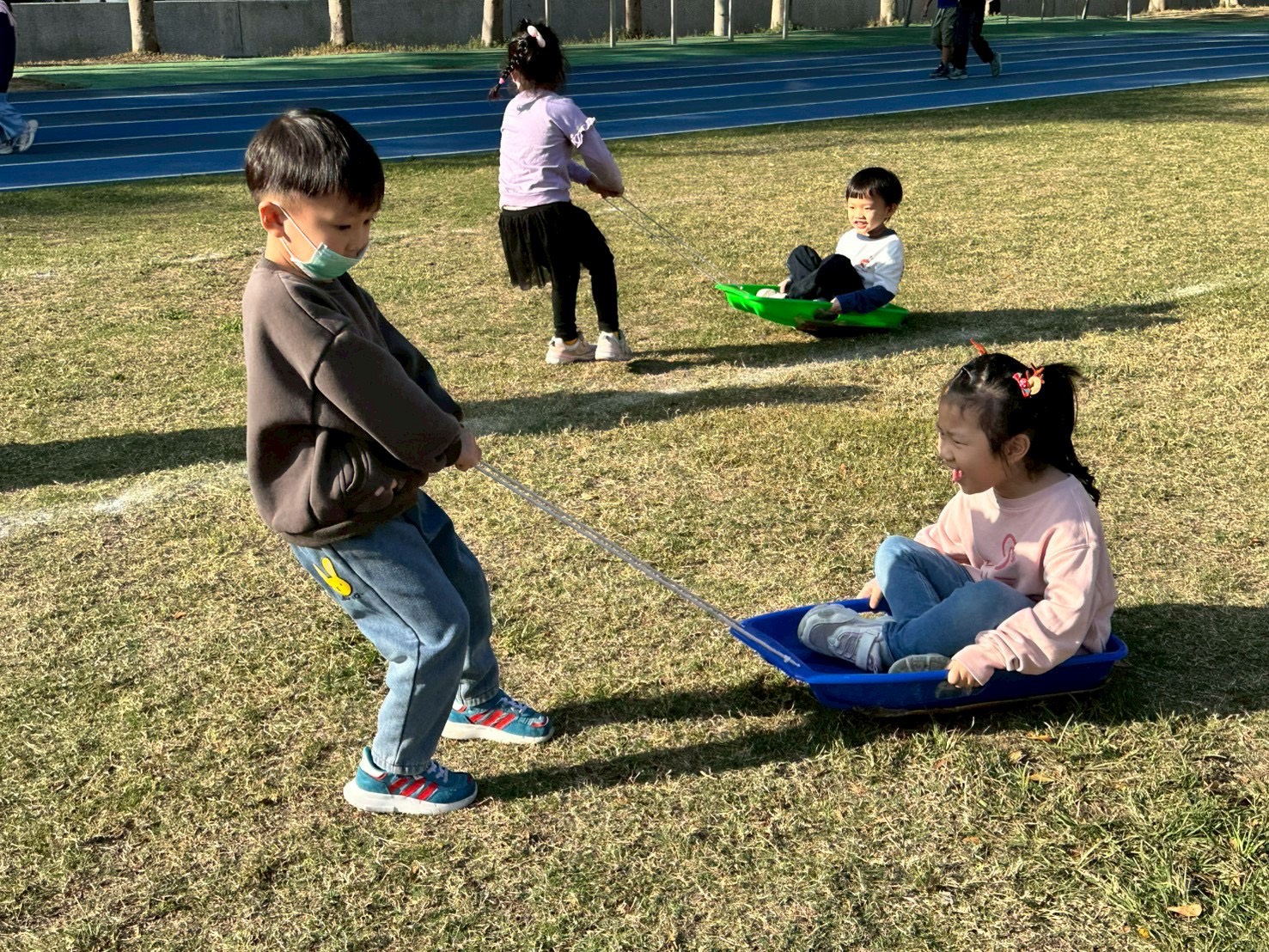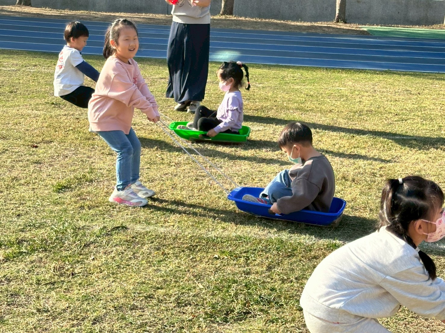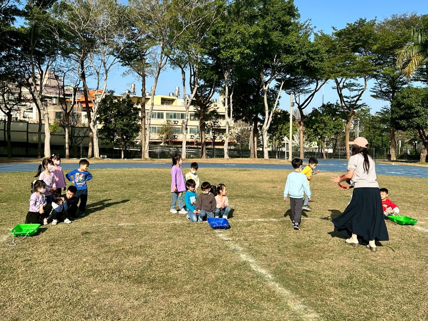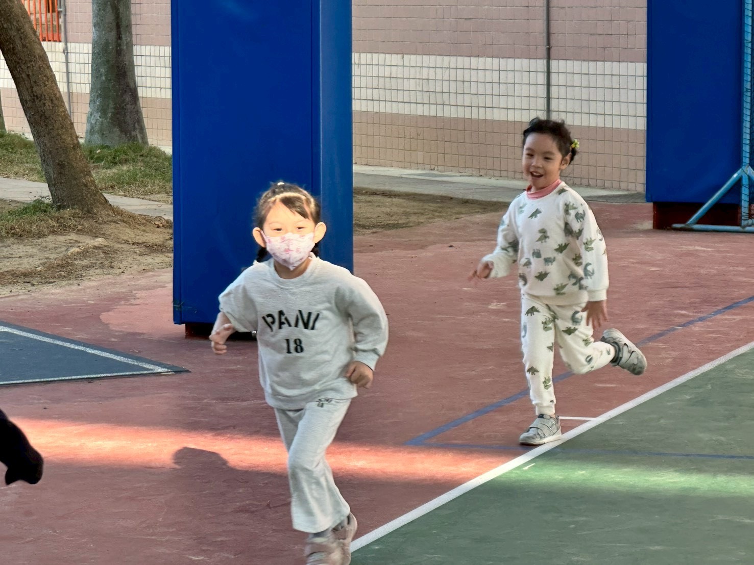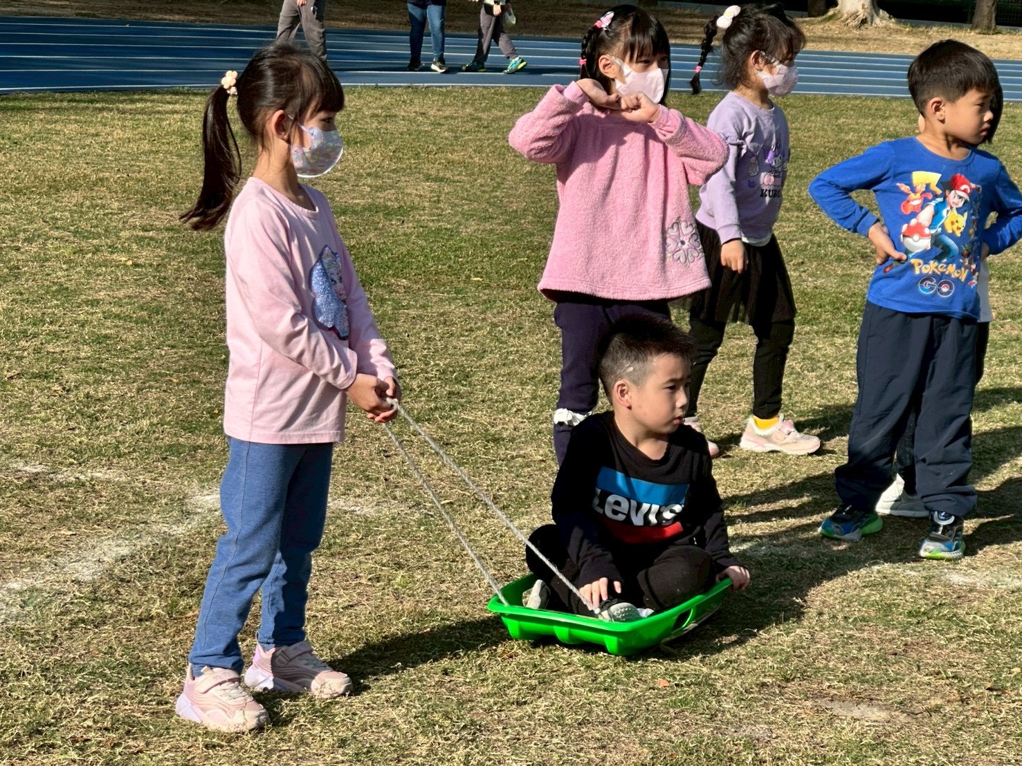 12/23 今天繼續練習兩首報佳音的歌曲~<聖誕老公公的鈴鐺不見了>和<粉紅色的聖誕節>,大班的三角鐵、鈴鼓與中班的沙鈴,邊唱邊跳邊打節奏,大家的專注力都進步囉!