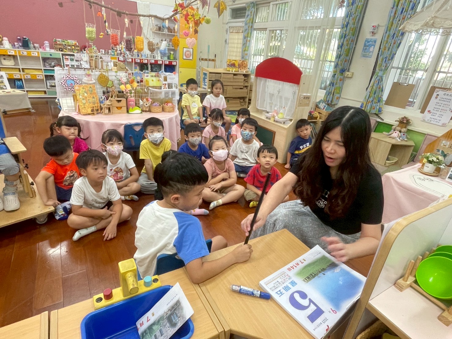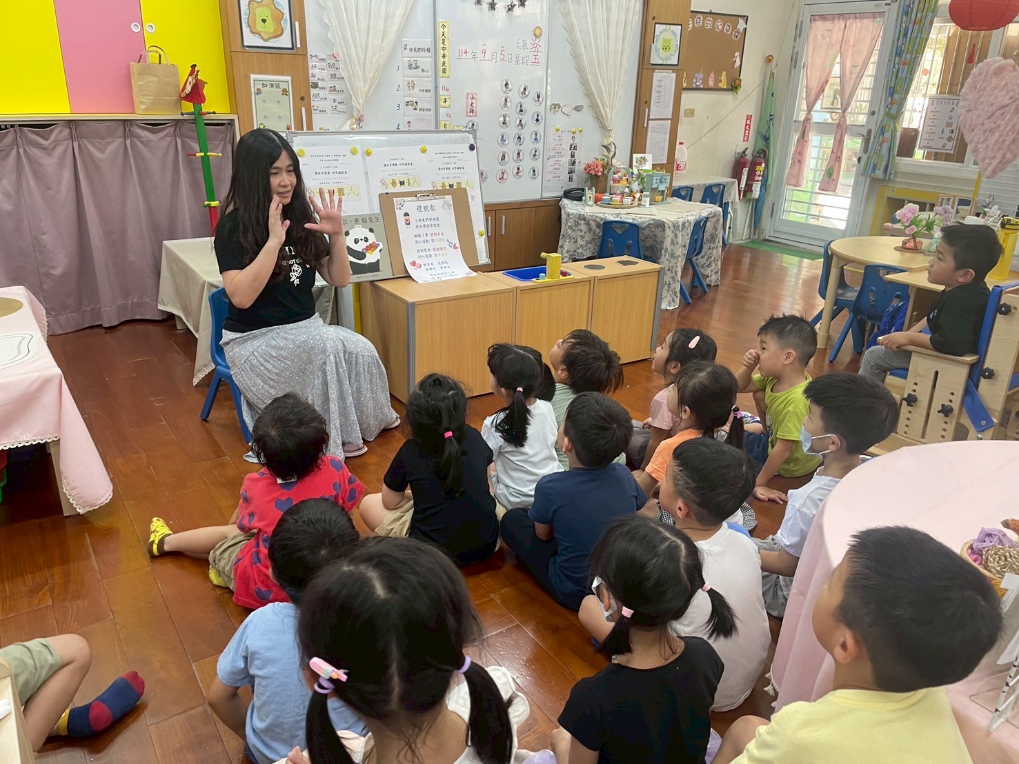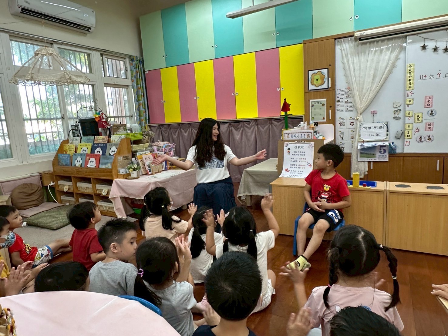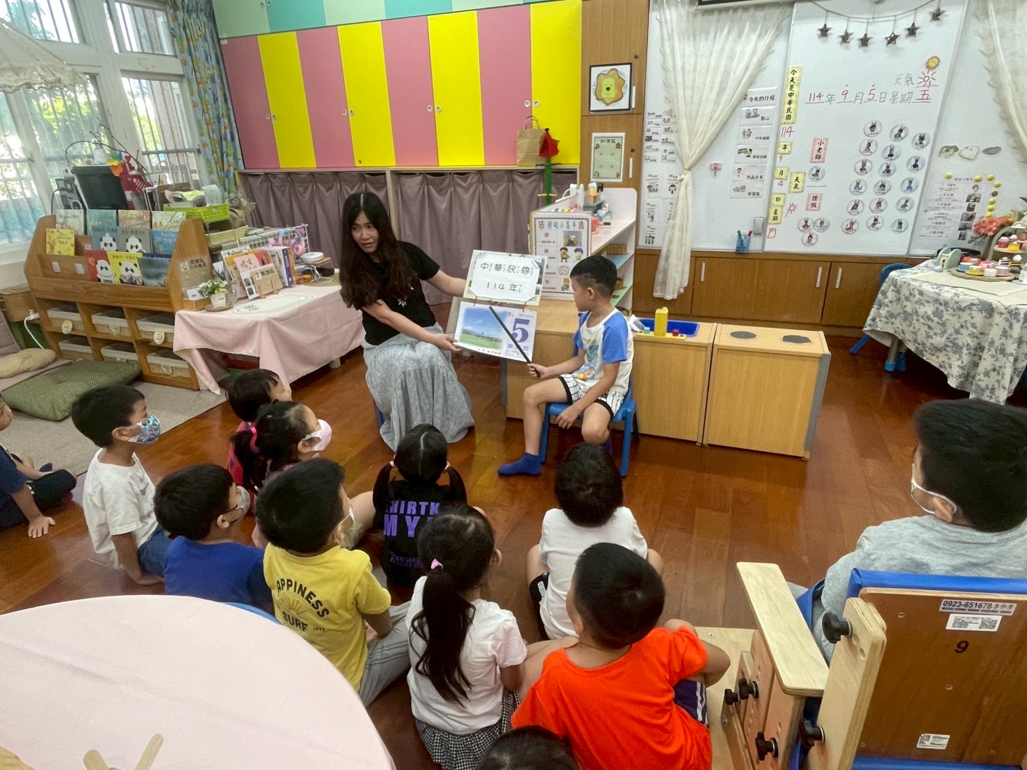 9/2 今天分享一本可愛的繪本<拜託,熊貓先生>,為這兩週的「禮貌」主題暖身,故事中的熊貓先生要分享甜甜圈,誰可以得到這些禮物呢?透過討論開始練習問答與思考,為本學期主題課程「我思 我詩 故我在~作伙來讀冊」揭開序幕囉!
