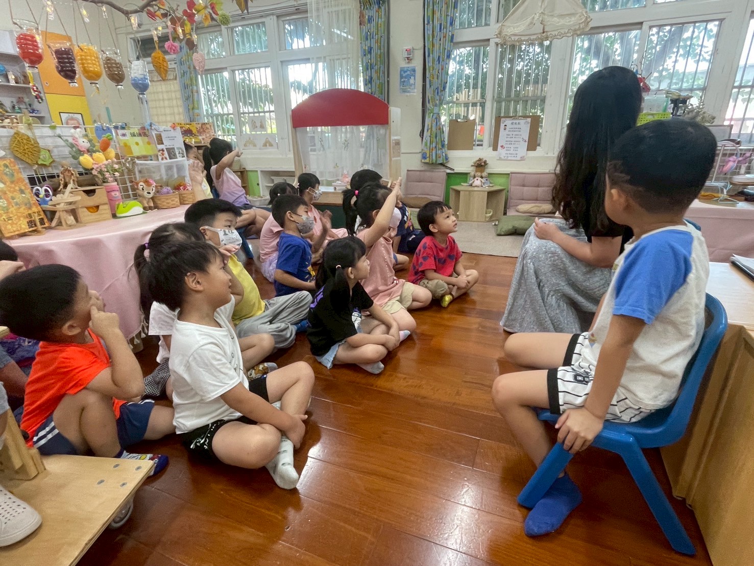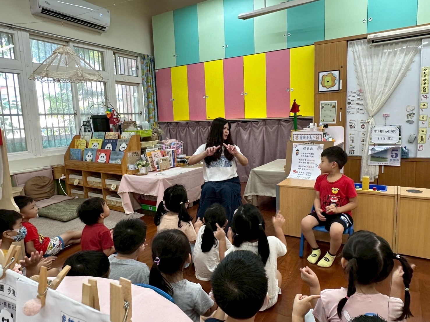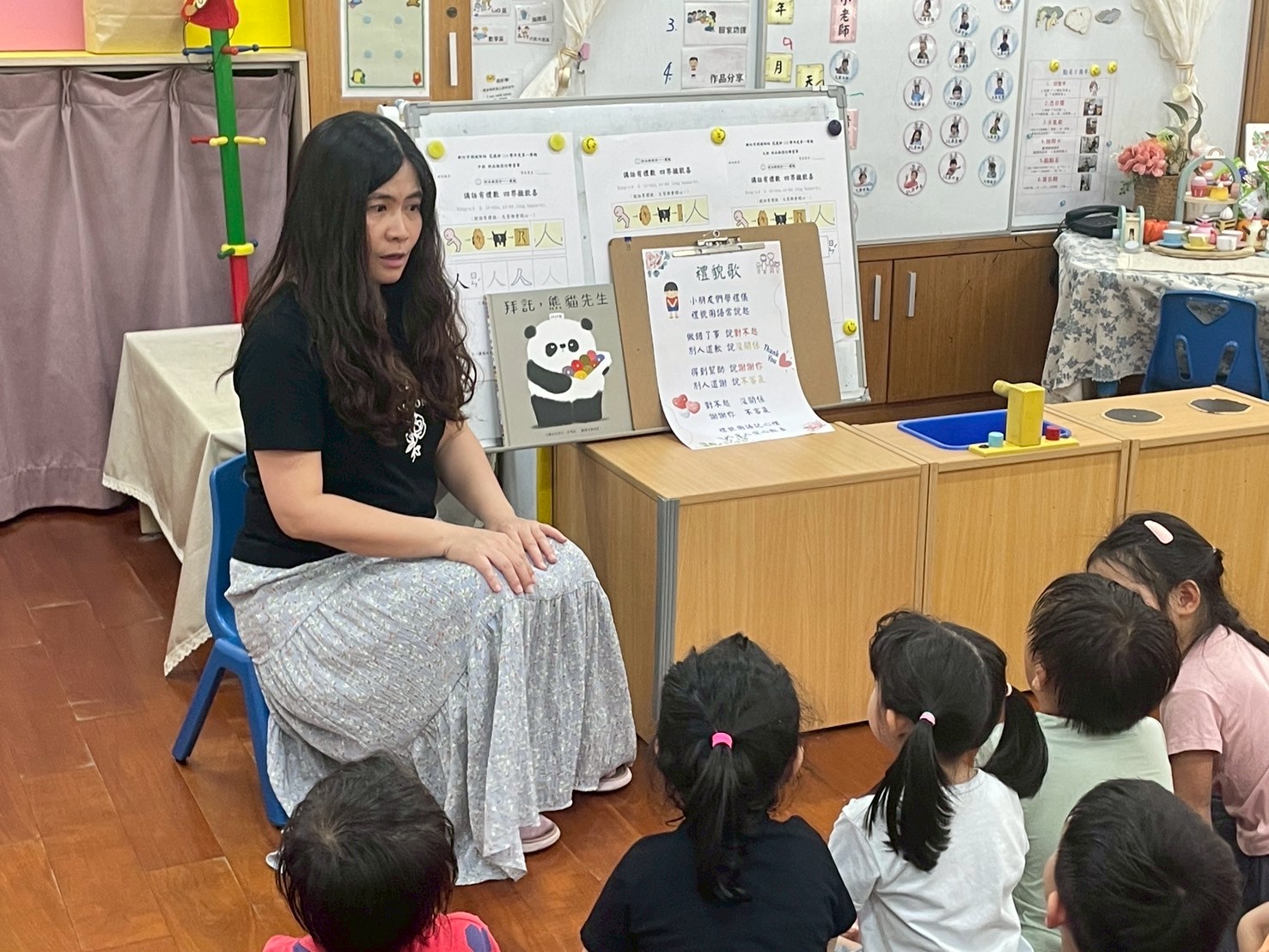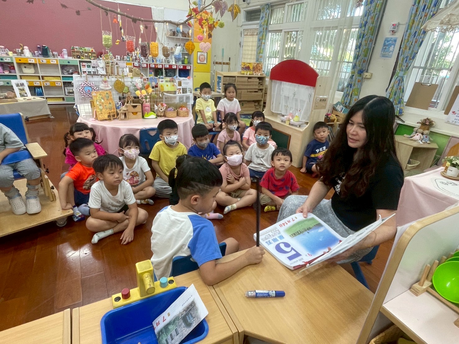 9/2 今天分享一本可愛的繪本<拜託,熊貓先生>,為這兩週的「禮貌」主題暖身,故事中的熊貓先生要分享甜甜圈,誰可以得到這些禮物呢?透過討論開始練習問答與思考,為本學期主題課程「我思 我詩 故我在~作伙來讀冊」揭開序幕囉!
