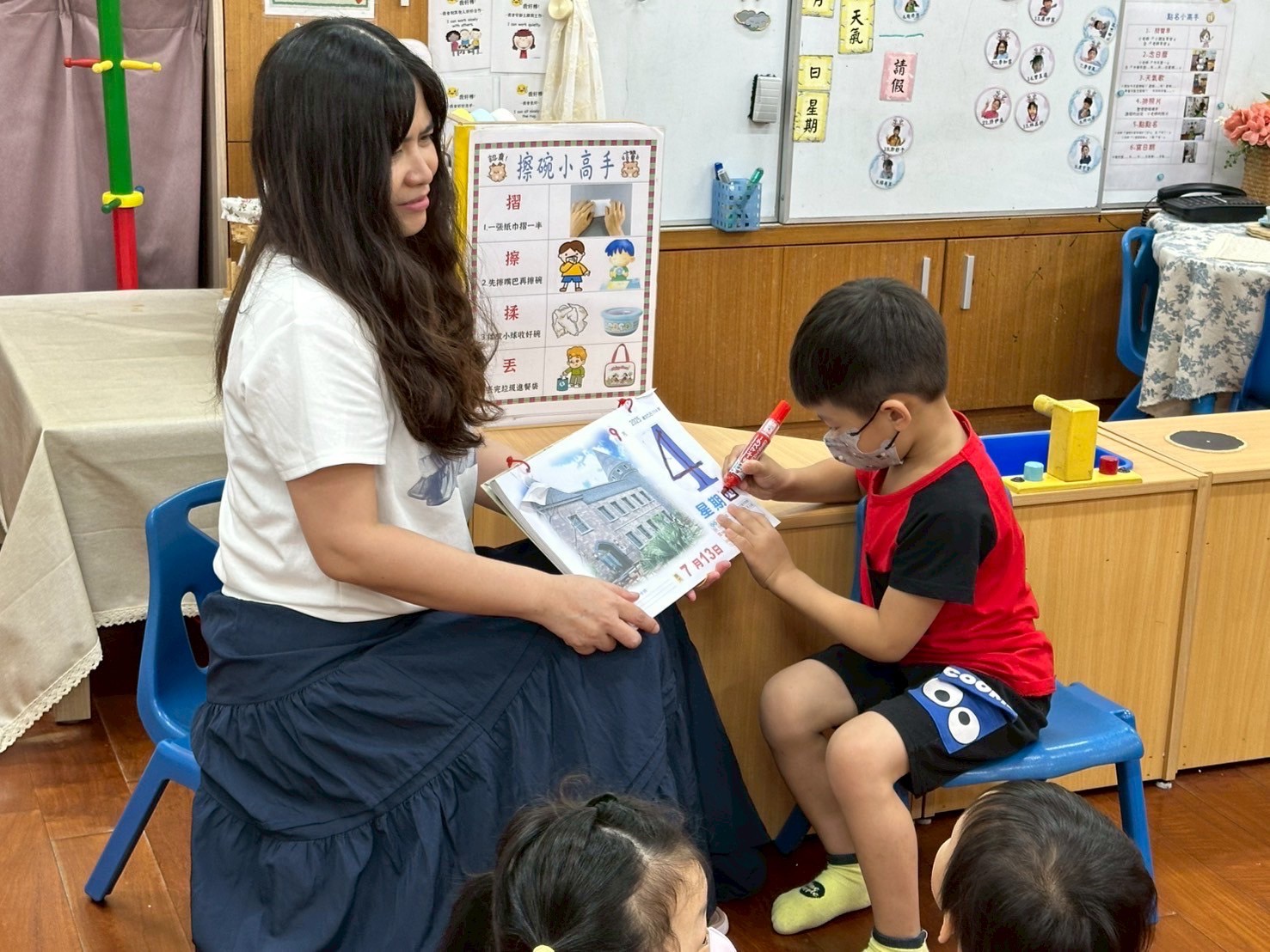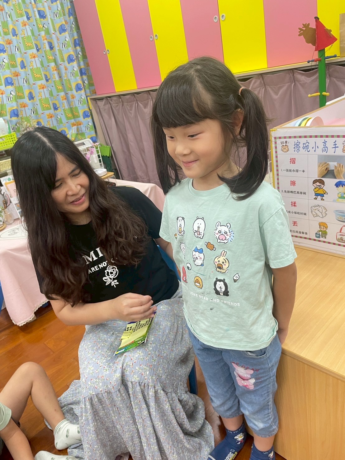 9/3今天音樂活動教唱一首「禮貌歌」,「謝謝你、不客氣、對不起、沒關係」將禮貌用語在歌曲中自然吟唱,一邊唱歌一邊學到禮貌的生活態度。